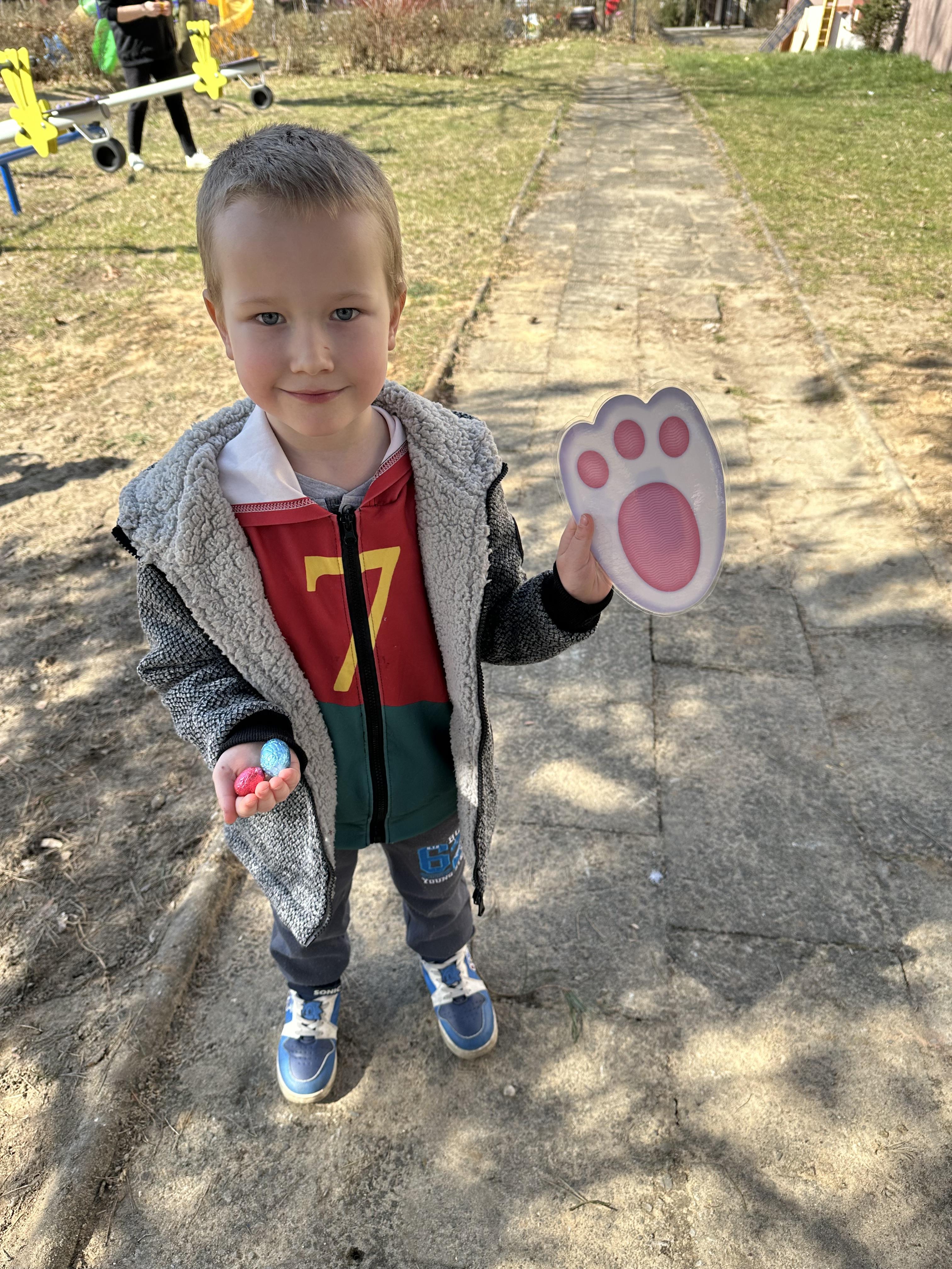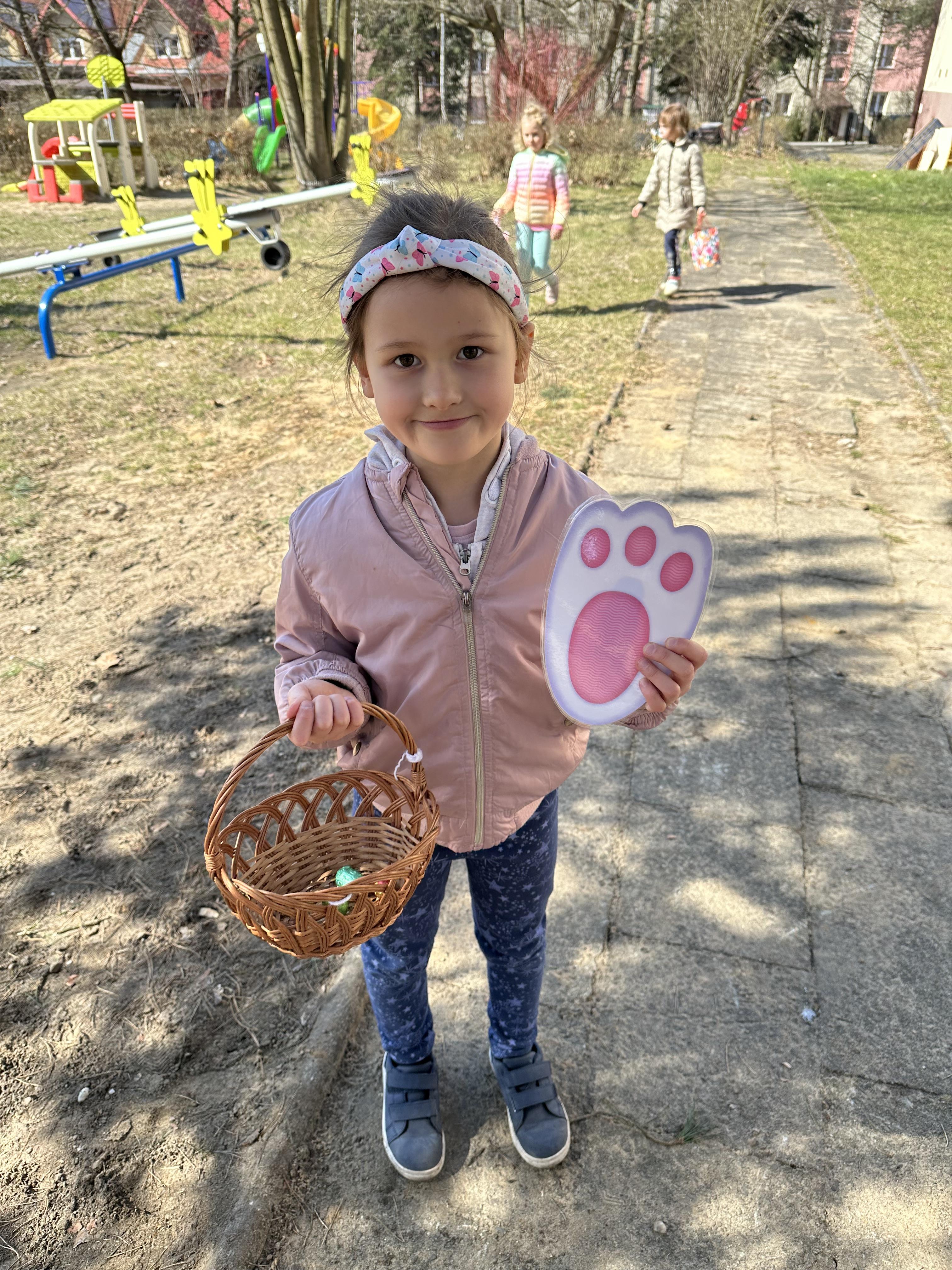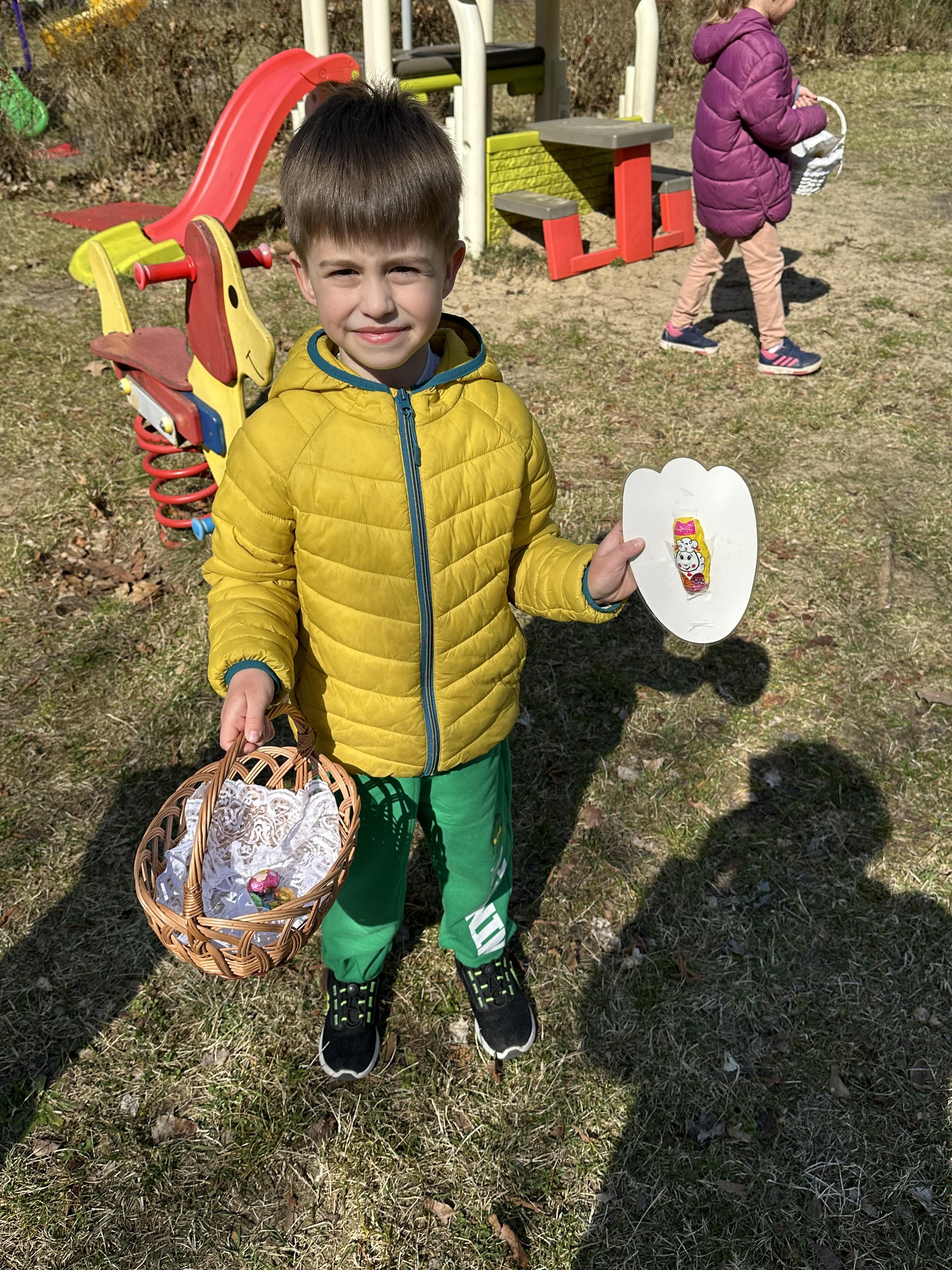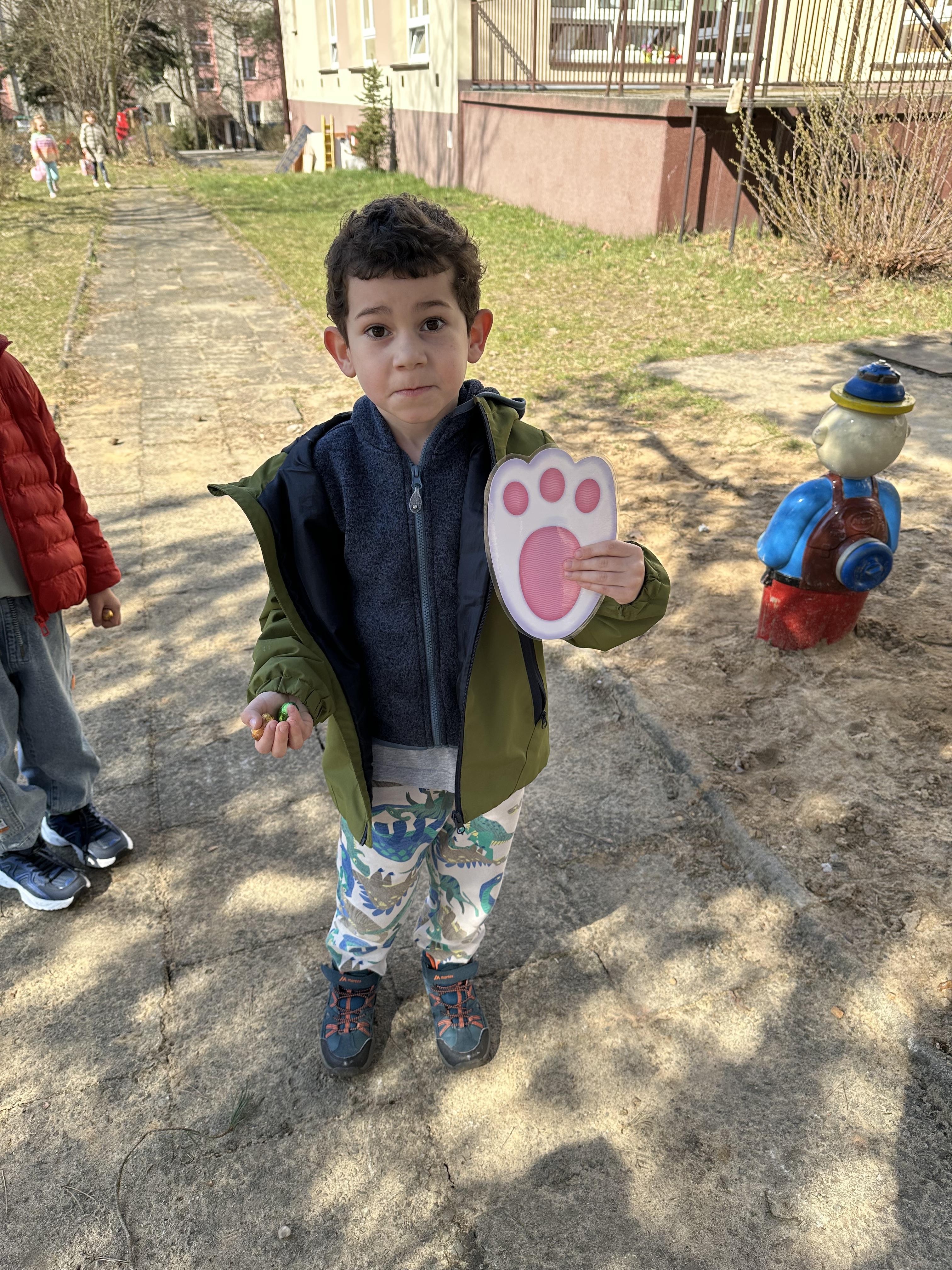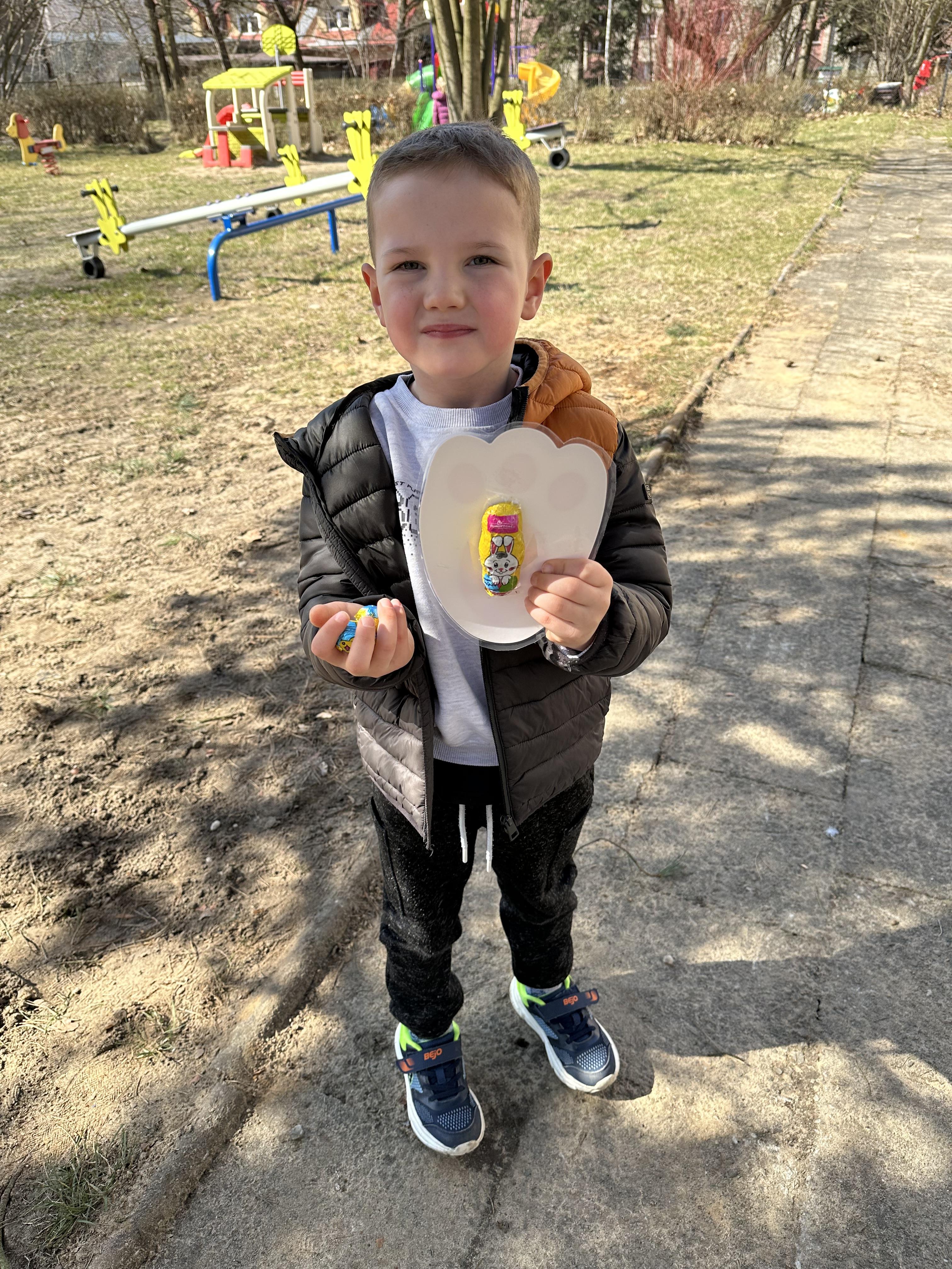 Drugiego kwietnia starszaki oraz pozostałe grupy w naszym przedszkolu rozpoczęły dzień od uroczystego Śniadania Wielkanocnego. Był to wyjątkowy czas pełen radości oraz wspólnego świętowania. Następnie ,,Pszczółki” udały się do ogrodu przedszkolnego, gdzie – zgodnie z tradycją – zajączek ukrył dla nich niespodzianki w postaci czekoladowych jajeczek. Dzieci z ogromnym zaangażowaniem i entuzjazmem poszukiwały upominków, a zabawie towarzyszyło wiele uśmiechu i radosnych emocji. Po powrocie do przedszkola „Pszczółki” wraz z wychowawcą złożyły świąteczne życzenia Pani Dyrektor oraz wszystkim pracownikom placówki, wręczając przy tym drobne wielkanocne upominki. Nie zabrakło również pamiątkowych fotografii, które będą pięknym wspomnieniem tego wyjątkowego dnia. Dzieci złożyły także świąteczne życzenia rodzicom oraz całej społeczności przedszkolnej. Życzenia te zostały uwiecznione na specjalnie przygotowanym filmiku.