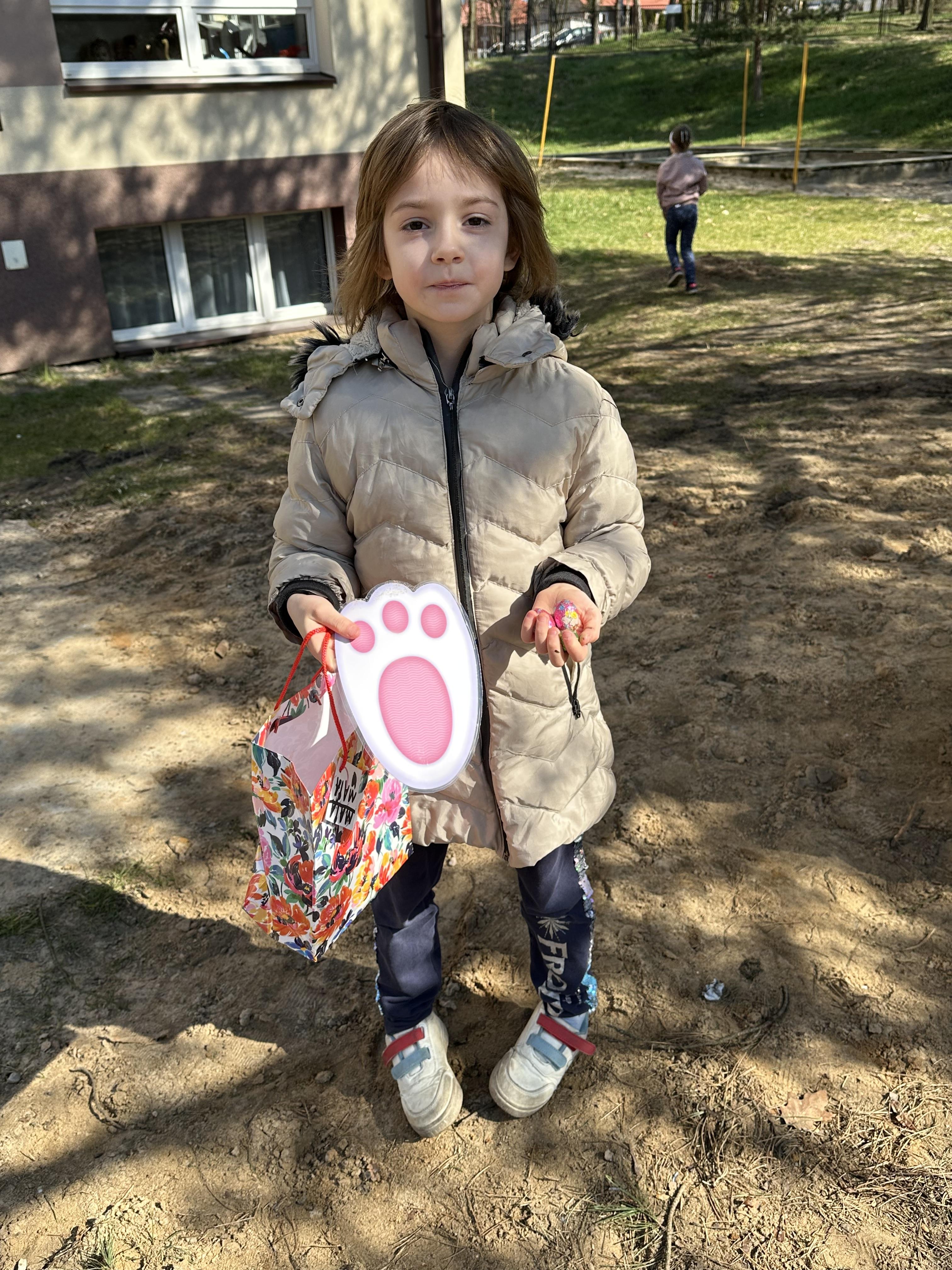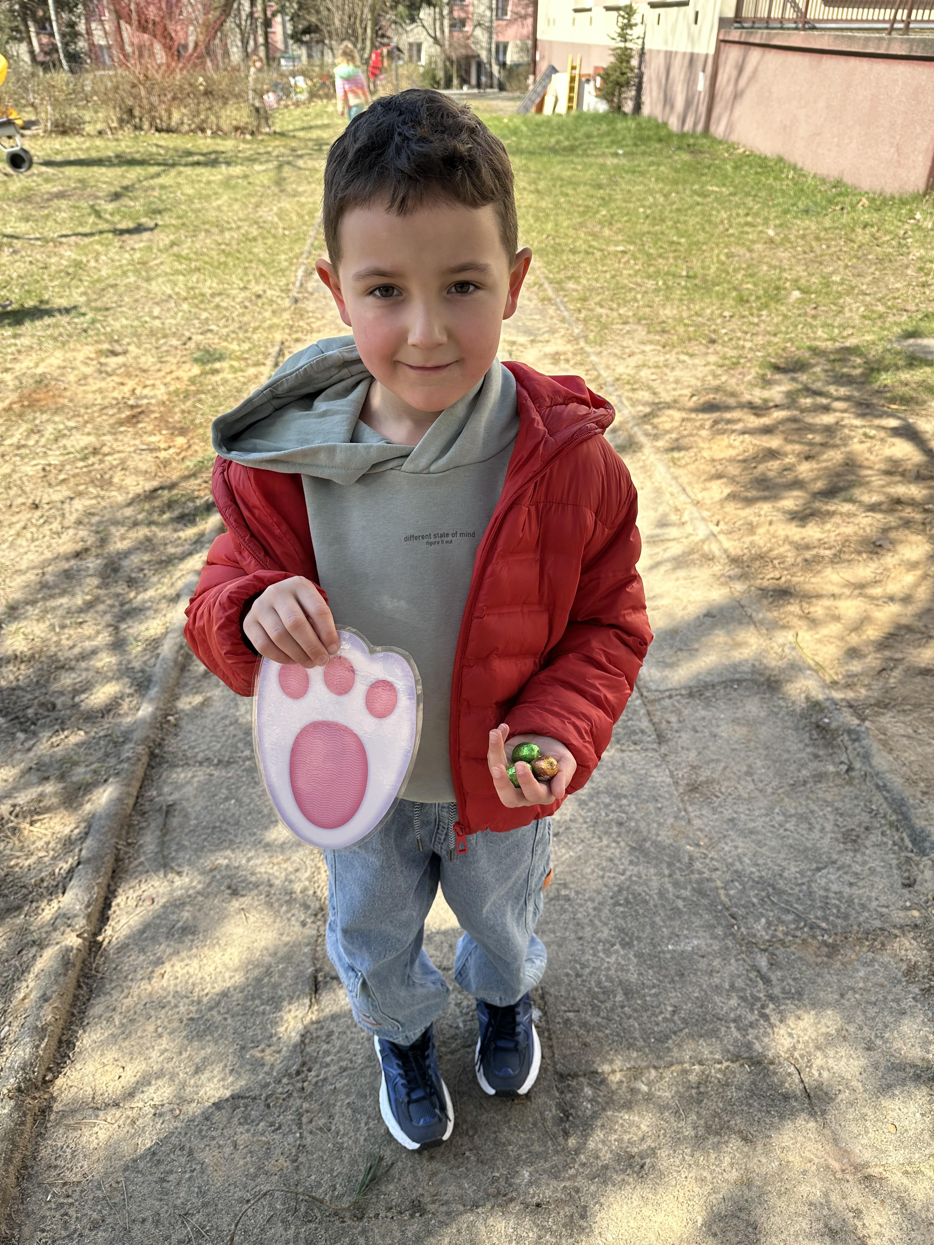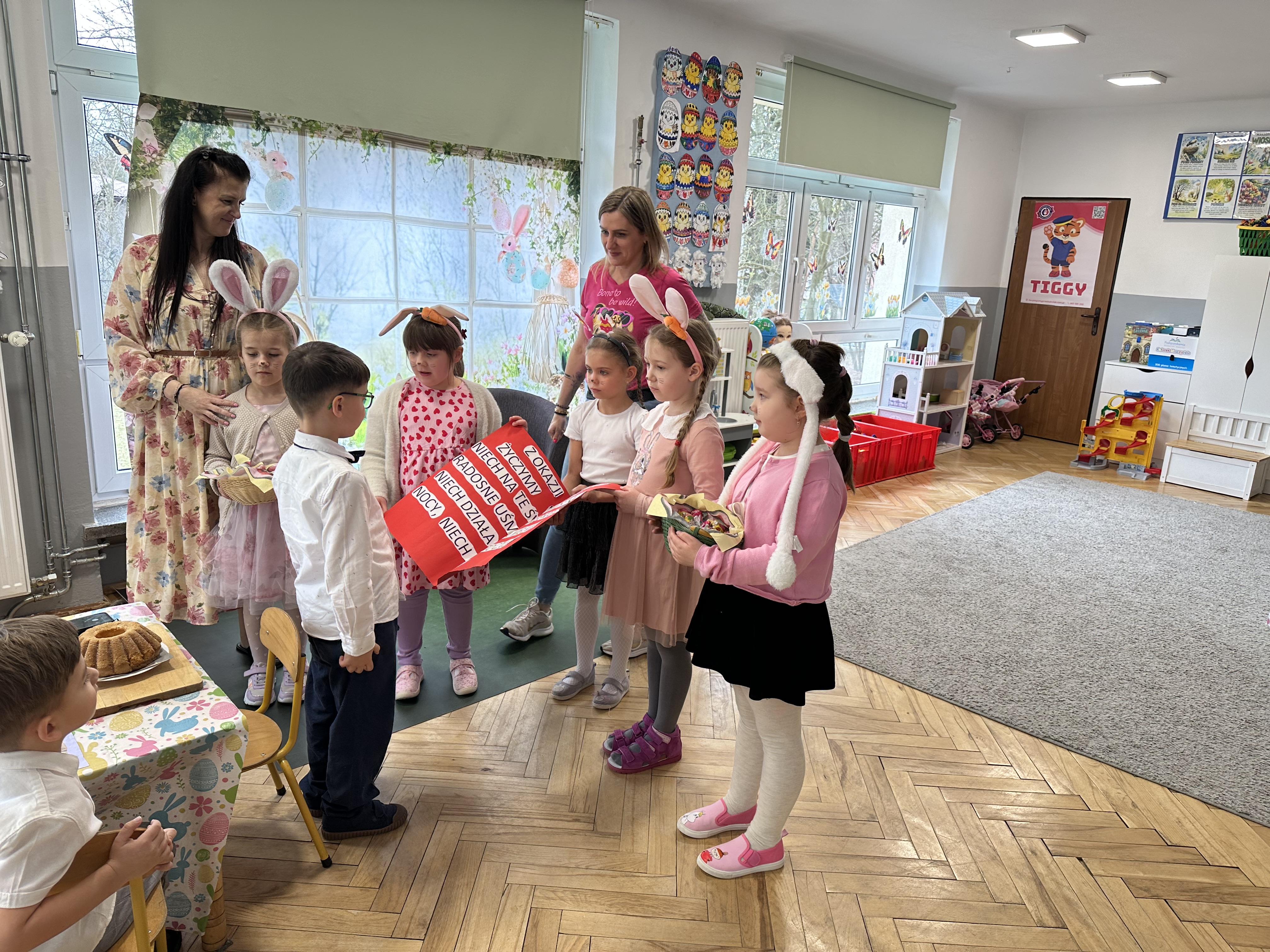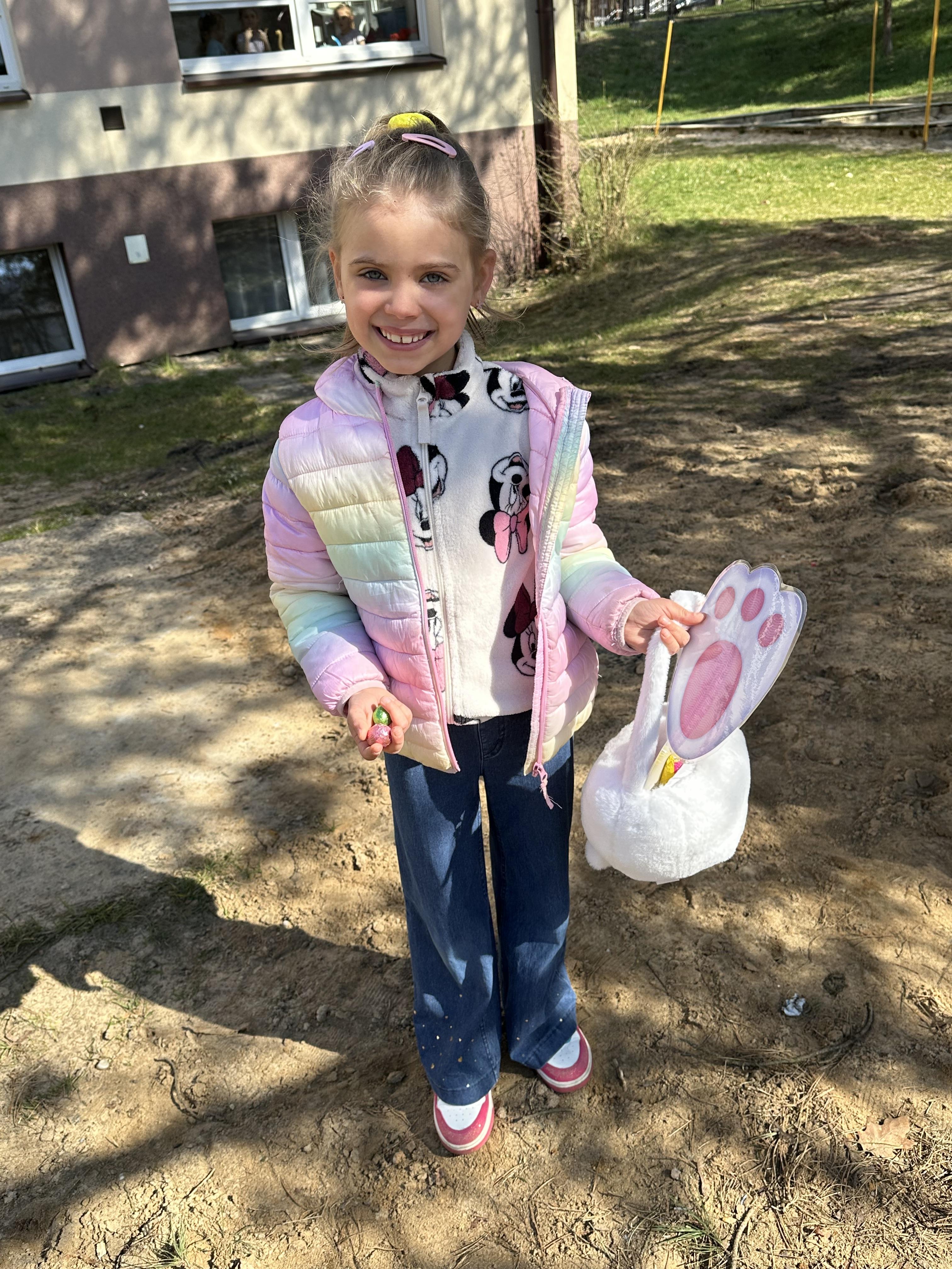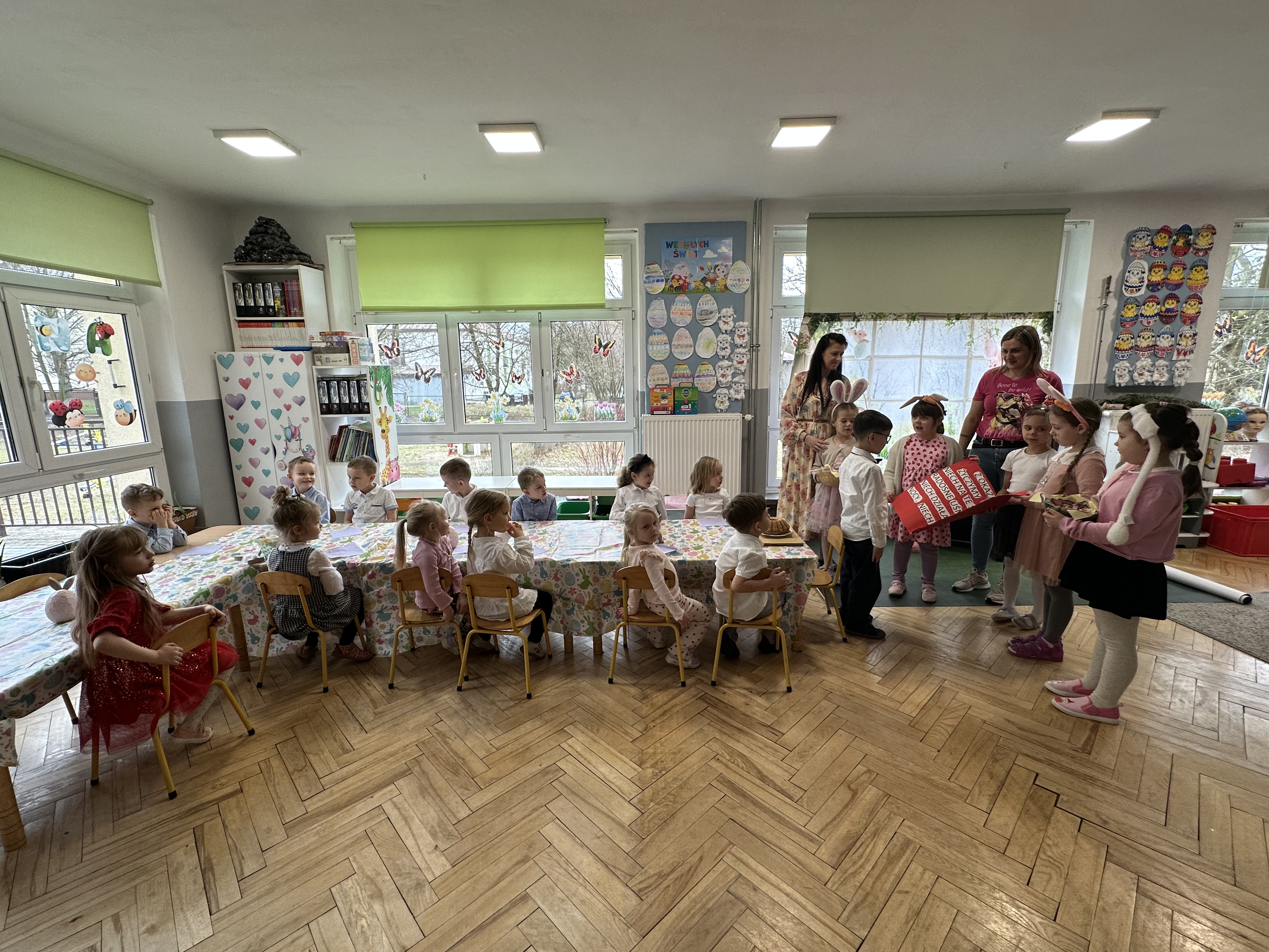 Drugiego kwietnia starszaki oraz pozostałe grupy w naszym przedszkolu rozpoczęły dzień od uroczystego Śniadania Wielkanocnego. Był to wyjątkowy czas pełen radości oraz wspólnego świętowania. Następnie ,,Pszczółki” udały się do ogrodu przedszkolnego, gdzie – zgodnie z tradycją – zajączek ukrył dla nich niespodzianki w postaci czekoladowych jajeczek. Dzieci z ogromnym zaangażowaniem i entuzjazmem poszukiwały upominków, a zabawie towarzyszyło wiele uśmiechu i radosnych emocji. Po powrocie do przedszkola „Pszczółki” wraz z wychowawcą złożyły świąteczne życzenia Pani Dyrektor oraz wszystkim pracownikom placówki, wręczając przy tym drobne wielkanocne upominki. Nie zabrakło również pamiątkowych fotografii, które będą pięknym wspomnieniem tego wyjątkowego dnia. Dzieci złożyły także świąteczne życzenia rodzicom oraz całej społeczności przedszkolnej. Życzenia te zostały uwiecznione na specjalnie przygotowanym filmiku.