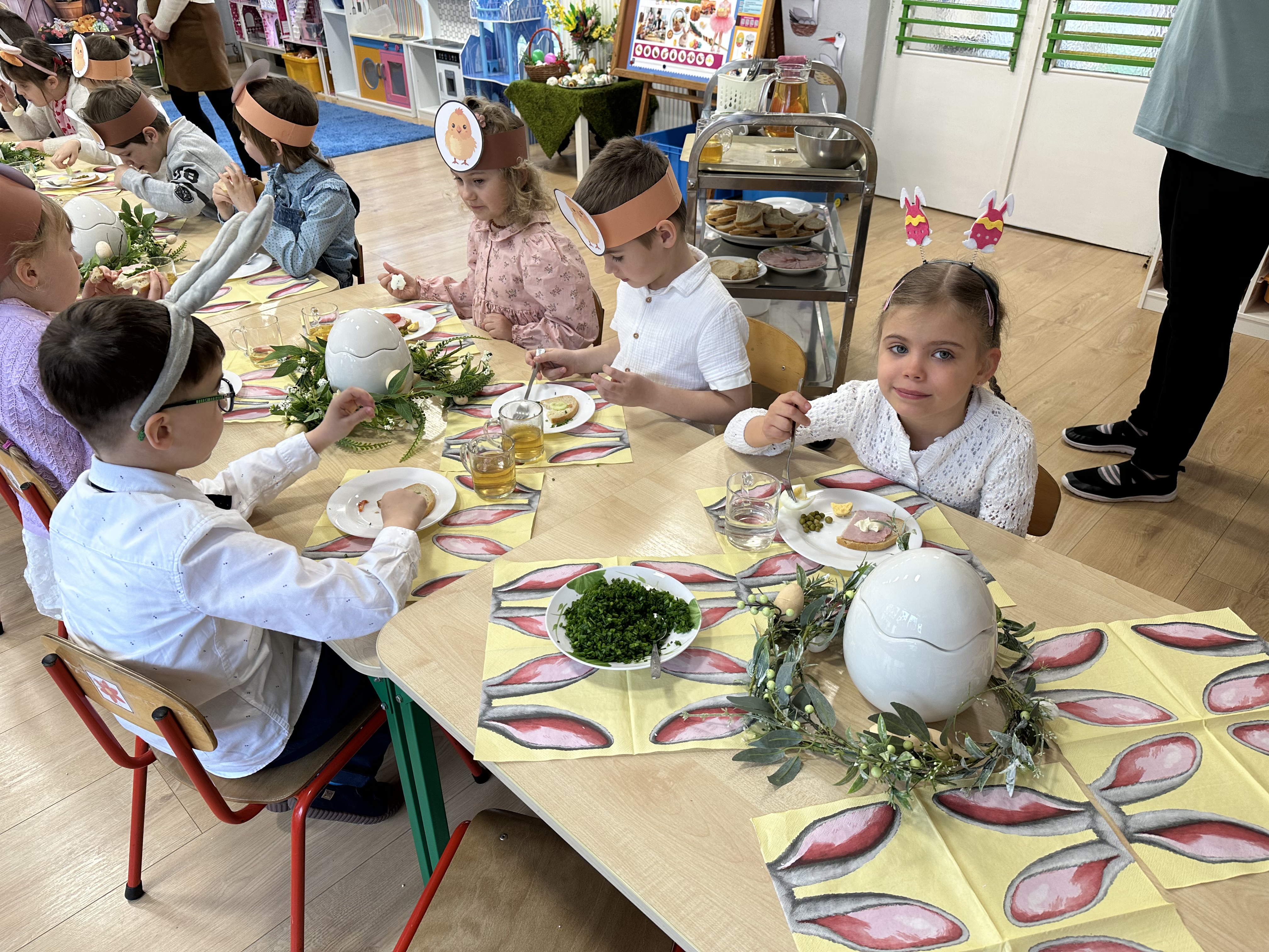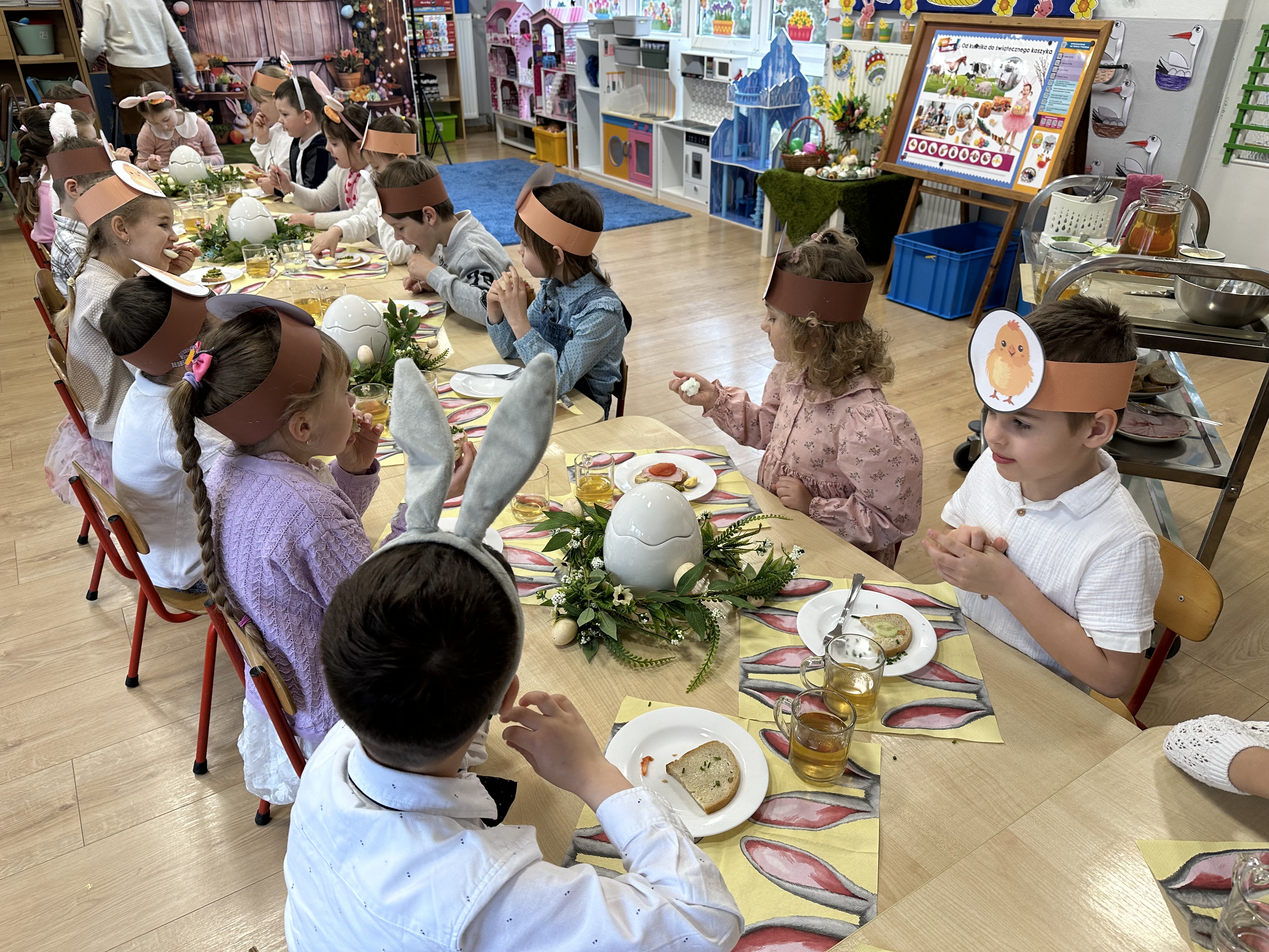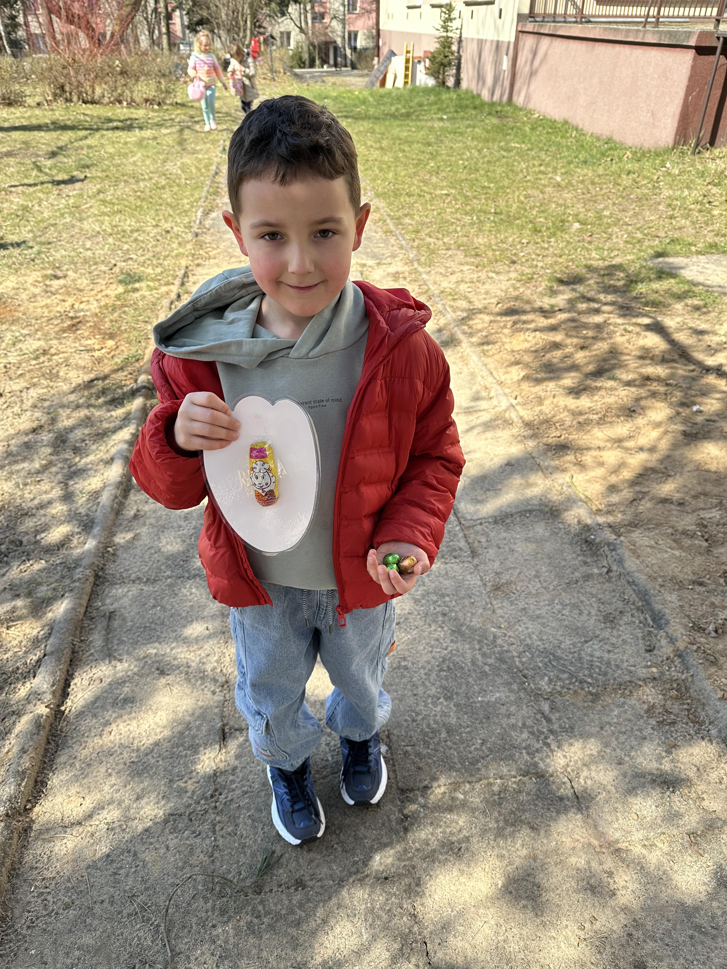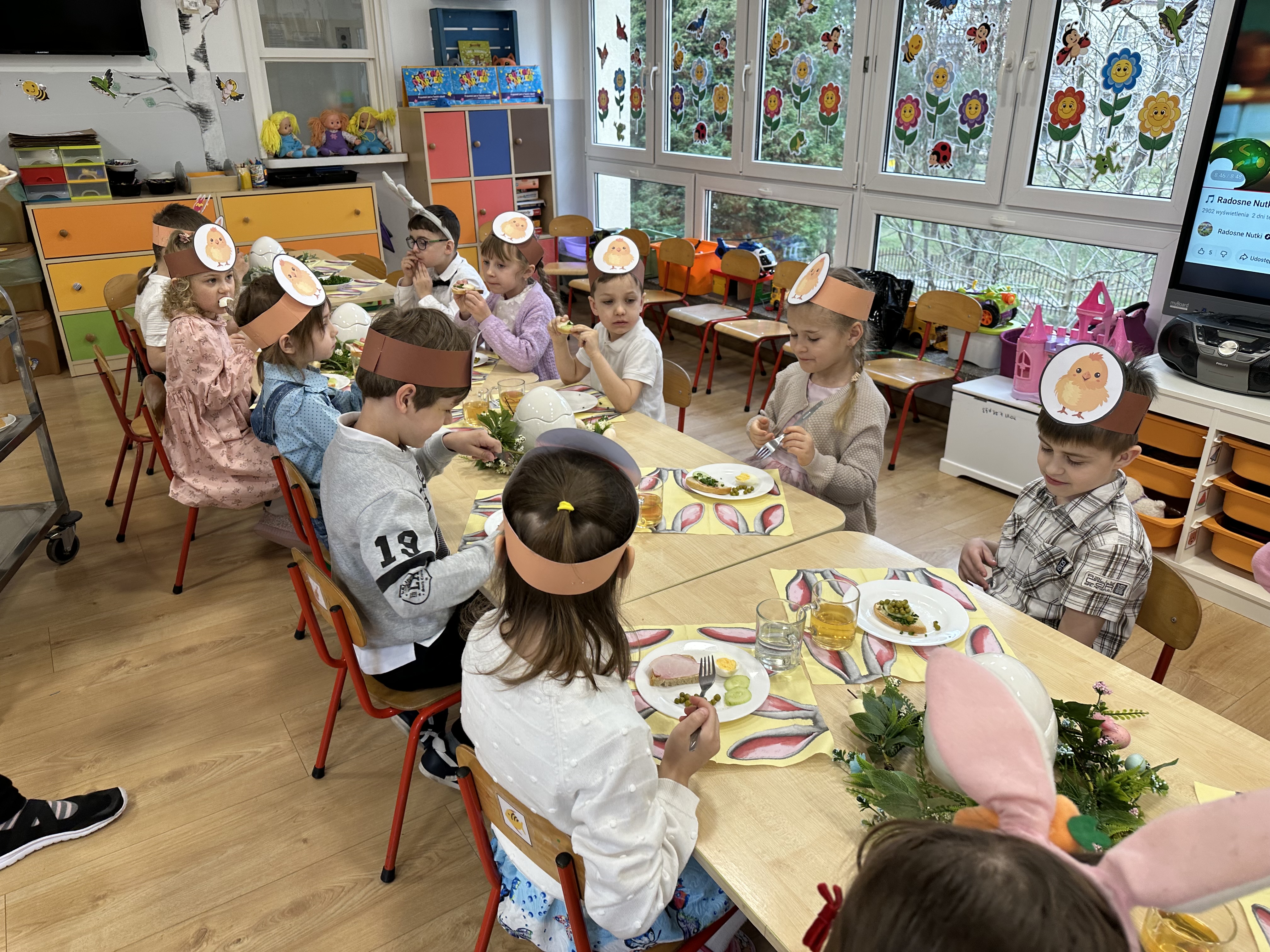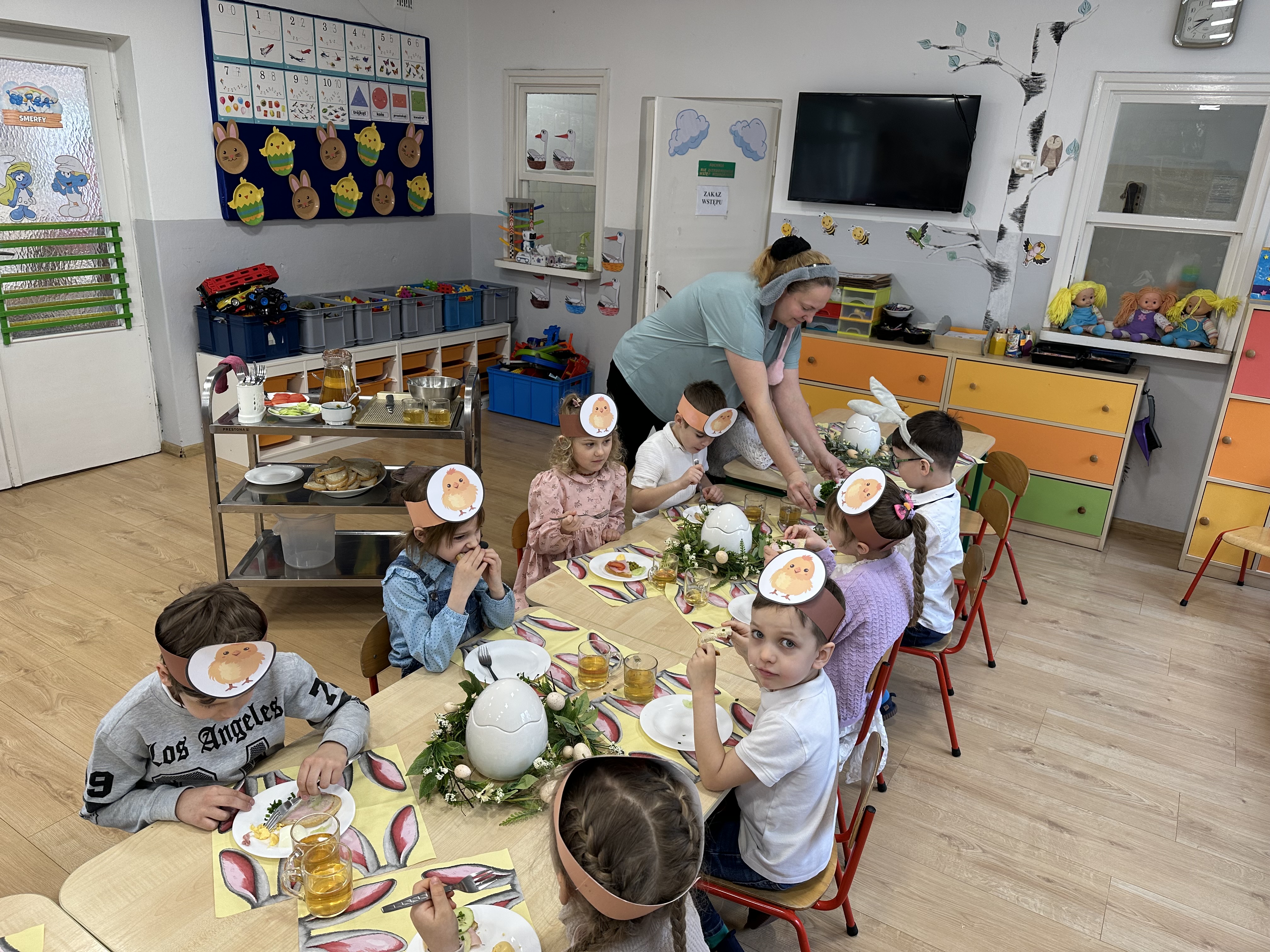 Drugiego kwietnia starszaki oraz pozostałe grupy w naszym przedszkolu rozpoczęły dzień od uroczystego Śniadania Wielkanocnego. Był to wyjątkowy czas pełen radości oraz wspólnego świętowania. Następnie ,,Pszczółki” udały się do ogrodu przedszkolnego, gdzie – zgodnie z tradycją – zajączek ukrył dla nich niespodzianki w postaci czekoladowych jajeczek. Dzieci z ogromnym zaangażowaniem i entuzjazmem poszukiwały upominków, a zabawie towarzyszyło wiele uśmiechu i radosnych emocji. Po powrocie do przedszkola „Pszczółki” wraz z wychowawcą złożyły świąteczne życzenia Pani Dyrektor oraz wszystkim pracownikom placówki, wręczając przy tym drobne wielkanocne upominki. Nie zabrakło również pamiątkowych fotografii, które będą pięknym wspomnieniem tego wyjątkowego dnia. Dzieci złożyły także świąteczne życzenia rodzicom oraz całej społeczności przedszkolnej. Życzenia te zostały uwiecznione na specjalnie przygotowanym filmiku.