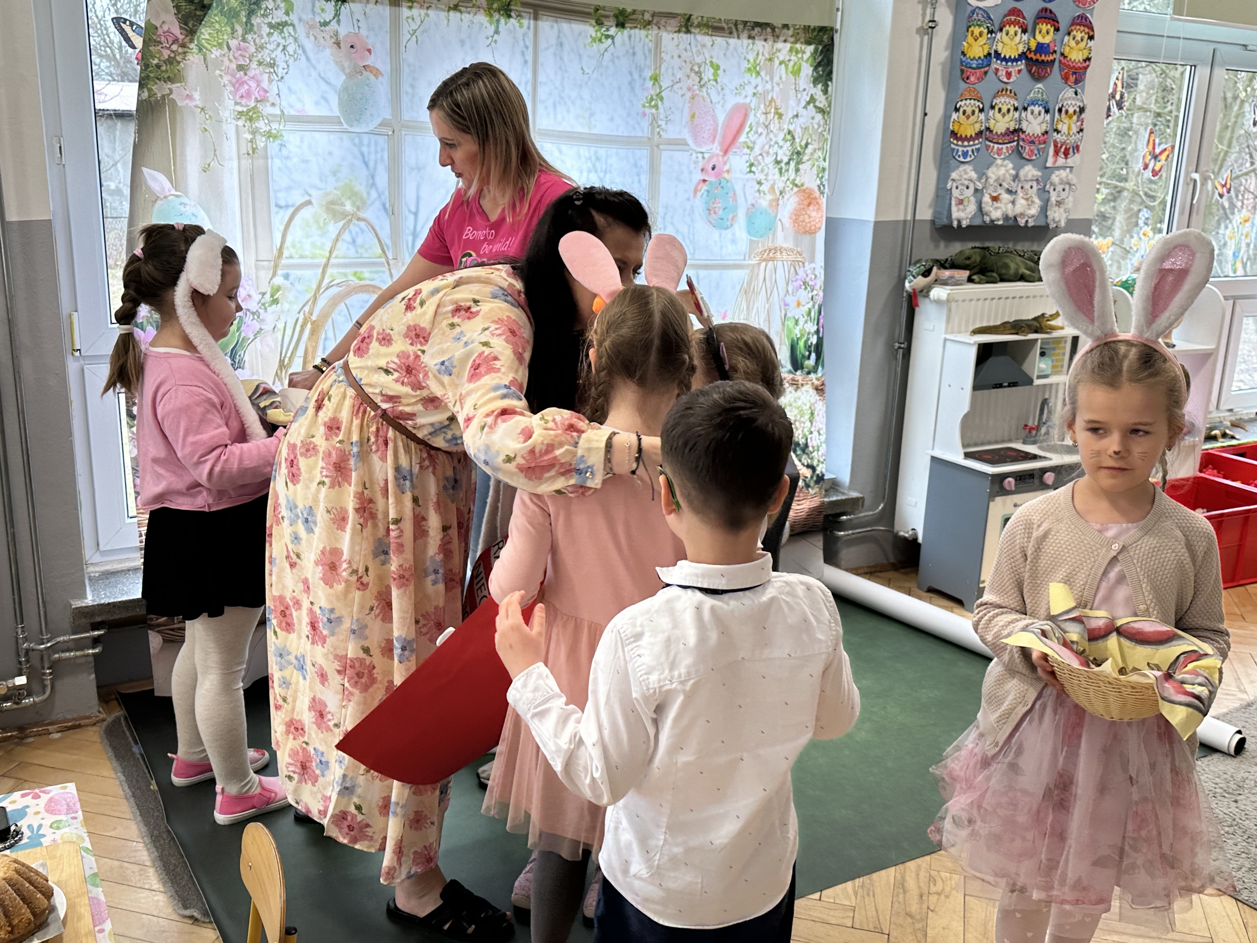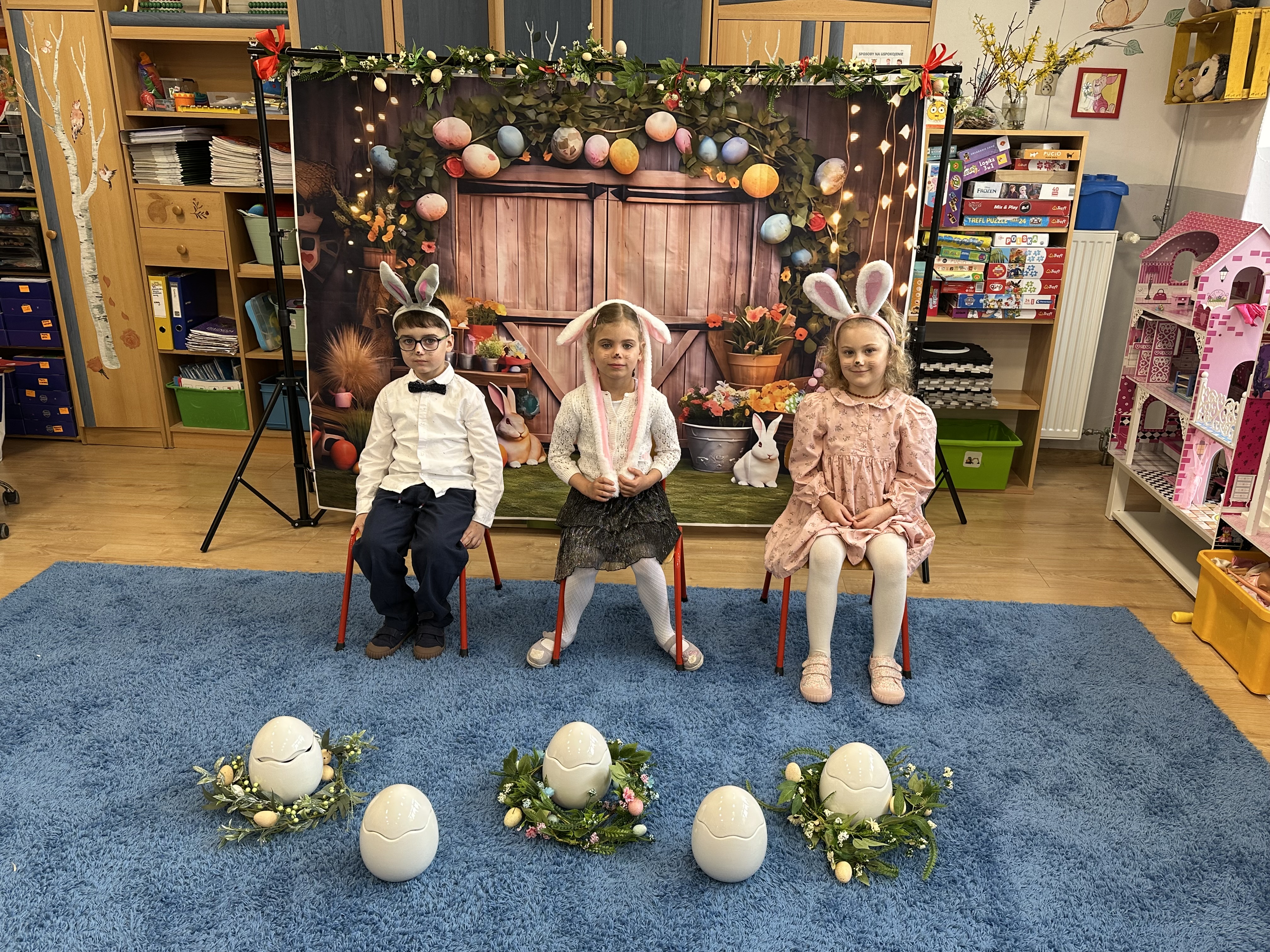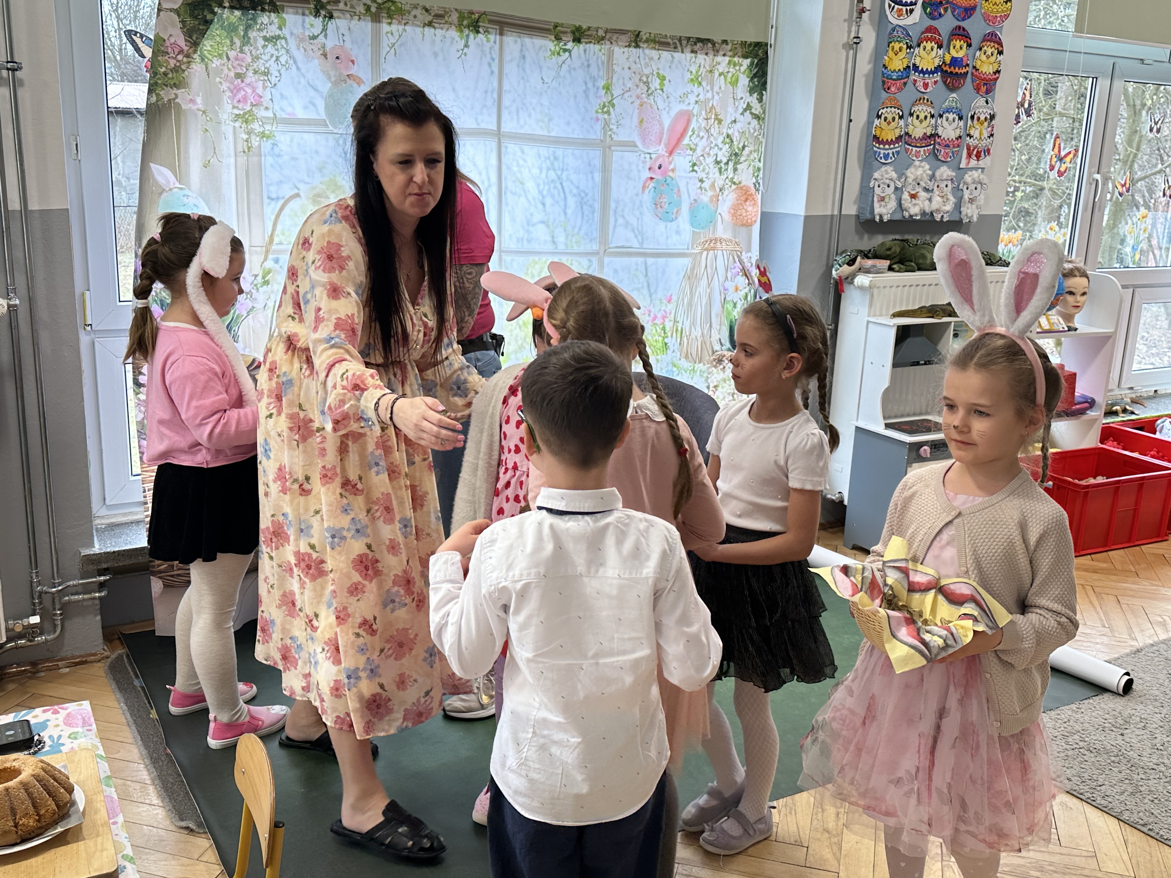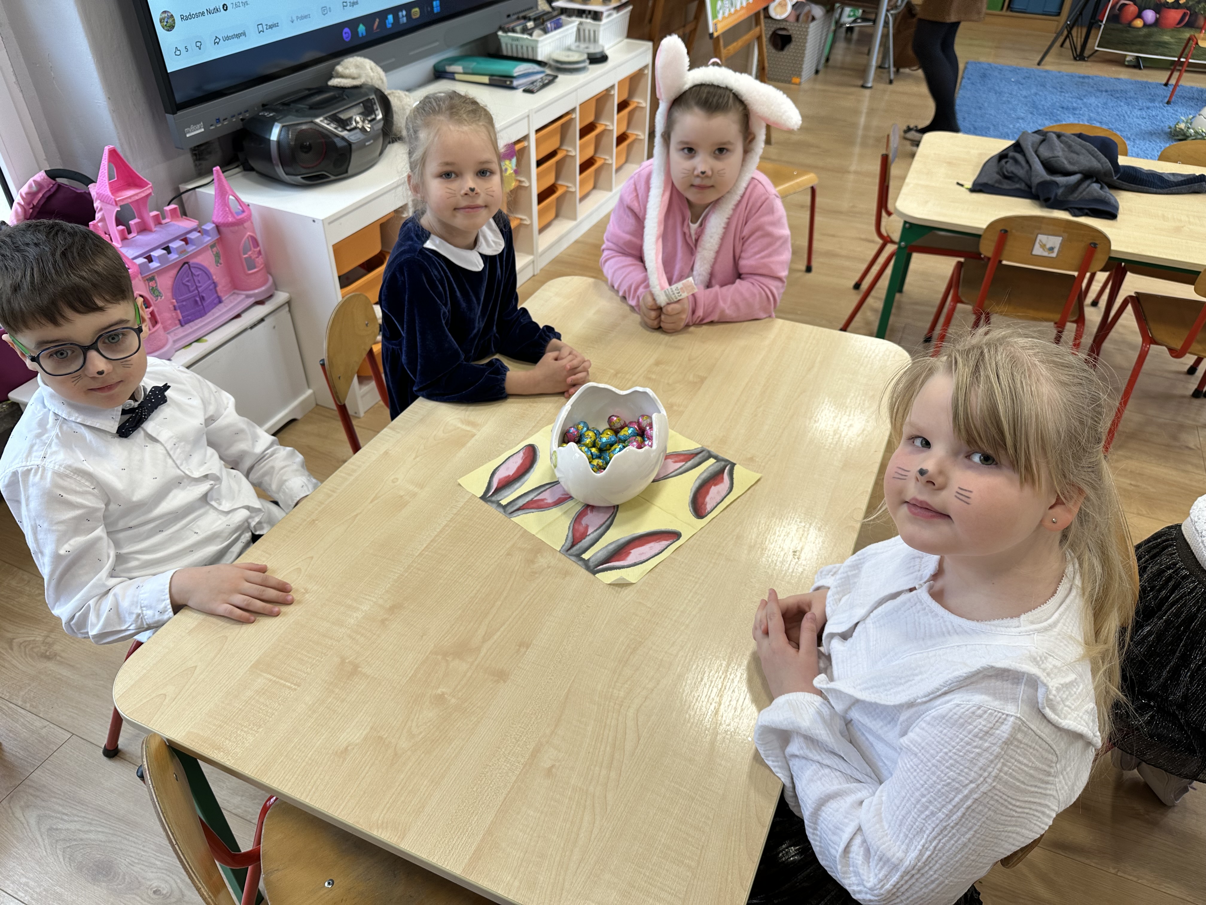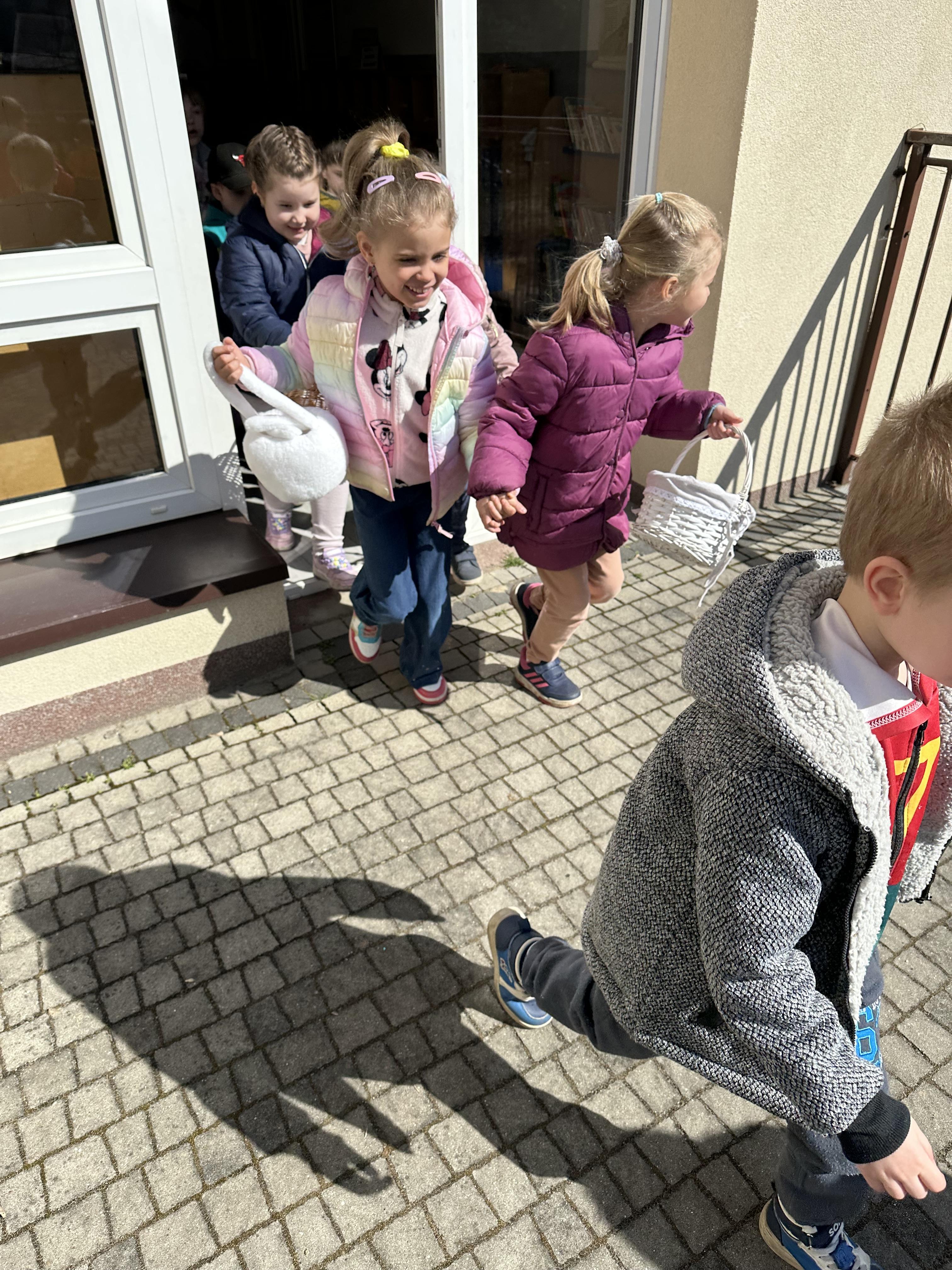 Drugiego kwietnia starszaki oraz pozostałe grupy w naszym przedszkolu rozpoczęły dzień od uroczystego Śniadania Wielkanocnego. Był to wyjątkowy czas pełen radości oraz wspólnego świętowania. Następnie ,,Pszczółki” udały się do ogrodu przedszkolnego, gdzie – zgodnie z tradycją – zajączek ukrył dla nich niespodzianki w postaci czekoladowych jajeczek. Dzieci z ogromnym zaangażowaniem i entuzjazmem poszukiwały upominków, a zabawie towarzyszyło wiele uśmiechu i radosnych emocji. Po powrocie do przedszkola „Pszczółki” wraz z wychowawcą złożyły świąteczne życzenia Pani Dyrektor oraz wszystkim pracownikom placówki, wręczając przy tym drobne wielkanocne upominki. Nie zabrakło również pamiątkowych fotografii, które będą pięknym wspomnieniem tego wyjątkowego dnia. Dzieci złożyły także świąteczne życzenia rodzicom oraz całej społeczności przedszkolnej. Życzenia te zostały uwiecznione na specjalnie przygotowanym filmiku.