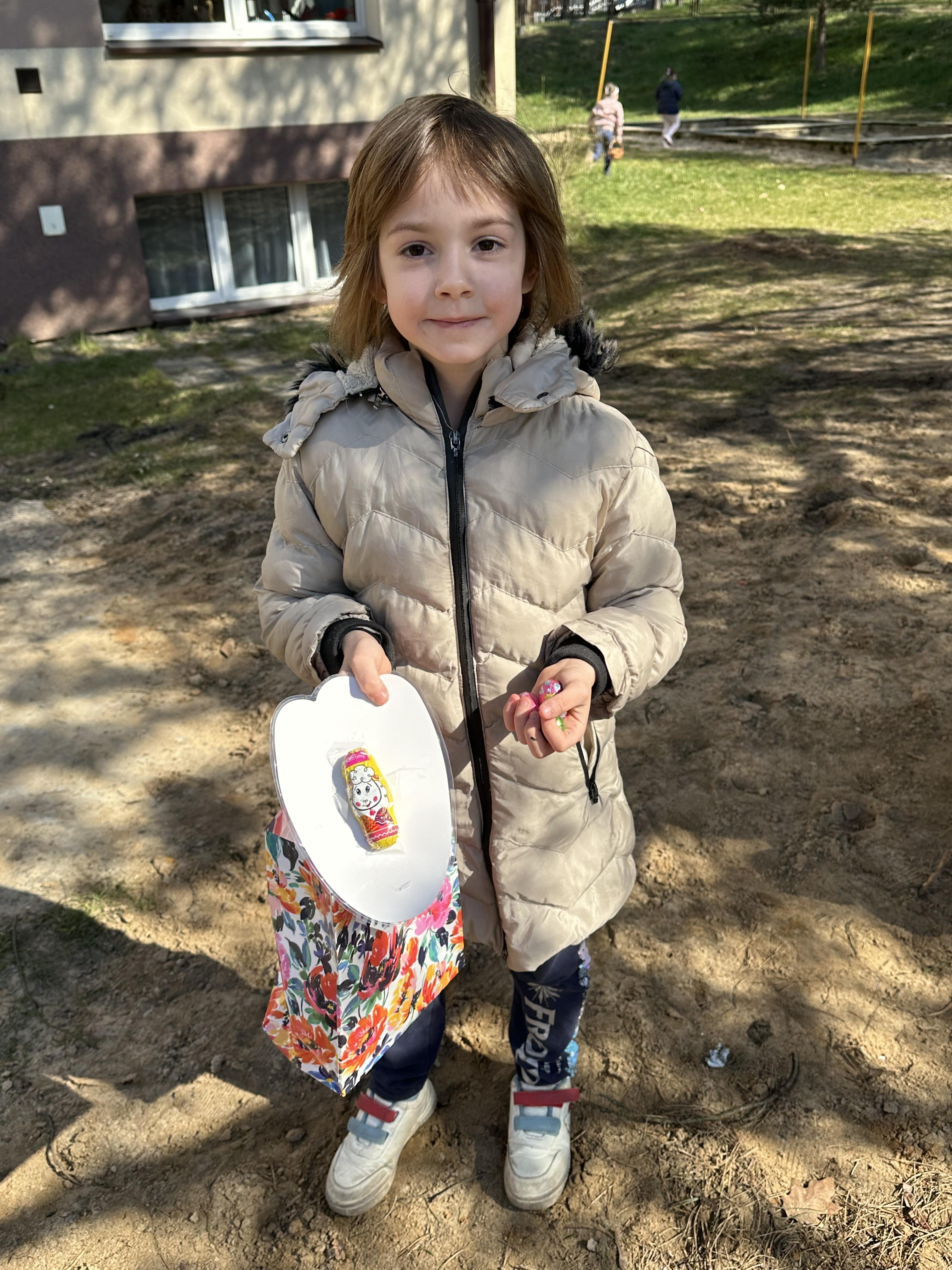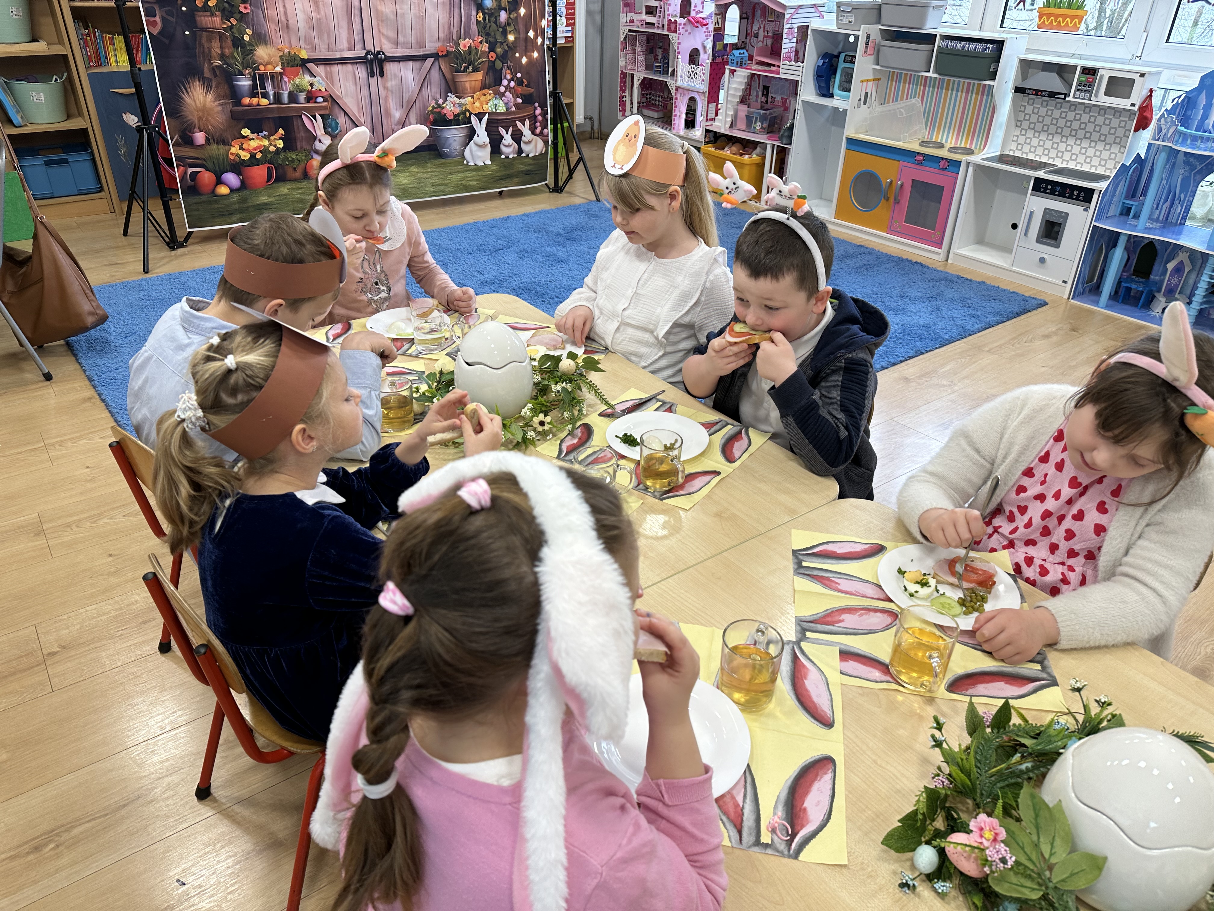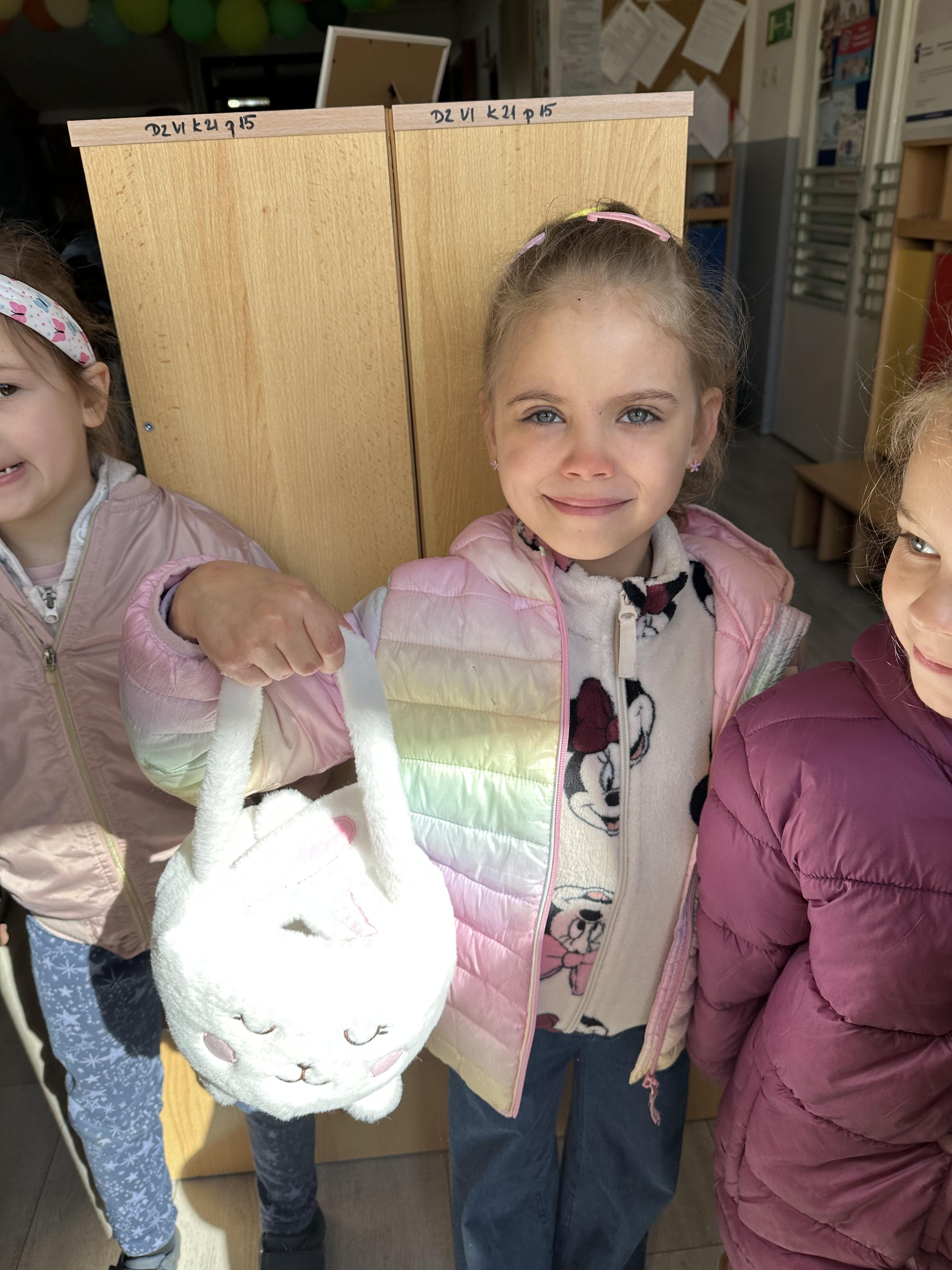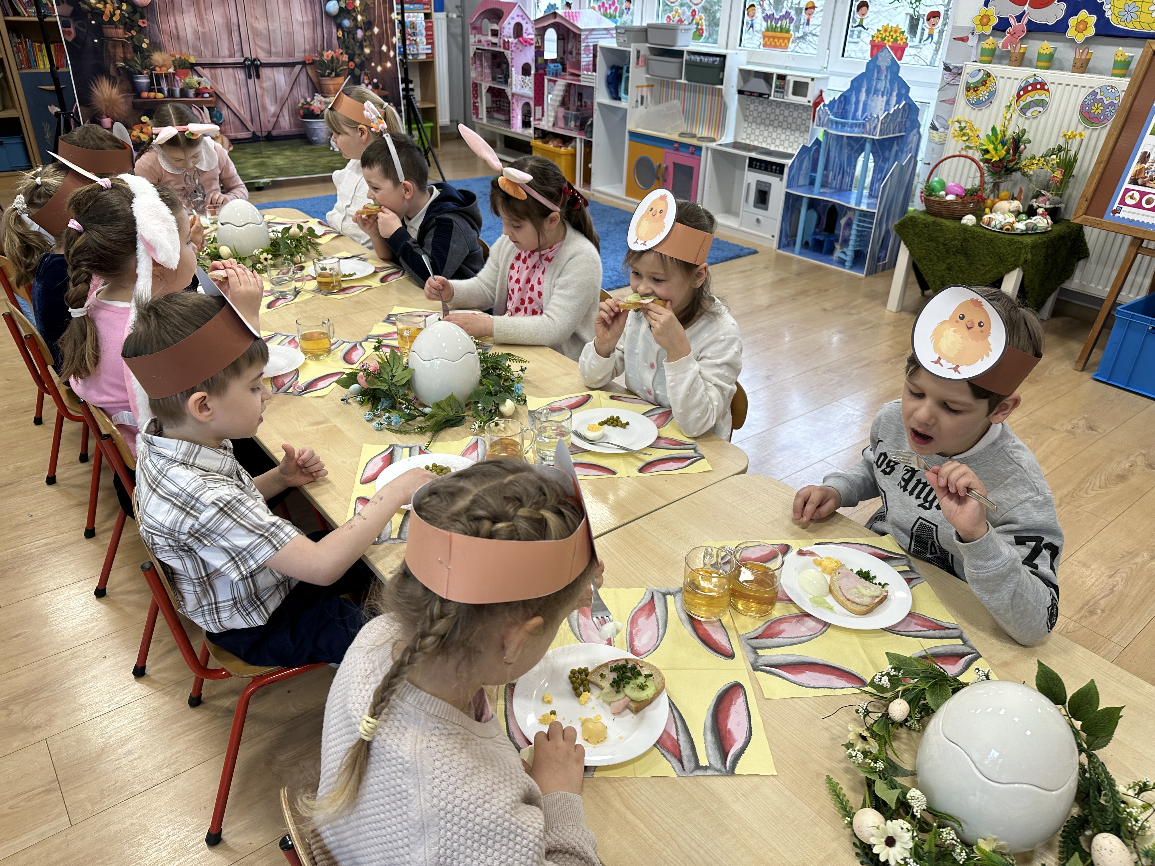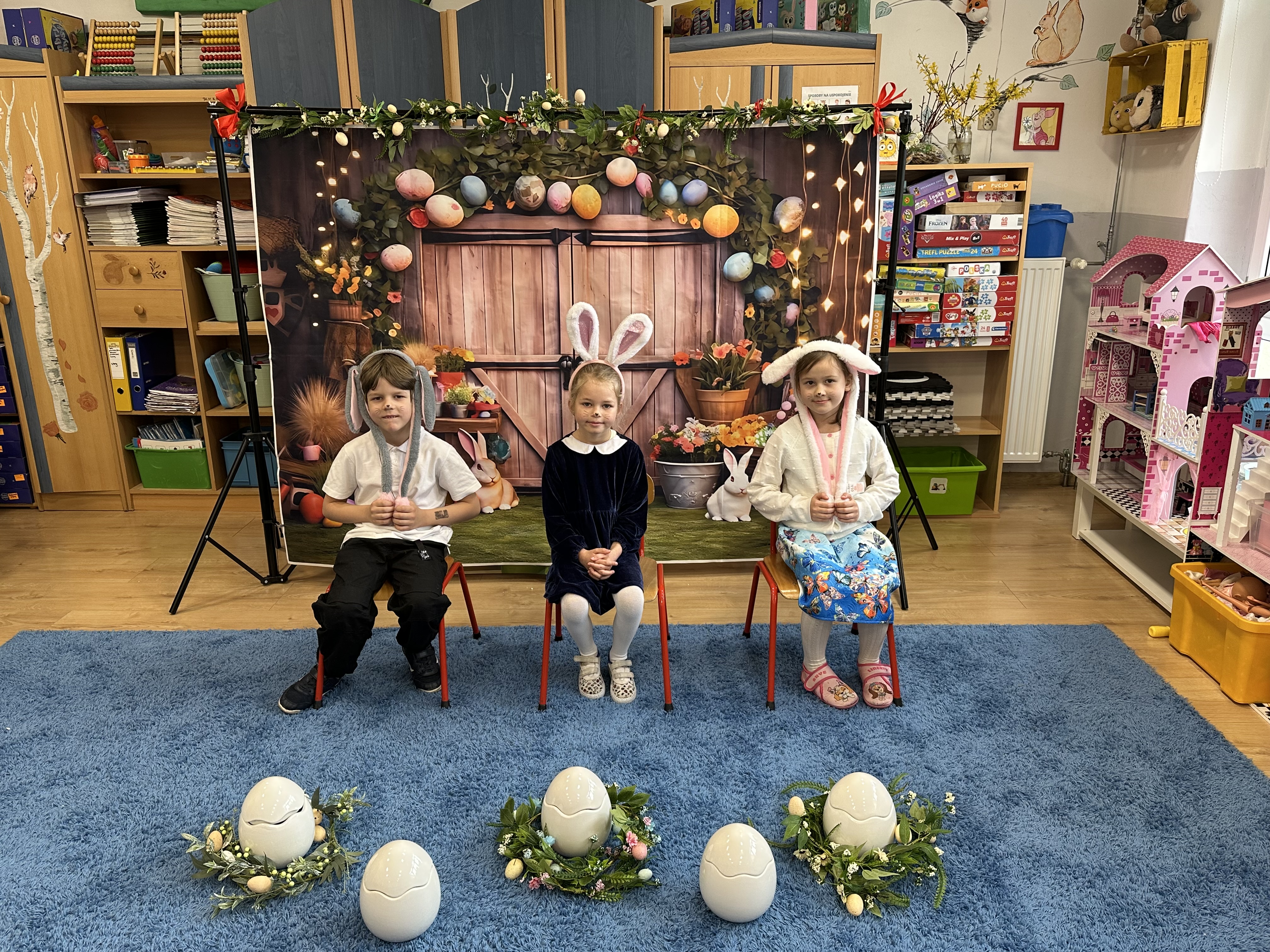 Drugiego kwietnia starszaki oraz pozostałe grupy w naszym przedszkolu rozpoczęły dzień od uroczystego Śniadania Wielkanocnego. Był to wyjątkowy czas pełen radości oraz wspólnego świętowania. Następnie ,,Pszczółki” udały się do ogrodu przedszkolnego, gdzie – zgodnie z tradycją – zajączek ukrył dla nich niespodzianki w postaci czekoladowych jajeczek. Dzieci z ogromnym zaangażowaniem i entuzjazmem poszukiwały upominków, a zabawie towarzyszyło wiele uśmiechu i radosnych emocji. Po powrocie do przedszkola „Pszczółki” wraz z wychowawcą złożyły świąteczne życzenia Pani Dyrektor oraz wszystkim pracownikom placówki, wręczając przy tym drobne wielkanocne upominki. Nie zabrakło również pamiątkowych fotografii, które będą pięknym wspomnieniem tego wyjątkowego dnia. Dzieci złożyły także świąteczne życzenia rodzicom oraz całej społeczności przedszkolnej. Życzenia te zostały uwiecznione na specjalnie przygotowanym filmiku.