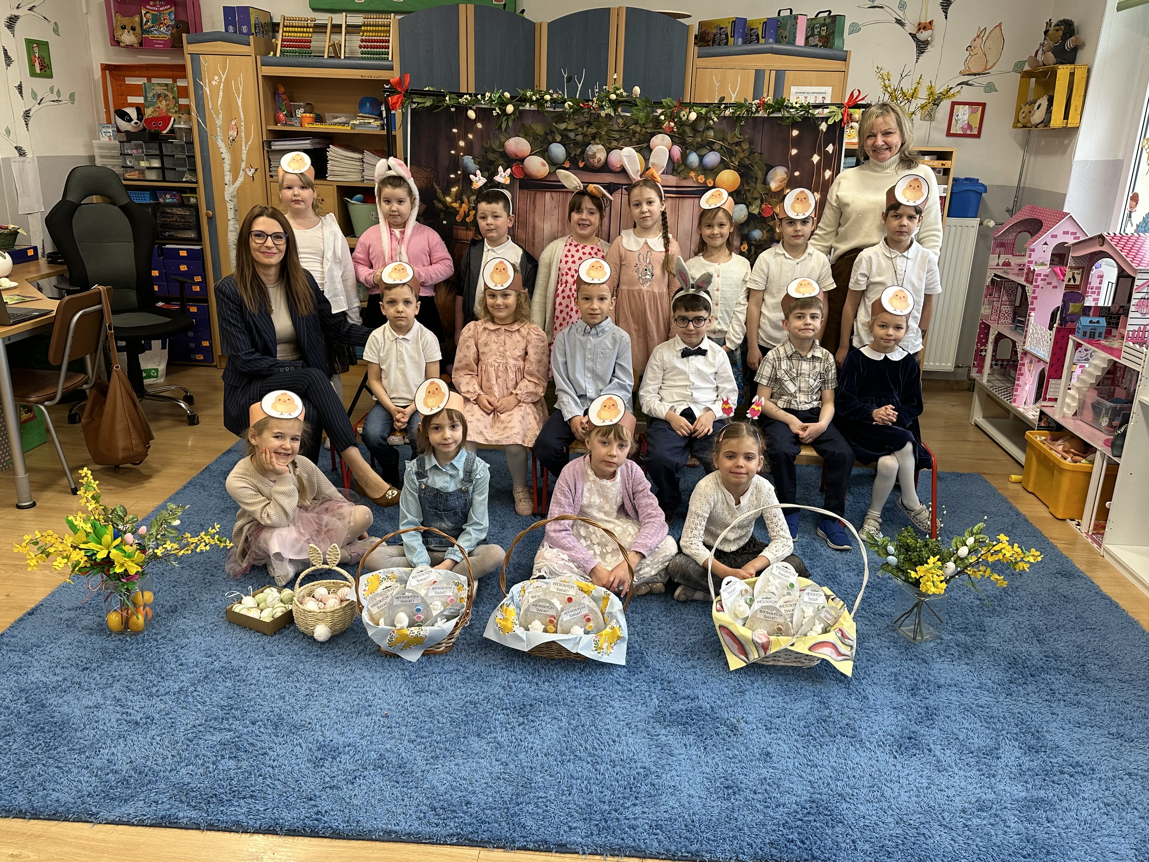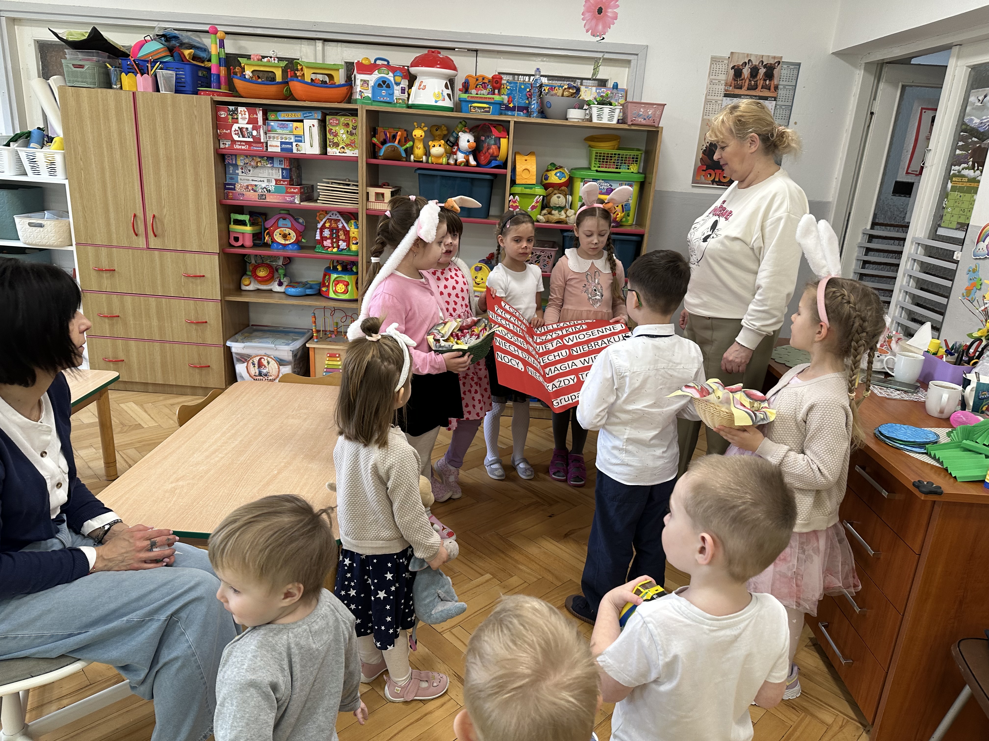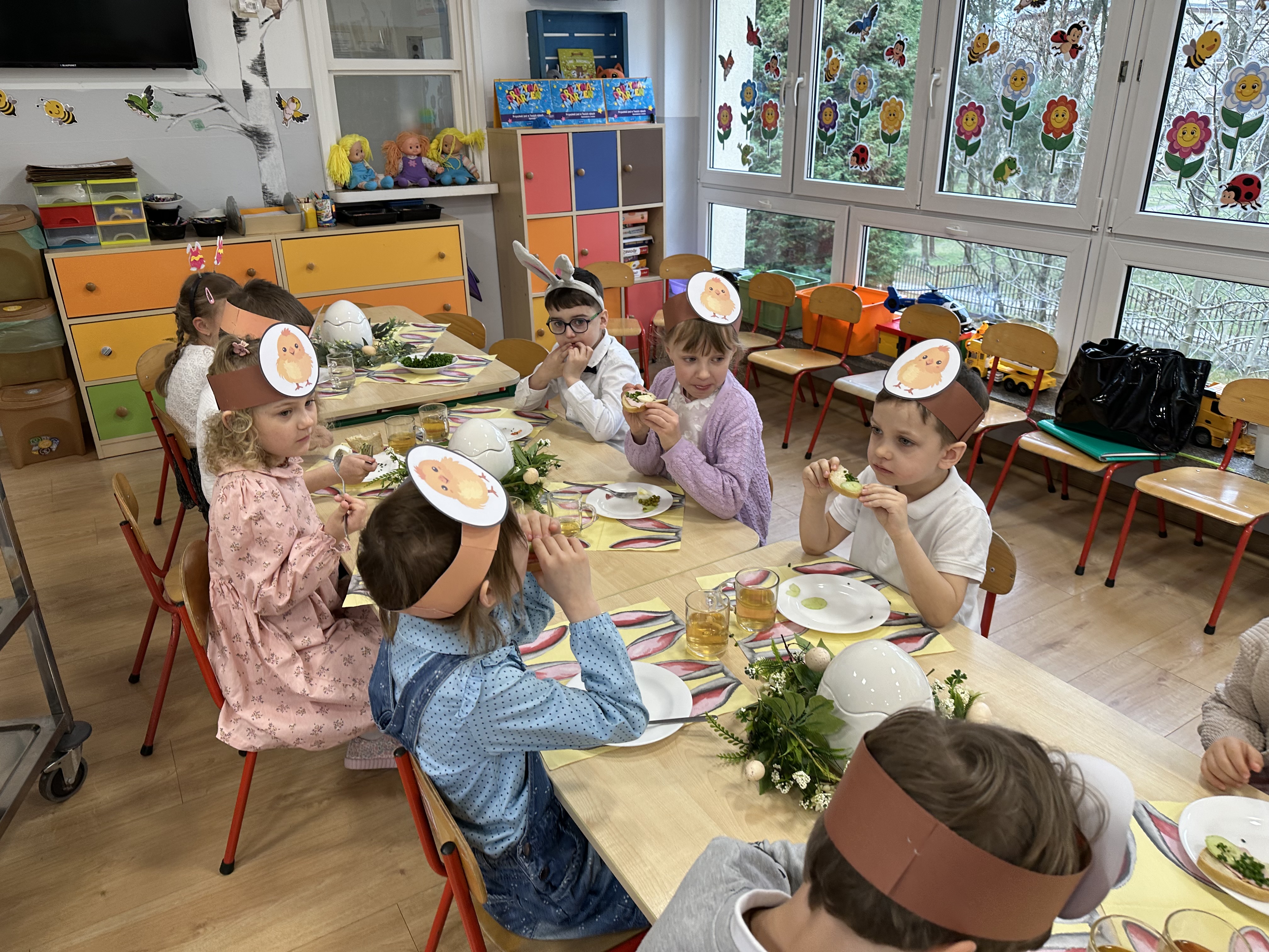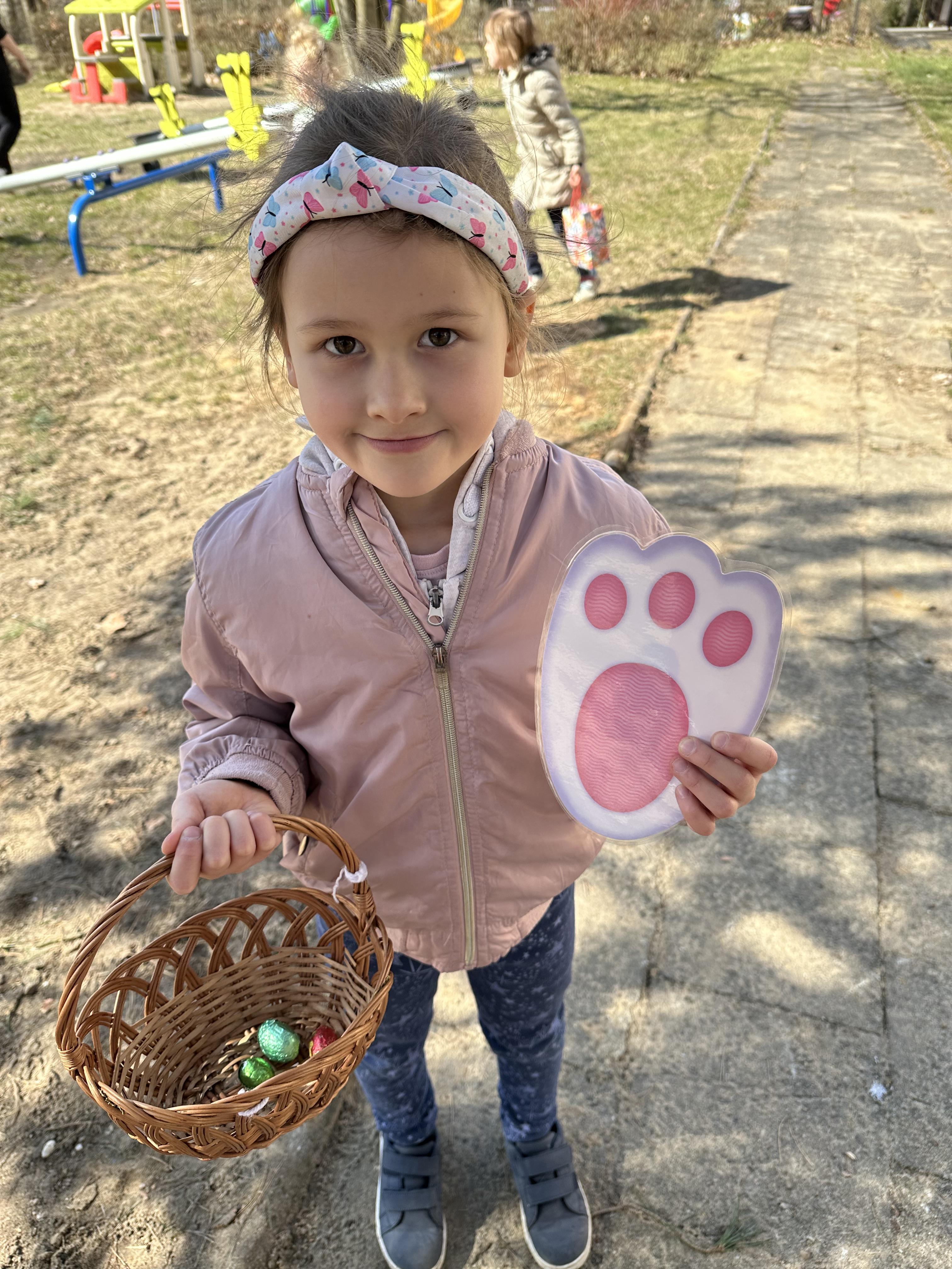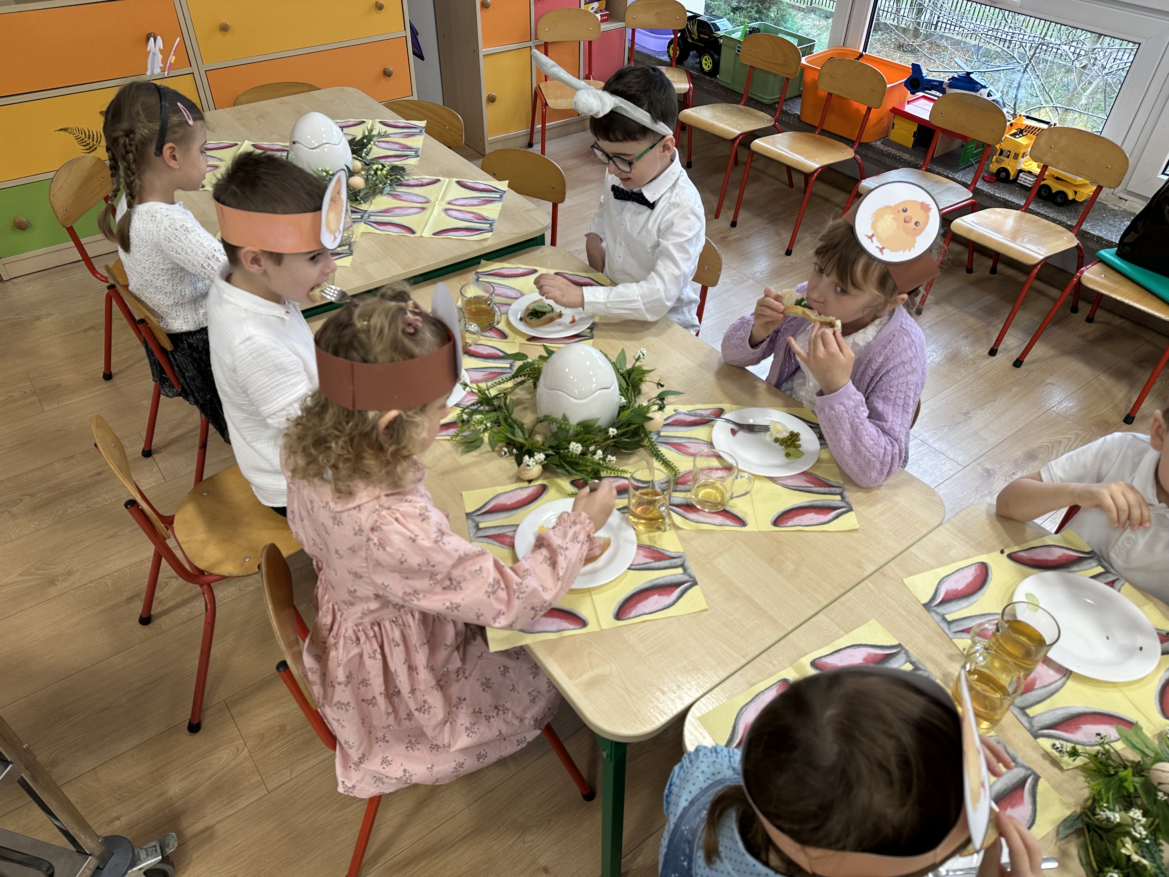 Drugiego kwietnia starszaki oraz pozostałe grupy w naszym przedszkolu rozpoczęły dzień od uroczystego Śniadania Wielkanocnego. Był to wyjątkowy czas pełen radości oraz wspólnego świętowania. Następnie ,,Pszczółki” udały się do ogrodu przedszkolnego, gdzie – zgodnie z tradycją – zajączek ukrył dla nich niespodzianki w postaci czekoladowych jajeczek. Dzieci z ogromnym zaangażowaniem i entuzjazmem poszukiwały upominków, a zabawie towarzyszyło wiele uśmiechu i radosnych emocji. Po powrocie do przedszkola „Pszczółki” wraz z wychowawcą złożyły świąteczne życzenia Pani Dyrektor oraz wszystkim pracownikom placówki, wręczając przy tym drobne wielkanocne upominki. Nie zabrakło również pamiątkowych fotografii, które będą pięknym wspomnieniem tego wyjątkowego dnia. Dzieci złożyły także świąteczne życzenia rodzicom oraz całej społeczności przedszkolnej. Życzenia te zostały uwiecznione na specjalnie przygotowanym filmiku.