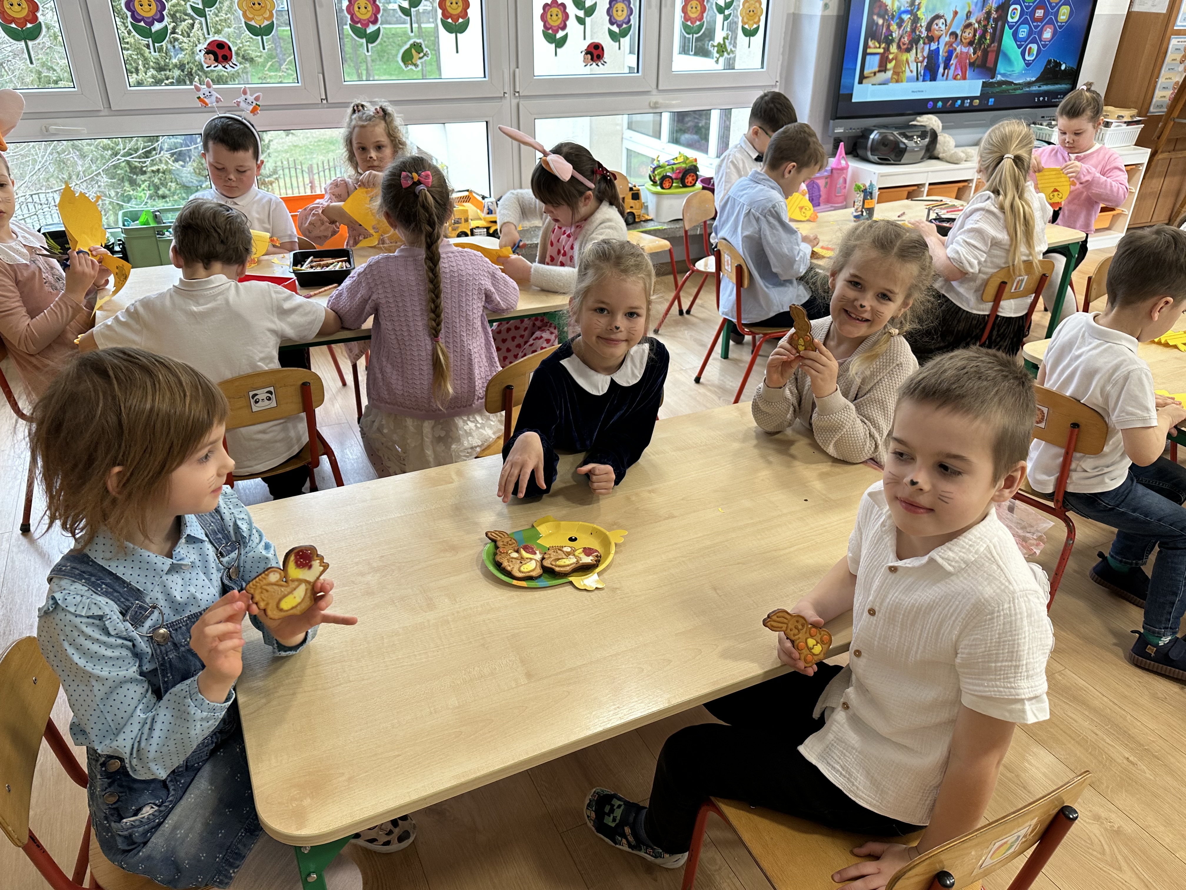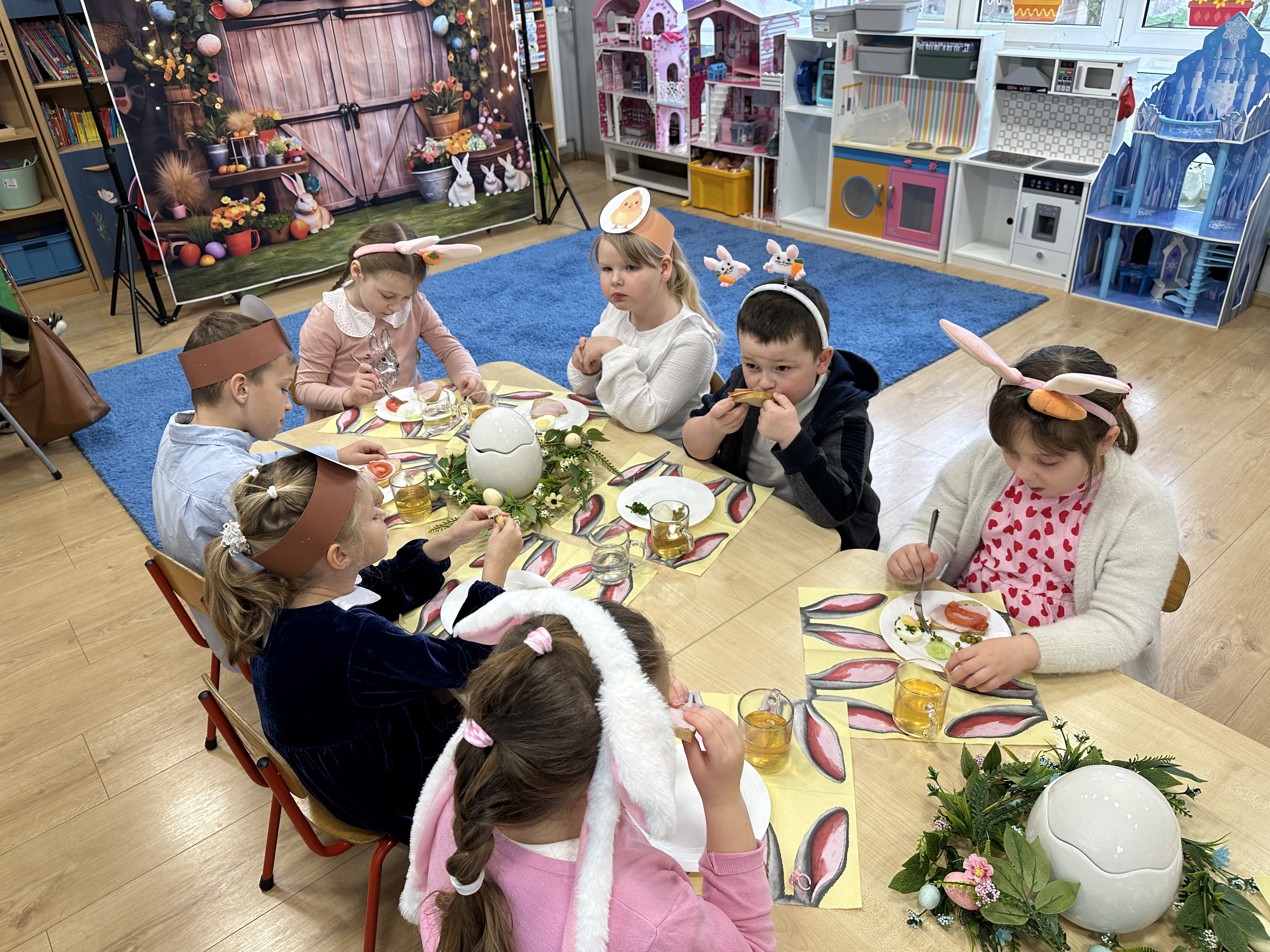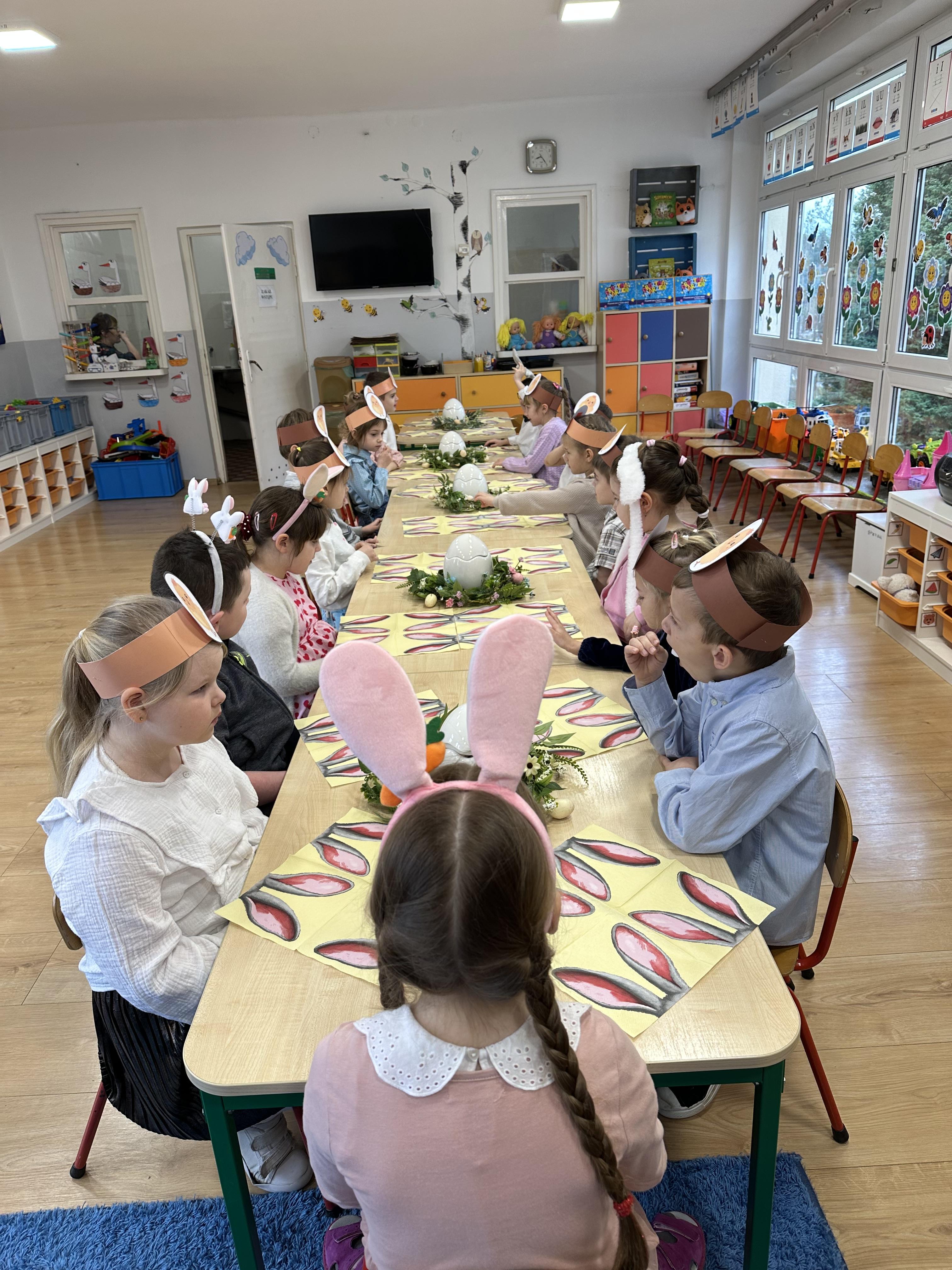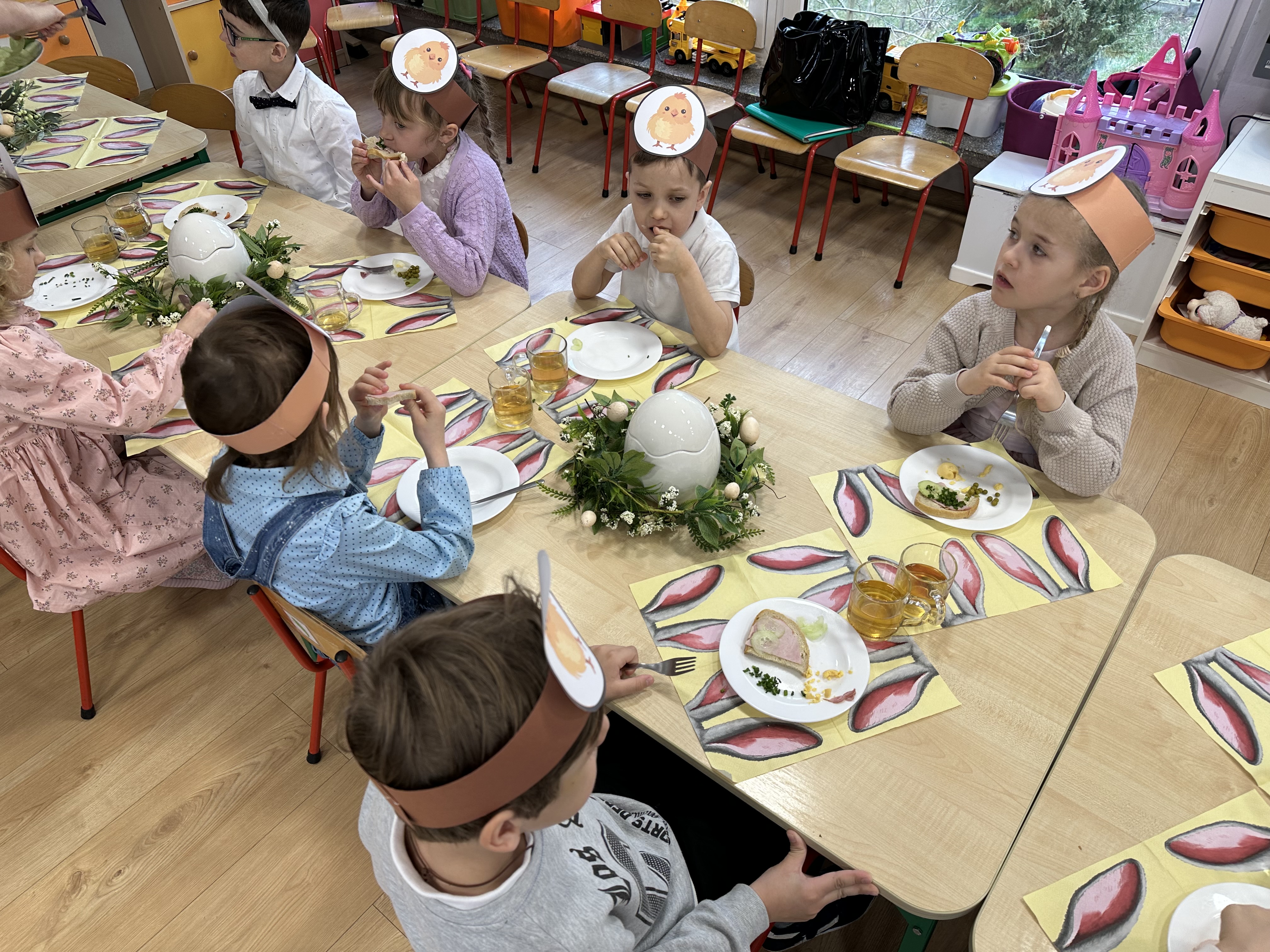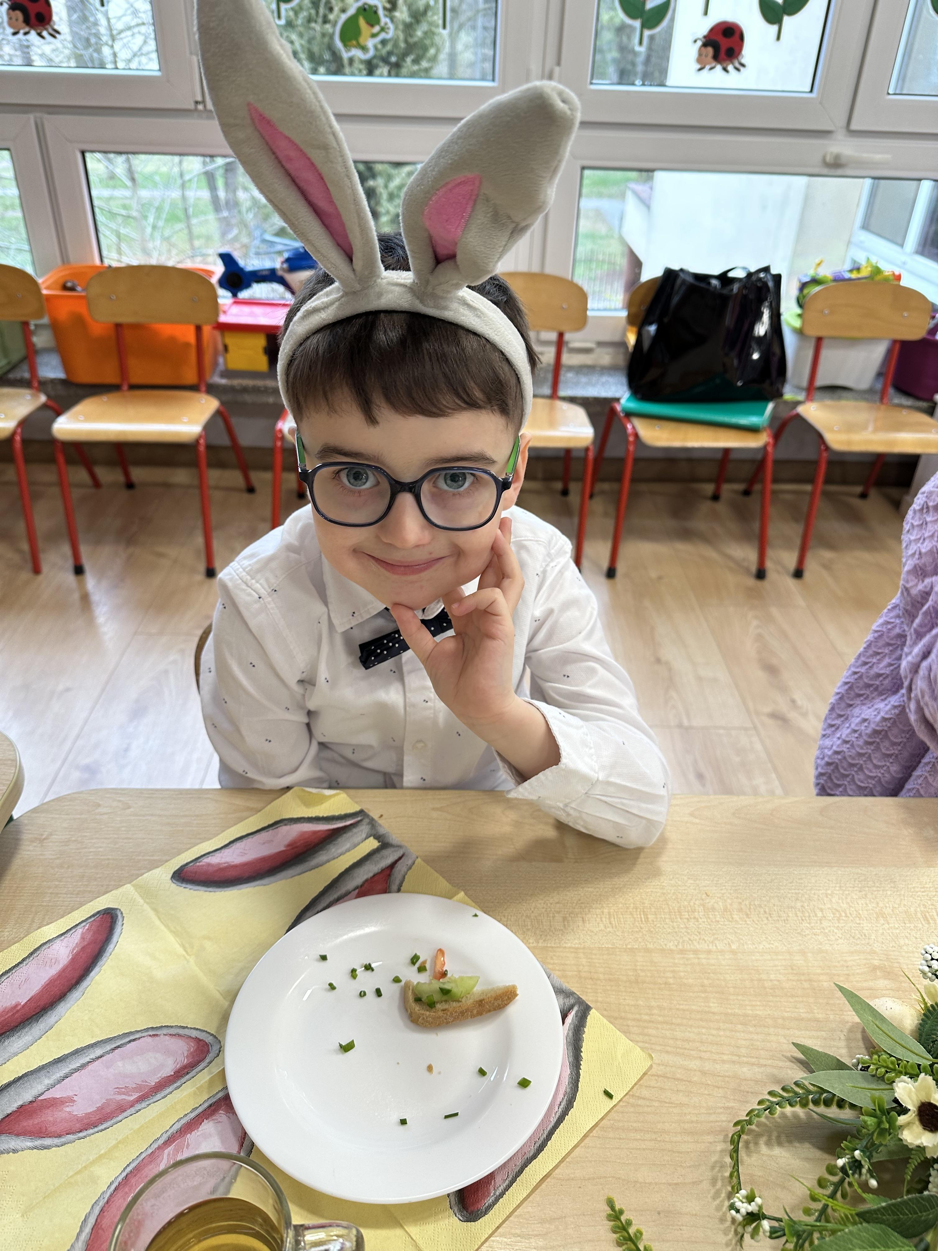 Drugiego kwietnia starszaki oraz pozostałe grupy w naszym przedszkolu rozpoczęły dzień od uroczystego Śniadania Wielkanocnego. Był to wyjątkowy czas pełen radości oraz wspólnego świętowania. Następnie ,,Pszczółki” udały się do ogrodu przedszkolnego, gdzie – zgodnie z tradycją – zajączek ukrył dla nich niespodzianki w postaci czekoladowych jajeczek. Dzieci z ogromnym zaangażowaniem i entuzjazmem poszukiwały upominków, a zabawie towarzyszyło wiele uśmiechu i radosnych emocji. Po powrocie do przedszkola „Pszczółki” wraz z wychowawcą złożyły świąteczne życzenia Pani Dyrektor oraz wszystkim pracownikom placówki, wręczając przy tym drobne wielkanocne upominki. Nie zabrakło również pamiątkowych fotografii, które będą pięknym wspomnieniem tego wyjątkowego dnia. Dzieci złożyły także świąteczne życzenia rodzicom oraz całej społeczności przedszkolnej. Życzenia te zostały uwiecznione na specjalnie przygotowanym filmiku.