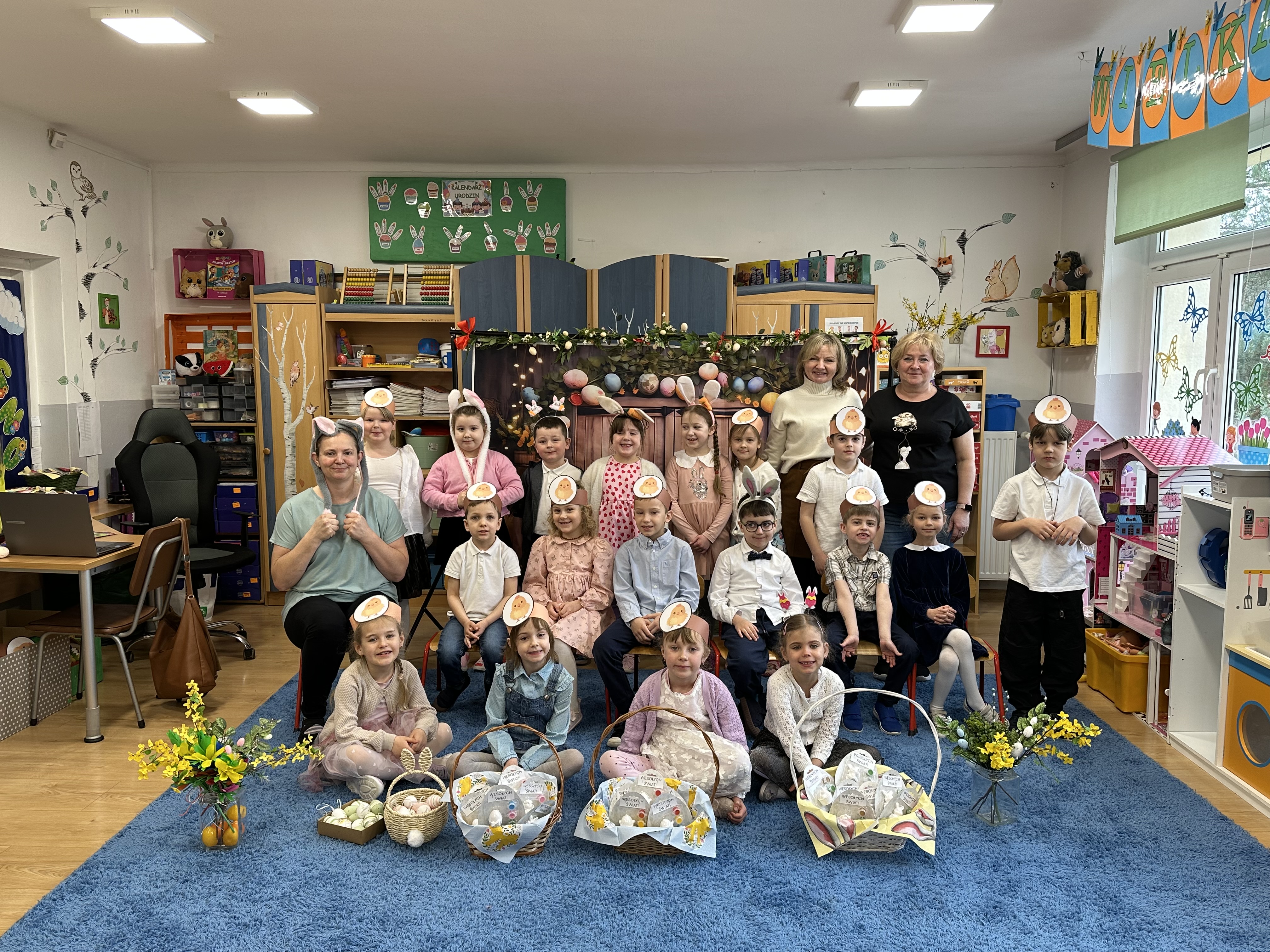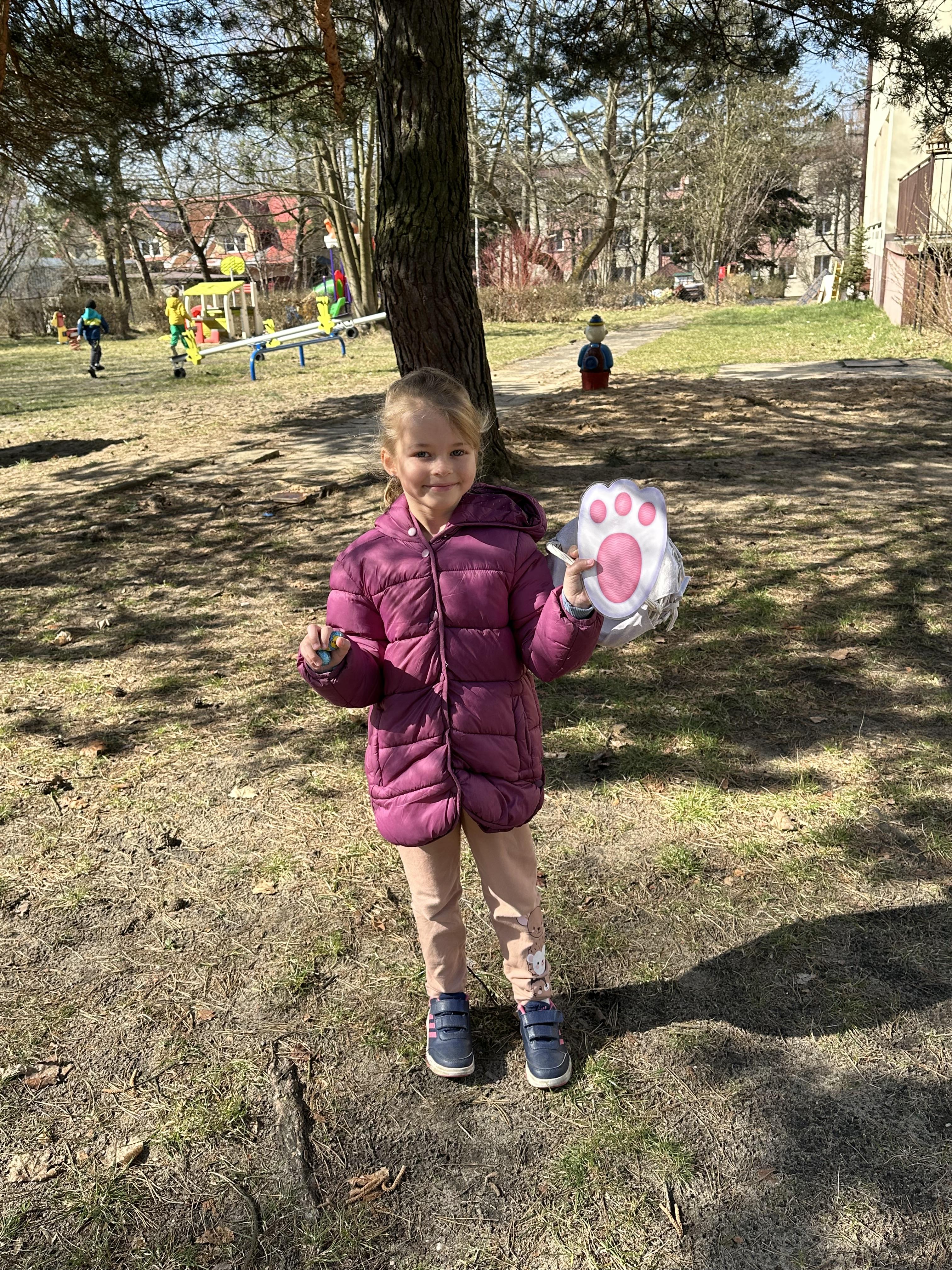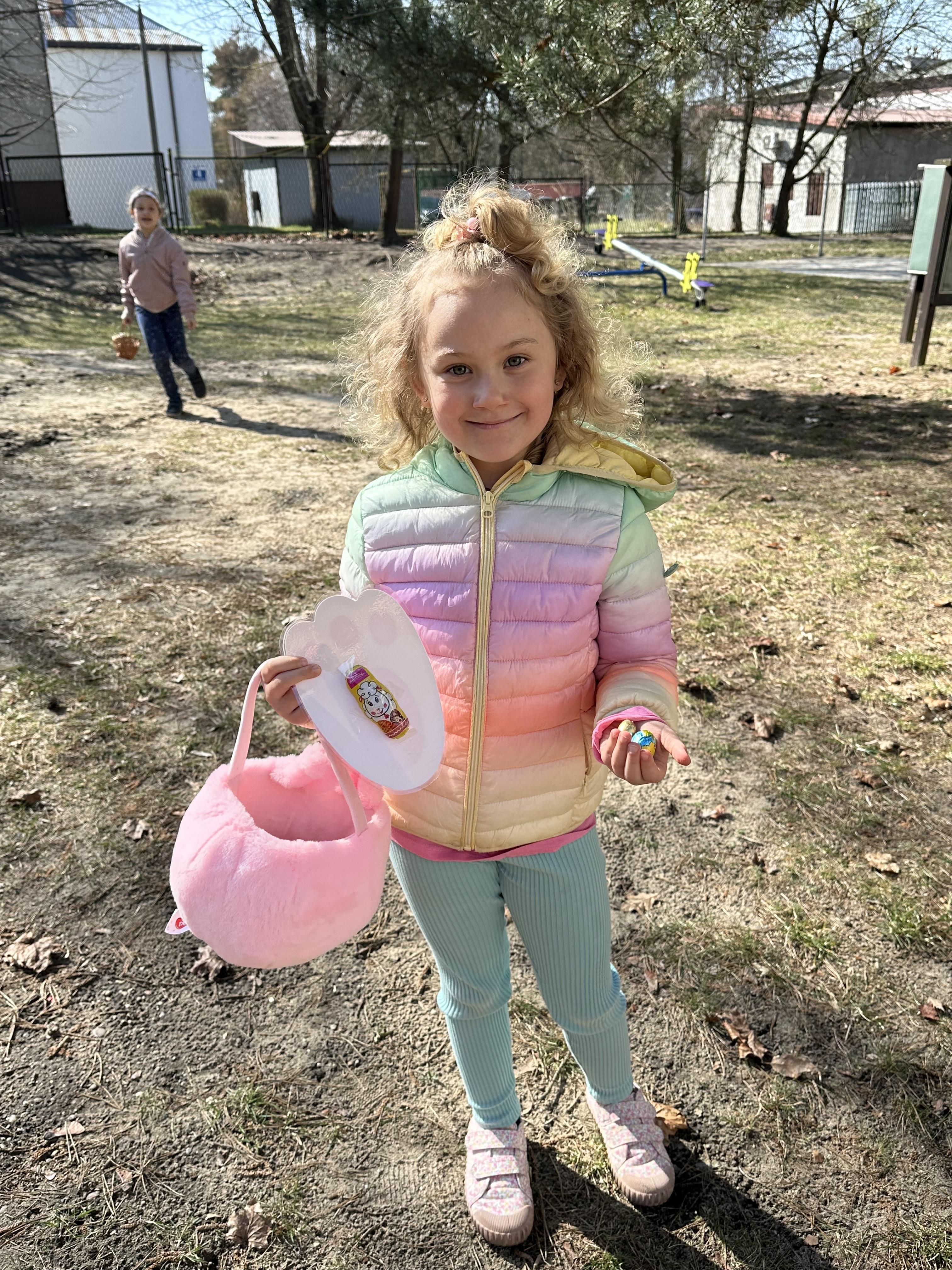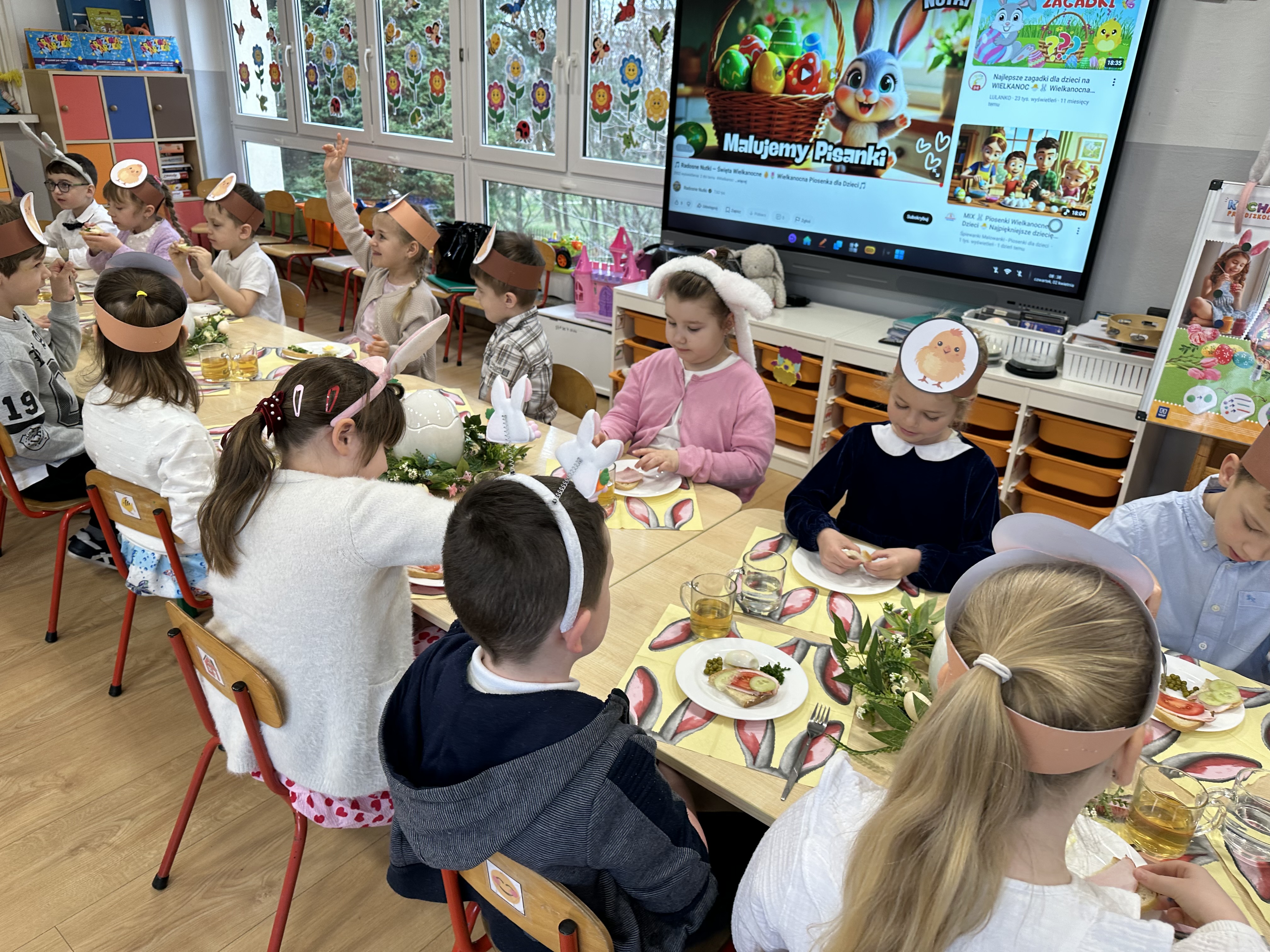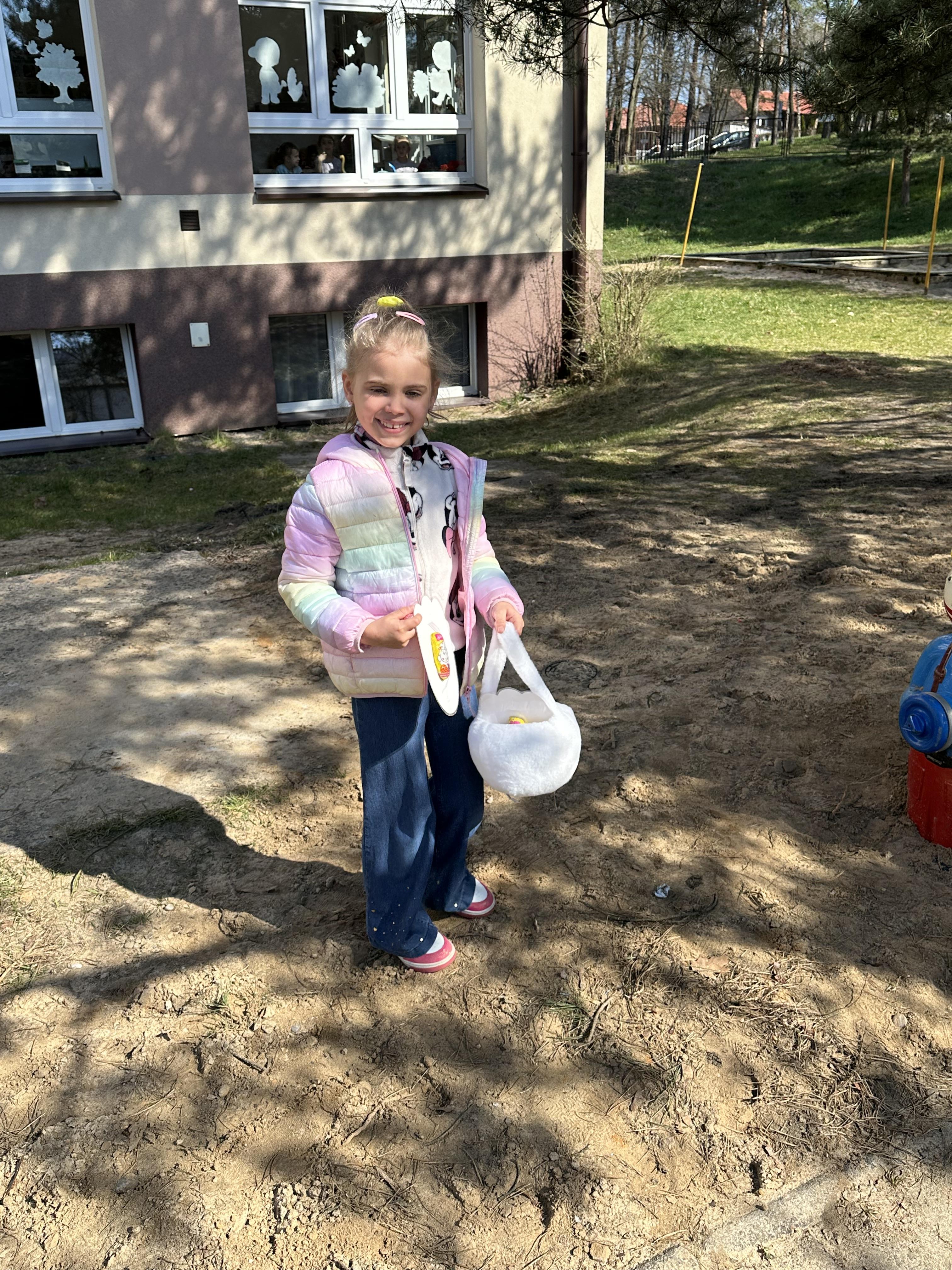 Drugiego kwietnia starszaki oraz pozostałe grupy w naszym przedszkolu rozpoczęły dzień od uroczystego Śniadania Wielkanocnego. Był to wyjątkowy czas pełen radości oraz wspólnego świętowania. Następnie ,,Pszczółki” udały się do ogrodu przedszkolnego, gdzie – zgodnie z tradycją – zajączek ukrył dla nich niespodzianki w postaci czekoladowych jajeczek. Dzieci z ogromnym zaangażowaniem i entuzjazmem poszukiwały upominków, a zabawie towarzyszyło wiele uśmiechu i radosnych emocji. Po powrocie do przedszkola „Pszczółki” wraz z wychowawcą złożyły świąteczne życzenia Pani Dyrektor oraz wszystkim pracownikom placówki, wręczając przy tym drobne wielkanocne upominki. Nie zabrakło również pamiątkowych fotografii, które będą pięknym wspomnieniem tego wyjątkowego dnia. Dzieci złożyły także świąteczne życzenia rodzicom oraz całej społeczności przedszkolnej. Życzenia te zostały uwiecznione na specjalnie przygotowanym filmiku.