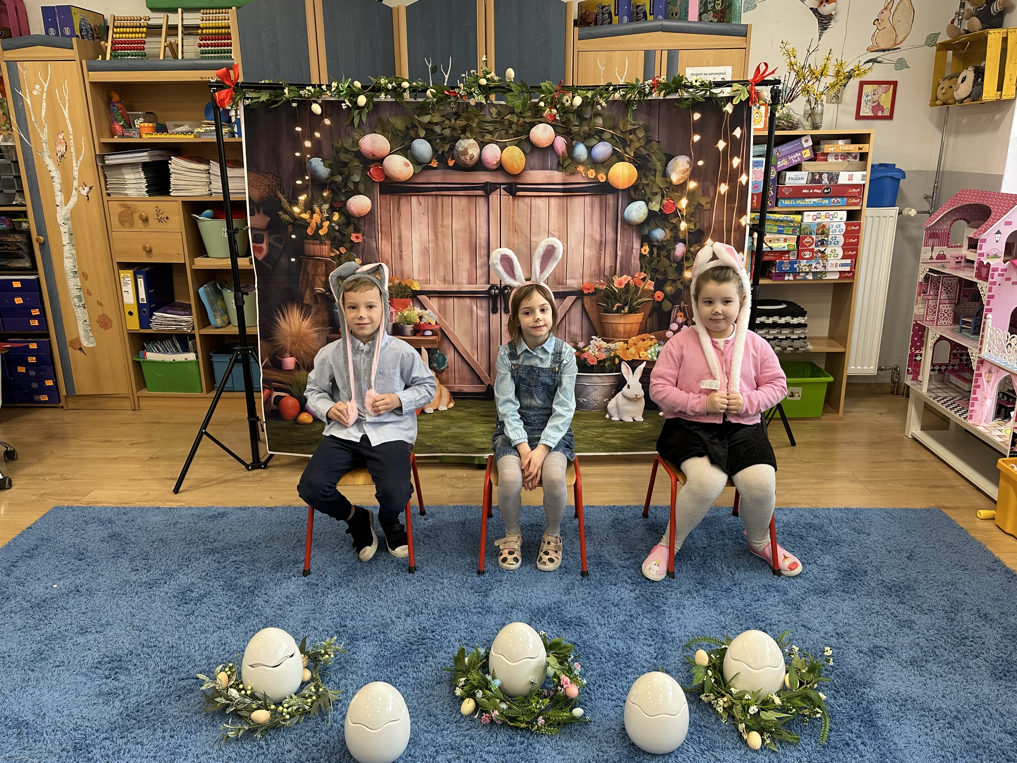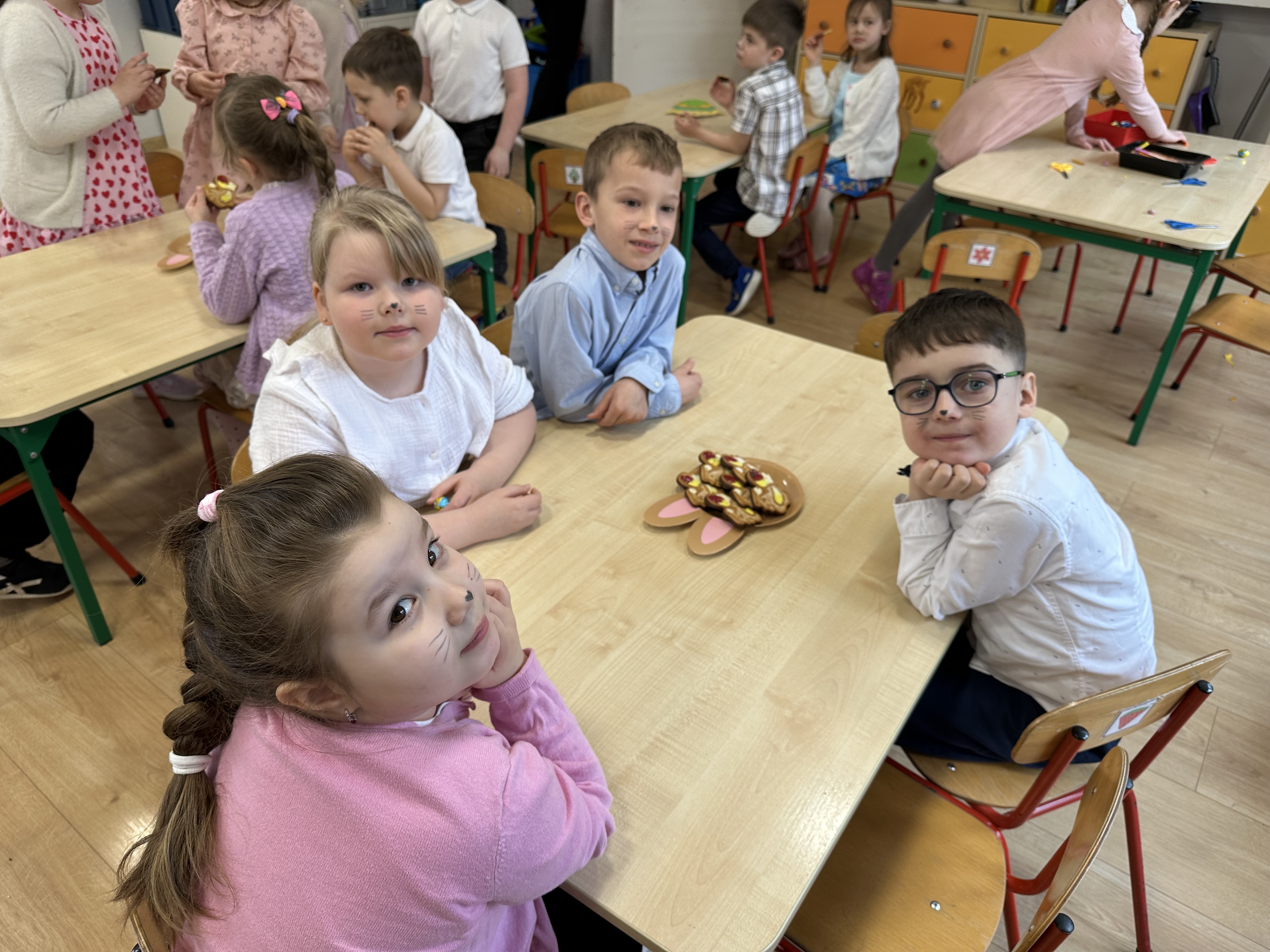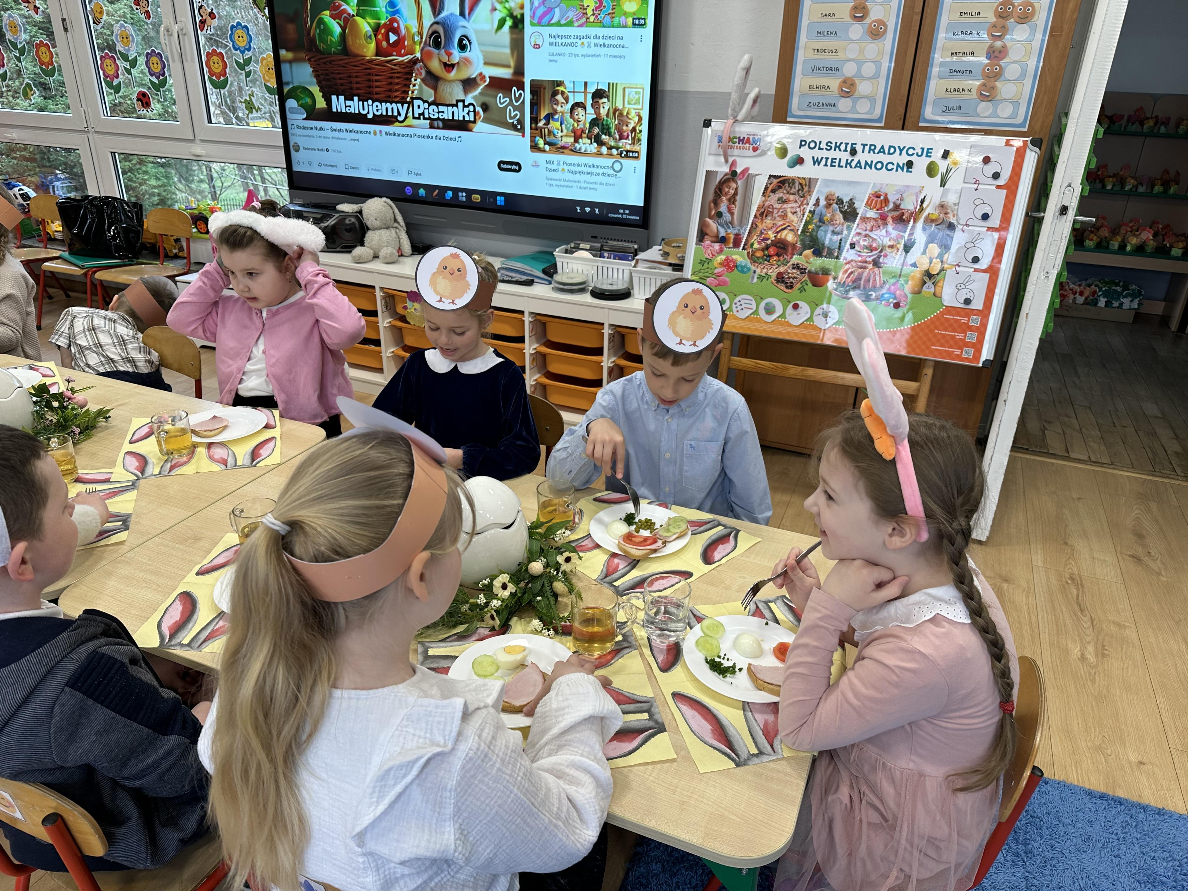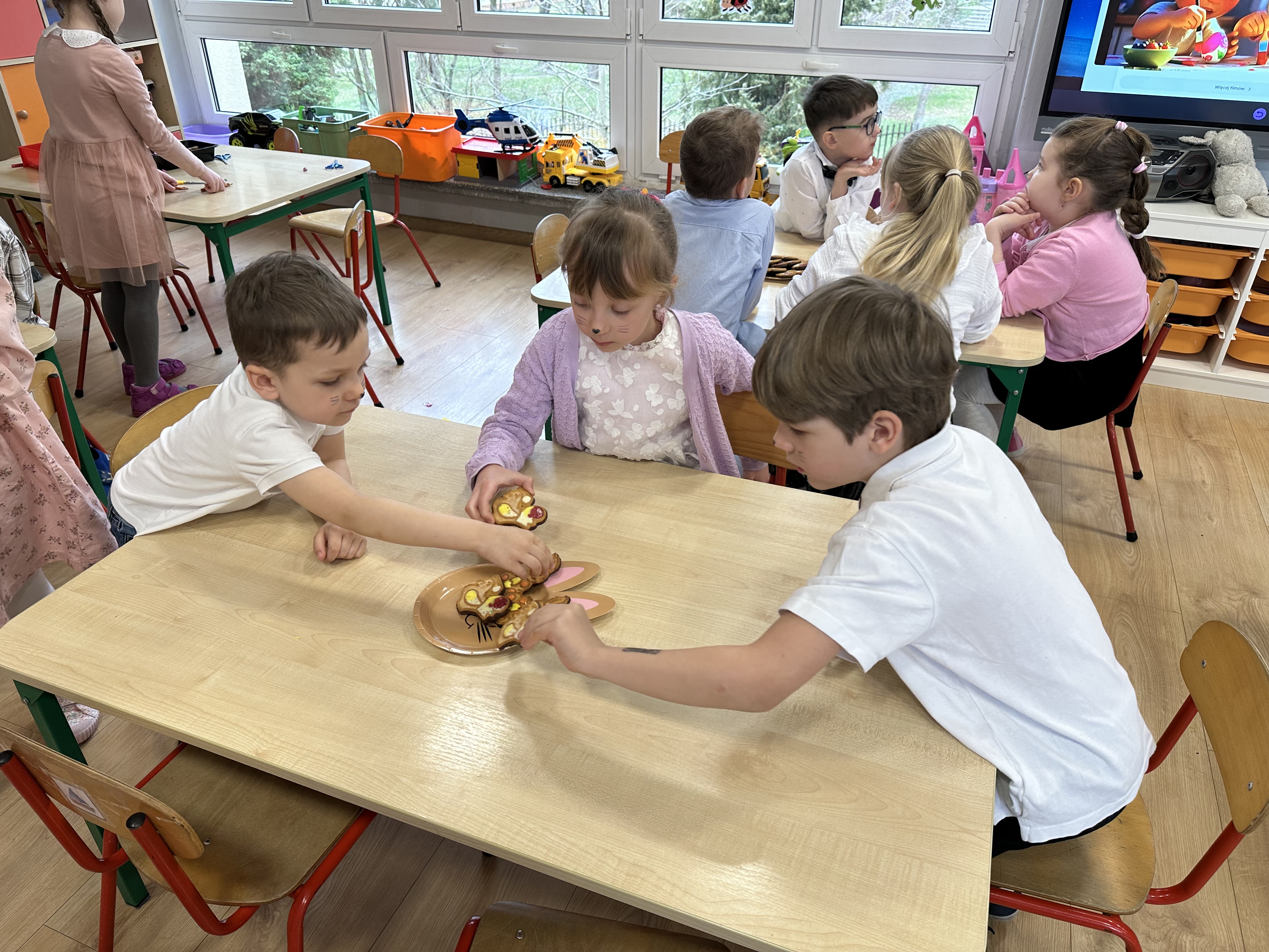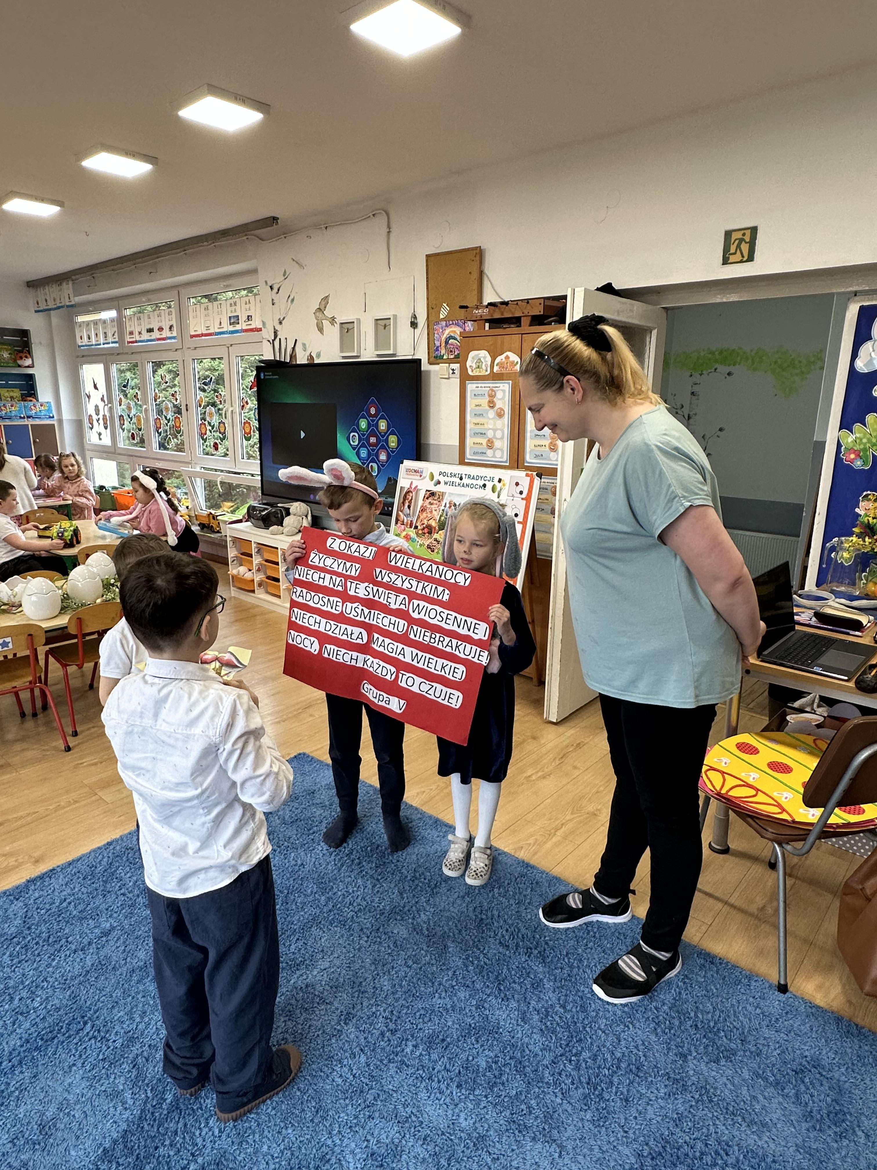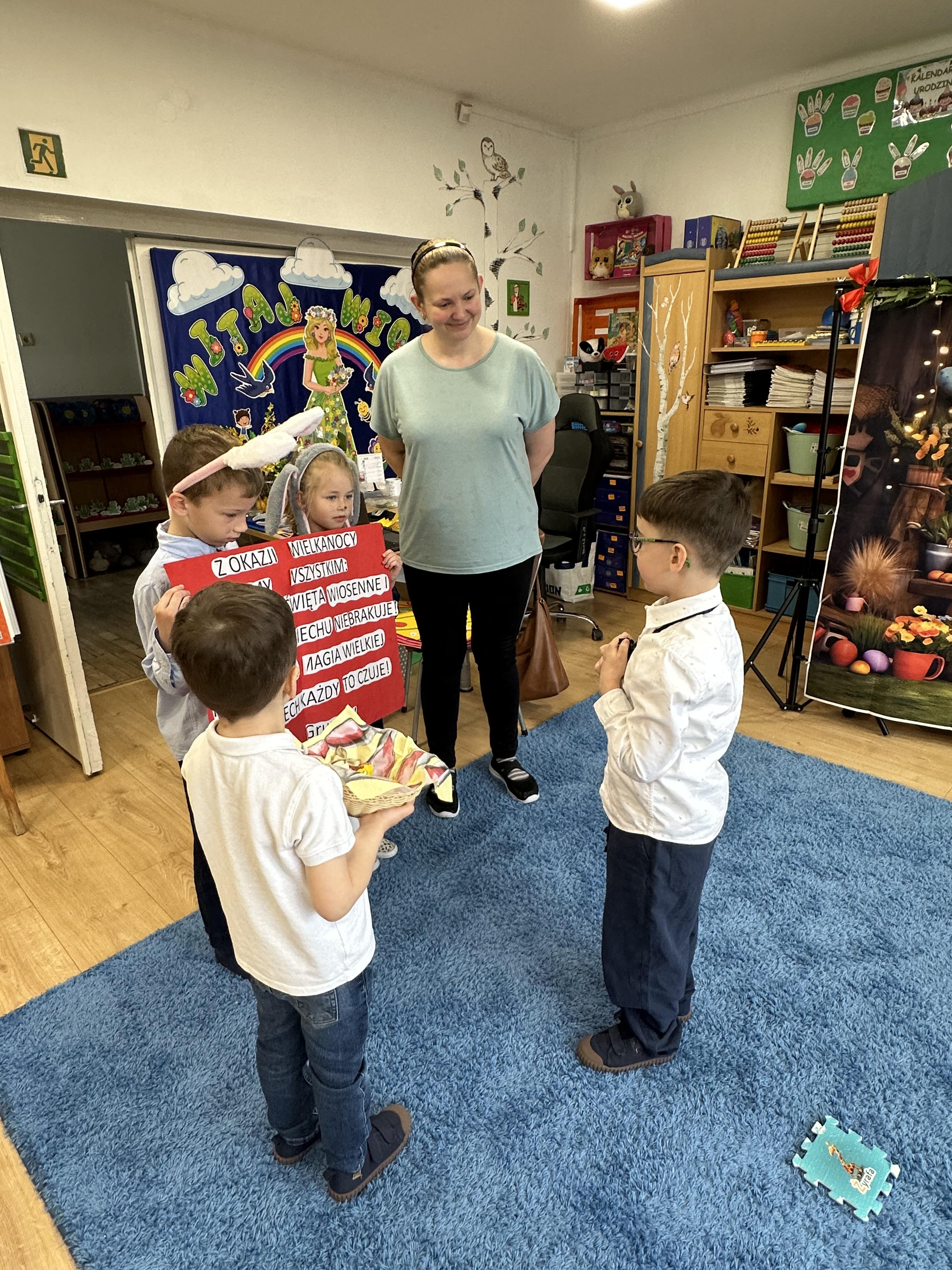 Drugiego kwietnia starszaki oraz pozostałe grupy w naszym przedszkolu rozpoczęły dzień od uroczystego Śniadania Wielkanocnego. Był to wyjątkowy czas pełen radości oraz wspólnego świętowania. Następnie ,,Pszczółki” udały się do ogrodu przedszkolnego, gdzie – zgodnie z tradycją – zajączek ukrył dla nich niespodzianki w postaci czekoladowych jajeczek. Dzieci z ogromnym zaangażowaniem i entuzjazmem poszukiwały upominków, a zabawie towarzyszyło wiele uśmiechu i radosnych emocji. Po powrocie do przedszkola „Pszczółki” wraz z wychowawcą złożyły świąteczne życzenia Pani Dyrektor oraz wszystkim pracownikom placówki, wręczając przy tym drobne wielkanocne upominki. Nie zabrakło również pamiątkowych fotografii, które będą pięknym wspomnieniem tego wyjątkowego dnia. Dzieci złożyły także świąteczne życzenia rodzicom oraz całej społeczności przedszkolnej. Życzenia te zostały uwiecznione na specjalnie przygotowanym filmiku.
