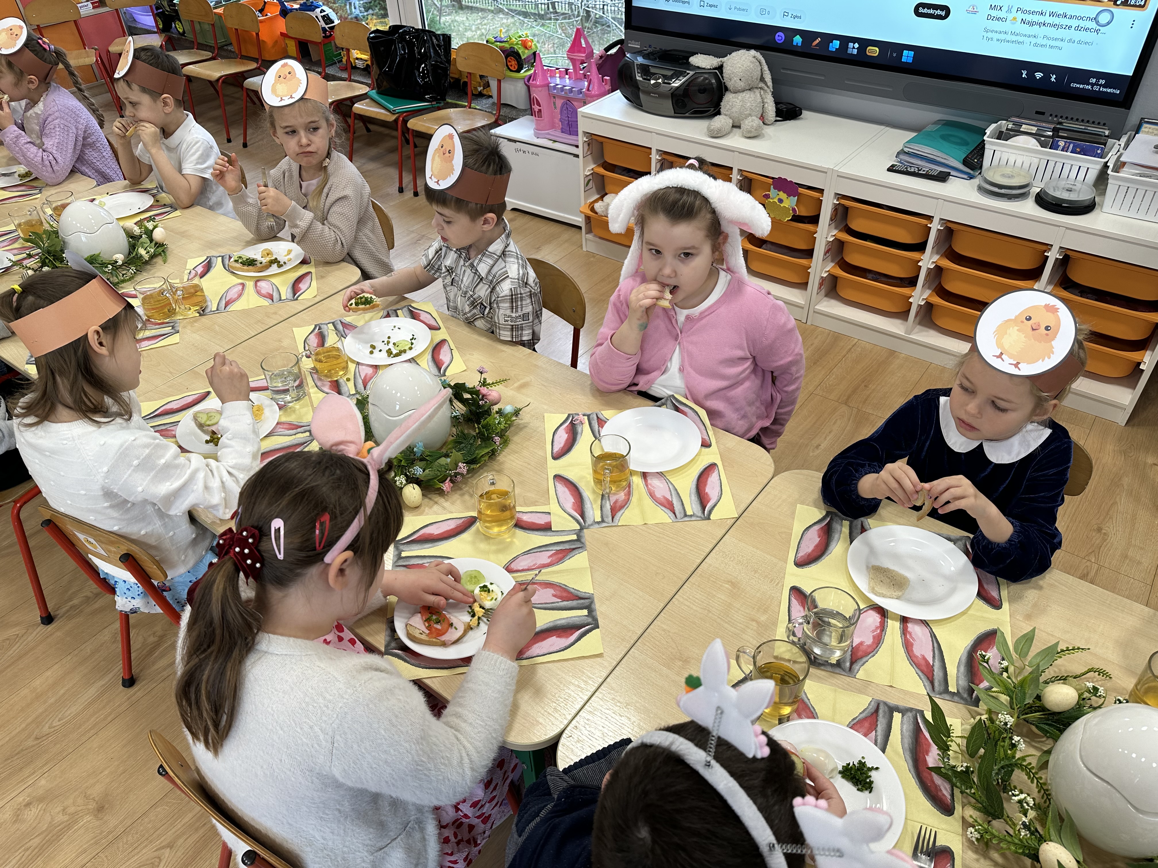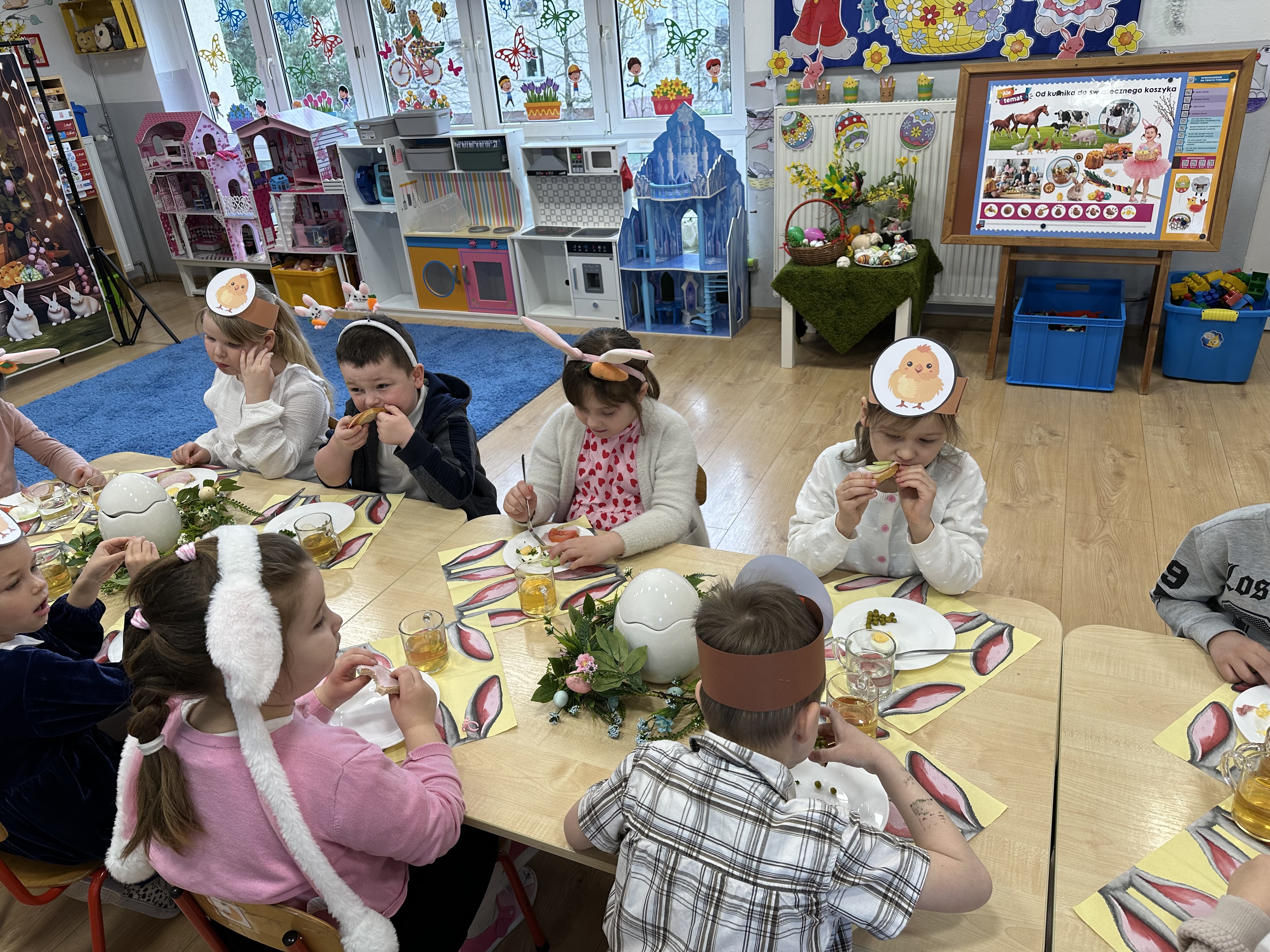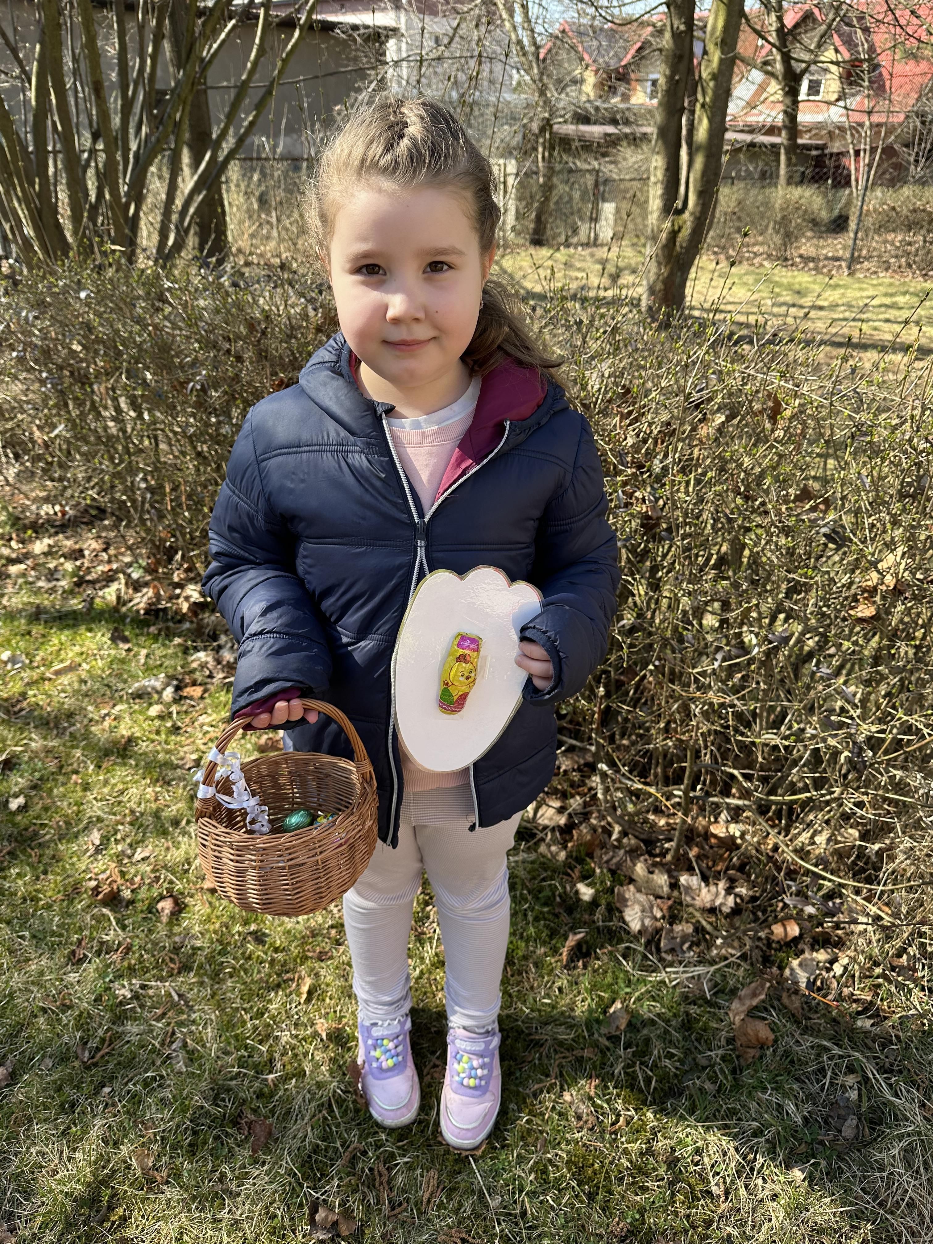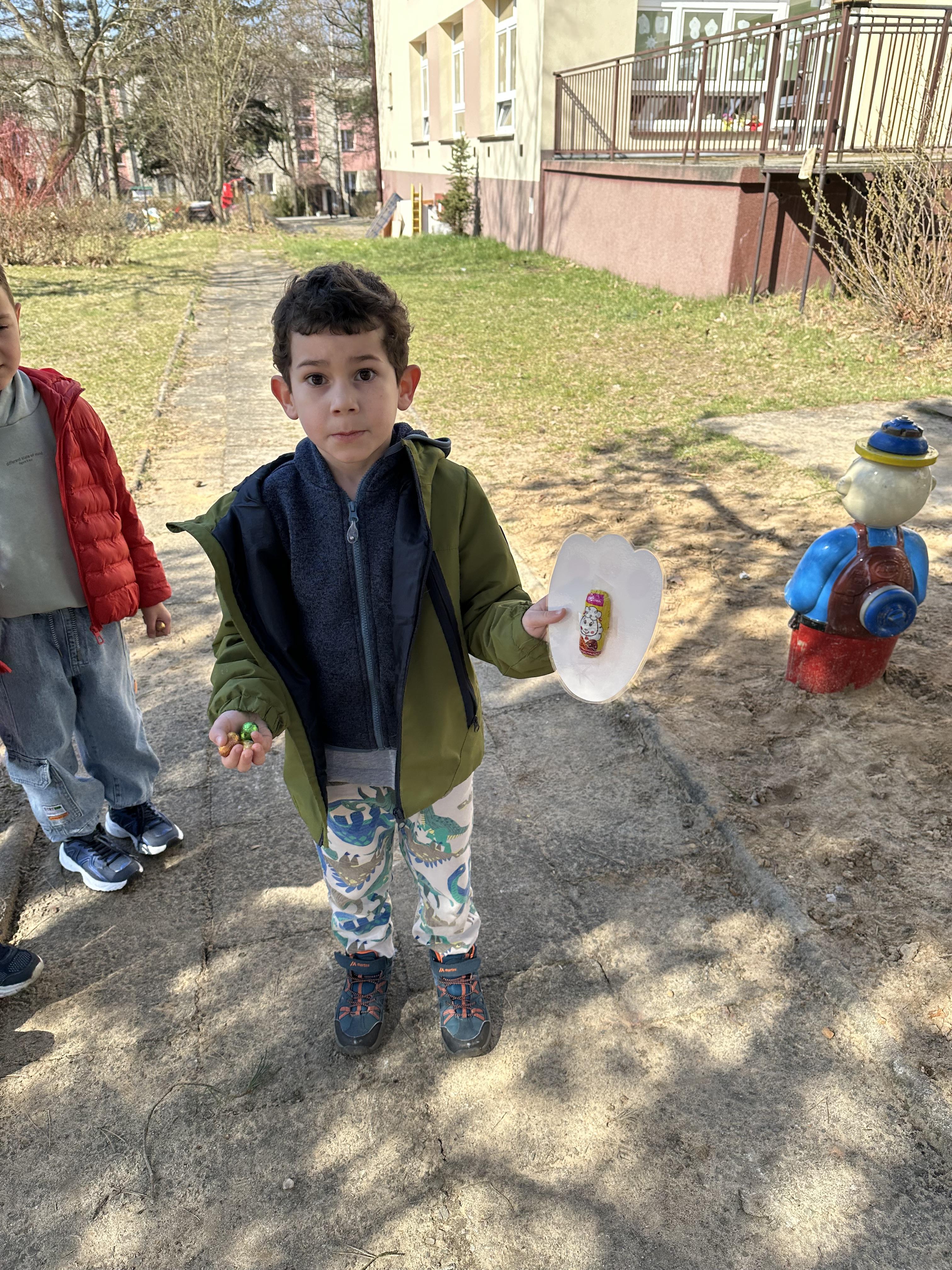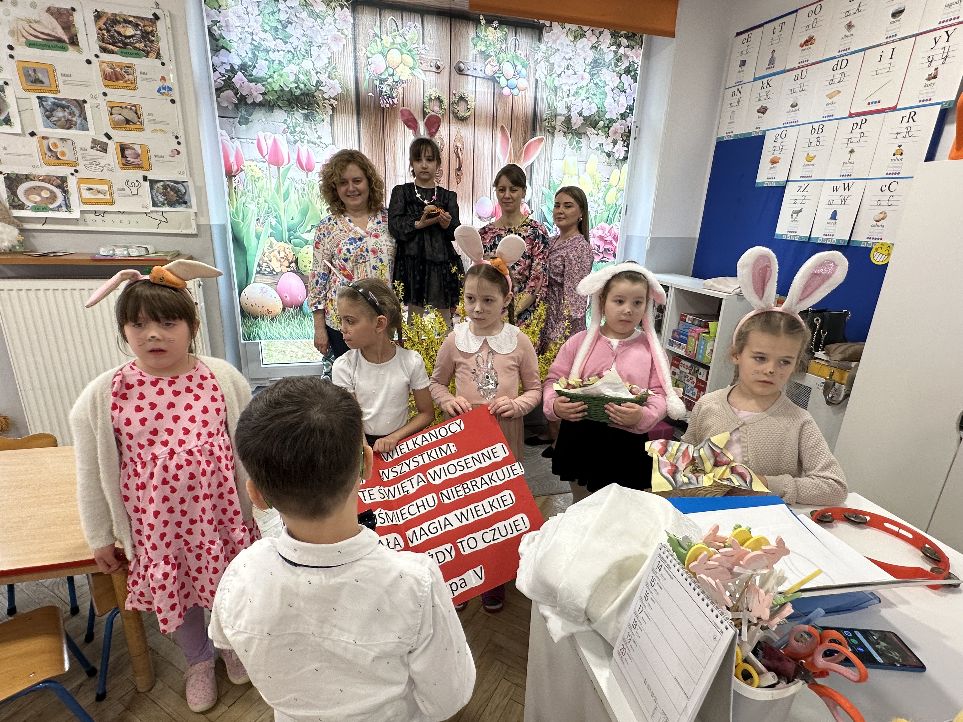 Drugiego kwietnia starszaki oraz pozostałe grupy w naszym przedszkolu rozpoczęły dzień od uroczystego Śniadania Wielkanocnego. Był to wyjątkowy czas pełen radości oraz wspólnego świętowania. Następnie ,,Pszczółki” udały się do ogrodu przedszkolnego, gdzie – zgodnie z tradycją – zajączek ukrył dla nich niespodzianki w postaci czekoladowych jajeczek. Dzieci z ogromnym zaangażowaniem i entuzjazmem poszukiwały upominków, a zabawie towarzyszyło wiele uśmiechu i radosnych emocji. Po powrocie do przedszkola „Pszczółki” wraz z wychowawcą złożyły świąteczne życzenia Pani Dyrektor oraz wszystkim pracownikom placówki, wręczając przy tym drobne wielkanocne upominki. Nie zabrakło również pamiątkowych fotografii, które będą pięknym wspomnieniem tego wyjątkowego dnia. Dzieci złożyły także świąteczne życzenia rodzicom oraz całej społeczności przedszkolnej. Życzenia te zostały uwiecznione na specjalnie przygotowanym filmiku.