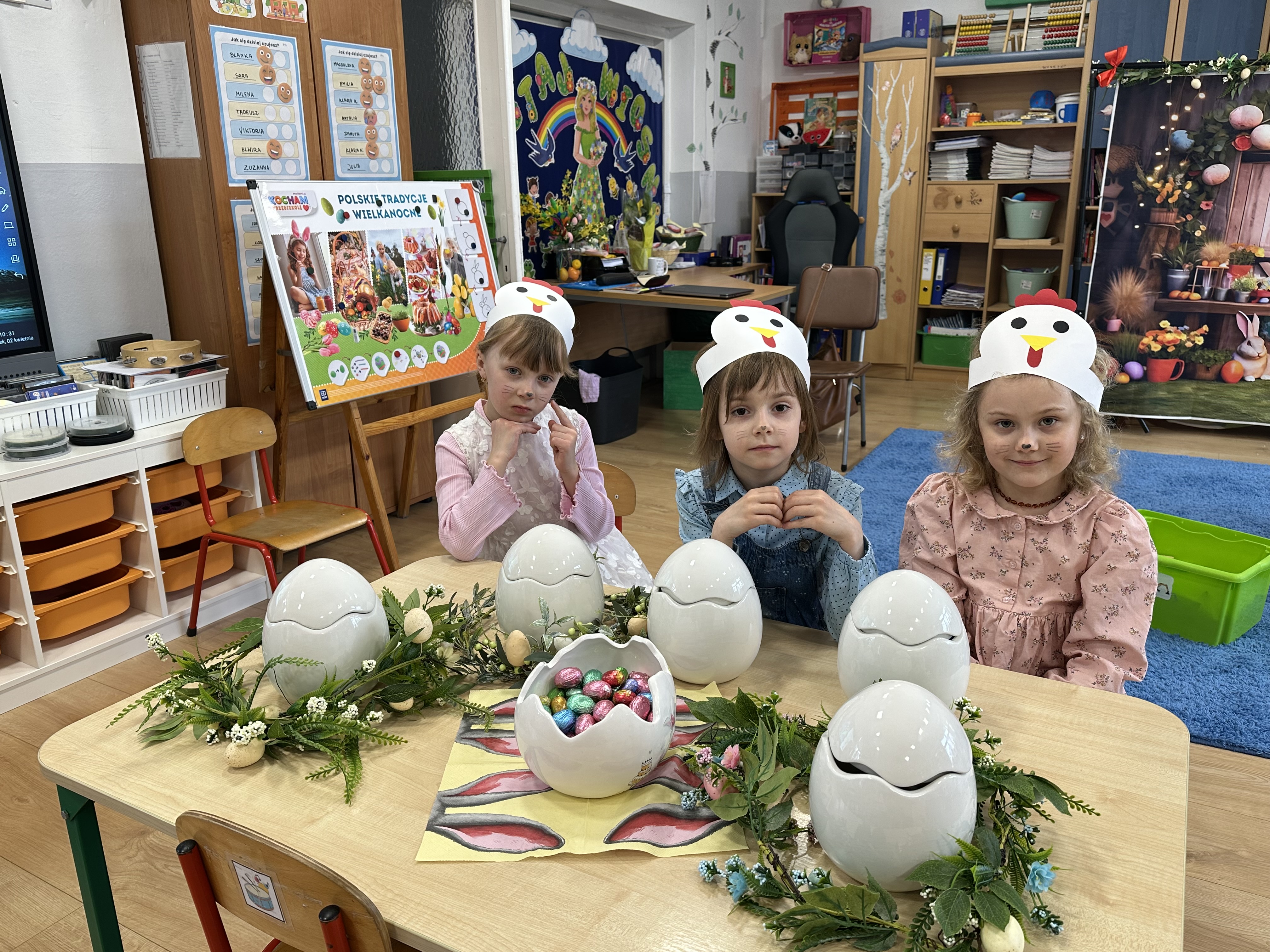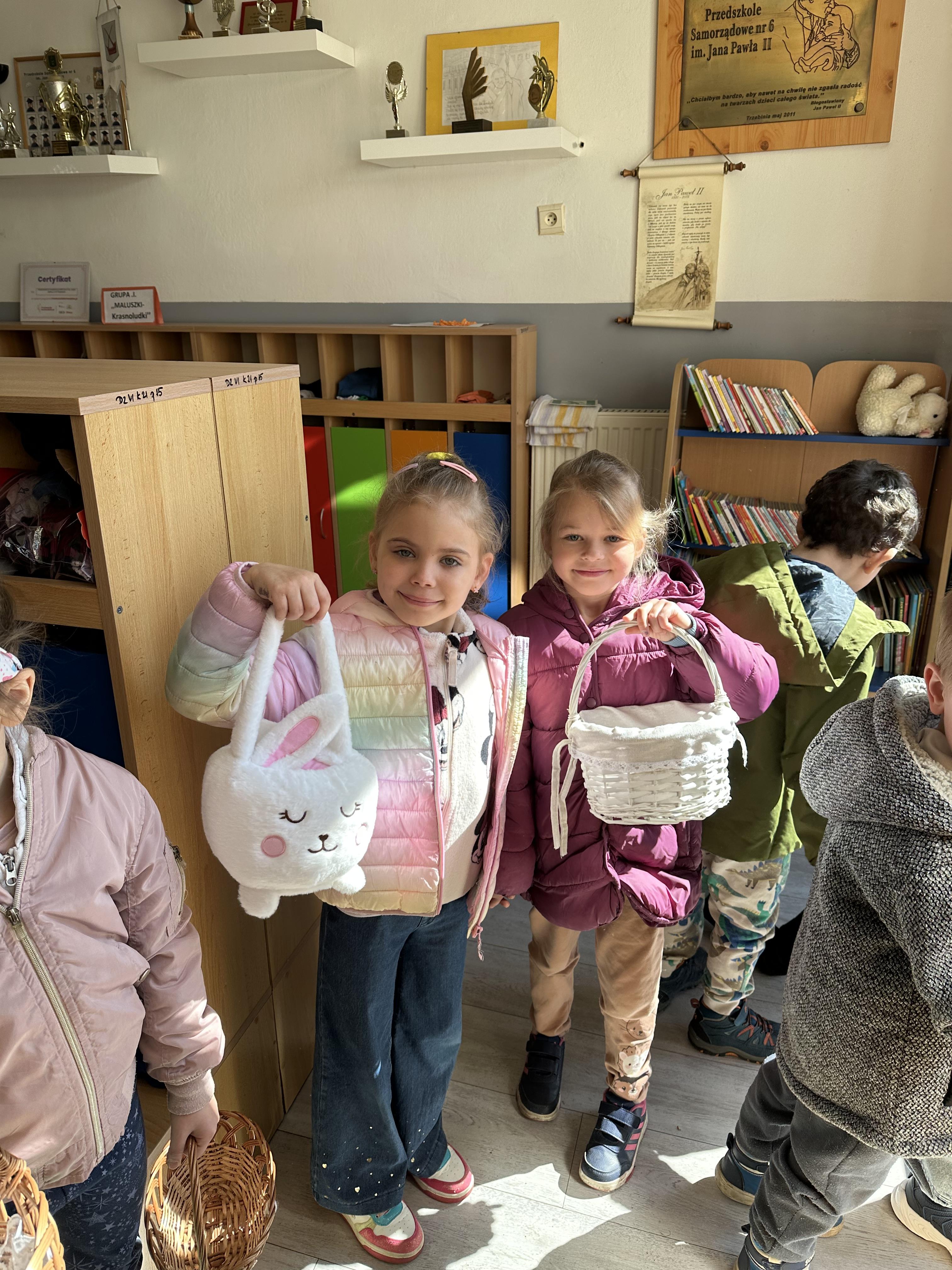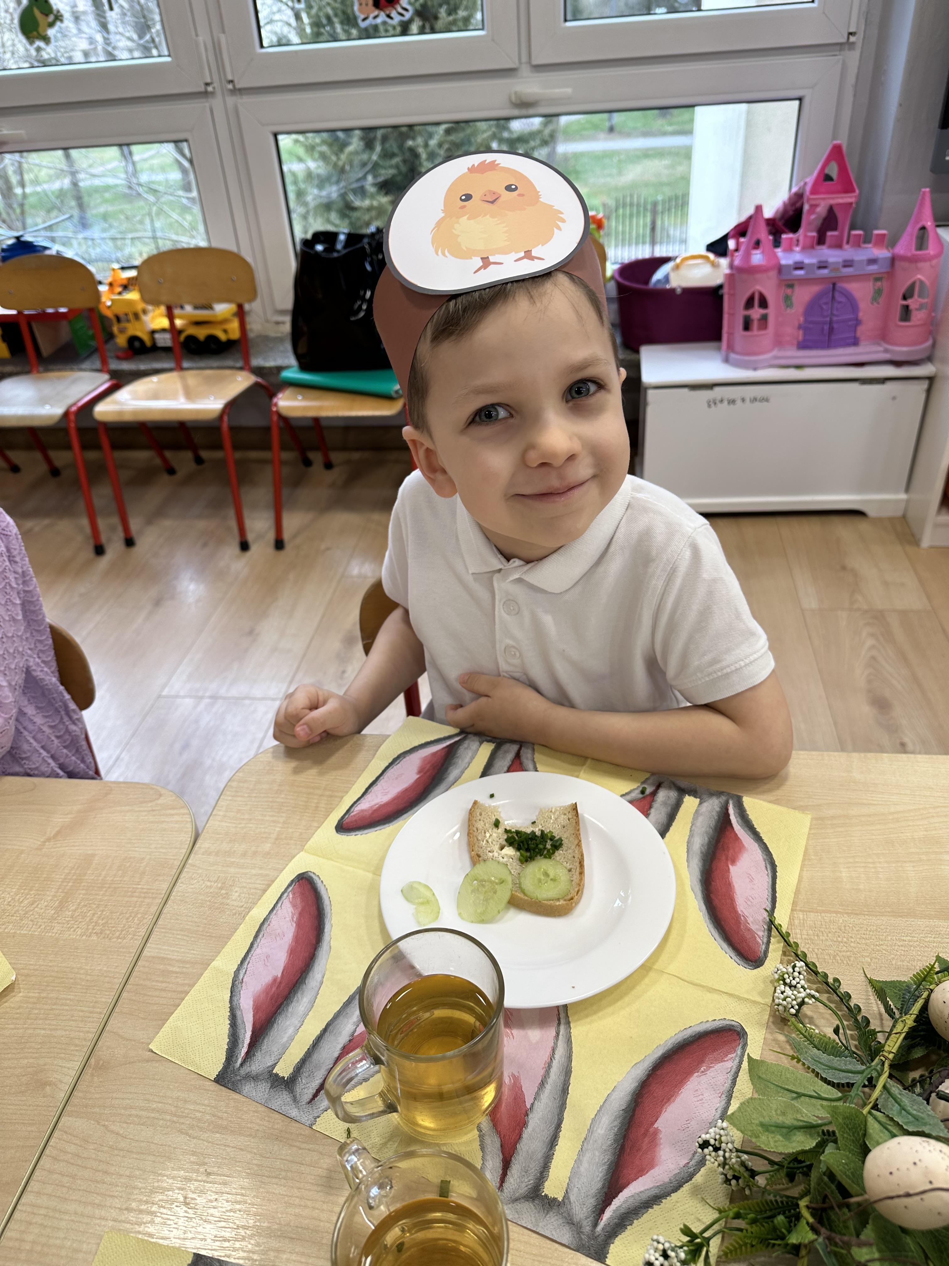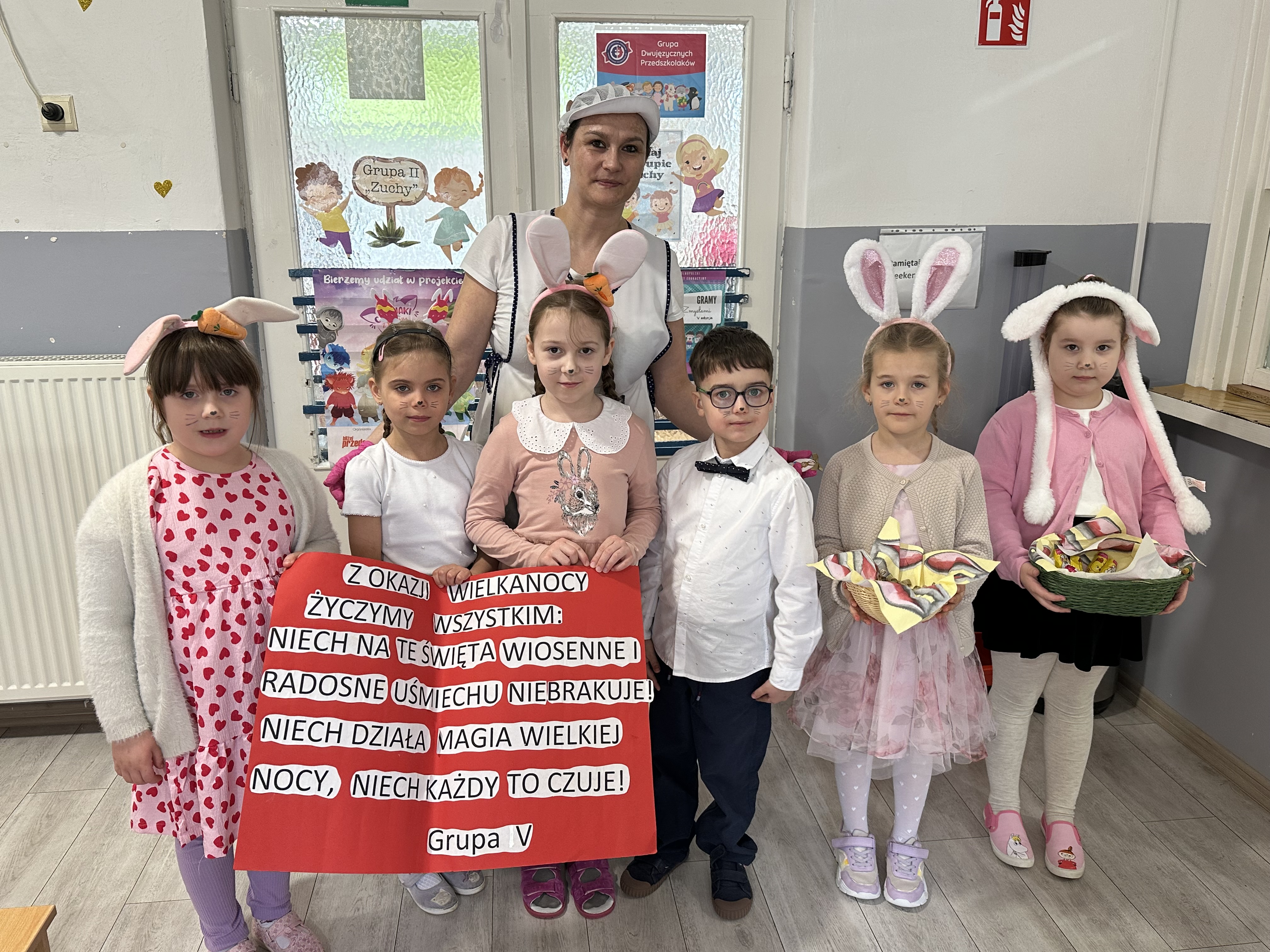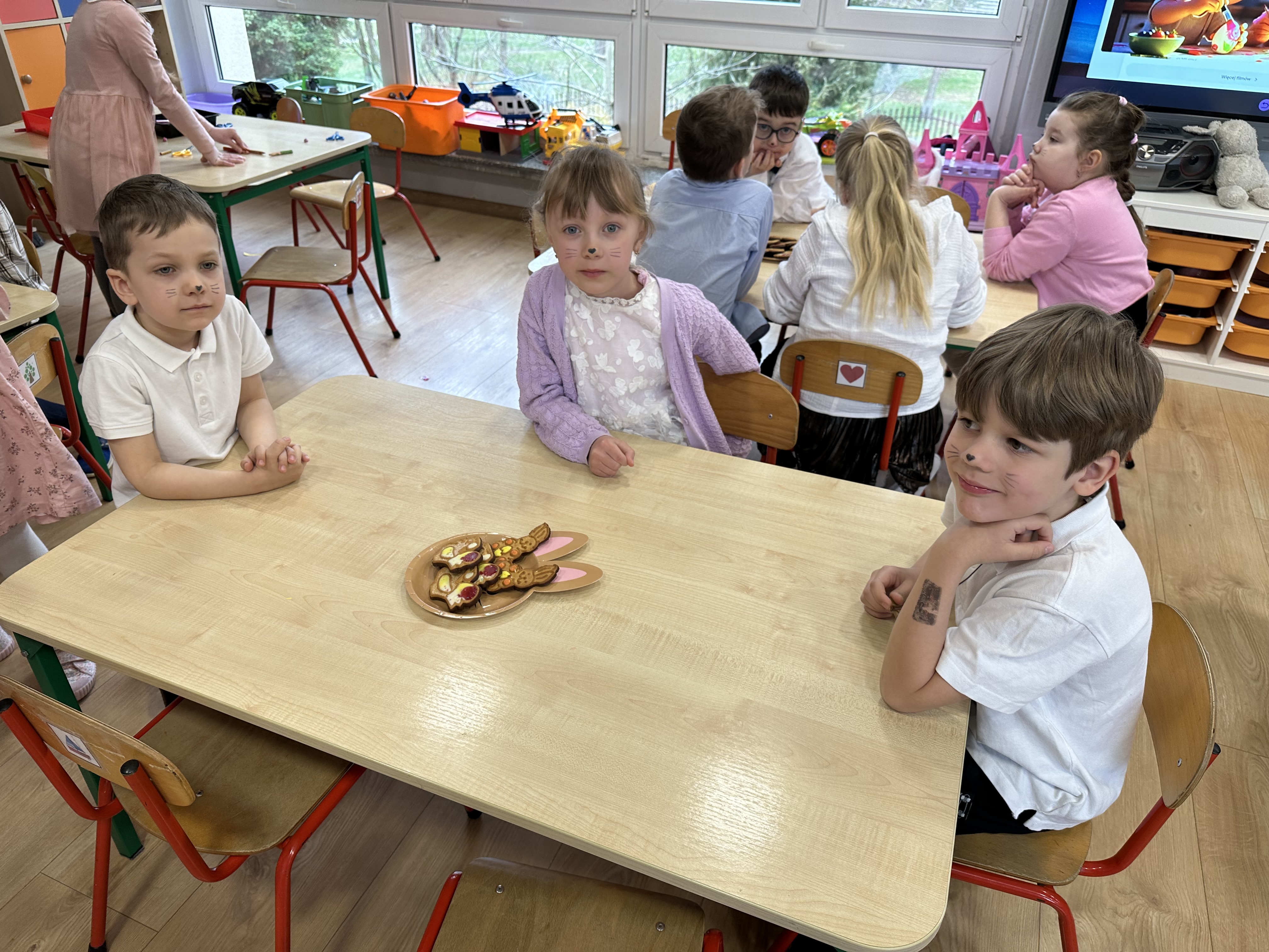Drugiego kwietnia starszaki oraz pozostałe grupy w naszym przedszkolu rozpoczęły dzień od uroczystego Śniadania Wielkanocnego. Był to wyjątkowy czas pełen radości oraz wspólnego świętowania. Następnie ,,Pszczółki” udały się do ogrodu przedszkolnego, gdzie – zgodnie z tradycją – zajączek ukrył dla nich niespodzianki w postaci czekoladowych jajeczek. Dzieci z ogromnym zaangażowaniem i entuzjazmem poszukiwały upominków, a zabawie towarzyszyło wiele uśmiechu i radosnych emocji. Po powrocie do przedszkola „Pszczółki” wraz z wychowawcą złożyły świąteczne życzenia Pani Dyrektor oraz wszystkim pracownikom placówki, wręczając przy tym drobne wielkanocne upominki. Nie zabrakło również pamiątkowych fotografii, które będą pięknym wspomnieniem tego wyjątkowego dnia. Dzieci złożyły także świąteczne życzenia rodzicom oraz całej społeczności przedszkolnej. Życzenia te zostały uwiecznione na specjalnie przygotowanym filmiku.
