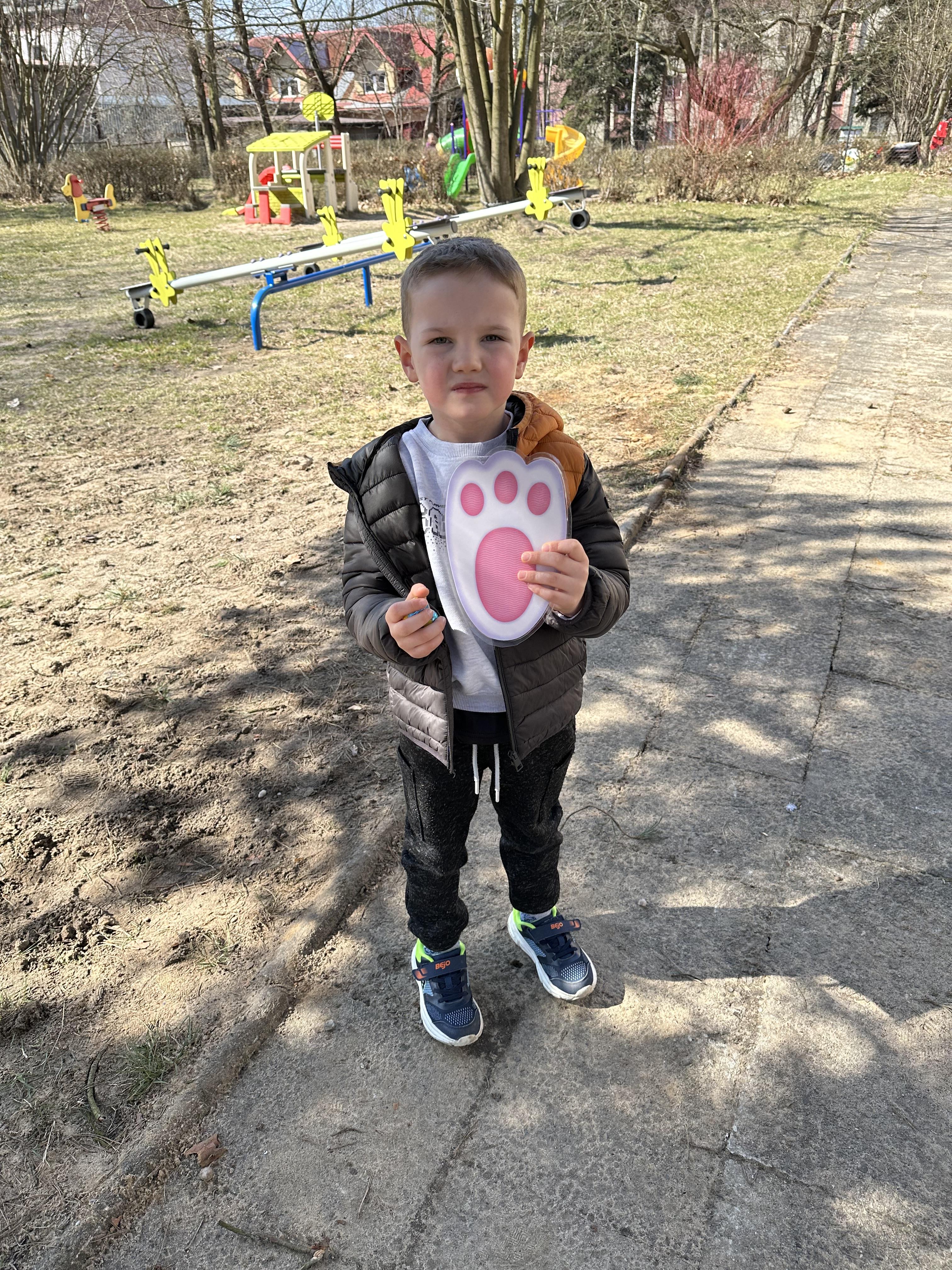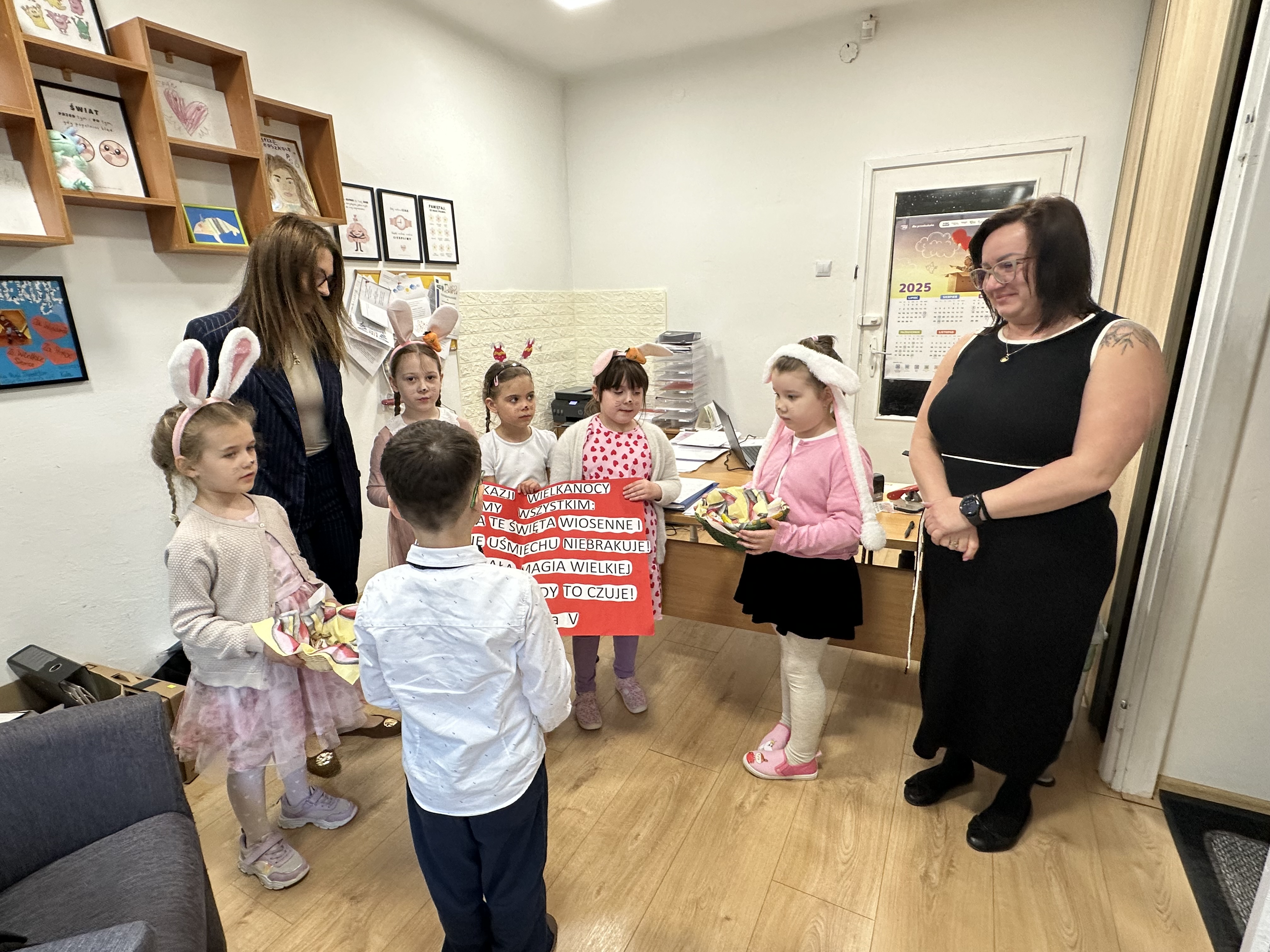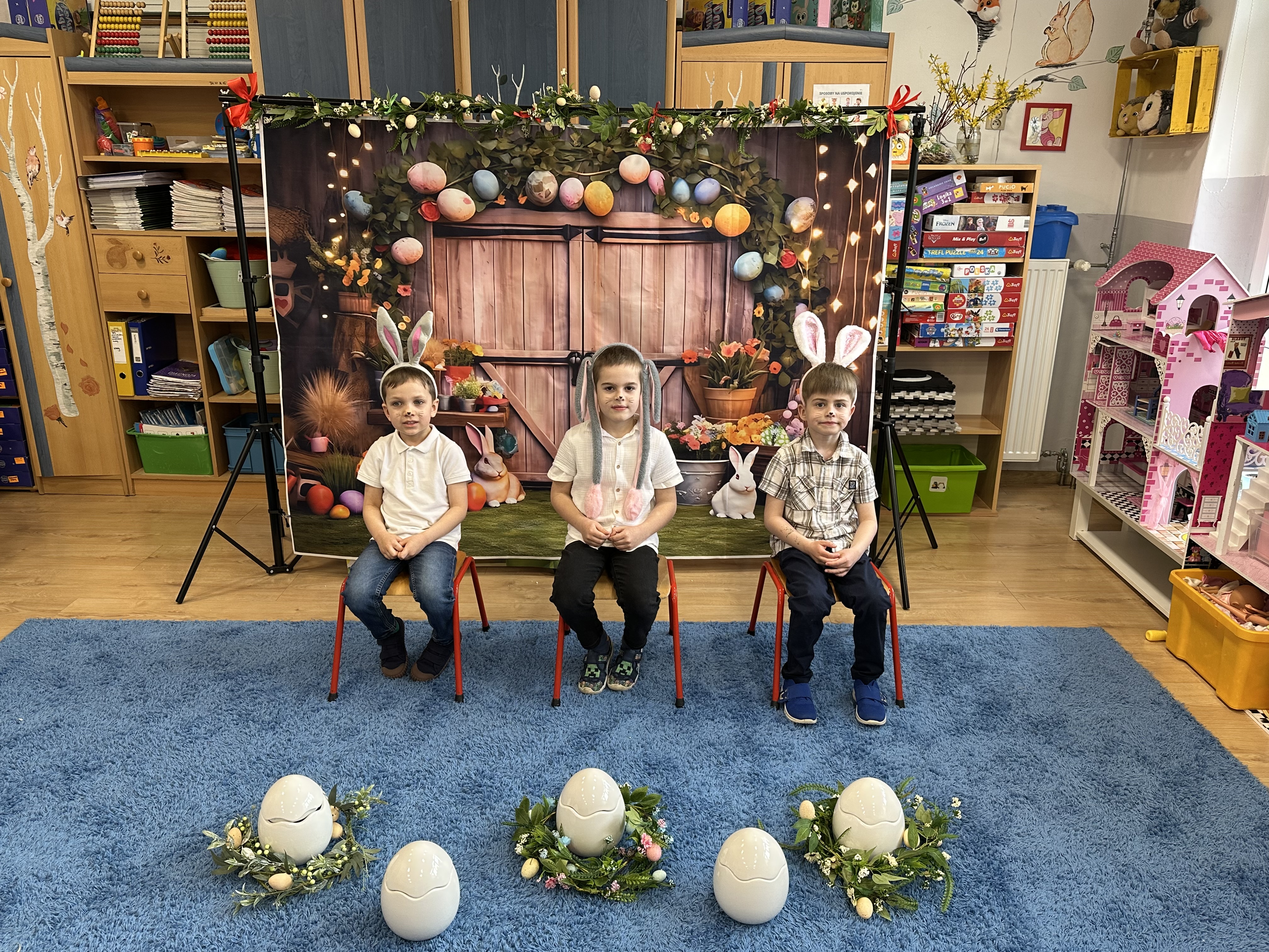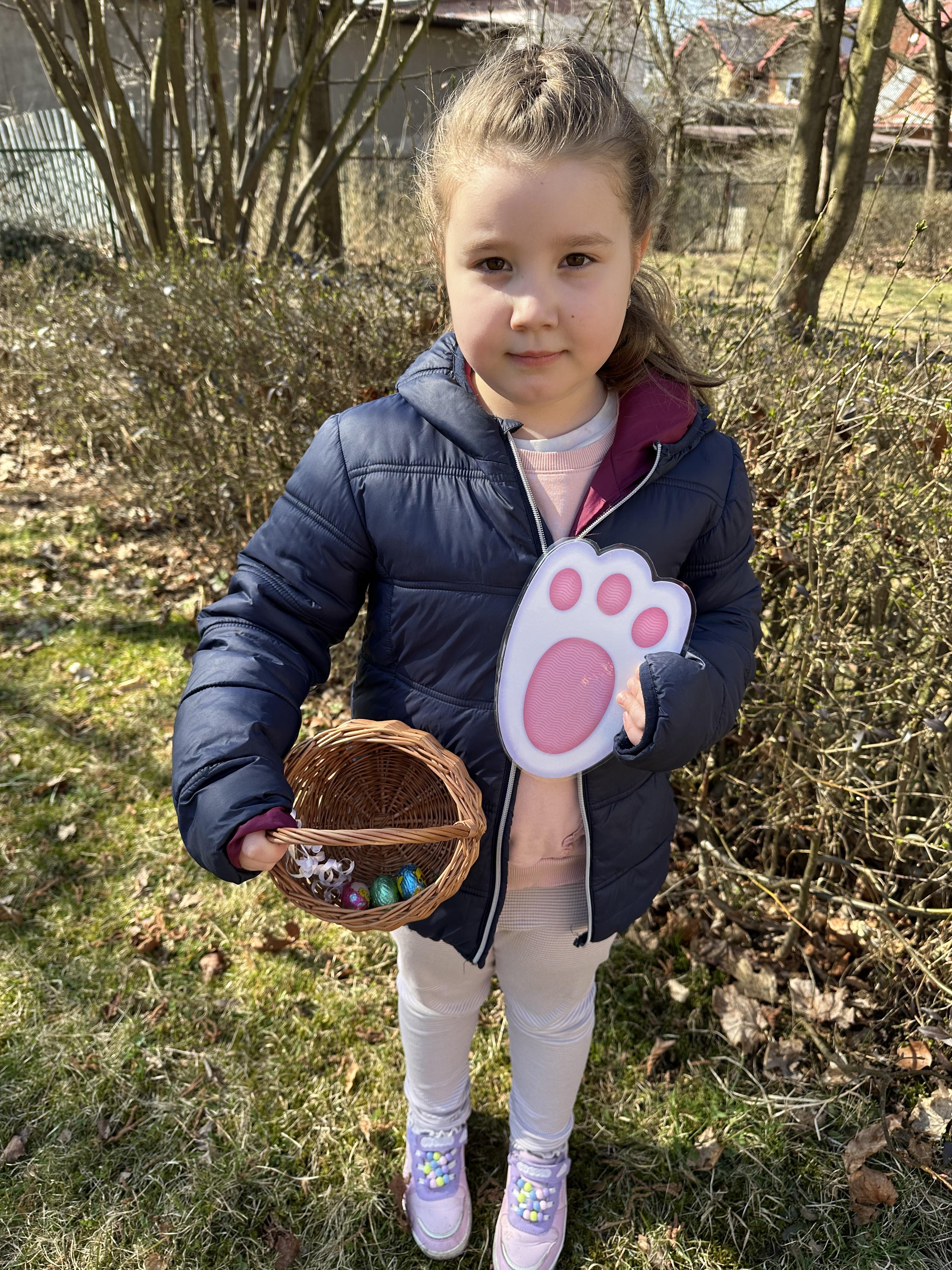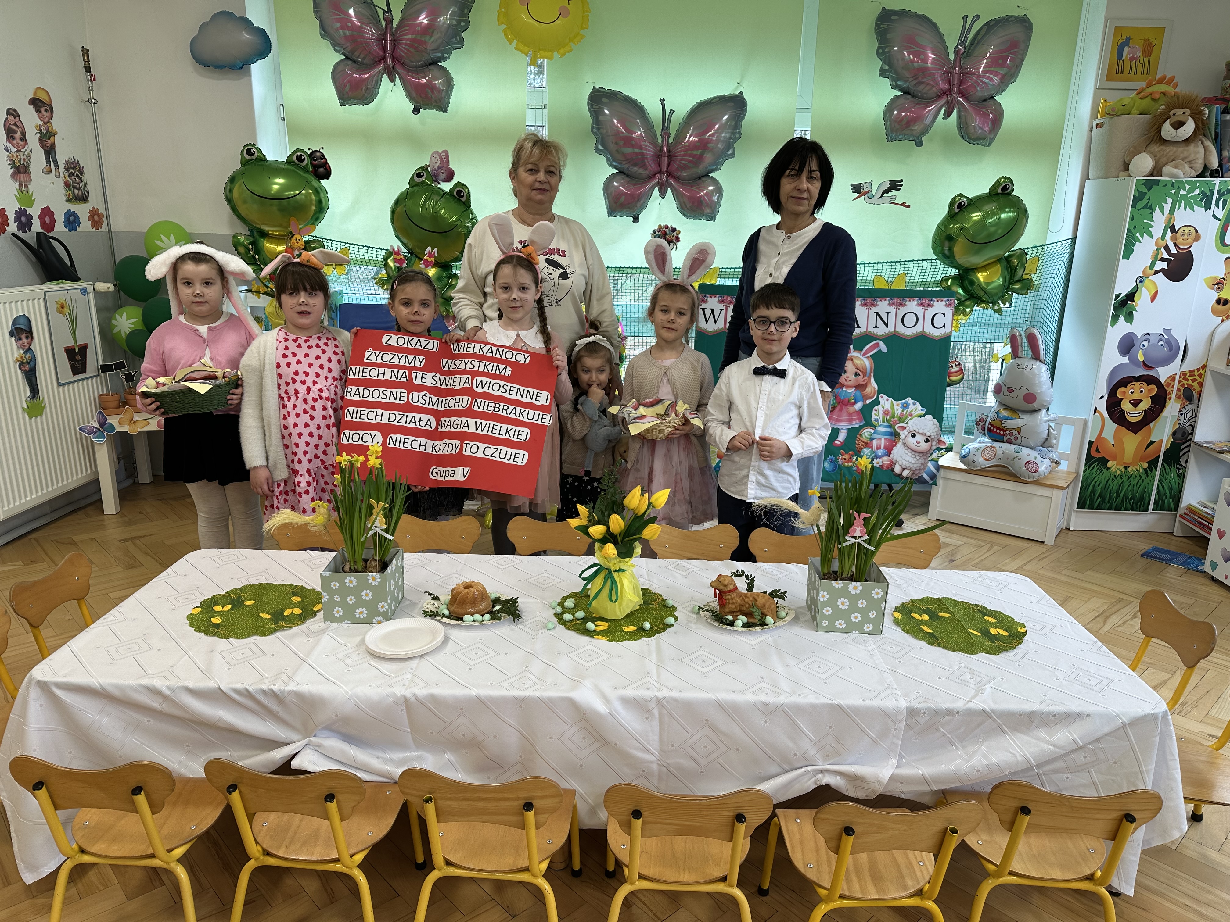 Drugiego kwietnia starszaki oraz pozostałe grupy w naszym przedszkolu rozpoczęły dzień od uroczystego Śniadania Wielkanocnego. Był to wyjątkowy czas pełen radości oraz wspólnego świętowania. Następnie ,,Pszczółki” udały się do ogrodu przedszkolnego, gdzie – zgodnie z tradycją – zajączek ukrył dla nich niespodzianki w postaci czekoladowych jajeczek. Dzieci z ogromnym zaangażowaniem i entuzjazmem poszukiwały upominków, a zabawie towarzyszyło wiele uśmiechu i radosnych emocji. Po powrocie do przedszkola „Pszczółki” wraz z wychowawcą złożyły świąteczne życzenia Pani Dyrektor oraz wszystkim pracownikom placówki, wręczając przy tym drobne wielkanocne upominki. Nie zabrakło również pamiątkowych fotografii, które będą pięknym wspomnieniem tego wyjątkowego dnia. Dzieci złożyły także świąteczne życzenia rodzicom oraz całej społeczności przedszkolnej. Życzenia te zostały uwiecznione na specjalnie przygotowanym filmiku.