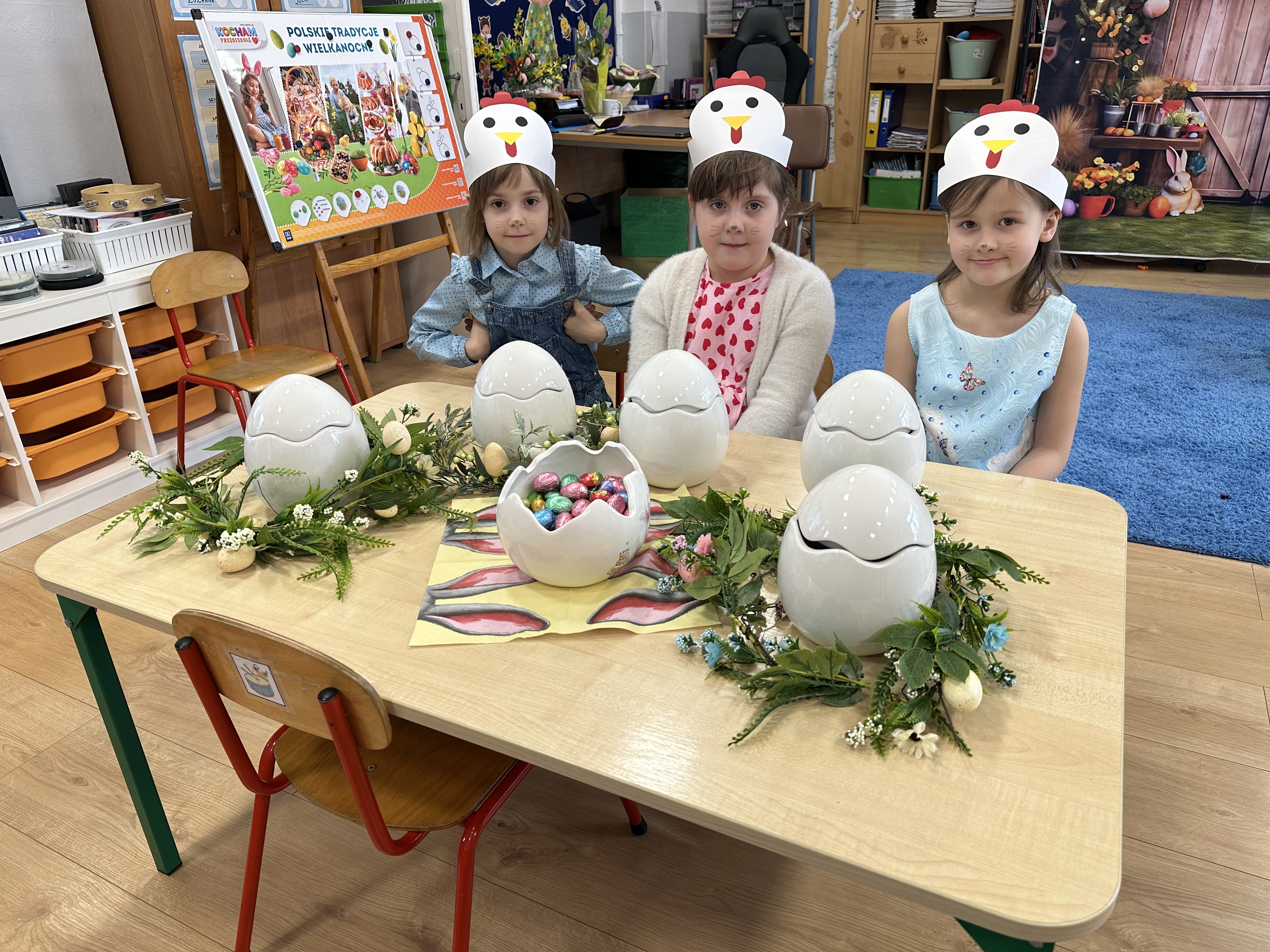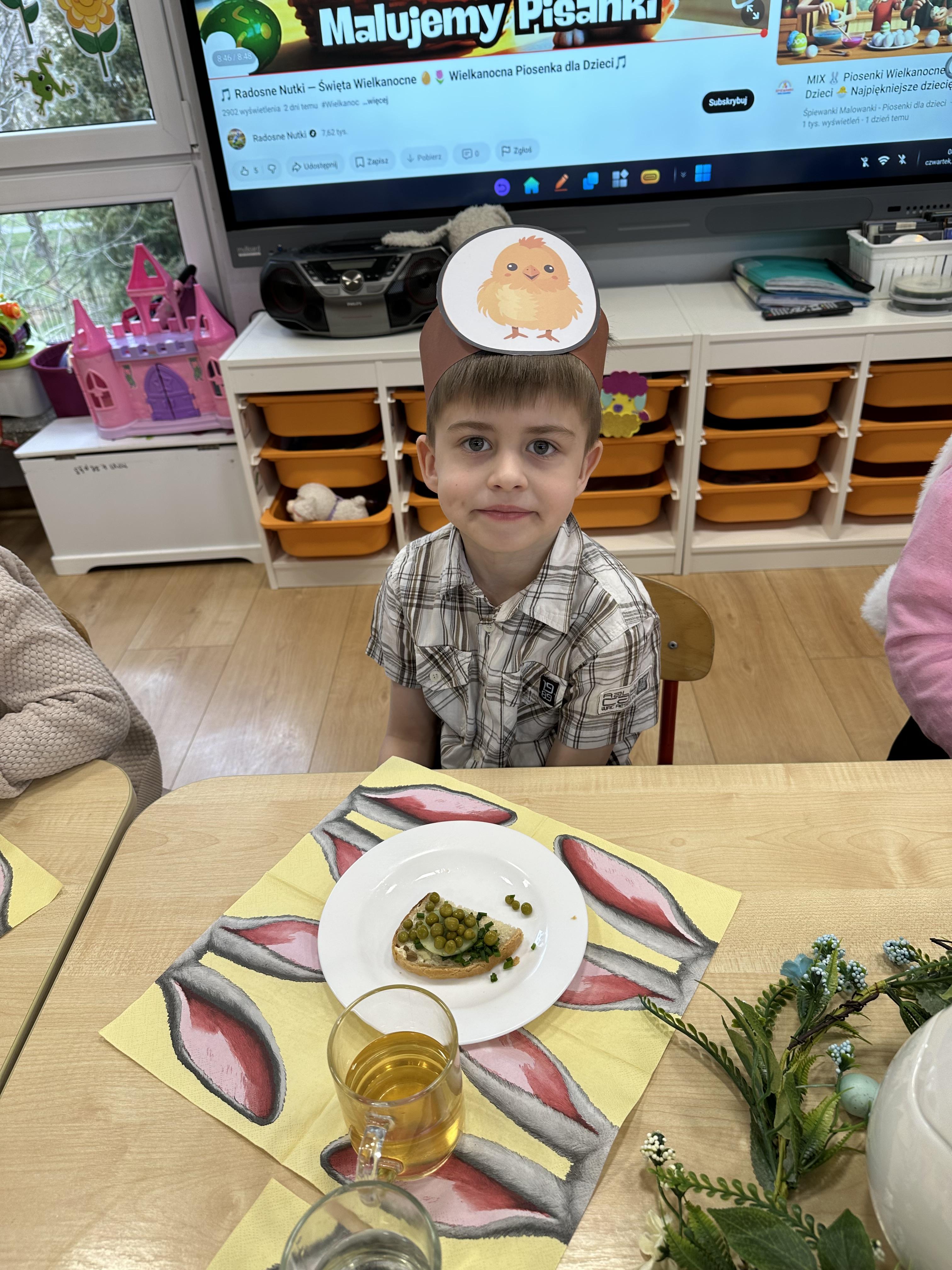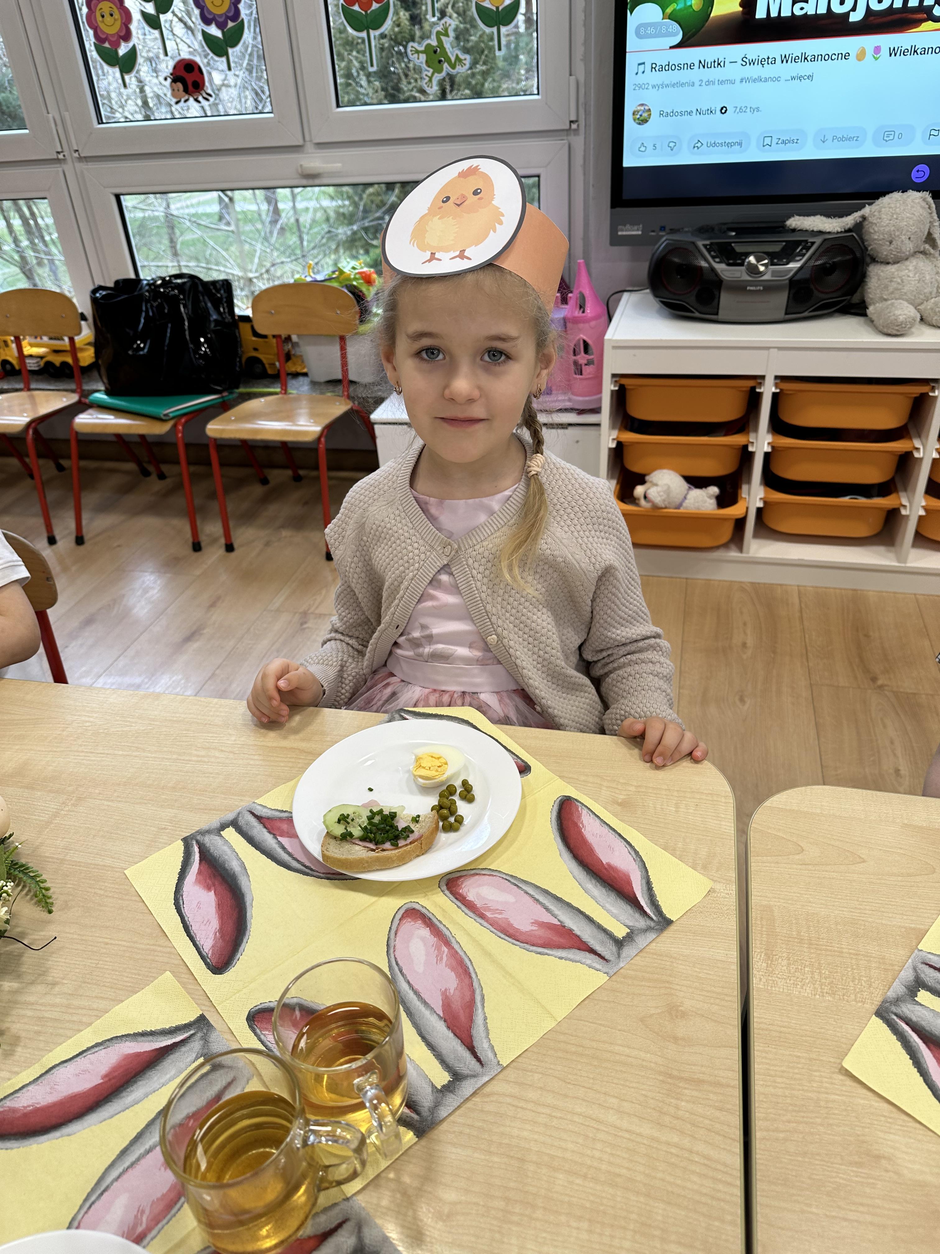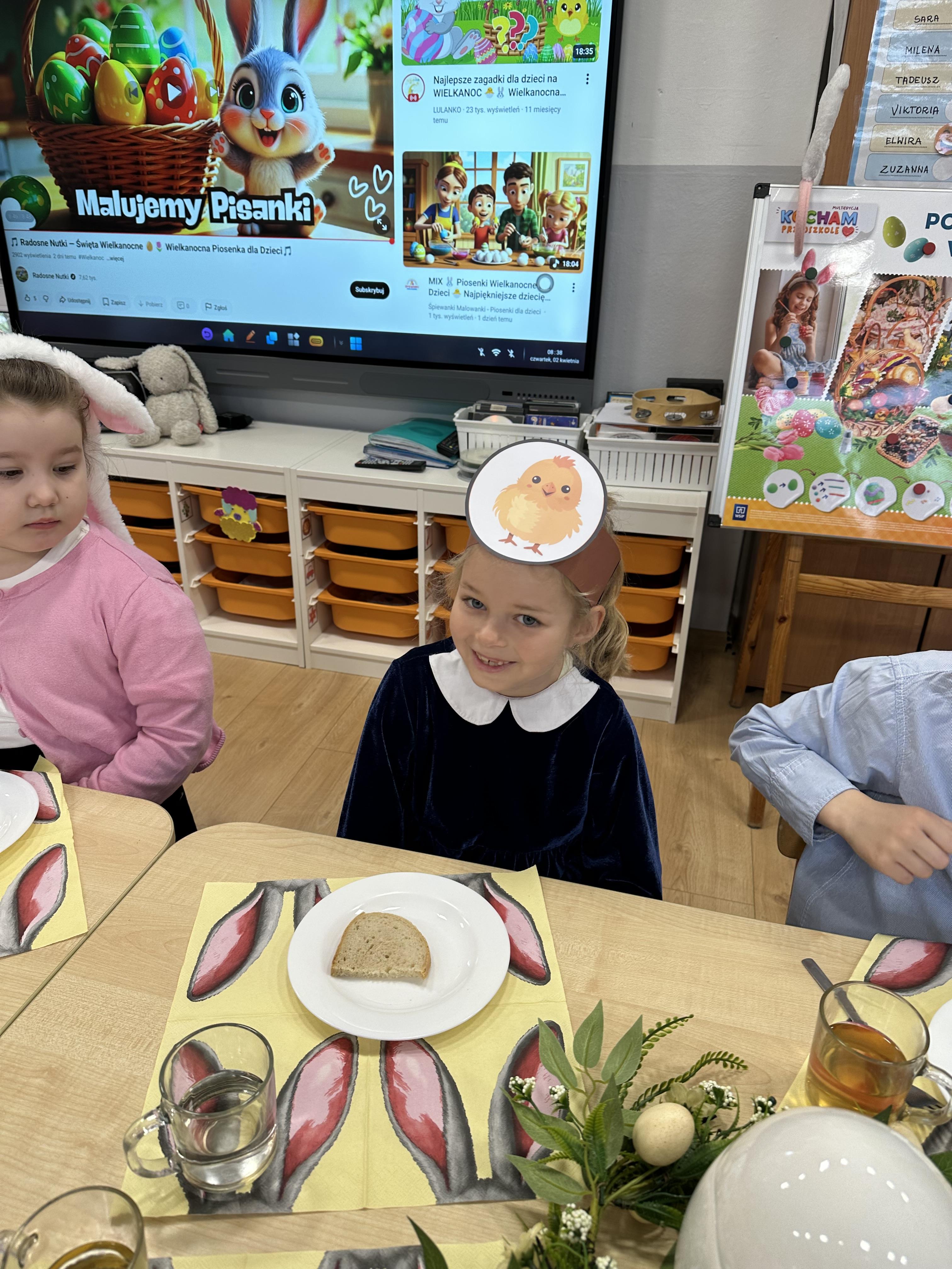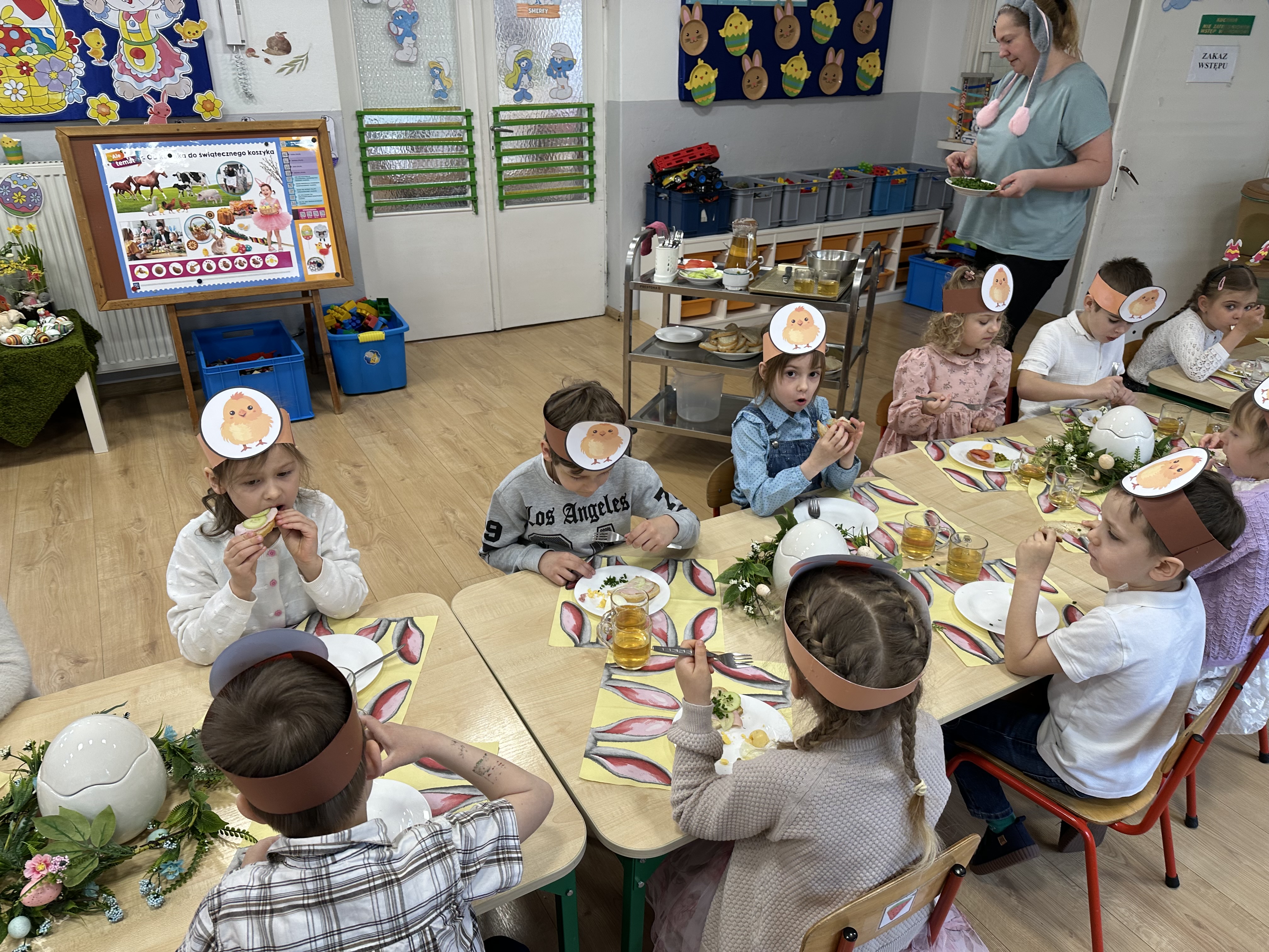 Drugiego kwietnia starszaki oraz pozostałe grupy w naszym przedszkolu rozpoczęły dzień od uroczystego Śniadania Wielkanocnego. Był to wyjątkowy czas pełen radości oraz wspólnego świętowania. Następnie ,,Pszczółki” udały się do ogrodu przedszkolnego, gdzie – zgodnie z tradycją – zajączek ukrył dla nich niespodzianki w postaci czekoladowych jajeczek. Dzieci z ogromnym zaangażowaniem i entuzjazmem poszukiwały upominków, a zabawie towarzyszyło wiele uśmiechu i radosnych emocji. Po powrocie do przedszkola „Pszczółki” wraz z wychowawcą złożyły świąteczne życzenia Pani Dyrektor oraz wszystkim pracownikom placówki, wręczając przy tym drobne wielkanocne upominki. Nie zabrakło również pamiątkowych fotografii, które będą pięknym wspomnieniem tego wyjątkowego dnia. Dzieci złożyły także świąteczne życzenia rodzicom oraz całej społeczności przedszkolnej. Życzenia te zostały uwiecznione na specjalnie przygotowanym filmiku.