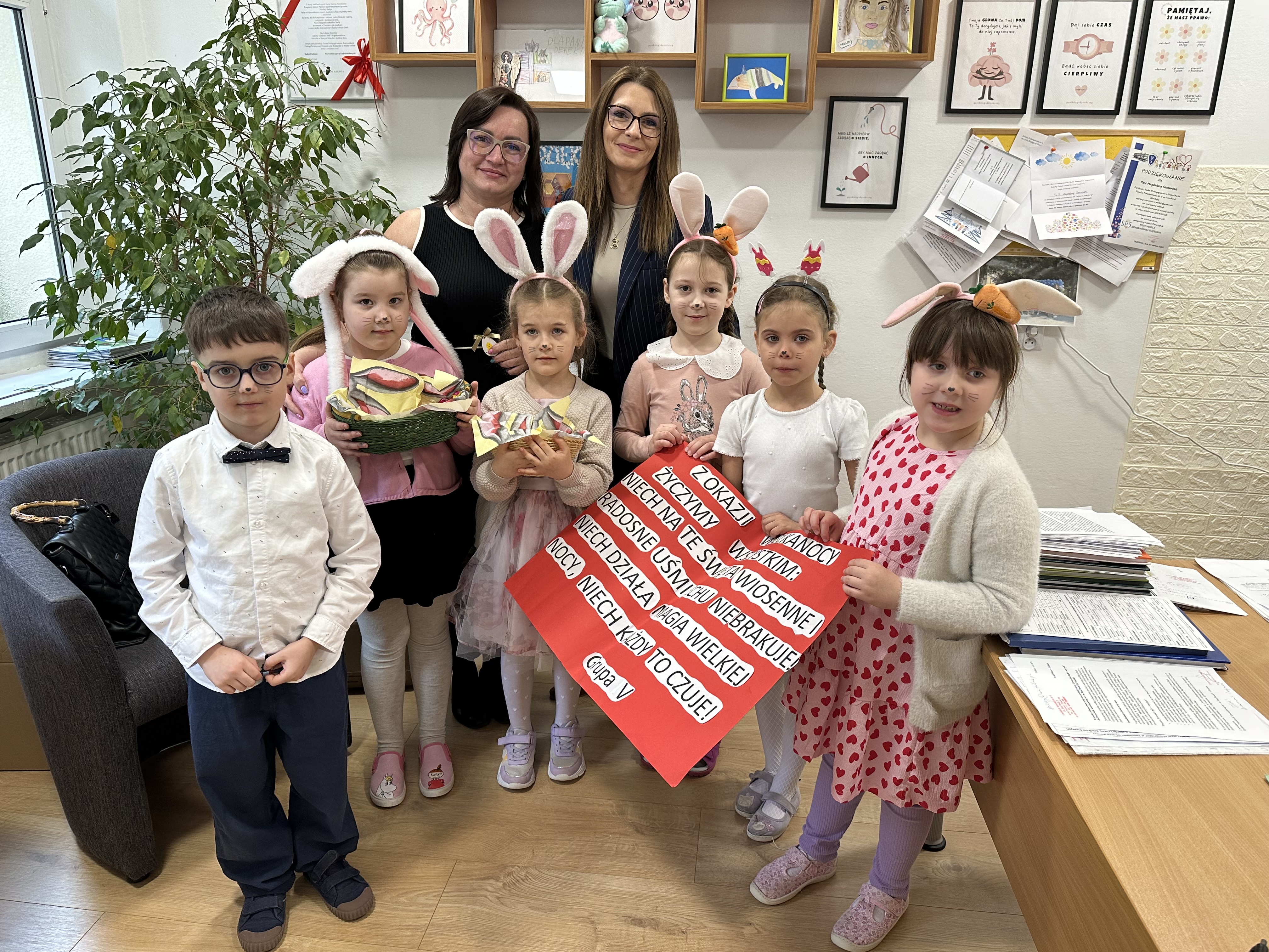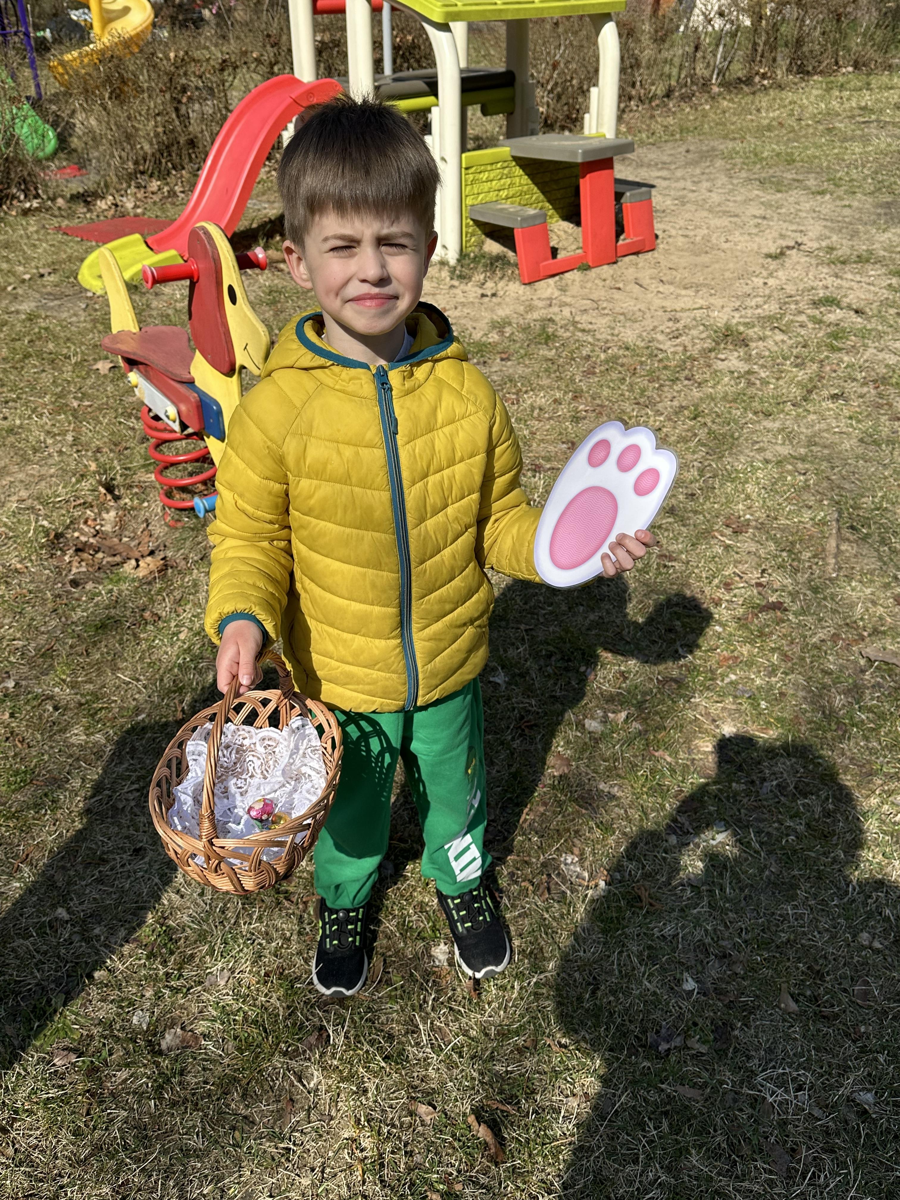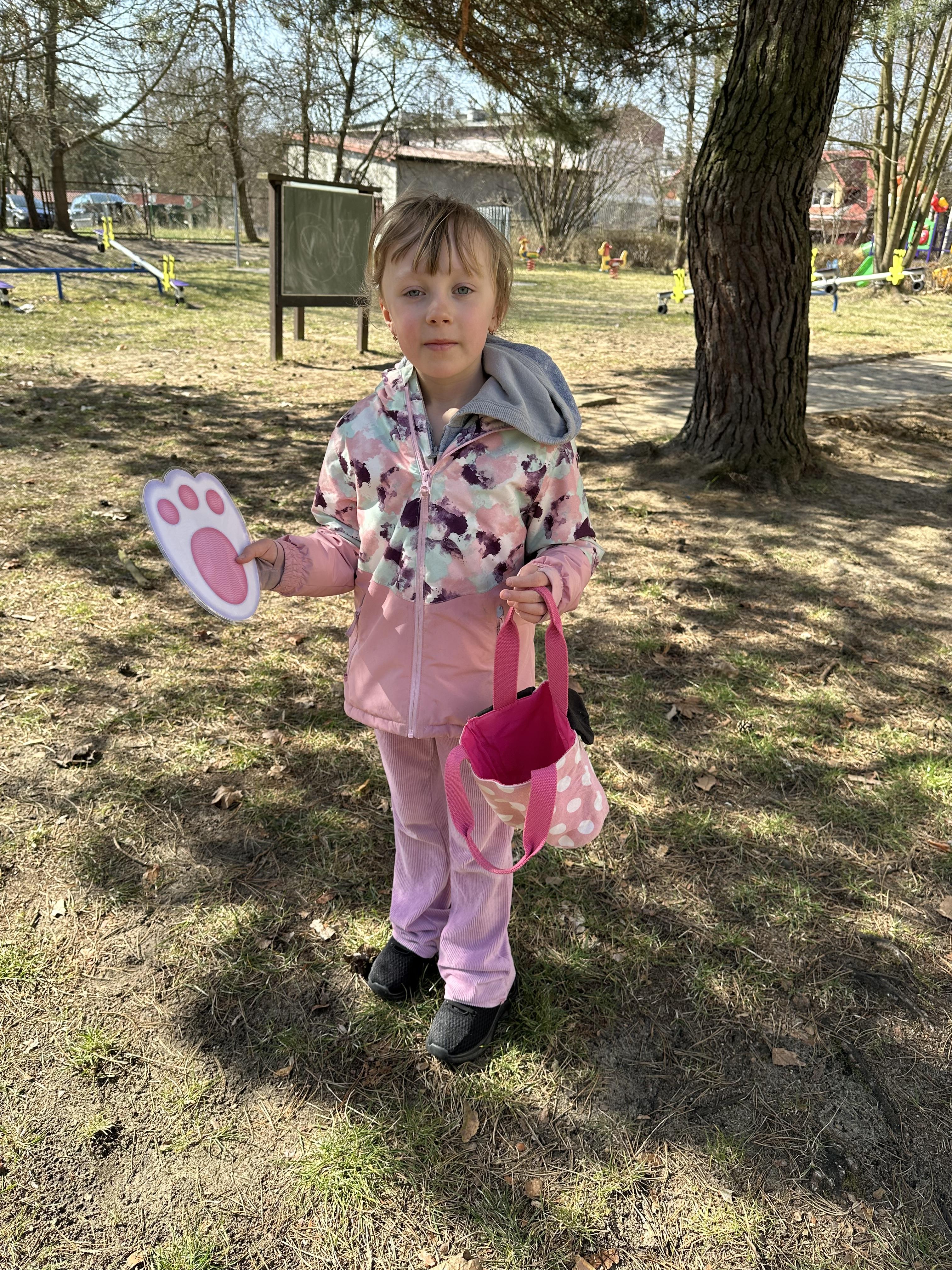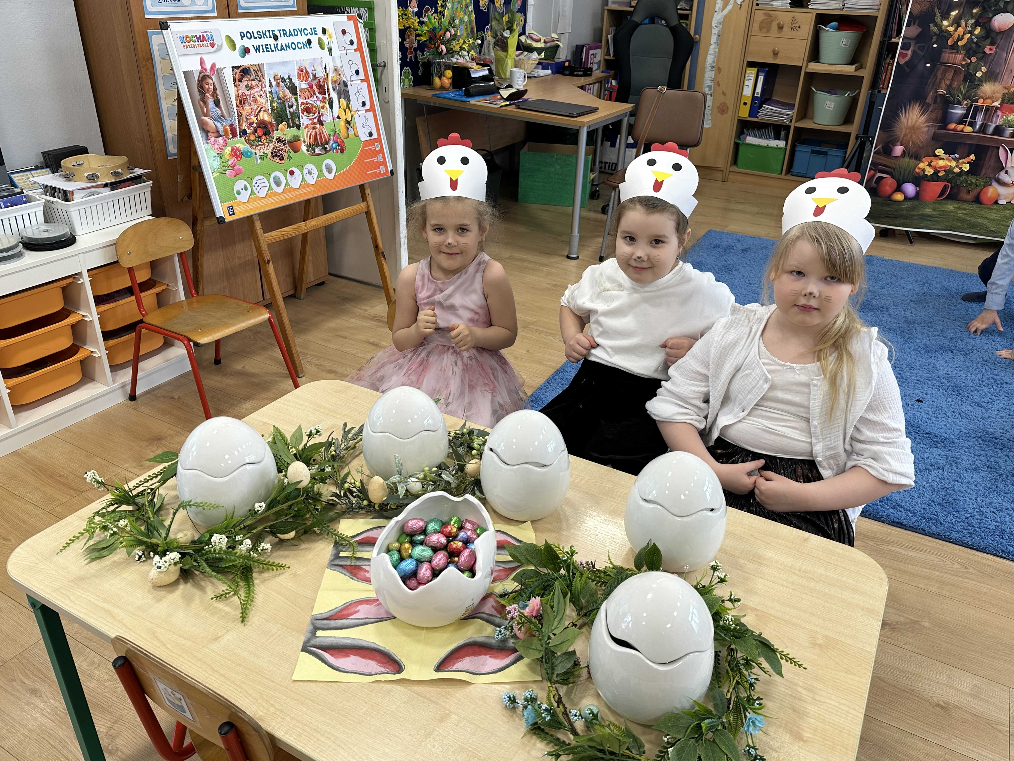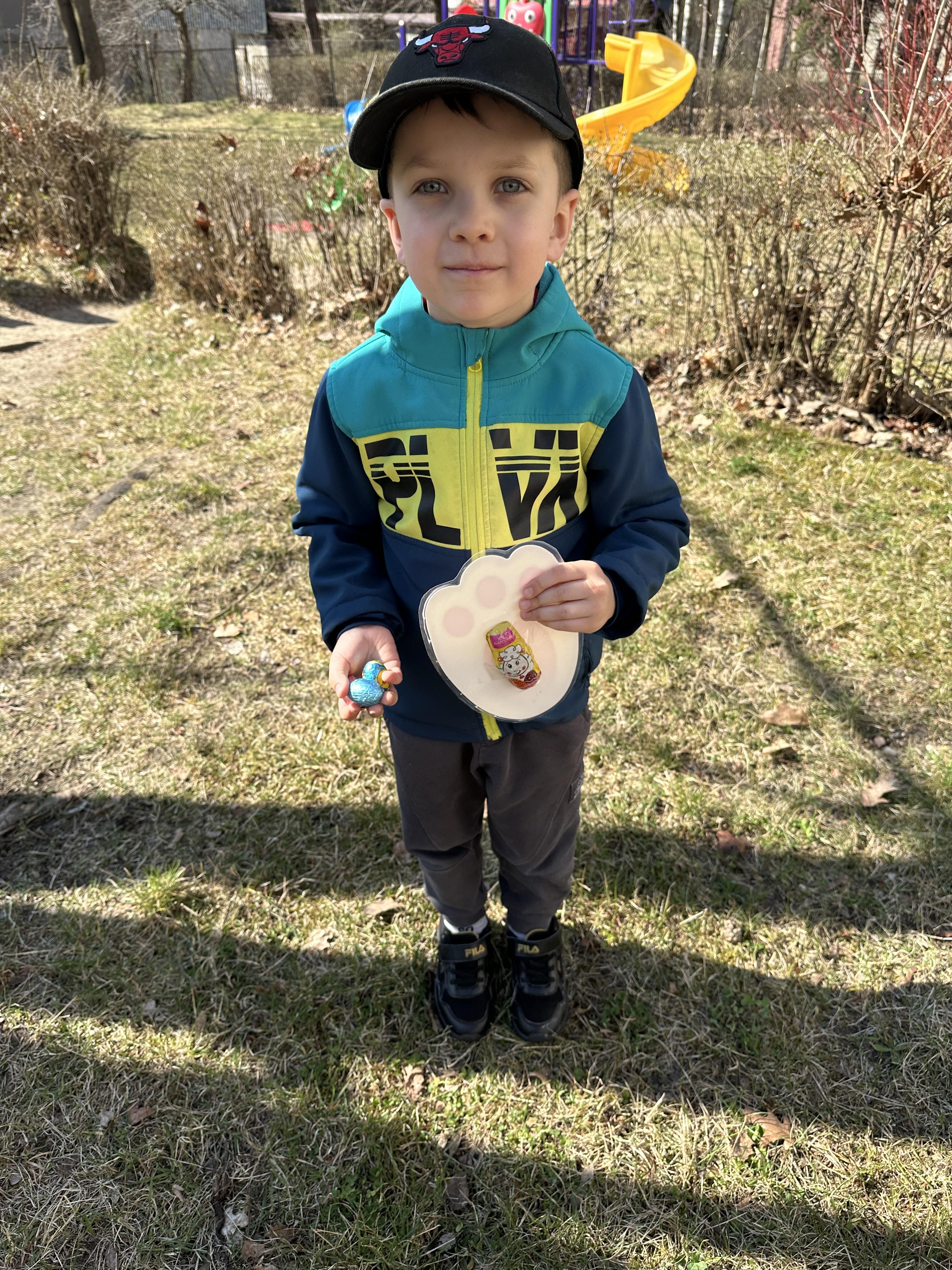 Drugiego kwietnia starszaki oraz pozostałe grupy w naszym przedszkolu rozpoczęły dzień od uroczystego Śniadania Wielkanocnego. Był to wyjątkowy czas pełen radości oraz wspólnego świętowania. Następnie ,,Pszczółki” udały się do ogrodu przedszkolnego, gdzie – zgodnie z tradycją – zajączek ukrył dla nich niespodzianki w postaci czekoladowych jajeczek. Dzieci z ogromnym zaangażowaniem i entuzjazmem poszukiwały upominków, a zabawie towarzyszyło wiele uśmiechu i radosnych emocji. Po powrocie do przedszkola „Pszczółki” wraz z wychowawcą złożyły świąteczne życzenia Pani Dyrektor oraz wszystkim pracownikom placówki, wręczając przy tym drobne wielkanocne upominki. Nie zabrakło również pamiątkowych fotografii, które będą pięknym wspomnieniem tego wyjątkowego dnia. Dzieci złożyły także świąteczne życzenia rodzicom oraz całej społeczności przedszkolnej. Życzenia te zostały uwiecznione na specjalnie przygotowanym filmiku.