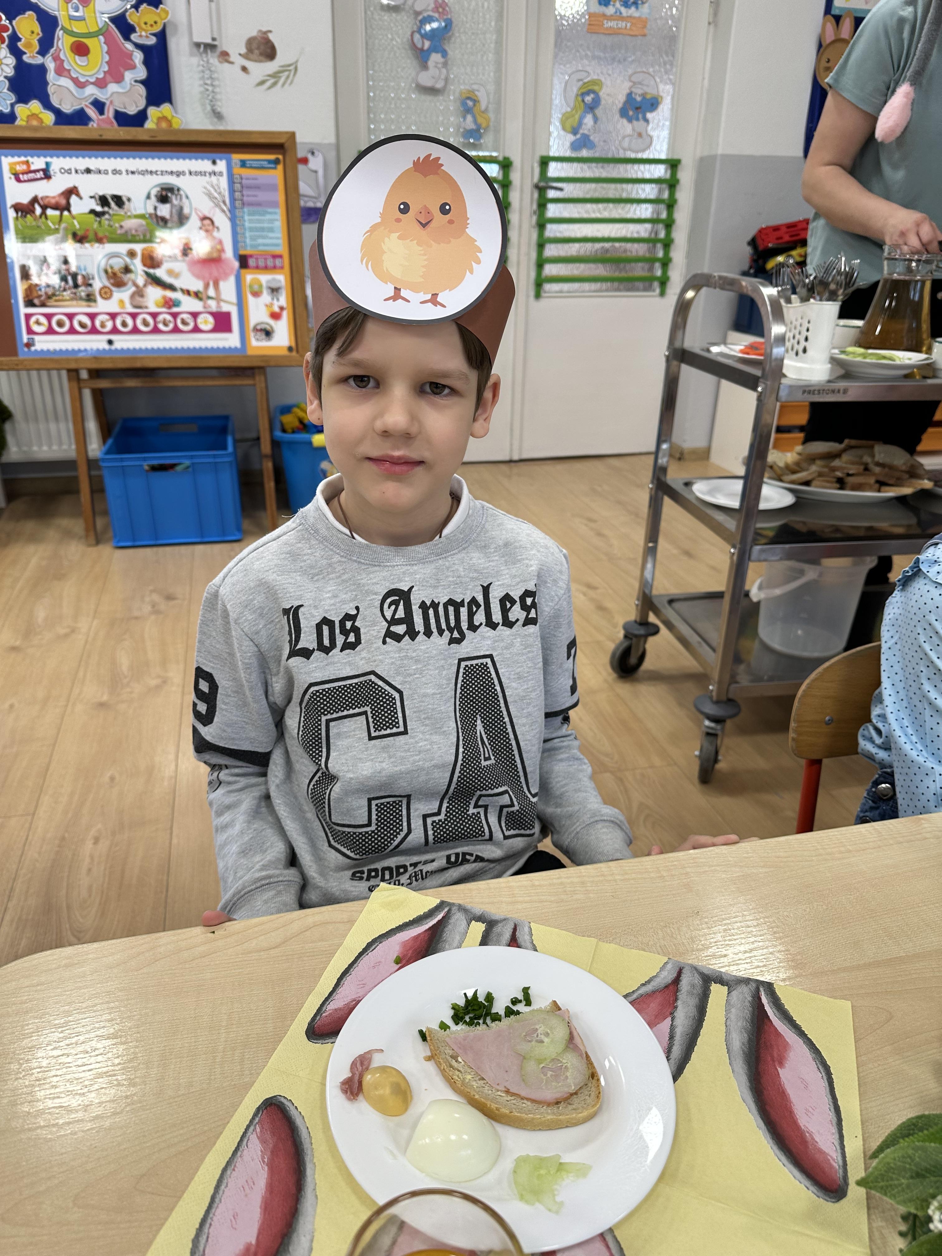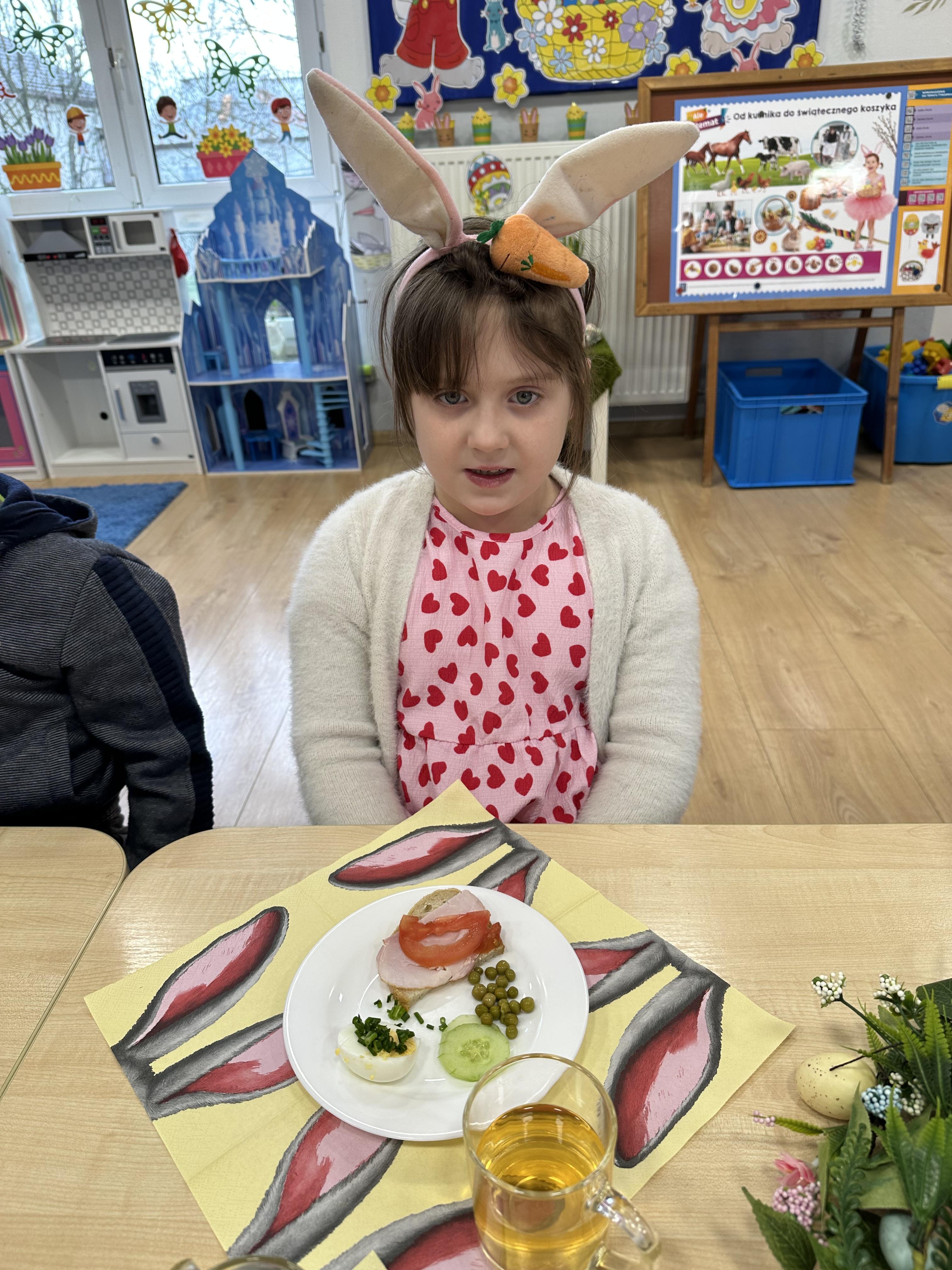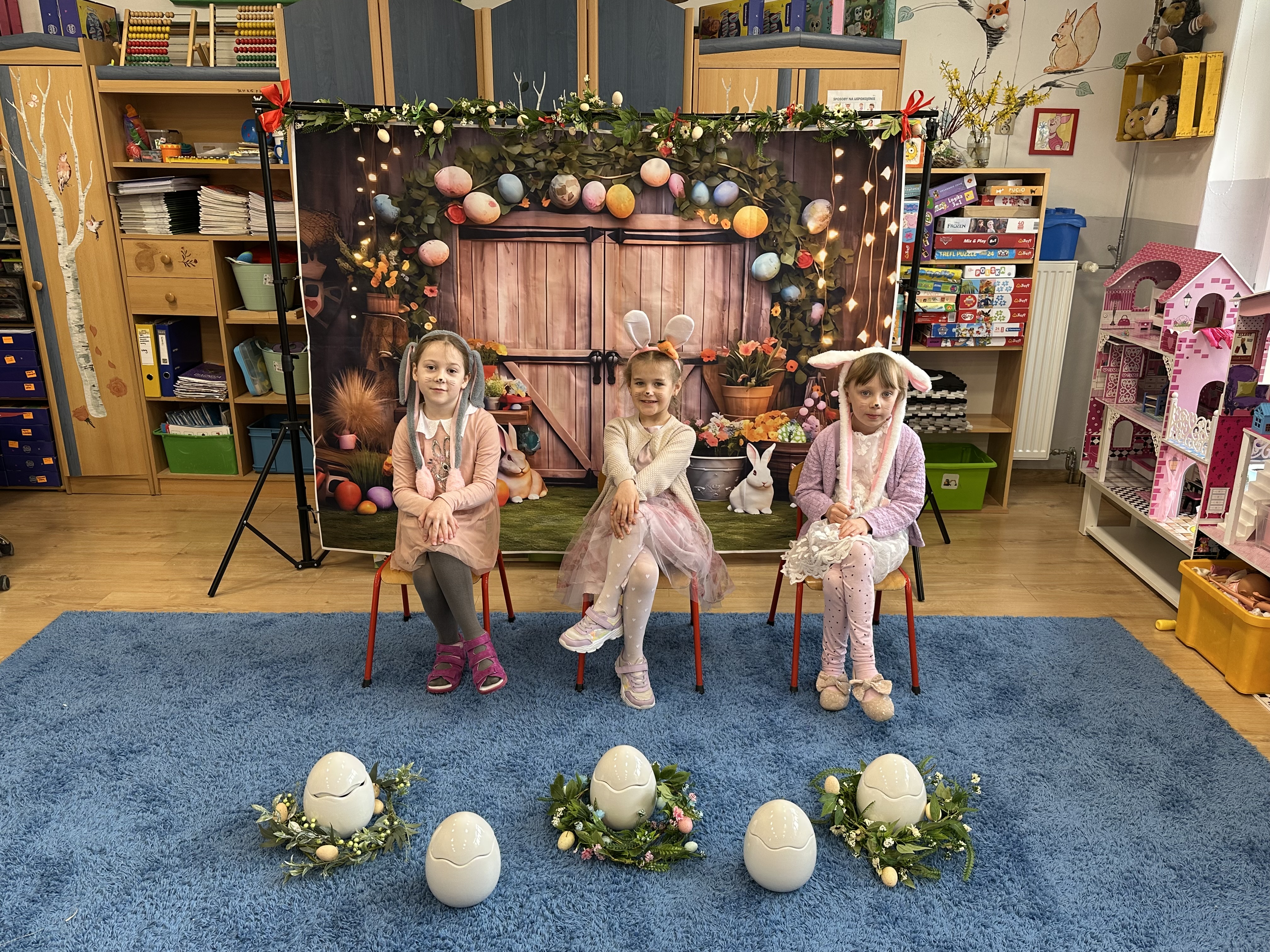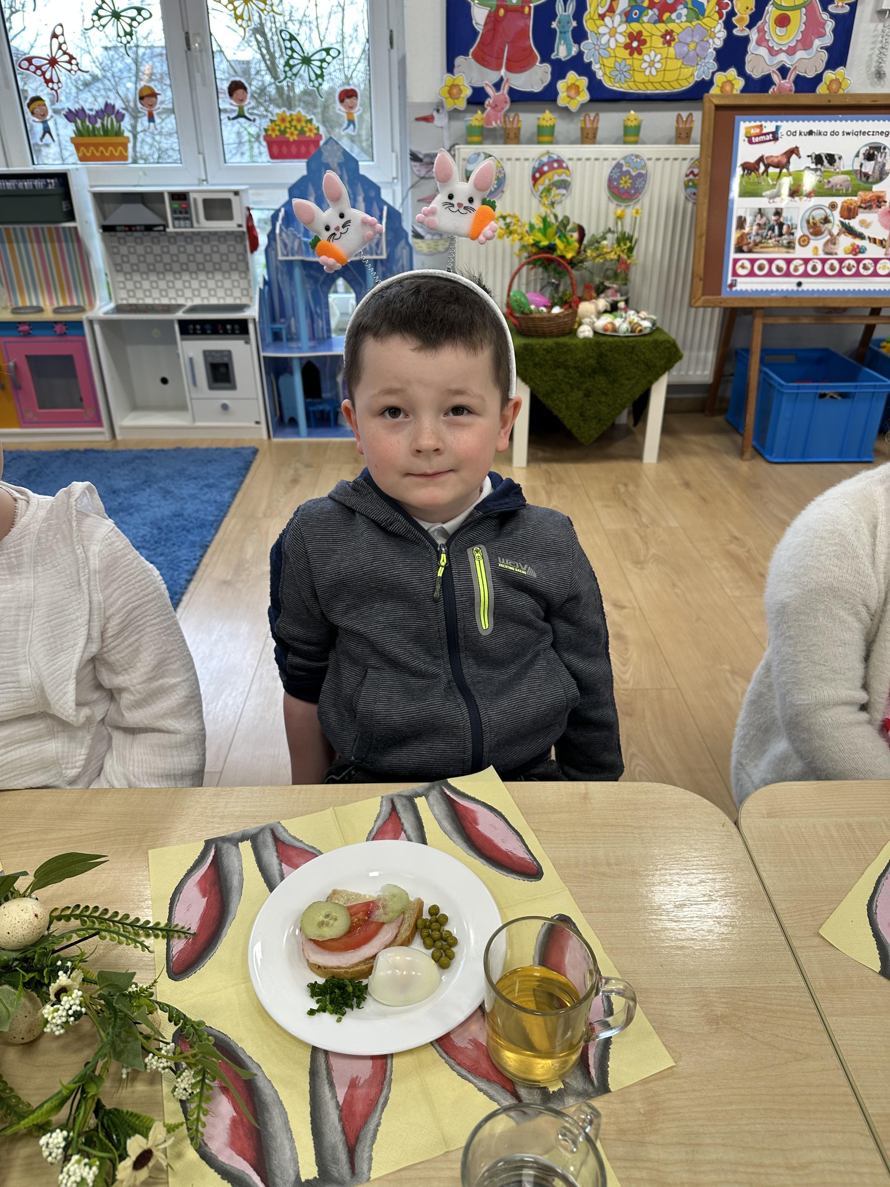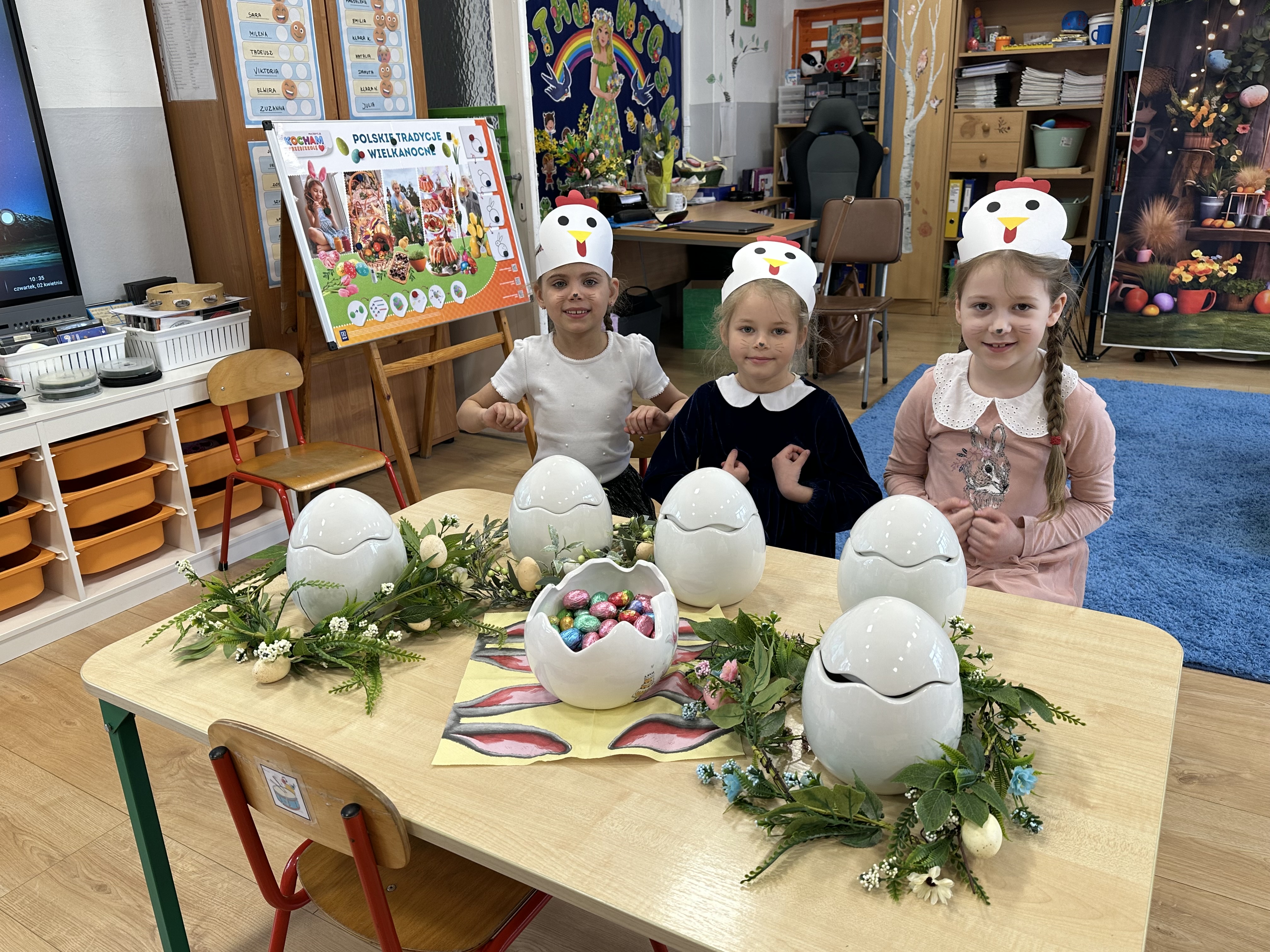 Drugiego kwietnia starszaki oraz pozostałe grupy w naszym przedszkolu rozpoczęły dzień od uroczystego Śniadania Wielkanocnego. Był to wyjątkowy czas pełen radości oraz wspólnego świętowania. Następnie ,,Pszczółki” udały się do ogrodu przedszkolnego, gdzie – zgodnie z tradycją – zajączek ukrył dla nich niespodzianki w postaci czekoladowych jajeczek. Dzieci z ogromnym zaangażowaniem i entuzjazmem poszukiwały upominków, a zabawie towarzyszyło wiele uśmiechu i radosnych emocji. Po powrocie do przedszkola „Pszczółki” wraz z wychowawcą złożyły świąteczne życzenia Pani Dyrektor oraz wszystkim pracownikom placówki, wręczając przy tym drobne wielkanocne upominki. Nie zabrakło również pamiątkowych fotografii, które będą pięknym wspomnieniem tego wyjątkowego dnia. Dzieci złożyły także świąteczne życzenia rodzicom oraz całej społeczności przedszkolnej. Życzenia te zostały uwiecznione na specjalnie przygotowanym filmiku.
