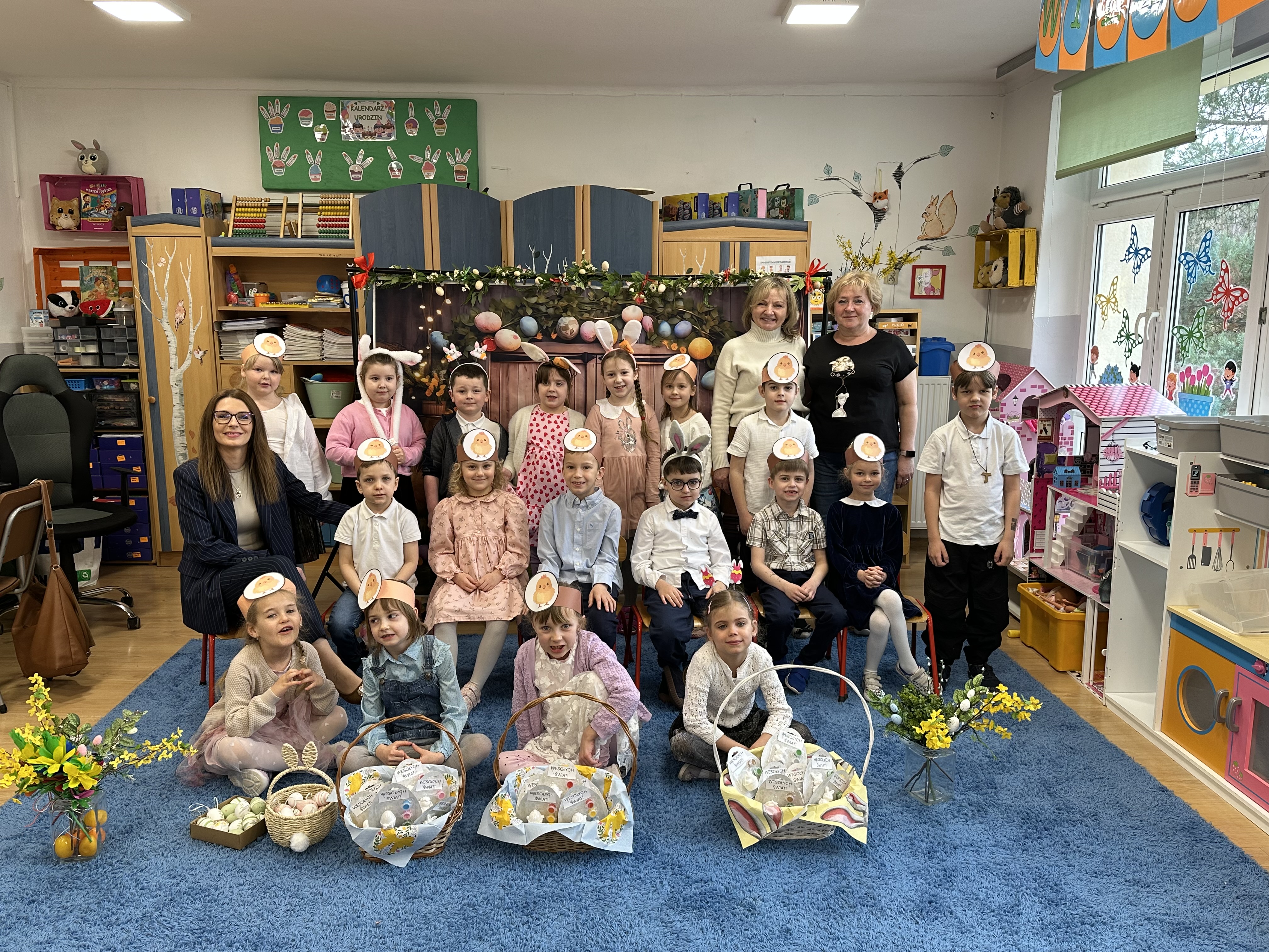 Drugiego kwietnia starszaki w naszym przedszkolu rozpoczęły dzień od uroczystego Śniadania Wielkanocnego. Był to wyjątkowy czas pełen radości oraz wspólnego świętowania. Następnie ,,Pszczółki” udały się do ogrodu przedszkolnego, gdzie – zgodnie z tradycją – zajączek ukrył dla nich niespodzianki w postaci czekoladowych jajeczek. Dzieci z ogromnym zaangażowaniem i entuzjazmem poszukiwały upominków, a zabawie towarzyszyło wiele uśmiechu i radosnych emocji. Po powrocie do przedszkola „Pszczółki” wraz z wychowawcą złożyły świąteczneżyczeniaPani Dyrektor oraz wszystkim pracownikom placówki, wręczając przy tym drobne wielkanocne upominki. Nie zabrakło również pamiątkowych fotografii, które będą pięknym wspomnieniem tego wyjątkowego dnia. Dzieci złożyły także świąteczne życzenia rodzicom oraz całej społeczności przedszkolnej. Życzenia te zostały uwiecznione na specjalnie przygotowanym filmiku.
