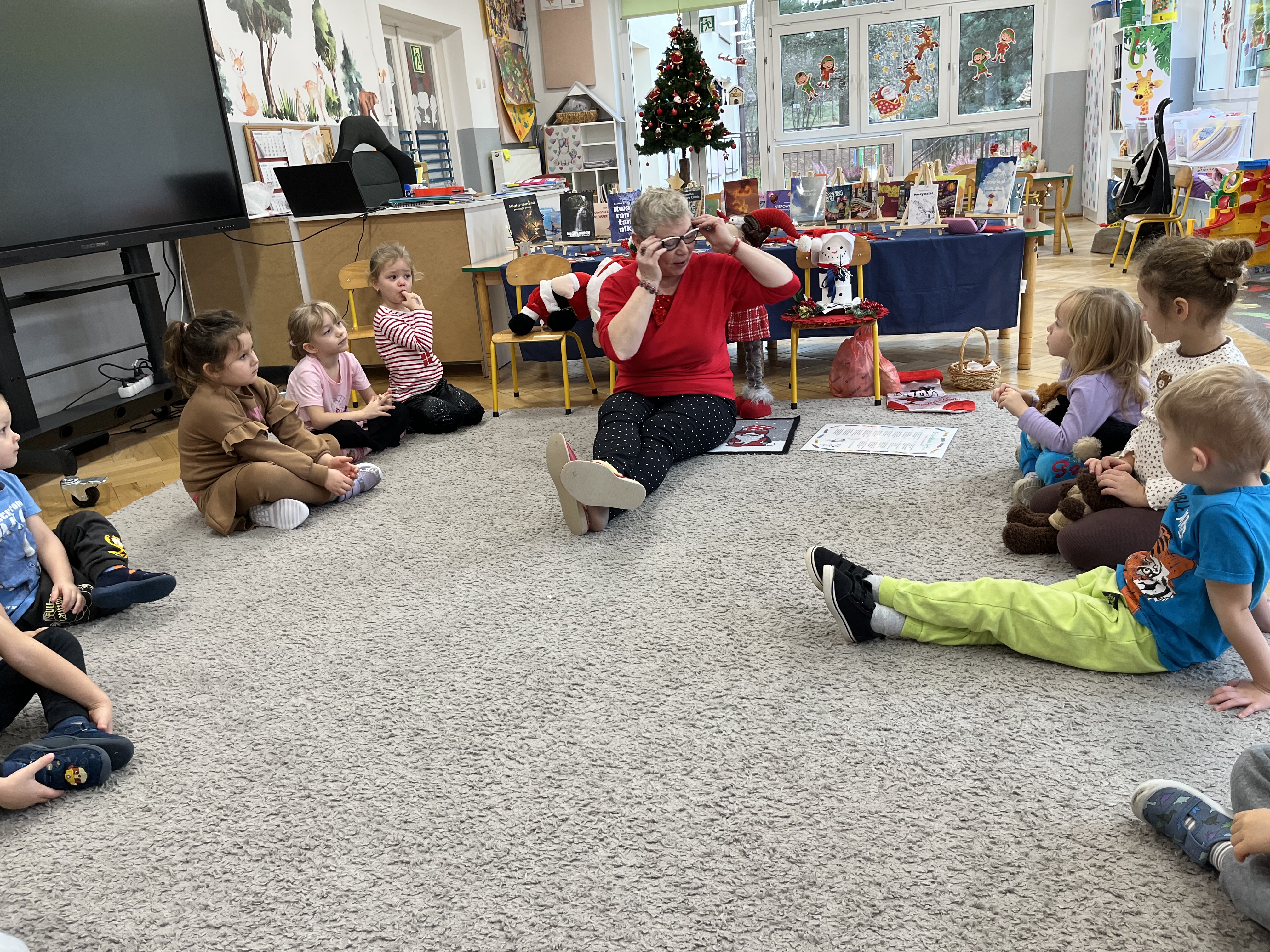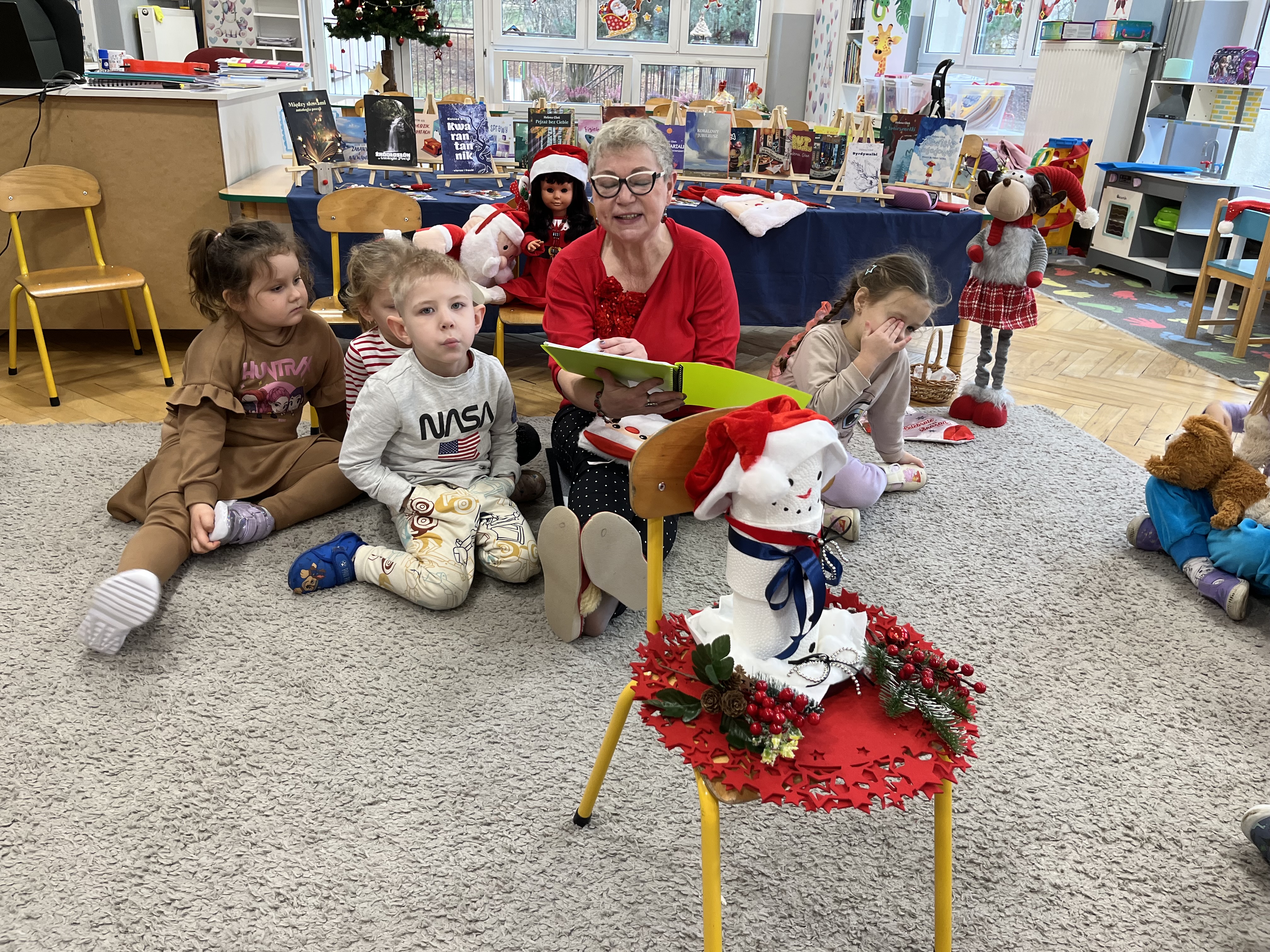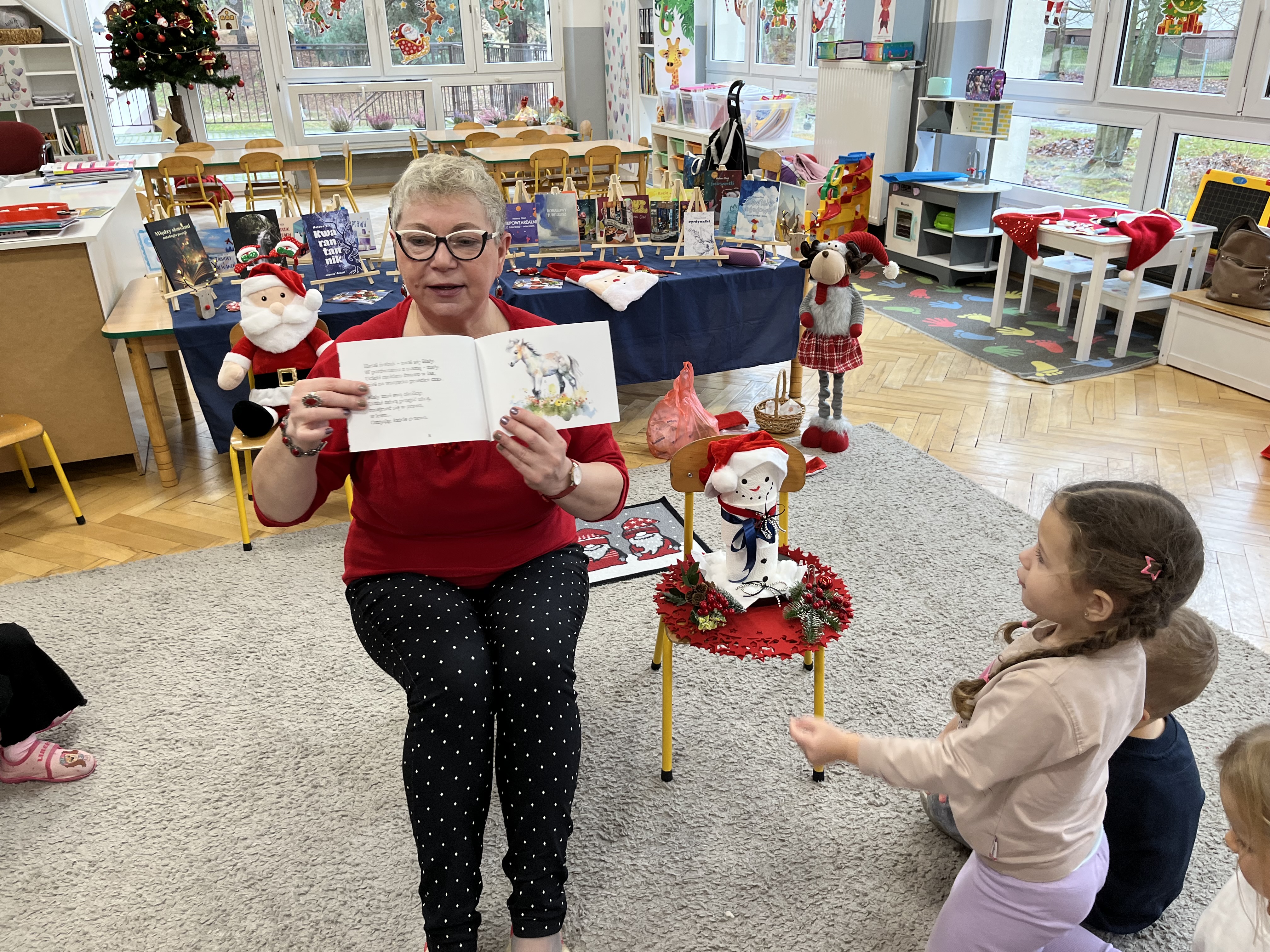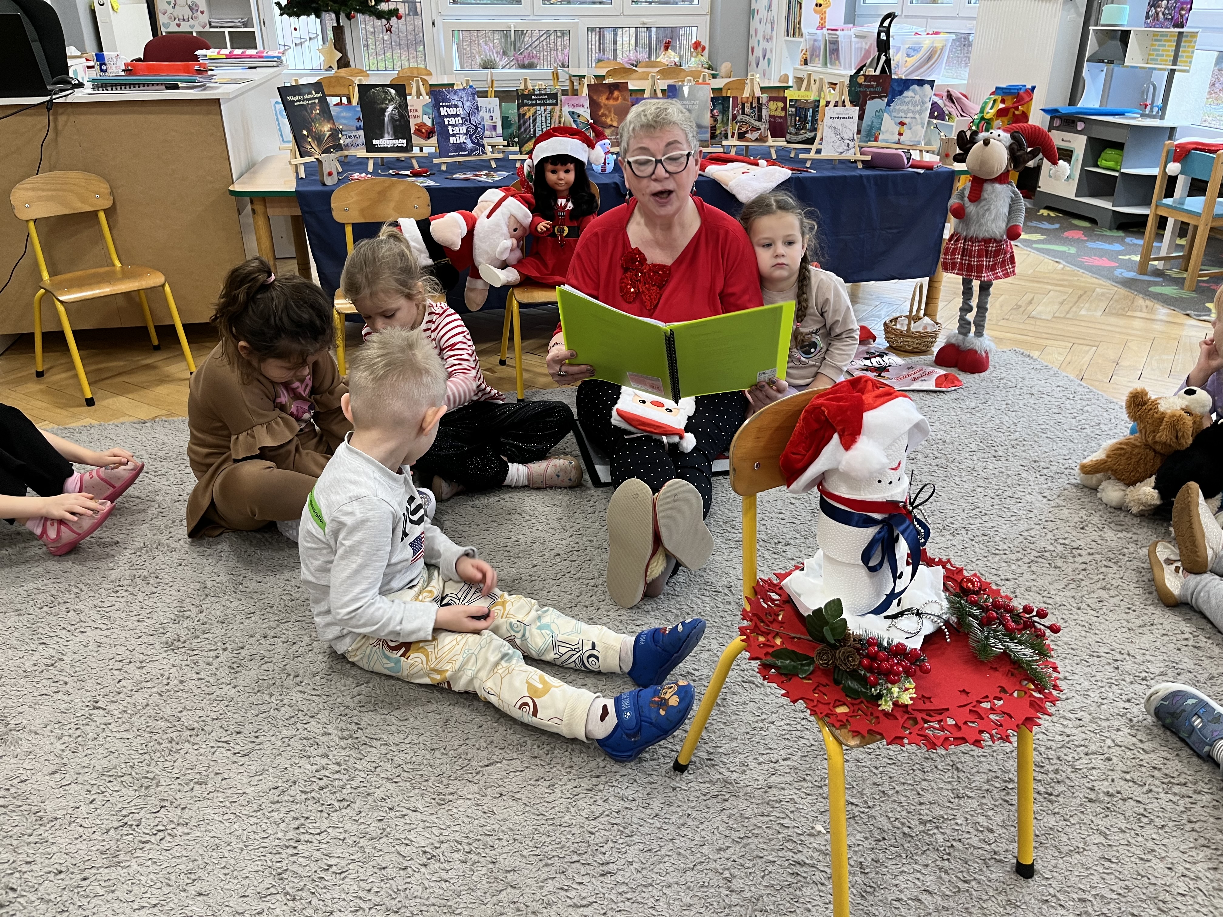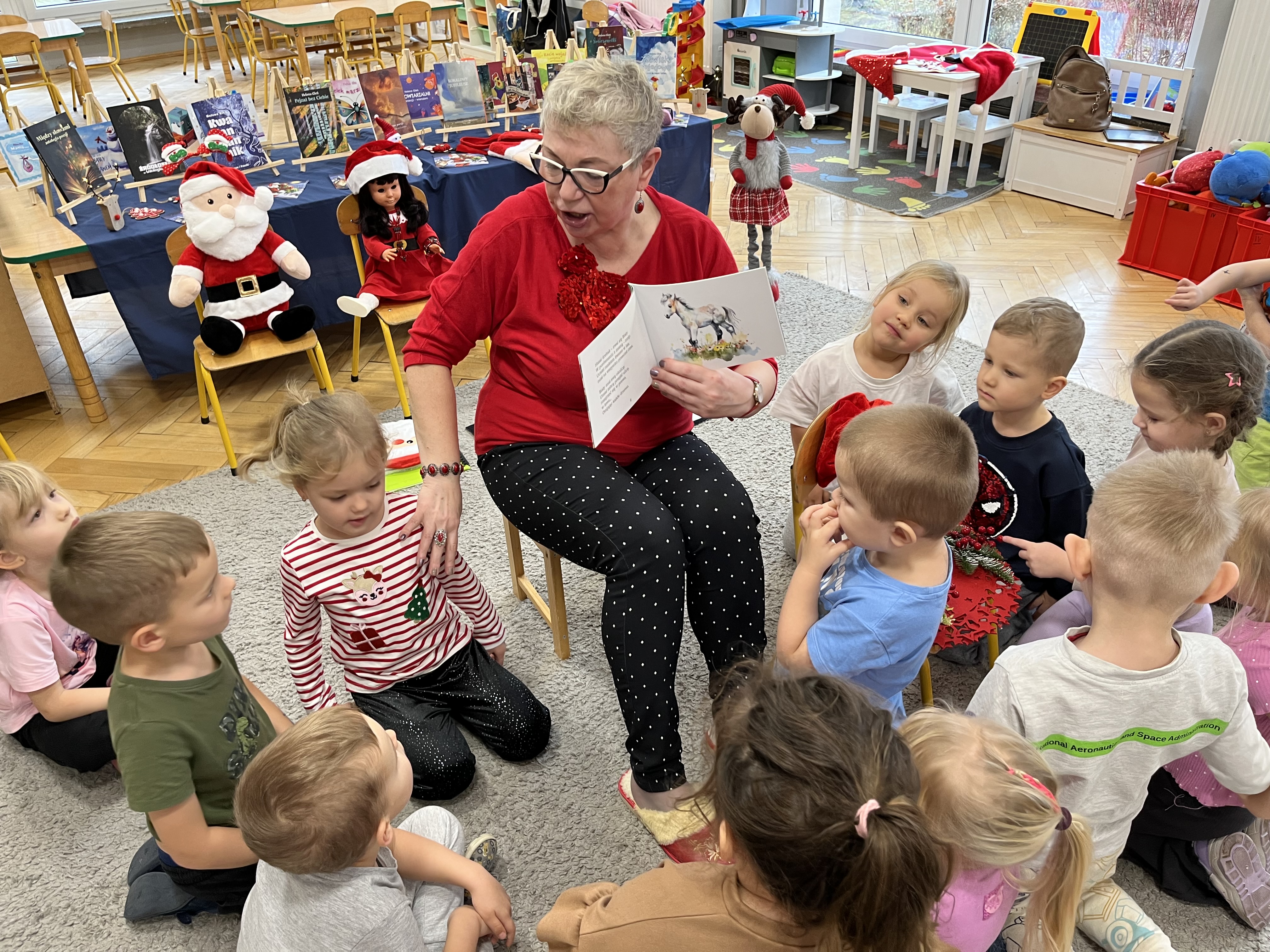 W naszym przedszkolu odbyło się wyjątkowe wydarzenie! Odwiedziła nas Pani Helena Gleń – autorka bajek, wierszy i książek edukacyjnych dla dzieci. Przedszkolaki miały okazję poznać prawdziwą pisarkę, zobaczyć jej książki oraz dowiedzieć się, jak powstają opowieści. Podczas spotkania dzieci z zainteresowaniem słuchały czytanych przez autorkę wierszy, a następnie jednej wybranej bajki, która szczególnie pobudziła ich wyobraźnię. Przedszkolaki aktywnie uczestniczyły w rozmowie, dzieliły się swoimi spostrzeżeniami i zadawały pytania. Było to bardzo inspirujące i pełne magii spotkanie, które zachęciło najmłodszych do sięgania po książki i odkrywania świata literatury.