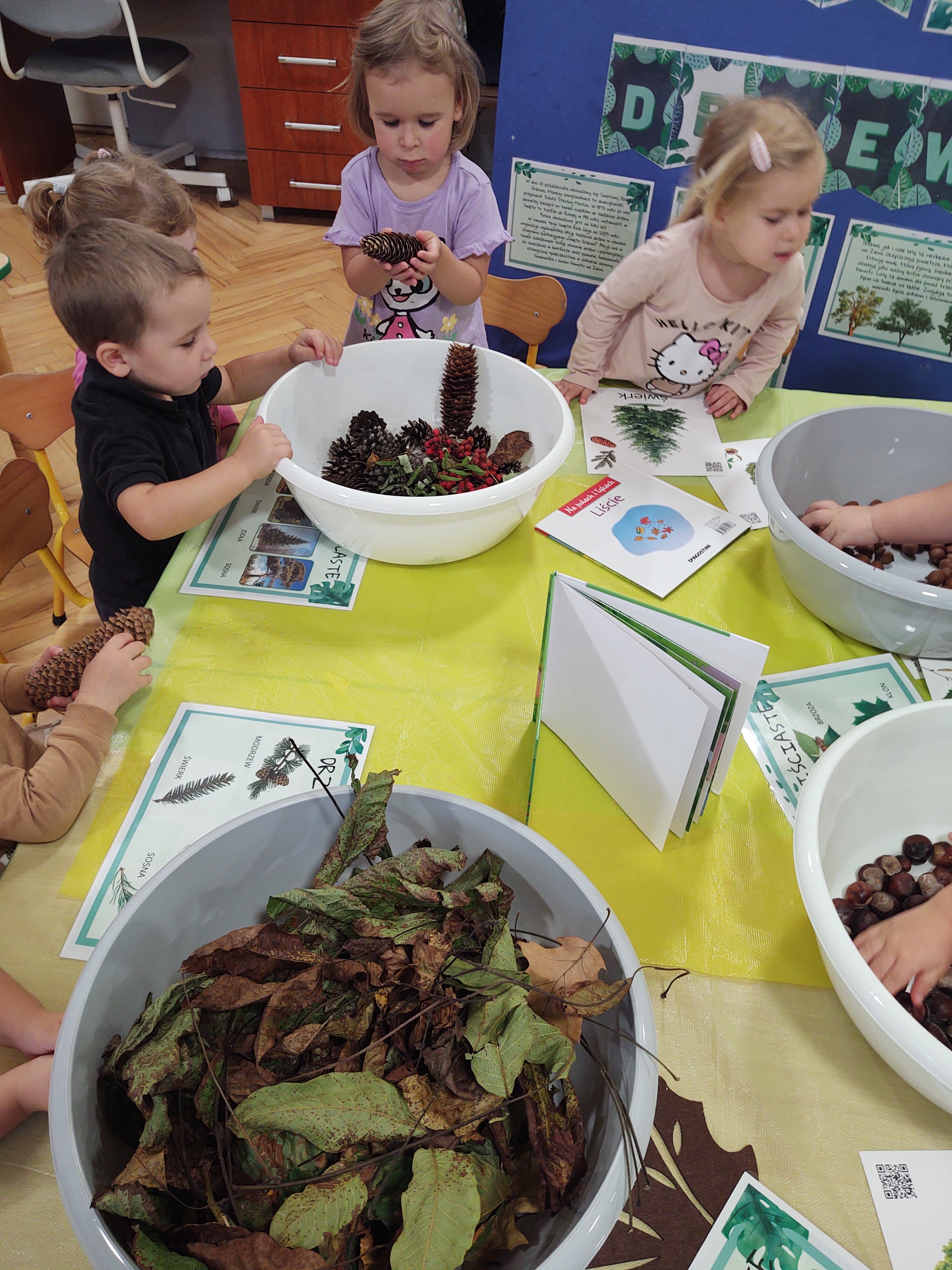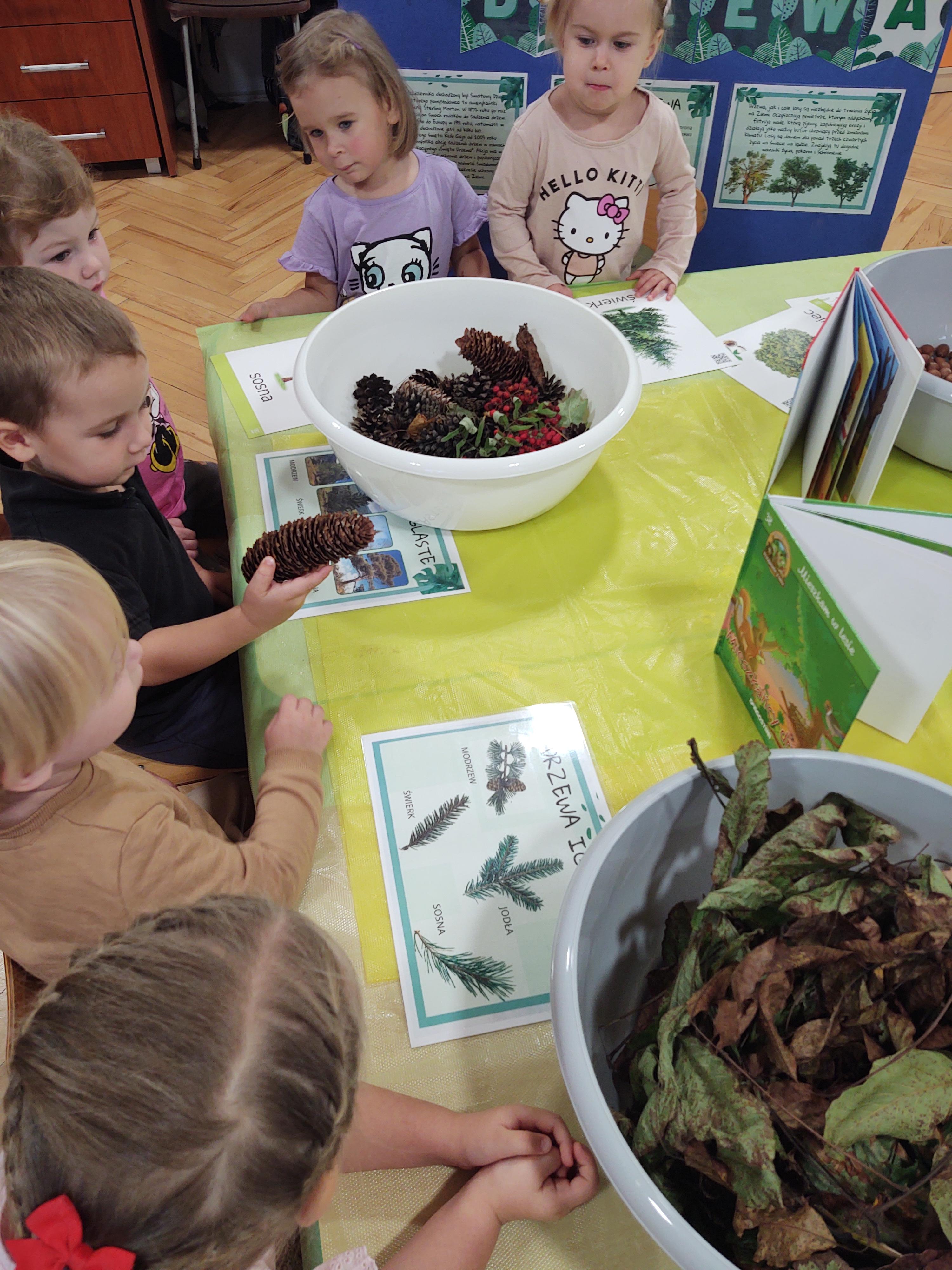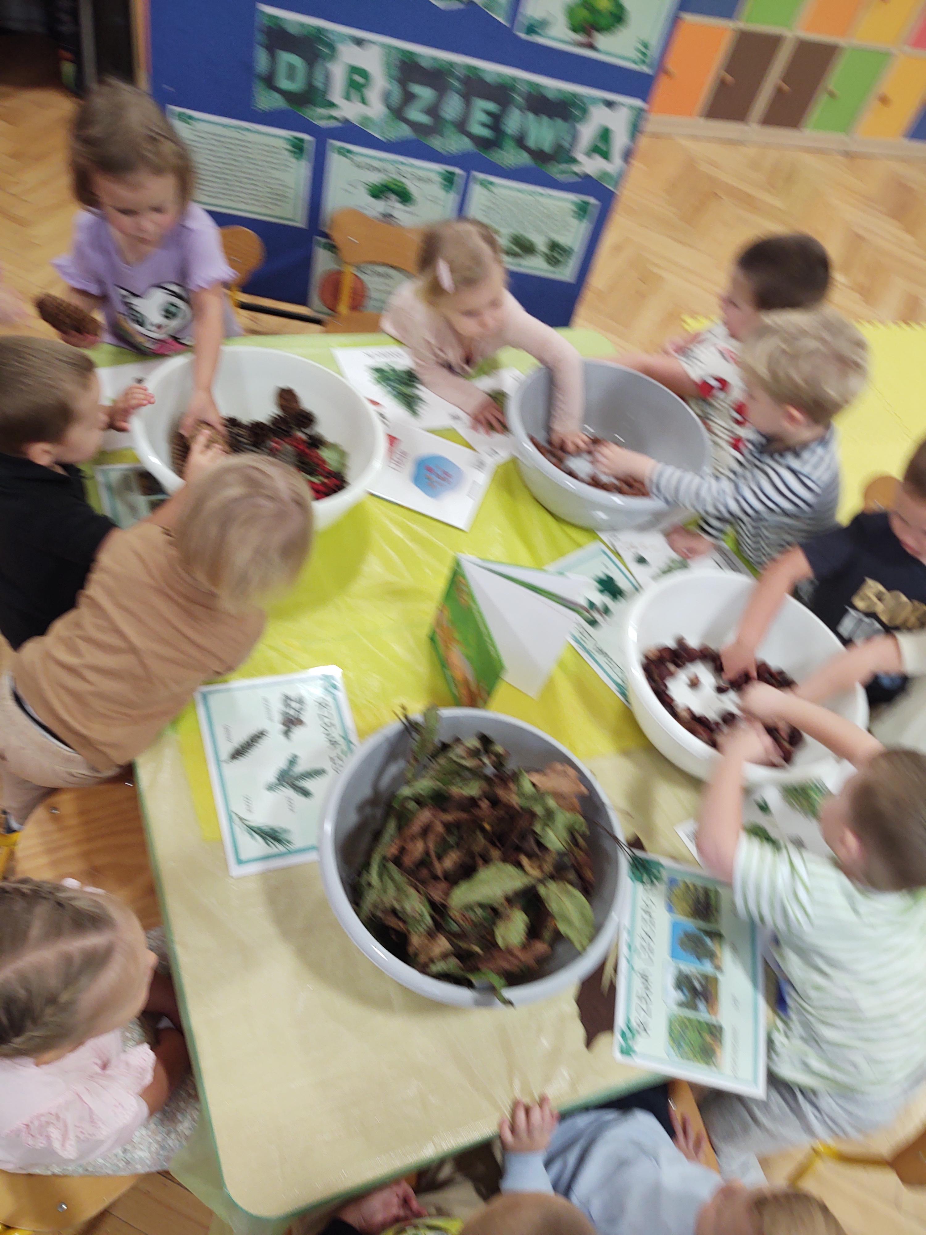 Dzieci poznały między innymi budowę drzewa, etapy jego wzrostu, nauczyły się odróżniać drzewa liściaste od iglastych, nazywać poszczególne drzewa i jego owoce- np. dąb- żołędzie, kasztanowiec- kasztany, jabłoń- jabłka itp.