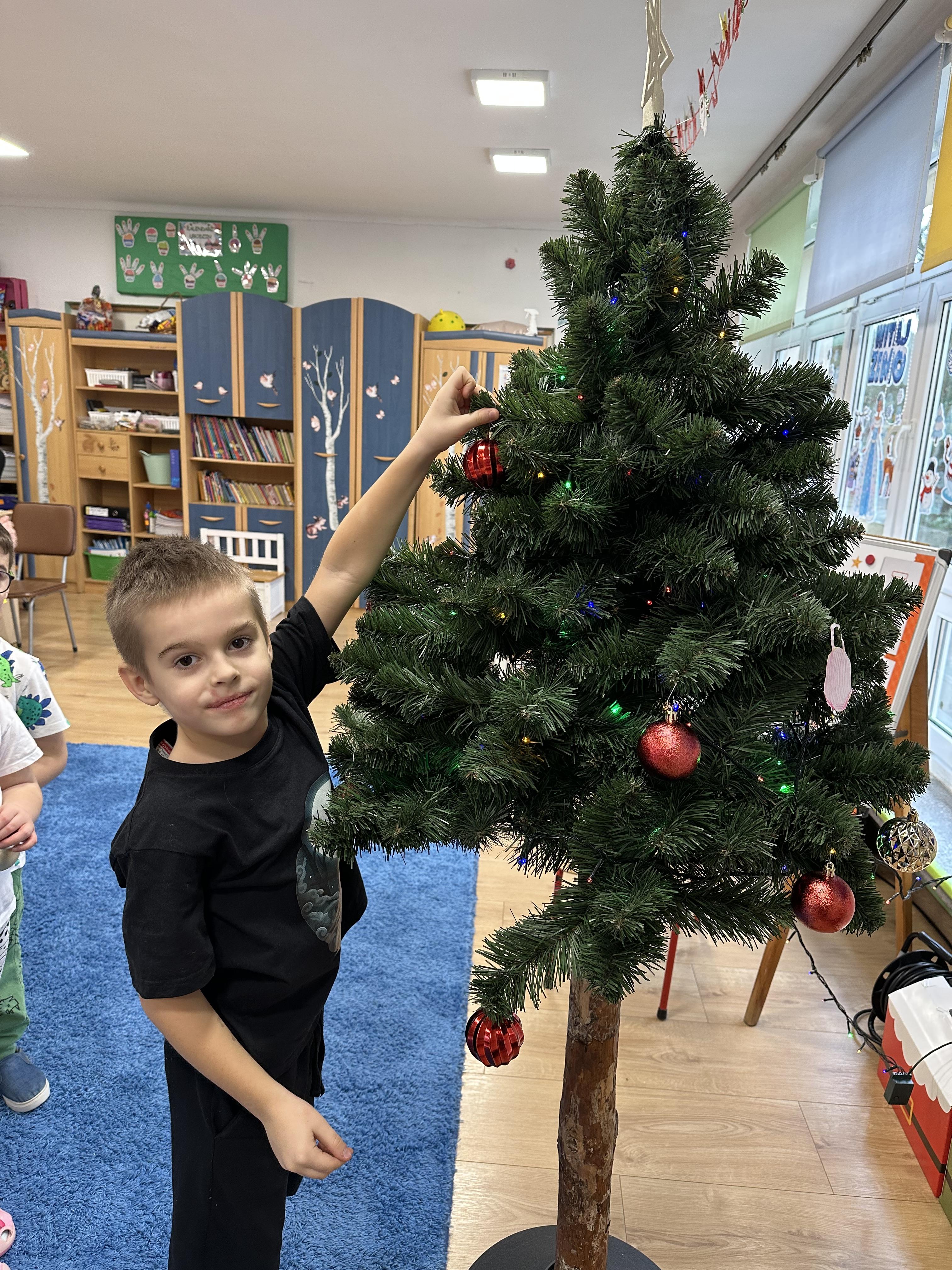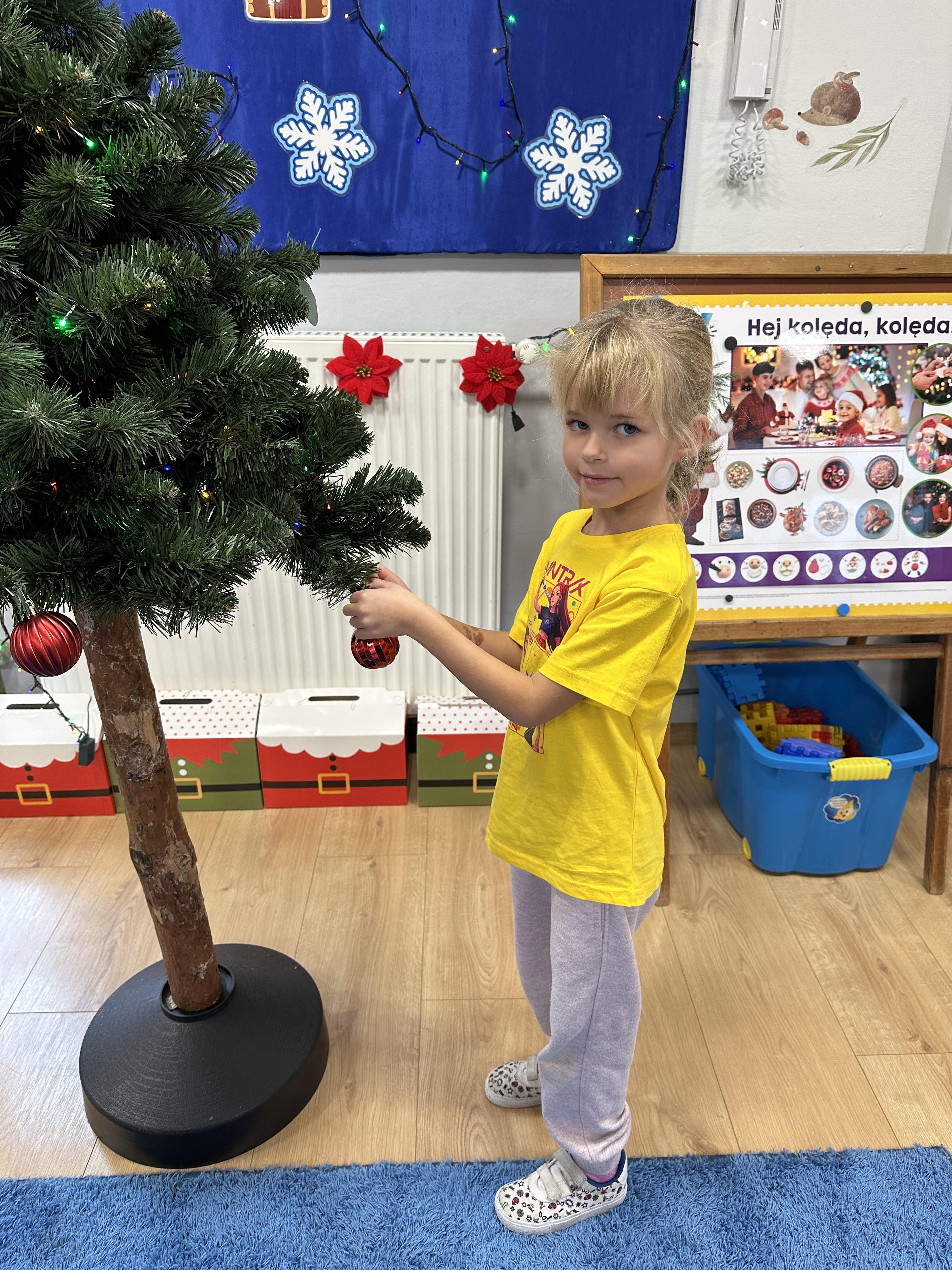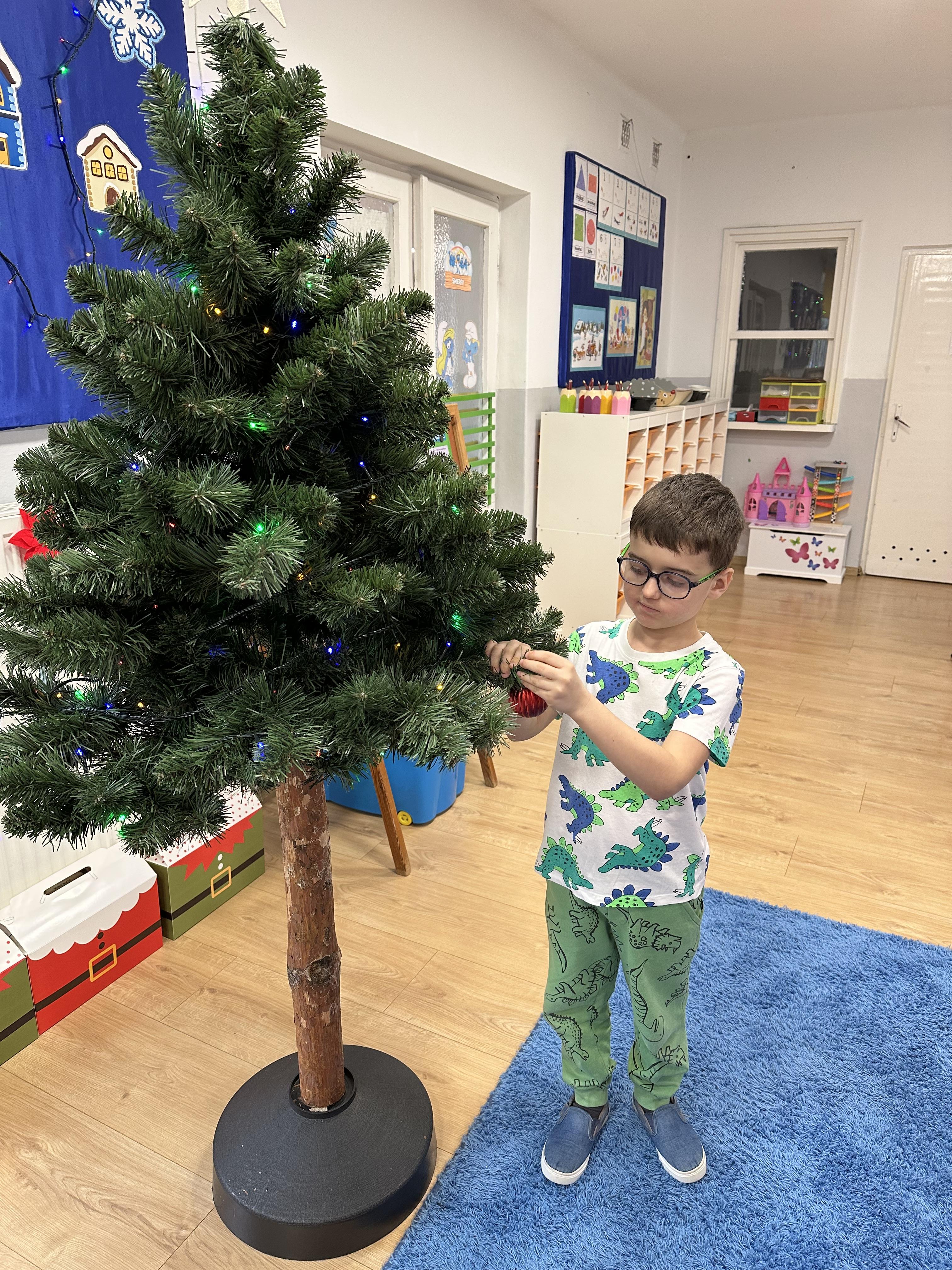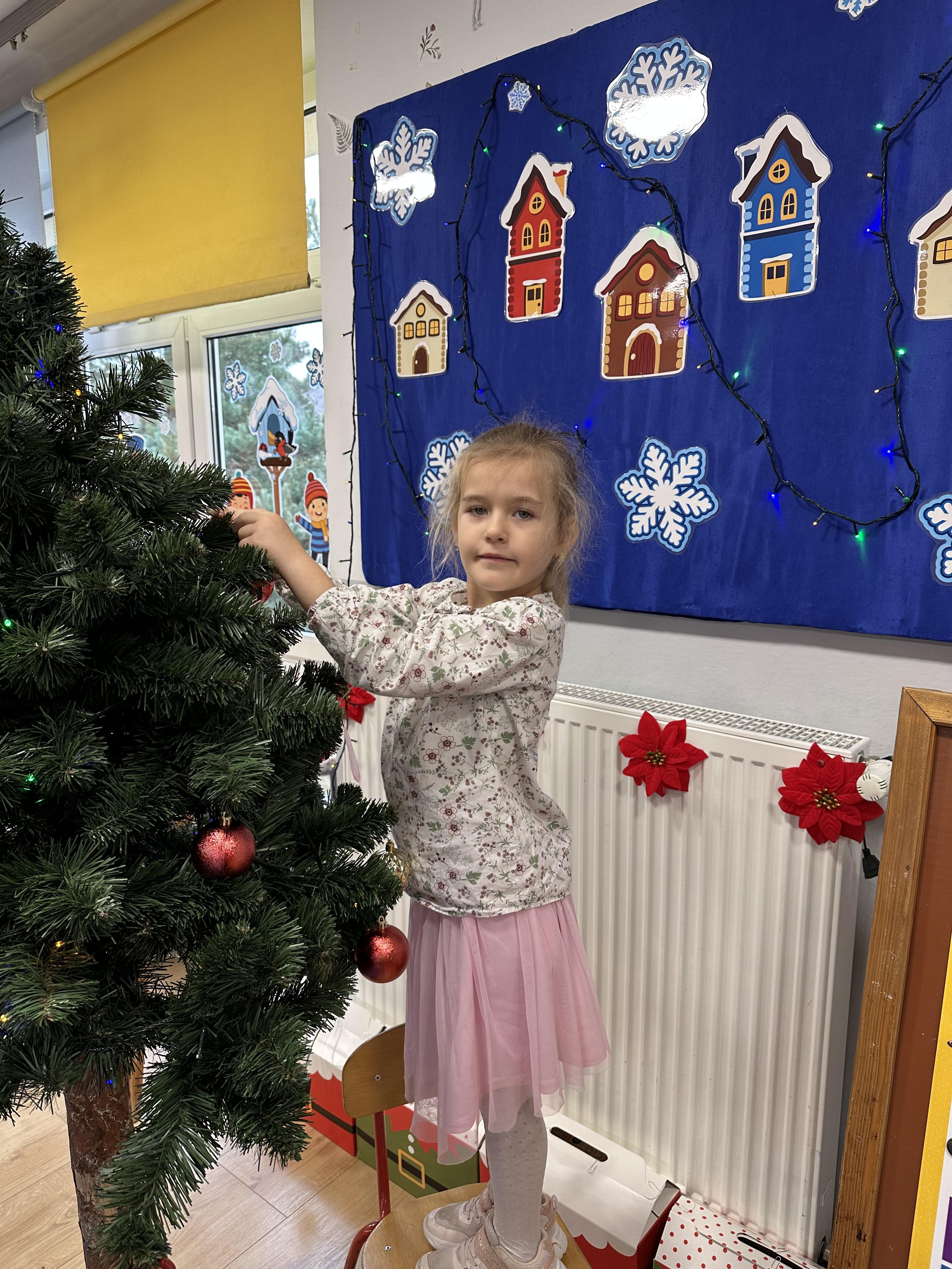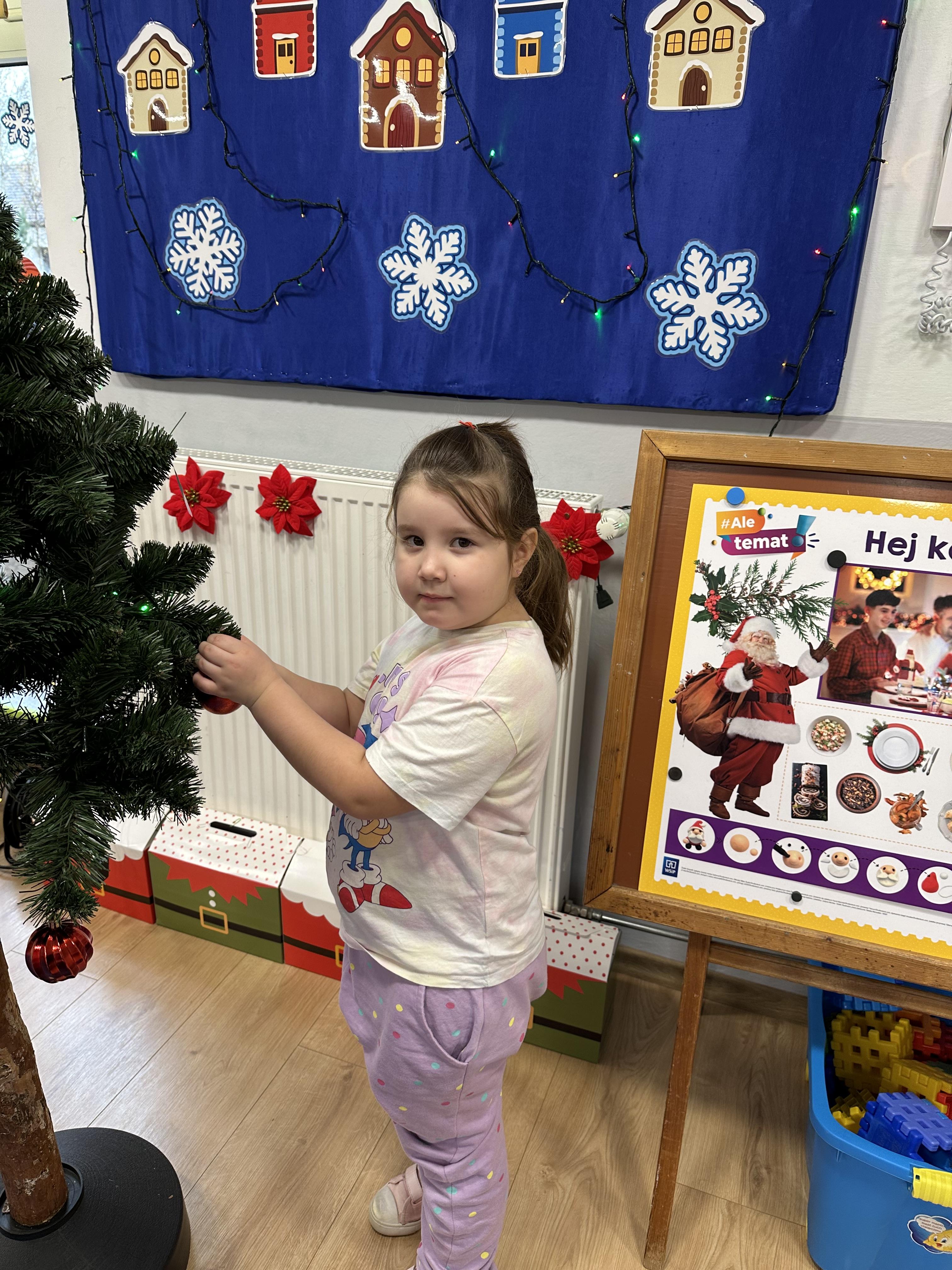 W poniedziałek przedszkolaki wysłuchały opowiadania Marii Pawlisz ,,Idą święta”, po którym miały możliwość wypowiedzieć się, czy lubią spędzać z rodziną święta bożenarodzeniowe. Następnie wspólnie doszły do wniosku, że w każdej rodzinie spędzanie świąt może się różnić i nie ma w tym nic złego. Podczas zajęć dydaktycznych sześciolatki naśladowały czynności wykonywane podczas przygotowań świątecznych. Brały udział w ruchowych zabawach tematycznych, podczas których uczyły się współpracy i integrowały się. Na dworze ćwiczyły mięśnie nóg, skacząc, jak najdalej potrafią. Po powrocie do przedszkola wspólnie wykonywały ćwiczenia gimnastyczne uruchamiające duże grupy mięśniowe, kształtujące prawidłową postawę ciała i orientację w przestrzeni. W trakcie zabawy „Elementy tradycji bożonarodzeniowej” rozpoznawały elementy tradycji świątecznej. Wtorek był poświęcony kształtowaniu umiejętności rozumienia treści życzeń i ich składania. Przedszkolaki wysłuchały piosenkę ,,Srebrne kolczyki”, która stanowiła wprowadzenie do rozmowy o dekoracjach świątecznych na choinkę. Zapoznały się z kolędą ,,Dzisiaj w Betlejem” i wyjaśniały, o kim w niej mowa. Podczas wspólnej pogadanki dzieci rozmawiały o okolicznościach składania życzeń, zastanawiały się, czego można życzyć najbliższej osobie, przybierały wybrane role i uczyły się poprawnego składania życzeń z wykorzystaniem sformułowań podanych przez nauczyciela. W czasie indywidualnej pracy przy stolikach przedszkolaki utrwalały swoje umiejętności językowe. Na dworze wspólnie szukały oznak świąt (ubranych choinek, ozdobnych lampek i innych dekoracji na domach, latarniach, w witrynach sklepów). Tego dnia nie zabrakło również zabawy językowej „Jaka głoska, jaka litera, jaka sylaba?”, w czasie, której dzieci wykorzystały zdobytą wcześniej wiedzę. Rozwijały również małą motorykę podczas rysowania, lepienia, malowania i klejenia. Środa była przeznaczona na rozwijanie umiejętności przeliczania oraz zdolności logicznego myślenia. Sześciolatki uczyły się prawidłowego nakrywania stołu i ćwiczyły pamięć wzrokową. Wysłuchały wiersza ,,Szkoda” i omówiły wspólnie jego treść, zwracając uwagę na rymy. Dzieci brały udział w zabawach językowych, orientacyjno-porządkowych, matematycznych oraz ruchowych z elementami rzutu. W czwartek brały udział w zabawie „Iglaste czy liściaste”, rozpoznawały gatunki drzew i dostrzegały różnicę pomiędzy drzewami iglastymi a liściastymi, rozbudzały również ciekawość przyrodniczą. Podczas zajęć edukacyjnych dzieci układały rytm z figur geometrycznych i według kolorów, pokonywały ścieżkę slalomem, słuchały i zgadywały piosenki. Na spacerze kształtowały umiejętność uważnego obserwowania przyrody i otoczenia, zwracały uwagę na drzewa iglaste i liściaste oraz klasyfikowały, które z nich jest większe, a które mniejsze. Dzień zakończyły pracą rysunkową z wykorzystaniem różnych technik i materiałów plastycznych. W piątek dzieci utrwalały słowa piosenki i bawiły się w grupie. Wspólnie rozwiązywały świąteczne zagadki, eksperymentowały z rodzajami ozdób oraz rozwijały wyobraźnię i kreatywność.