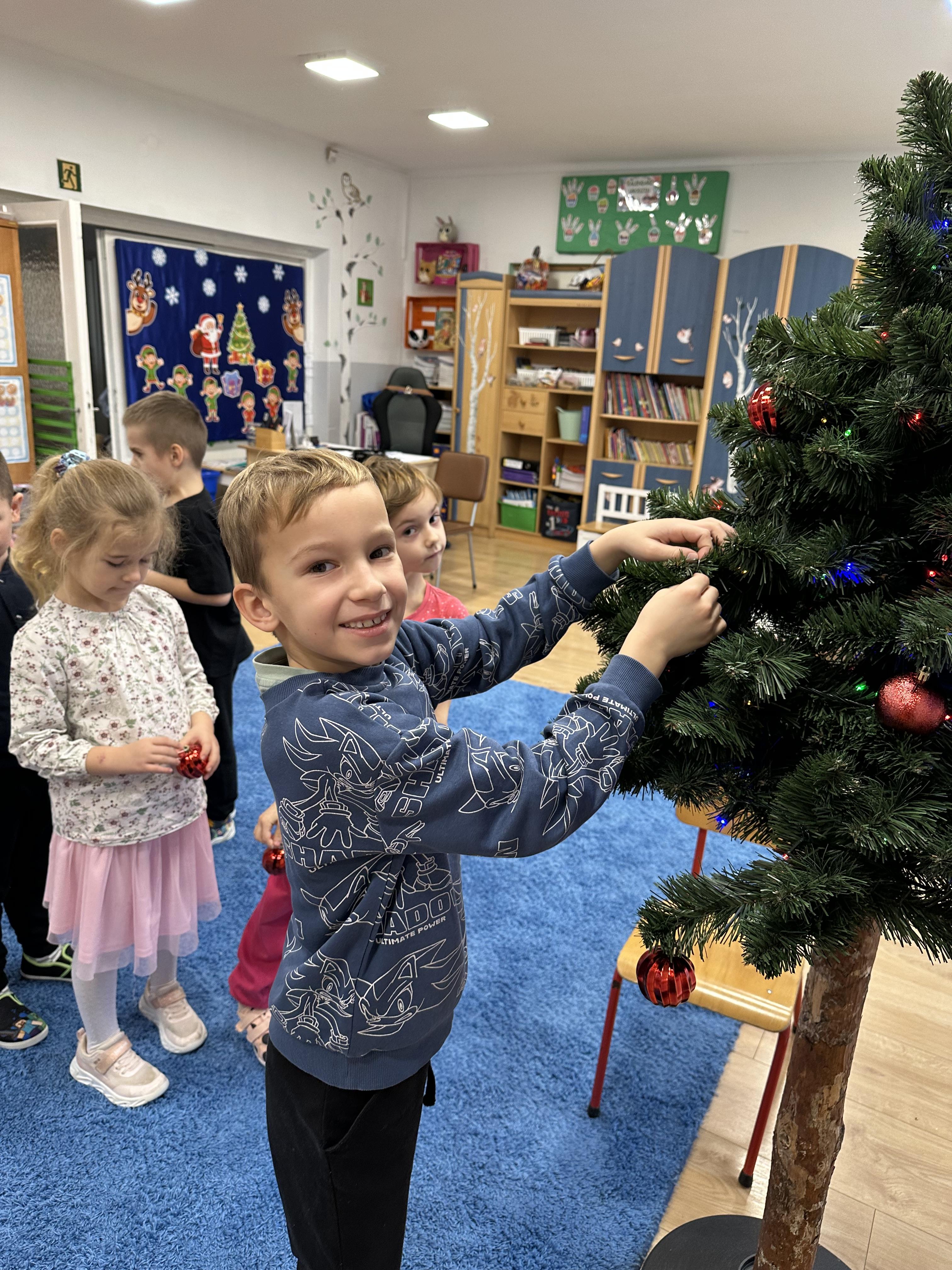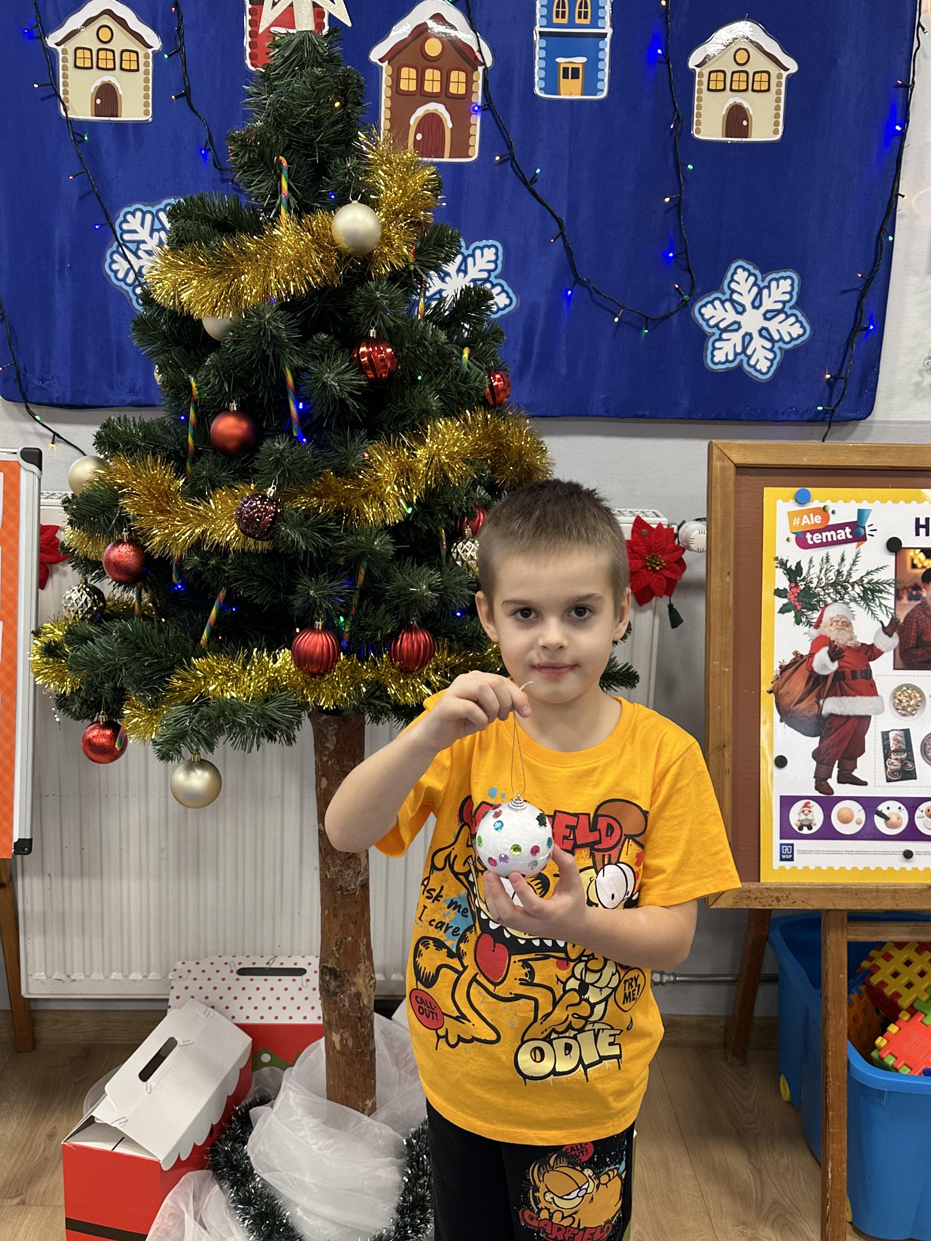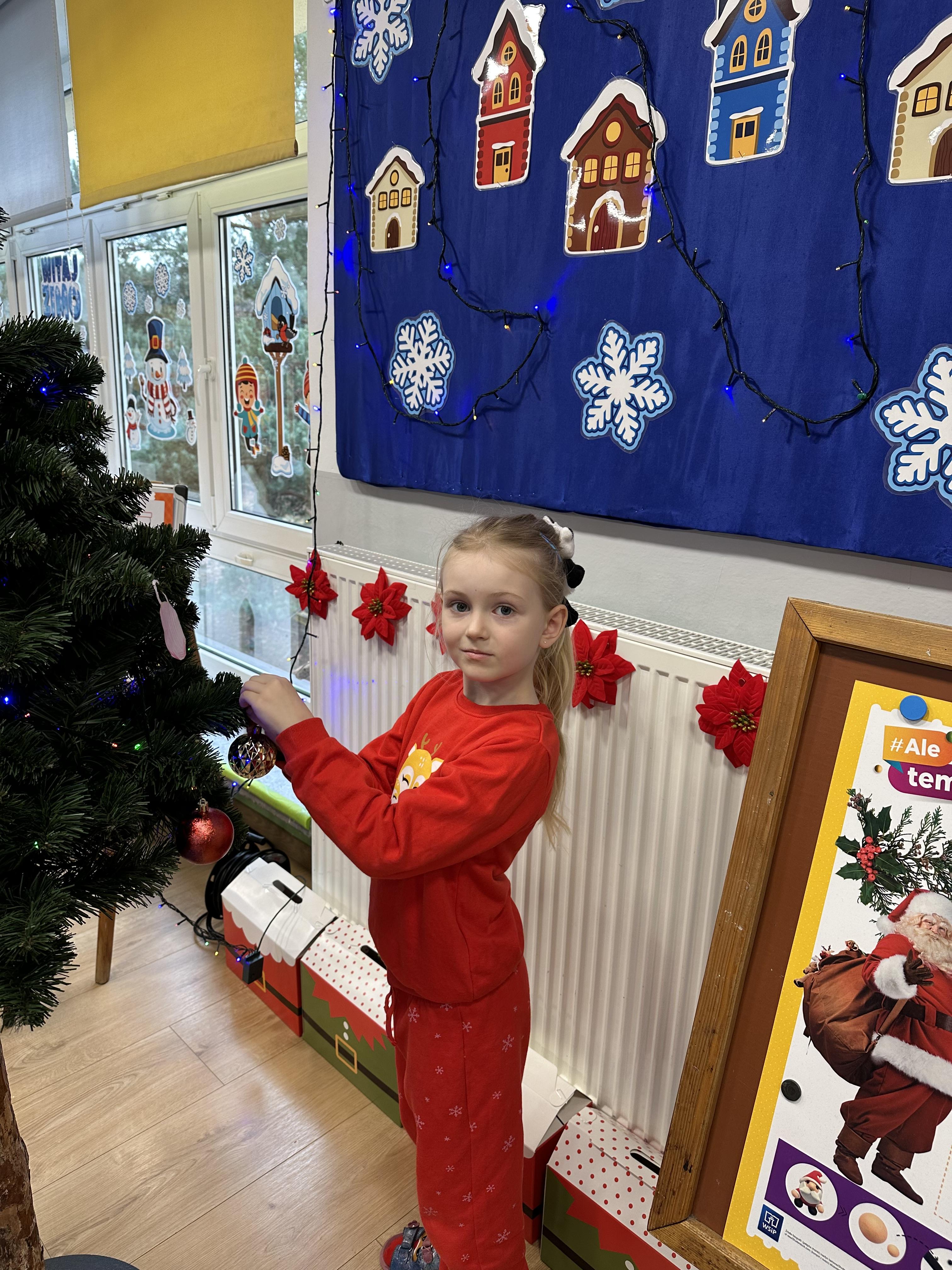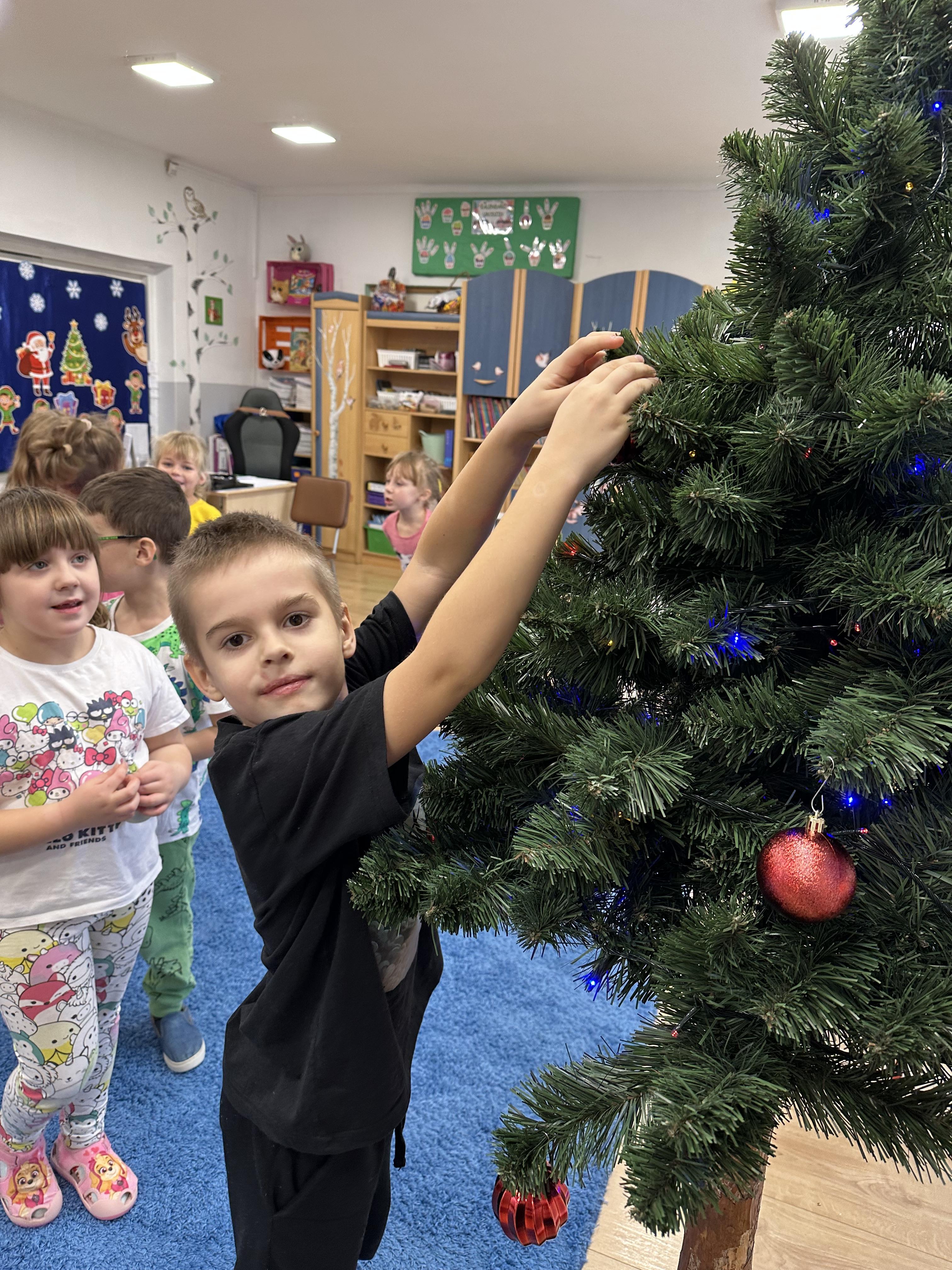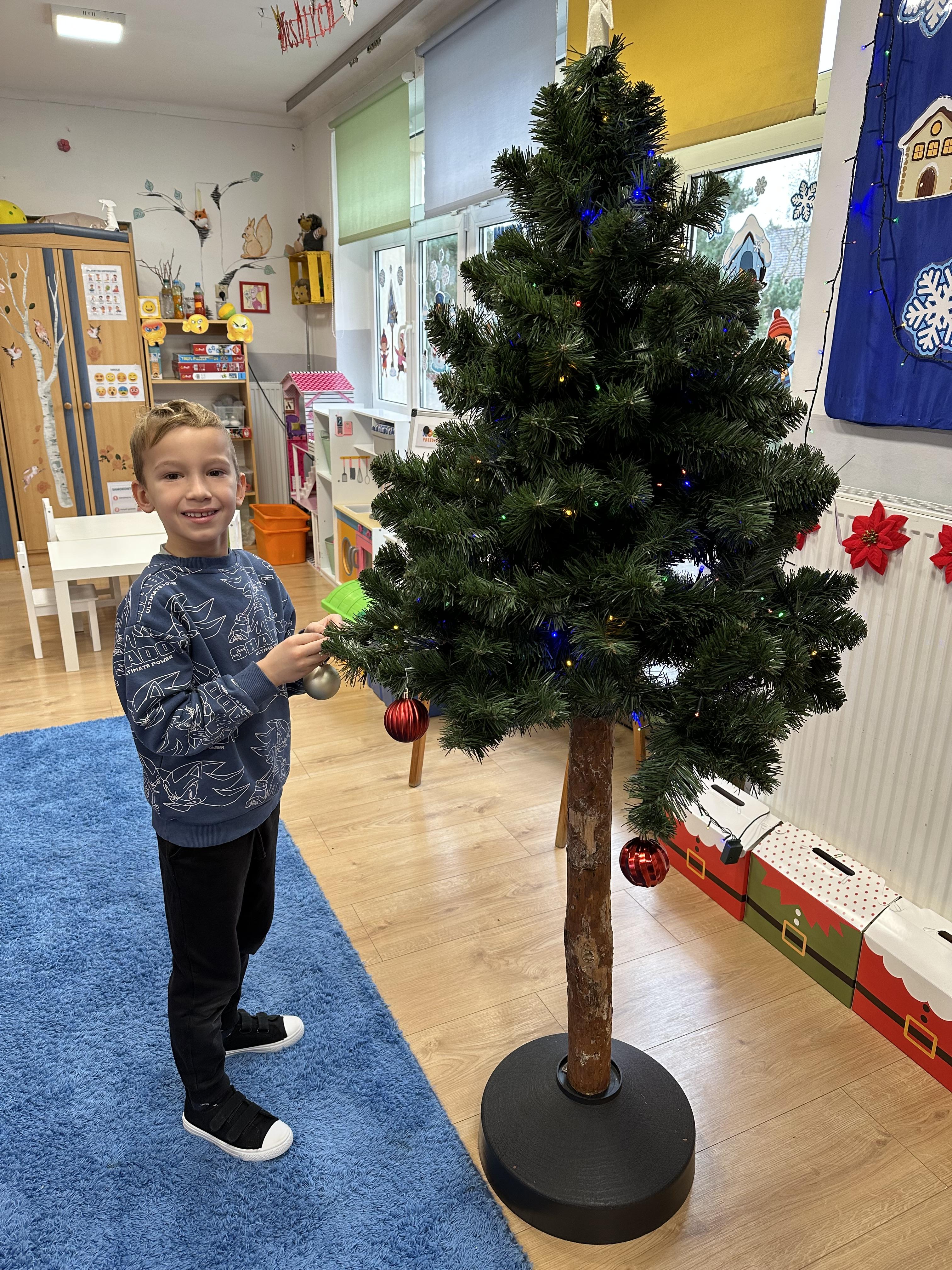 W poniedziałek przedszkolaki wysłuchały opowiadania Marii Pawlisz ,,Idą święta”, po którym miały możliwość wypowiedzieć się, czy lubią spędzać z rodziną święta bożenarodzeniowe. Następnie wspólnie doszły do wniosku, że w każdej rodzinie spędzanie świąt może się różnić i nie ma w tym nic złego. Podczas zajęć dydaktycznych sześciolatki naśladowały czynności wykonywane podczas przygotowań świątecznych. Brały udział w ruchowych zabawach tematycznych, podczas których uczyły się współpracy i integrowały się. Na dworze ćwiczyły mięśnie nóg, skacząc, jak najdalej potrafią. Po powrocie do przedszkola wspólnie wykonywały ćwiczenia gimnastyczne uruchamiające duże grupy mięśniowe, kształtujące prawidłową postawę ciała i orientację w przestrzeni. W trakcie zabawy „Elementy tradycji bożonarodzeniowej” rozpoznawały elementy tradycji świątecznej. Wtorek był poświęcony kształtowaniu umiejętności rozumienia treści życzeń i ich składania. Przedszkolaki wysłuchały piosenkę ,,Srebrne kolczyki”, która stanowiła wprowadzenie do rozmowy o dekoracjach świątecznych na choinkę. Zapoznały się z kolędą ,,Dzisiaj w Betlejem” i wyjaśniały, o kim w niej mowa. Podczas wspólnej pogadanki dzieci rozmawiały o okolicznościach składania życzeń, zastanawiały się, czego można życzyć najbliższej osobie, przybierały wybrane role i uczyły się poprawnego składania życzeń z wykorzystaniem sformułowań podanych przez nauczyciela. W czasie indywidualnej pracy przy stolikach przedszkolaki utrwalały swoje umiejętności językowe. Na dworze wspólnie szukały oznak świąt (ubranych choinek, ozdobnych lampek i innych dekoracji na domach, latarniach, w witrynach sklepów). Tego dnia nie zabrakło również zabawy językowej „Jaka głoska, jaka litera, jaka sylaba?”, w czasie, której dzieci wykorzystały zdobytą wcześniej wiedzę. Rozwijały również małą motorykę podczas rysowania, lepienia, malowania i klejenia. Środa była przeznaczona na rozwijanie umiejętności przeliczania oraz zdolności logicznego myślenia. Sześciolatki uczyły się prawidłowego nakrywania stołu i ćwiczyły pamięć wzrokową. Wysłuchały wiersza ,,Szkoda” i omówiły wspólnie jego treść, zwracając uwagę na rymy. Dzieci brały udział w zabawach językowych, orientacyjno-porządkowych, matematycznych oraz ruchowych z elementami rzutu. W czwartek brały udział w zabawie „Iglaste czy liściaste”, rozpoznawały gatunki drzew i dostrzegały różnicę pomiędzy drzewami iglastymi a liściastymi, rozbudzały również ciekawość przyrodniczą. Podczas zajęć edukacyjnych dzieci układały rytm z figur geometrycznych i według kolorów, pokonywały ścieżkę slalomem, słuchały i zgadywały piosenki. Na spacerze kształtowały umiejętność uważnego obserwowania przyrody i otoczenia, zwracały uwagę na drzewa iglaste i liściaste oraz klasyfikowały, które z nich jest większe, a które mniejsze. Dzień zakończyły pracą rysunkową z wykorzystaniem różnych technik i materiałów plastycznych. W piątek dzieci utrwalały słowa piosenki i bawiły się w grupie. Wspólnie rozwiązywały świąteczne zagadki, eksperymentowały z rodzajami ozdób oraz rozwijały wyobraźnię i kreatywność.