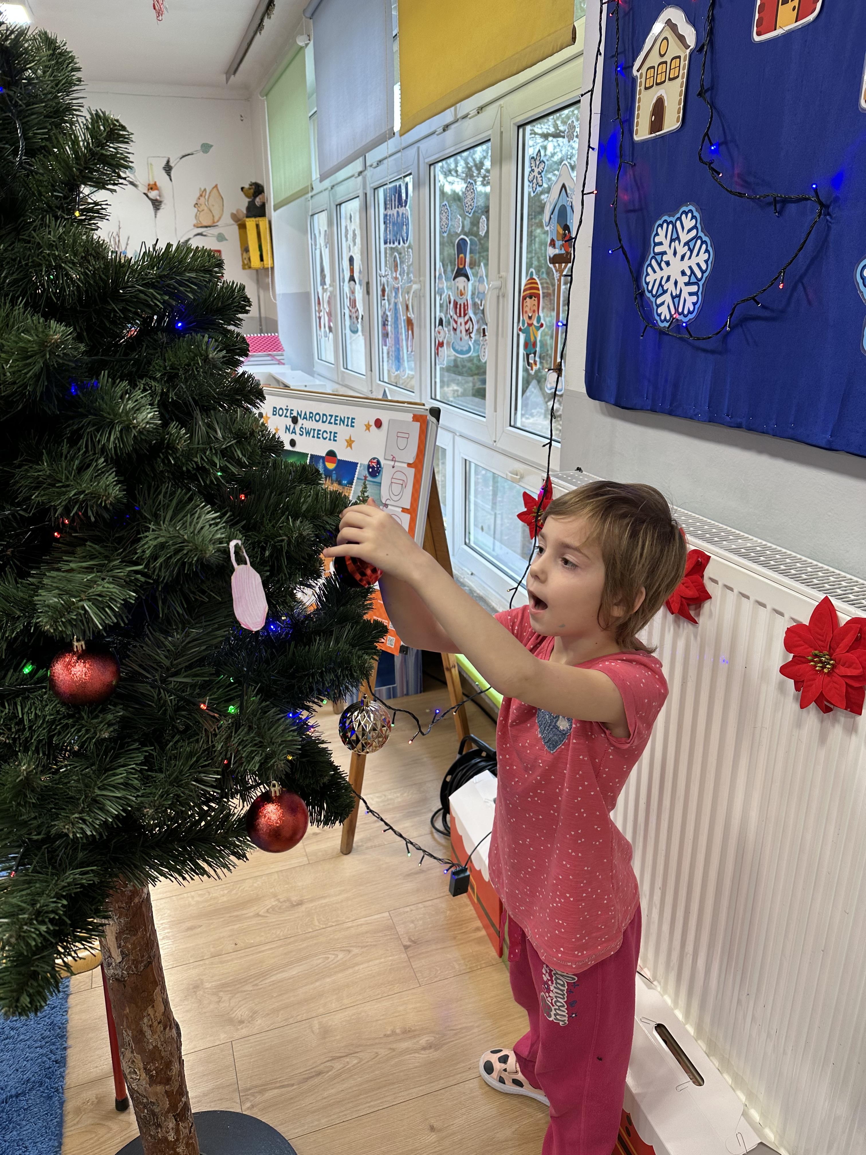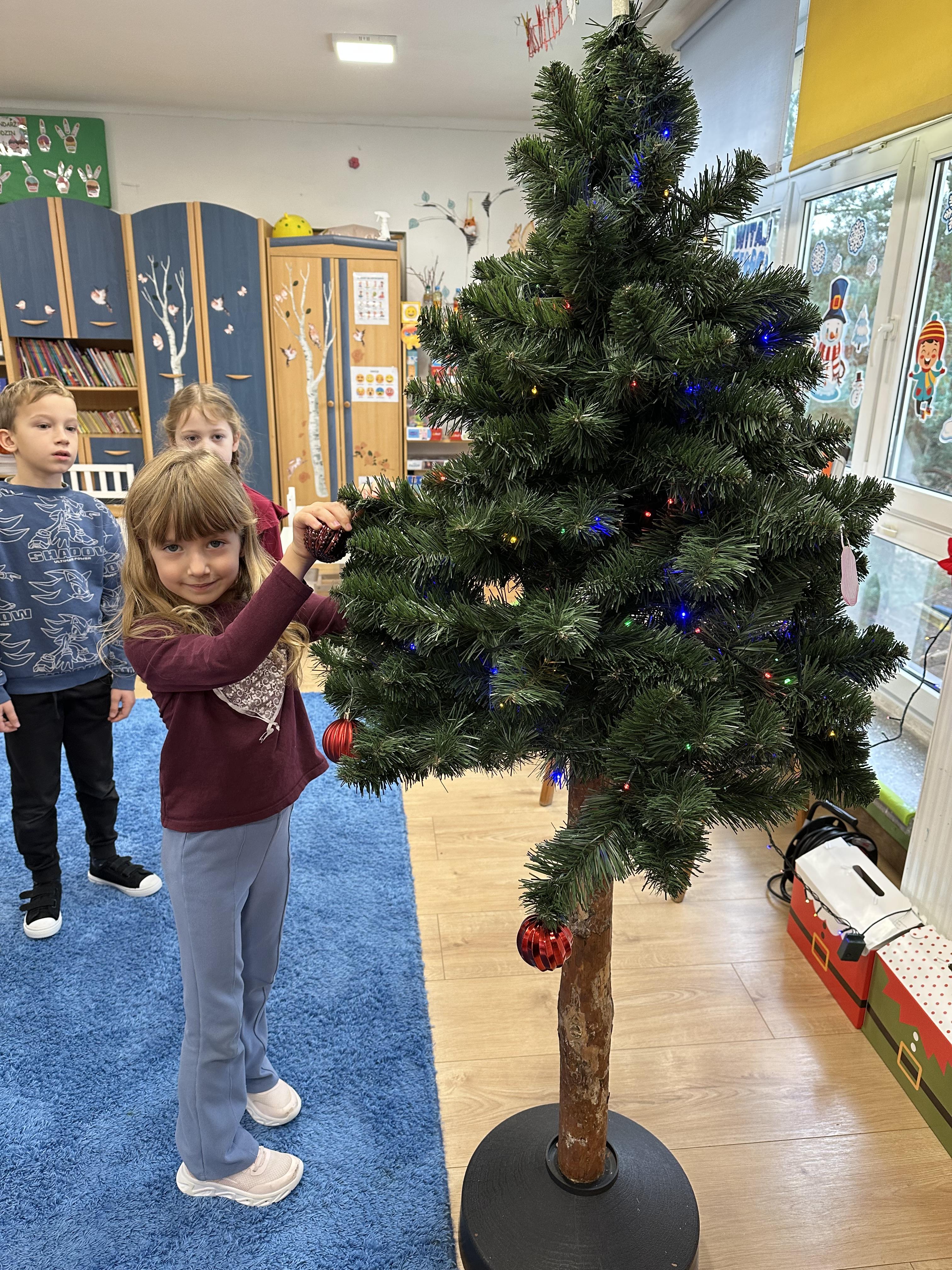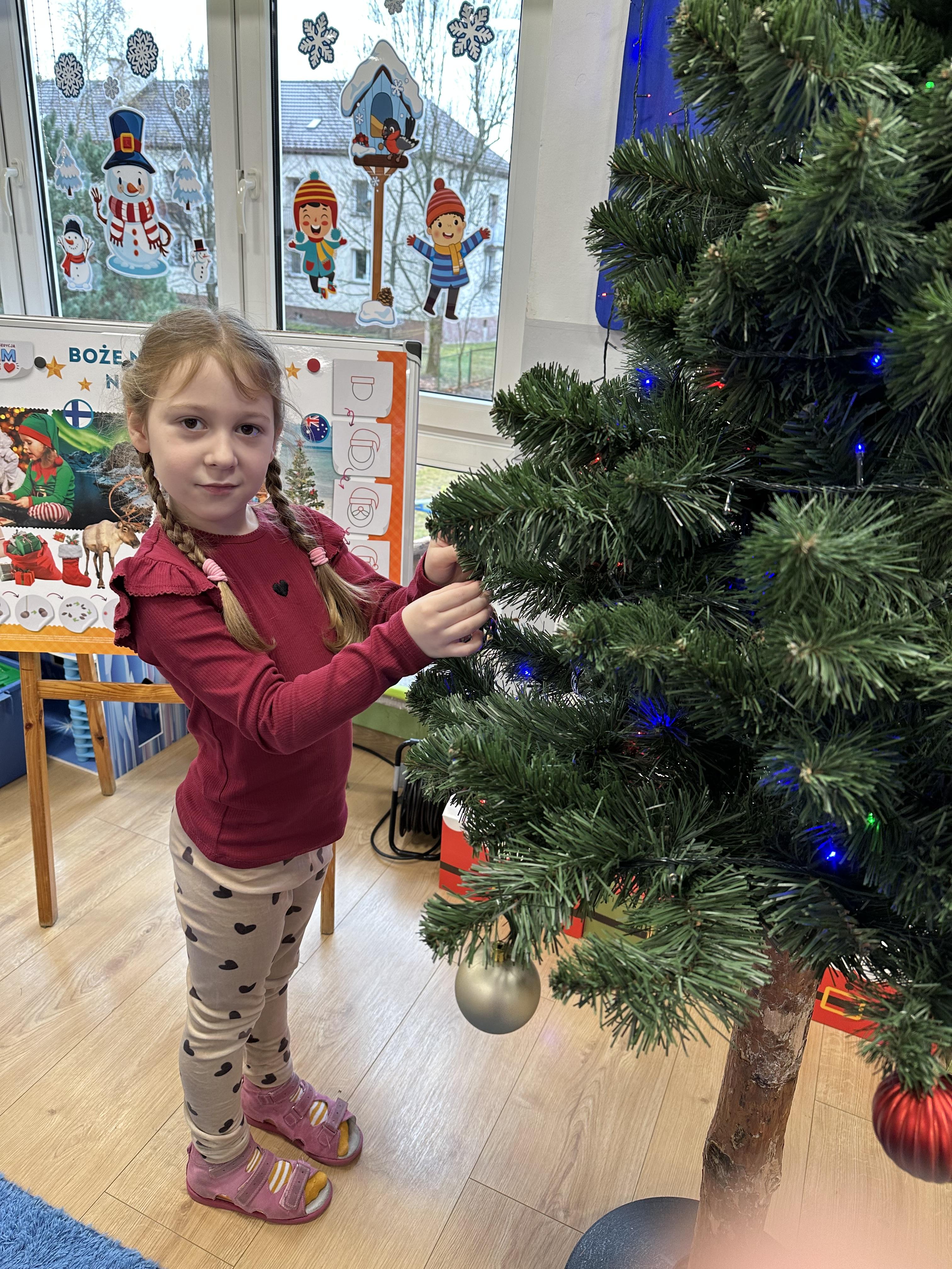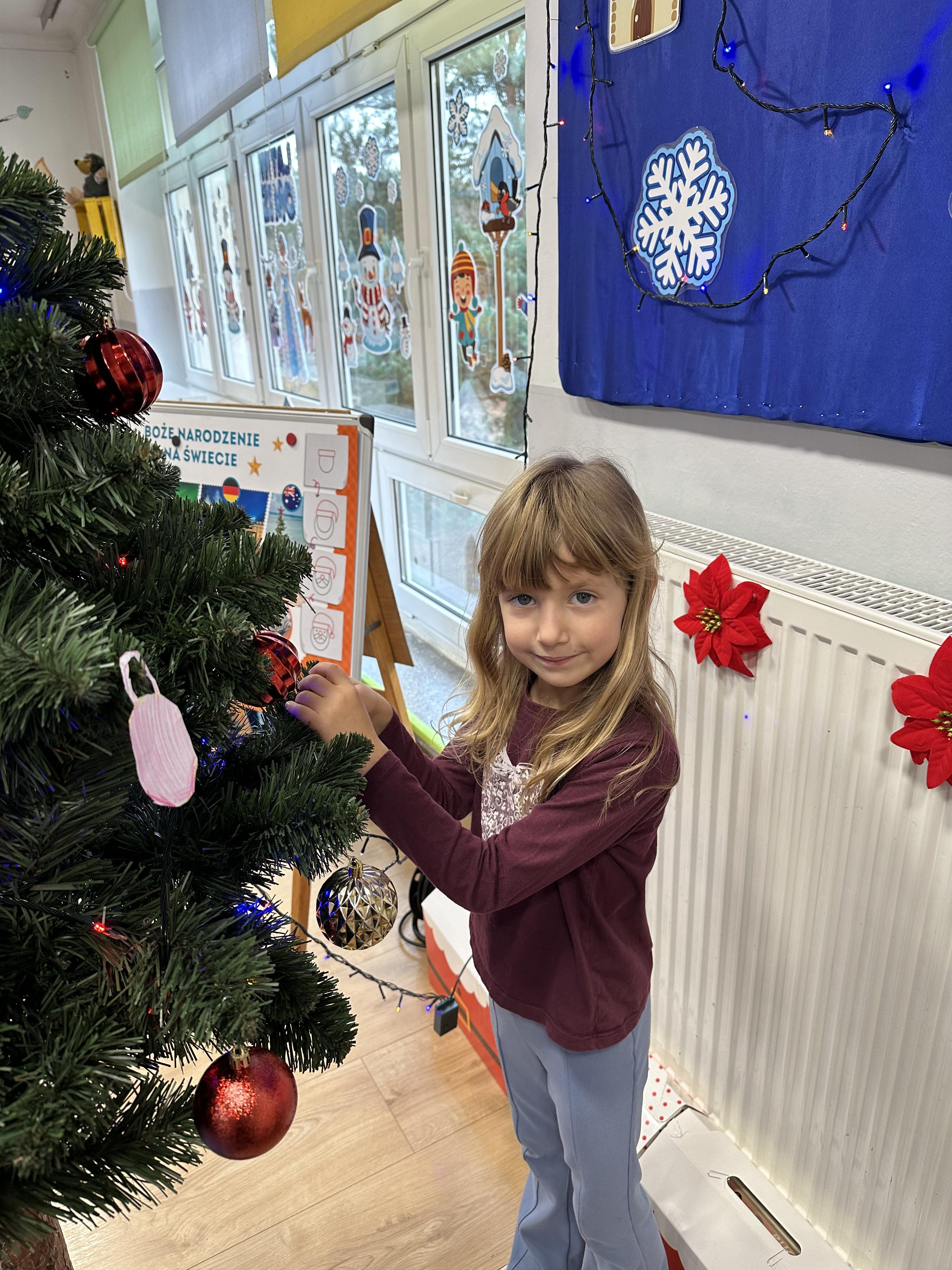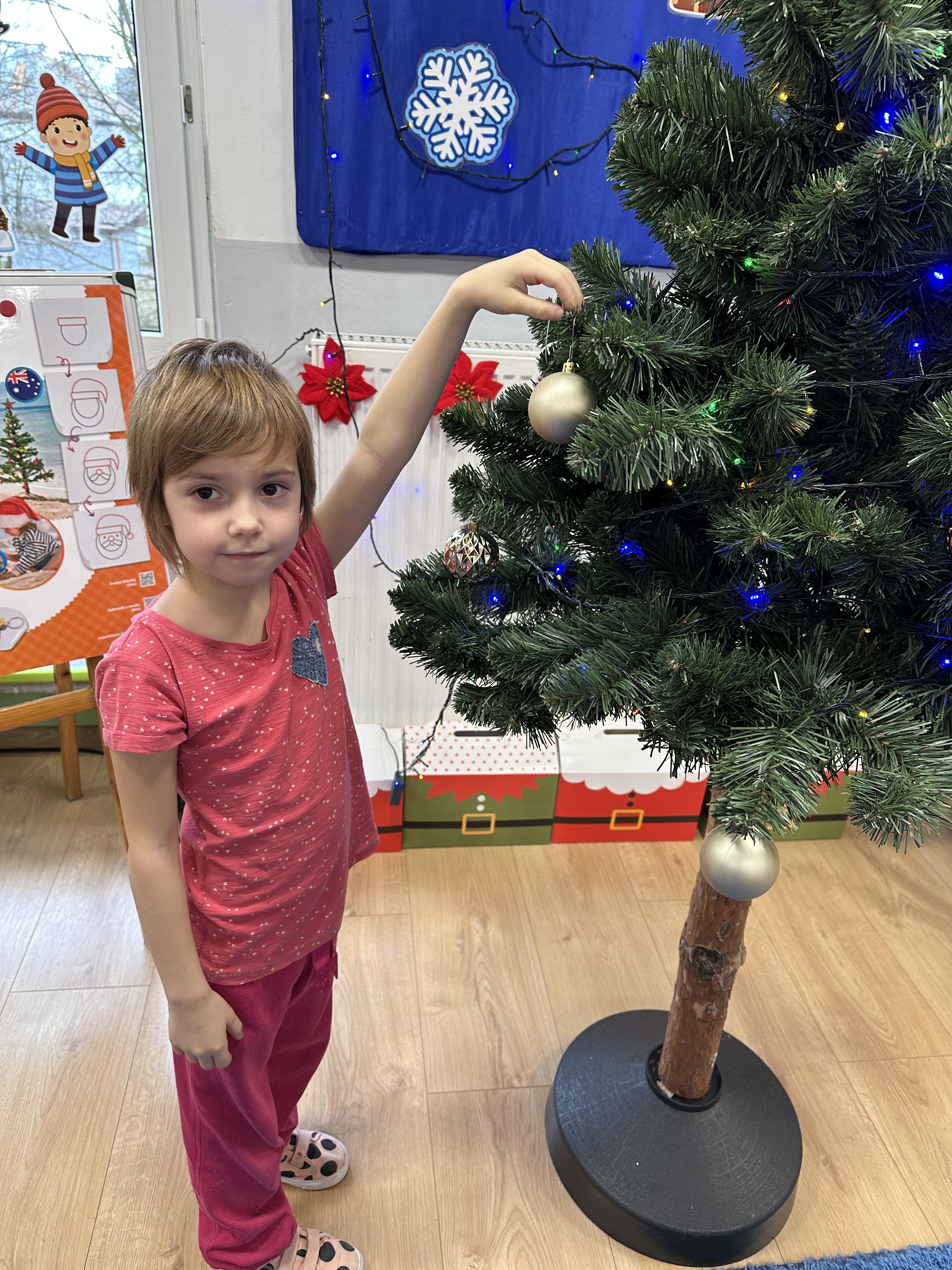 W poniedziałek przedszkolaki wysłuchały opowiadania Marii Pawlisz ,,Idą święta”, po którym miały możliwość wypowiedzieć się, czy lubią spędzać z rodziną święta bożenarodzeniowe. Następnie wspólnie doszły do wniosku, że w każdej rodzinie spędzanie świąt może się różnić i nie ma w tym nic złego. Podczas zajęć dydaktycznych sześciolatki naśladowały czynności wykonywane podczas przygotowań świątecznych. Brały udział w ruchowych zabawach tematycznych, podczas których uczyły się współpracy i integrowały się. Na dworze ćwiczyły mięśnie nóg, skacząc, jak najdalej potrafią. Po powrocie do przedszkola wspólnie wykonywały ćwiczenia gimnastyczne uruchamiające duże grupy mięśniowe, kształtujące prawidłową postawę ciała i orientację w przestrzeni. W trakcie zabawy „Elementy tradycji bożonarodzeniowej” rozpoznawały elementy tradycji świątecznej. Wtorek był poświęcony kształtowaniu umiejętności rozumienia treści życzeń i ich składania. Przedszkolaki wysłuchały piosenkę ,,Srebrne kolczyki”, która stanowiła wprowadzenie do rozmowy o dekoracjach świątecznych na choinkę. Zapoznały się z kolędą ,,Dzisiaj w Betlejem” i wyjaśniały, o kim w niej mowa. Podczas wspólnej pogadanki dzieci rozmawiały o okolicznościach składania życzeń, zastanawiały się, czego można życzyć najbliższej osobie, przybierały wybrane role i uczyły się poprawnego składania życzeń z wykorzystaniem sformułowań podanych przez nauczyciela. W czasie indywidualnej pracy przy stolikach przedszkolaki utrwalały swoje umiejętności językowe. Na dworze wspólnie szukały oznak świąt (ubranych choinek, ozdobnych lampek i innych dekoracji na domach, latarniach, w witrynach sklepów). Tego dnia nie zabrakło również zabawy językowej „Jaka głoska, jaka litera, jaka sylaba?”, w czasie, której dzieci wykorzystały zdobytą wcześniej wiedzę. Rozwijały również małą motorykę podczas rysowania, lepienia, malowania i klejenia. Środa była przeznaczona na rozwijanie umiejętności przeliczania oraz zdolności logicznego myślenia. Sześciolatki uczyły się prawidłowego nakrywania stołu i ćwiczyły pamięć wzrokową. Wysłuchały wiersza ,,Szkoda” i omówiły wspólnie jego treść, zwracając uwagę na rymy. Dzieci brały udział w zabawach językowych, orientacyjno-porządkowych, matematycznych oraz ruchowych z elementami rzutu. W czwartek brały udział w zabawie „Iglaste czy liściaste”, rozpoznawały gatunki drzew i dostrzegały różnicę pomiędzy drzewami iglastymi a liściastymi, rozbudzały również ciekawość przyrodniczą. Podczas zajęć edukacyjnych dzieci układały rytm z figur geometrycznych i według kolorów, pokonywały ścieżkę slalomem, słuchały i zgadywały piosenki. Na spacerze kształtowały umiejętność uważnego obserwowania przyrody i otoczenia, zwracały uwagę na drzewa iglaste i liściaste oraz klasyfikowały, które z nich jest większe, a które mniejsze. Dzień zakończyły pracą rysunkową z wykorzystaniem różnych technik i materiałów plastycznych. W piątek dzieci utrwalały słowa piosenki i bawiły się w grupie. Wspólnie rozwiązywały świąteczne zagadki, eksperymentowały z rodzajami ozdób oraz rozwijały wyobraźnię i kreatywność.