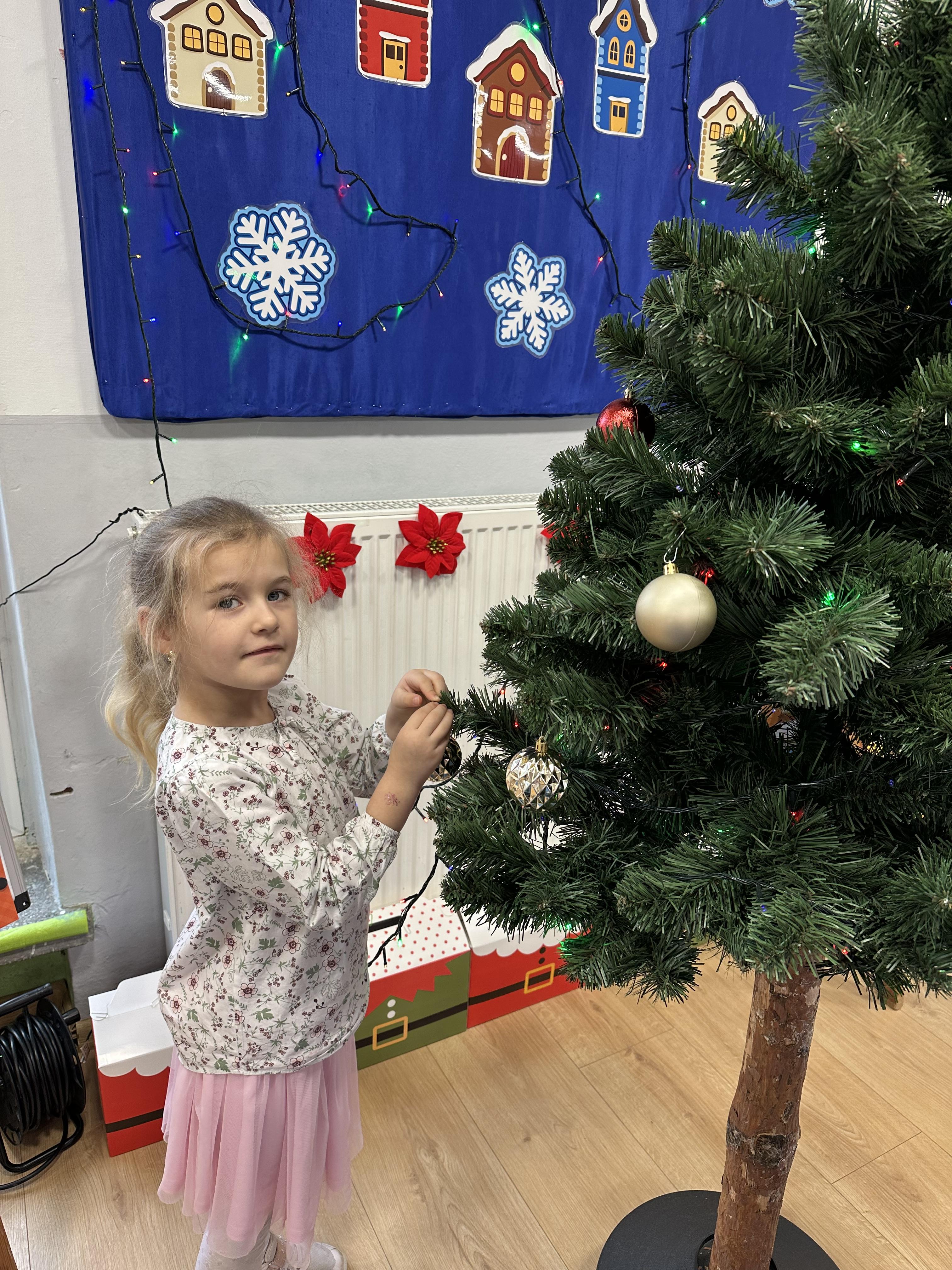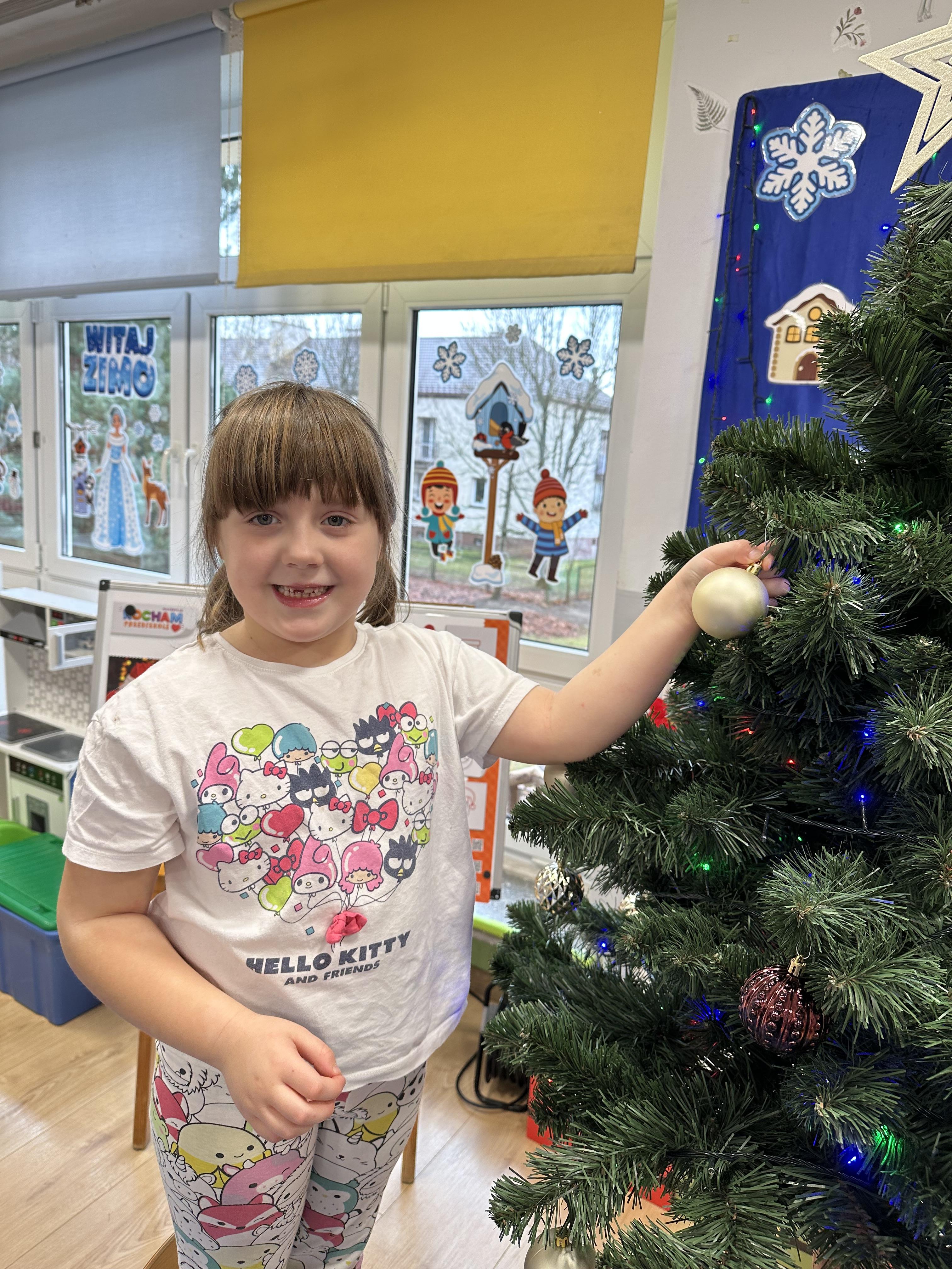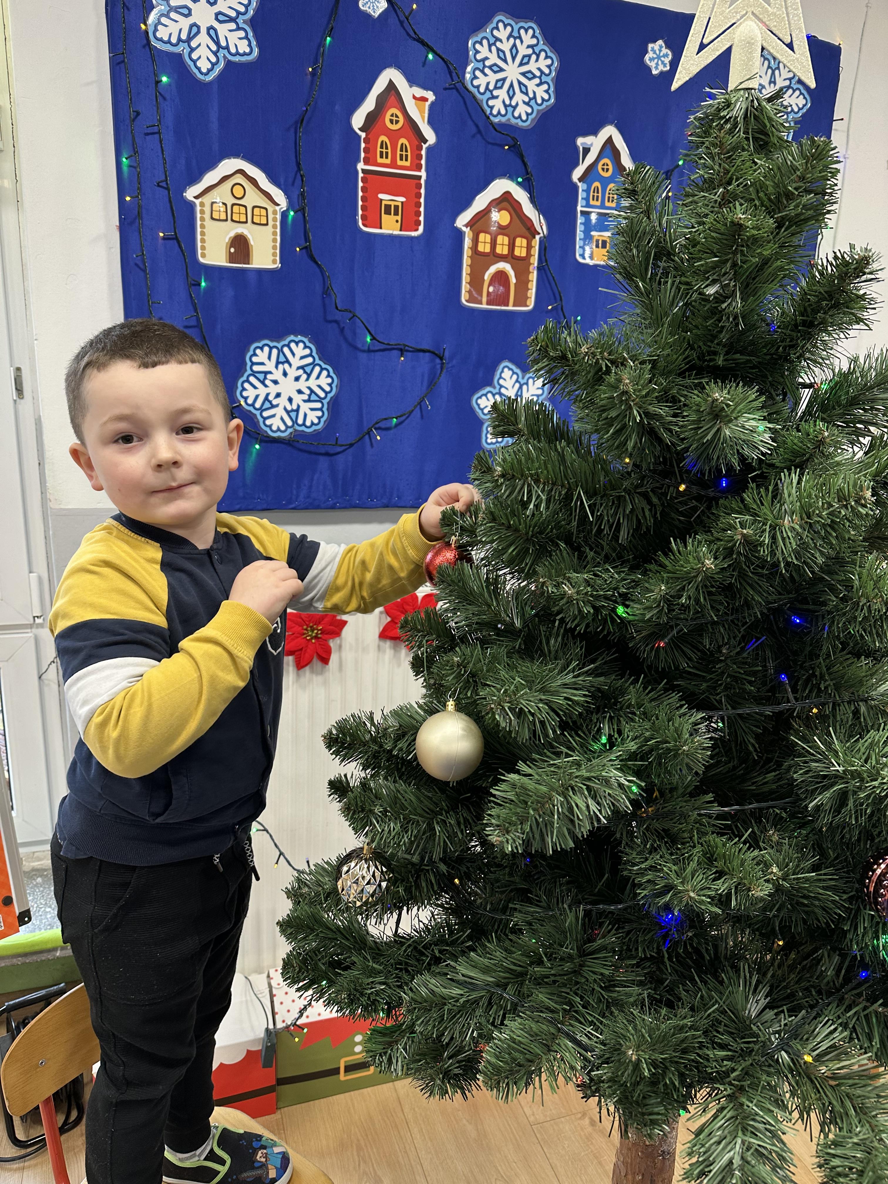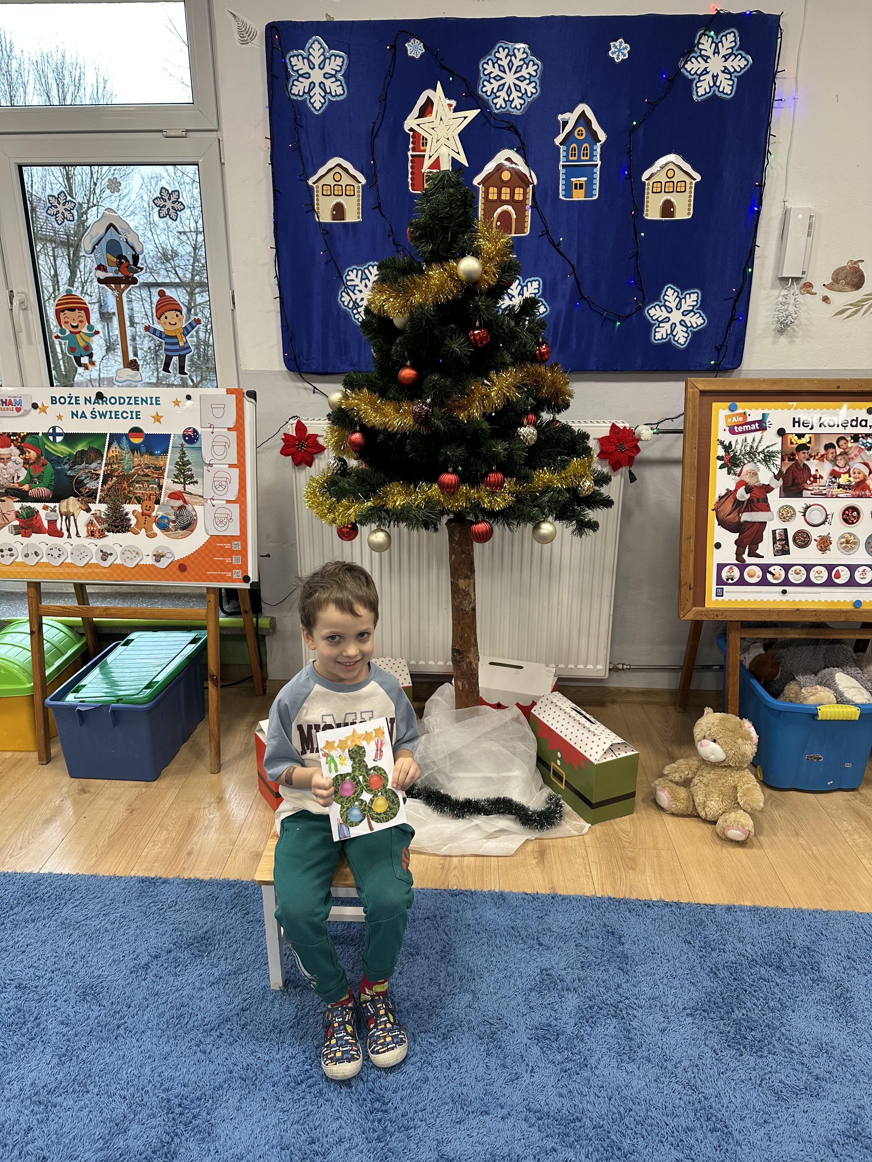W poniedziałek przedszkolaki wysłuchały opowiadania Marii Pawlisz ,,Idą święta”, po którym miały możliwość wypowiedzieć się, czy lubią spędzać z rodziną święta bożenarodzeniowe. Następnie wspólnie doszły do wniosku, że w każdej rodzinie spędzanie świąt może się różnić i nie ma w tym nic złego. Podczas zajęć dydaktycznych sześciolatki naśladowały czynności wykonywane podczas przygotowań świątecznych. Brały udział w ruchowych zabawach tematycznych, podczas których uczyły się współpracy i integrowały się. Na dworze ćwiczyły mięśnie nóg, skacząc, jak najdalej potrafią. Po powrocie do przedszkola wspólnie wykonywały ćwiczenia gimnastyczne uruchamiające duże grupy mięśniowe, kształtujące prawidłową postawę ciała i orientację w przestrzeni. W trakcie zabawy „Elementy tradycji bożonarodzeniowej” rozpoznawały elementy tradycji świątecznej. Wtorek był poświęcony kształtowaniu umiejętności rozumienia treści życzeń i ich składania. Przedszkolaki wysłuchały piosenkę ,,Srebrne kolczyki”, która stanowiła wprowadzenie do rozmowy o dekoracjach świątecznych na choinkę. Zapoznały się z kolędą ,,Dzisiaj w Betlejem” i wyjaśniały, o kim w niej mowa. Podczas wspólnej pogadanki dzieci rozmawiały o okolicznościach składania życzeń, zastanawiały się, czego można życzyć najbliższej osobie, przybierały wybrane role i uczyły się poprawnego składania życzeń z wykorzystaniem sformułowań podanych przez nauczyciela. W czasie indywidualnej pracy przy stolikach przedszkolaki utrwalały swoje umiejętności językowe. Na dworze wspólnie szukały oznak świąt (ubranych choinek, ozdobnych lampek i innych dekoracji na domach, latarniach, w witrynach sklepów). Tego dnia nie zabrakło również zabawy językowej „Jaka głoska, jaka litera, jaka sylaba?”, w czasie, której dzieci wykorzystały zdobytą wcześniej wiedzę. Rozwijały również małą motorykę podczas rysowania, lepienia, malowania i klejenia. Środa była przeznaczona na rozwijanie umiejętności przeliczania oraz zdolności logicznego myślenia. Sześciolatki uczyły się prawidłowego nakrywania stołu i ćwiczyły pamięć wzrokową. Wysłuchały wiersza ,,Szkoda” i omówiły wspólnie jego treść, zwracając uwagę na rymy. Dzieci brały udział w zabawach językowych, orientacyjno-porządkowych, matematycznych oraz ruchowych z elementami rzutu. W czwartek brały udział w zabawie „Iglaste czy liściaste”, rozpoznawały gatunki drzew i dostrzegały różnicę pomiędzy drzewami iglastymi a liściastymi, rozbudzały również ciekawość przyrodniczą. Podczas zajęć edukacyjnych dzieci układały rytm z figur geometrycznych i według kolorów, pokonywały ścieżkę slalomem, słuchały i zgadywały piosenki. Na spacerze kształtowały umiejętność uważnego obserwowania przyrody i otoczenia, zwracały uwagę na drzewa iglaste i liściaste oraz klasyfikowały, które z nich jest większe, a które mniejsze. Dzień zakończyły pracą rysunkową z wykorzystaniem różnych technik i materiałów plastycznych. W piątek dzieci utrwalały słowa piosenki i bawiły się w grupie. Wspólnie rozwiązywały świąteczne zagadki, eksperymentowały z rodzajami ozdób oraz rozwijały wyobraźnię i kreatywność.
