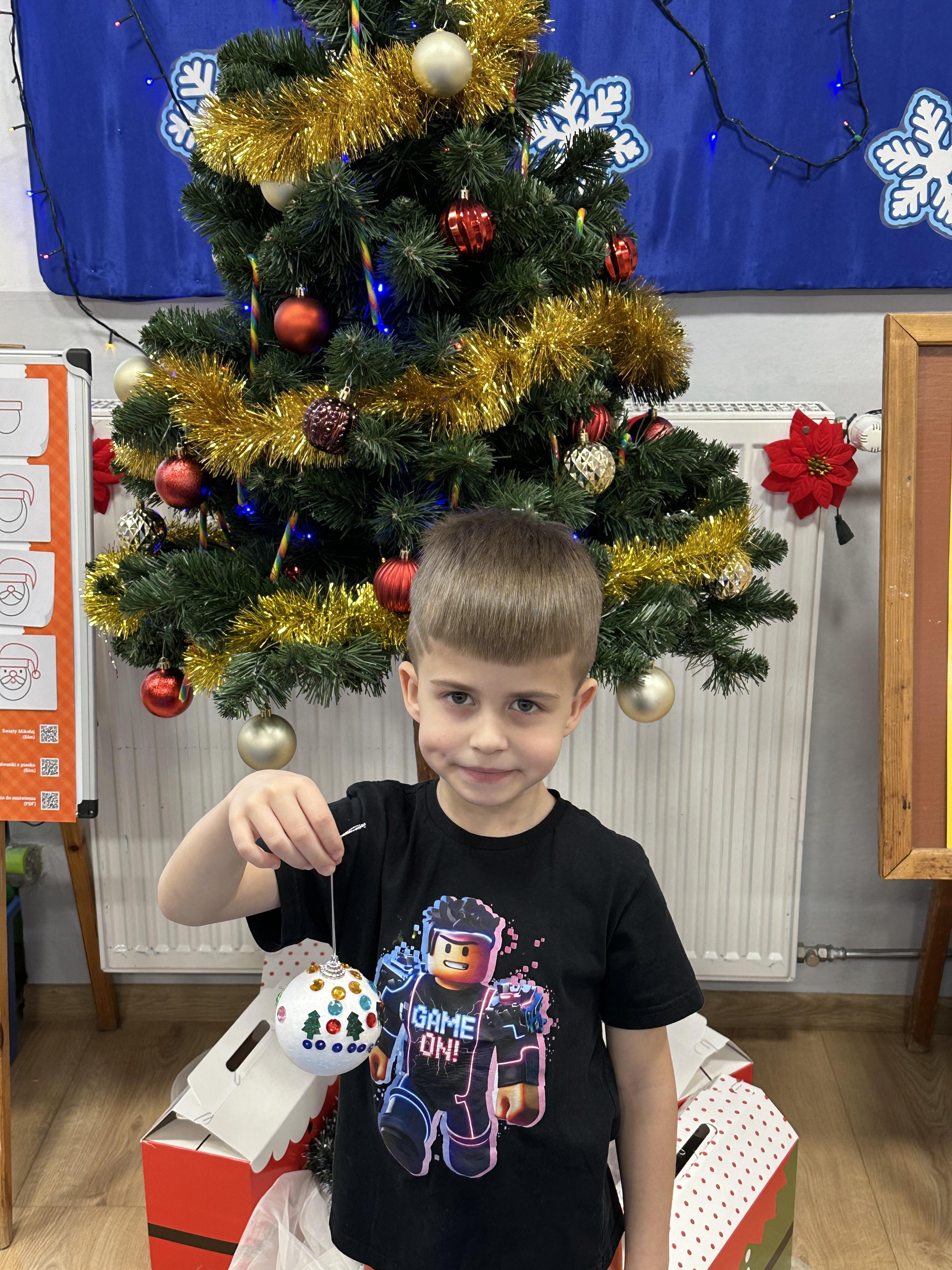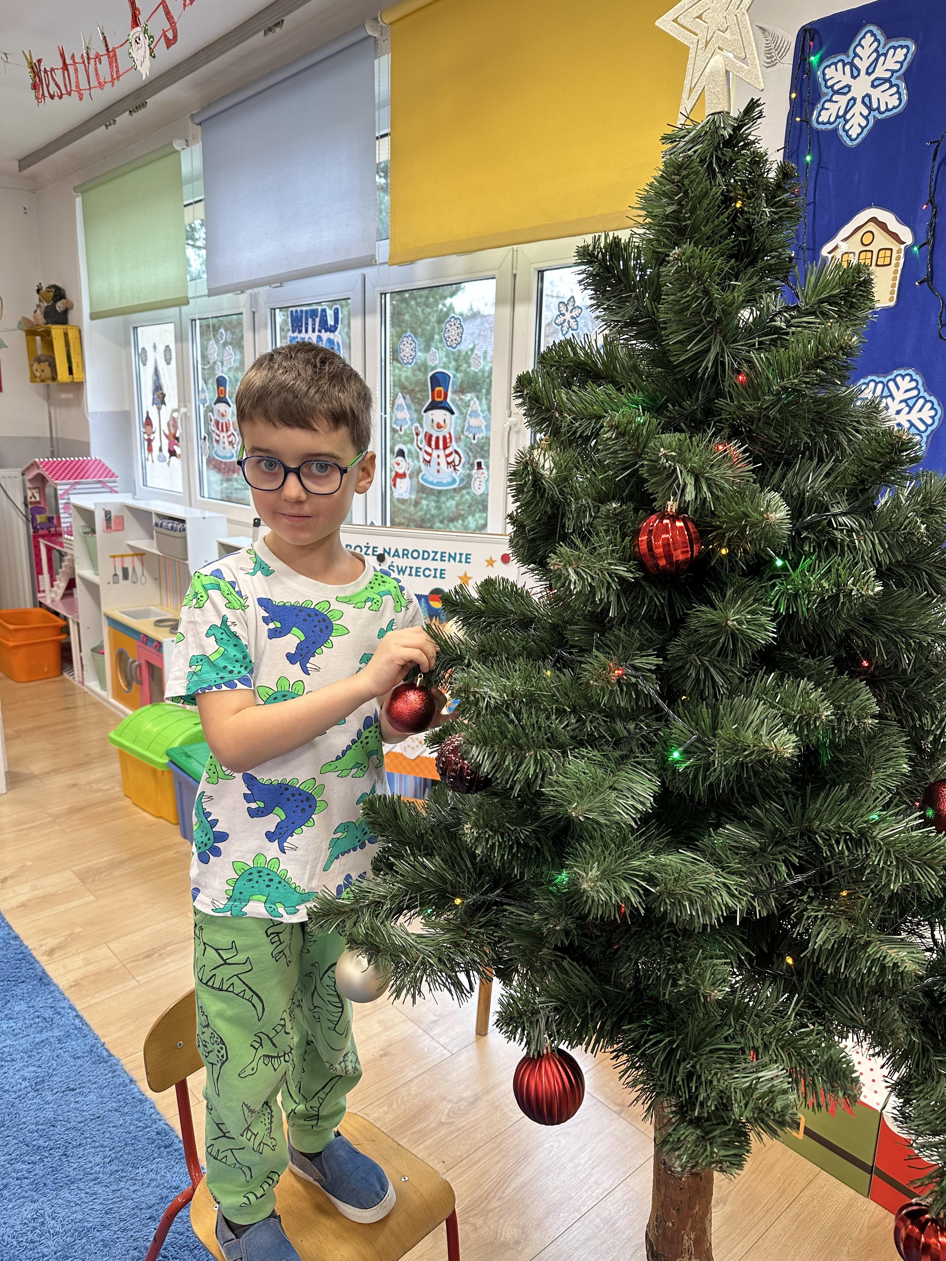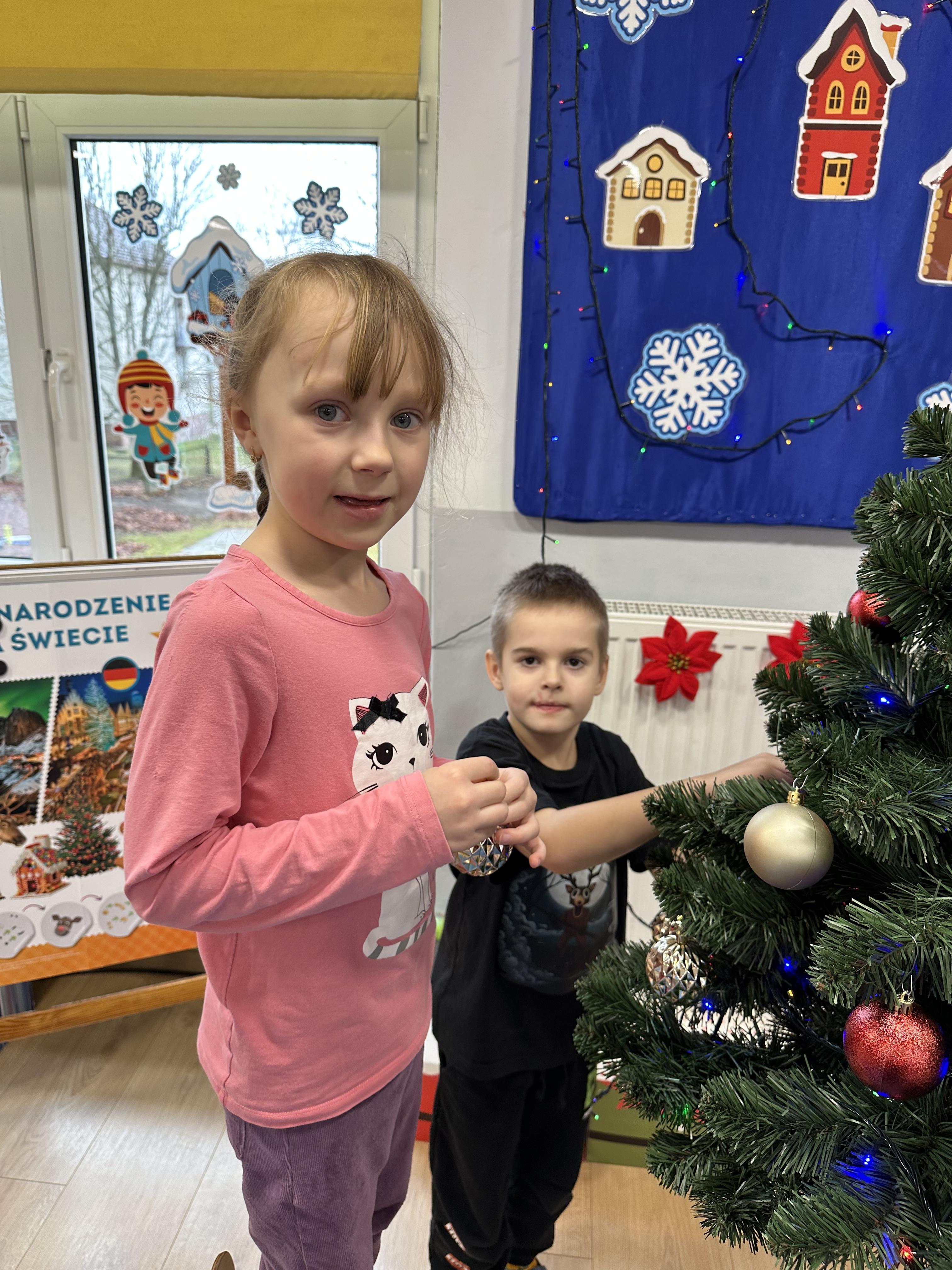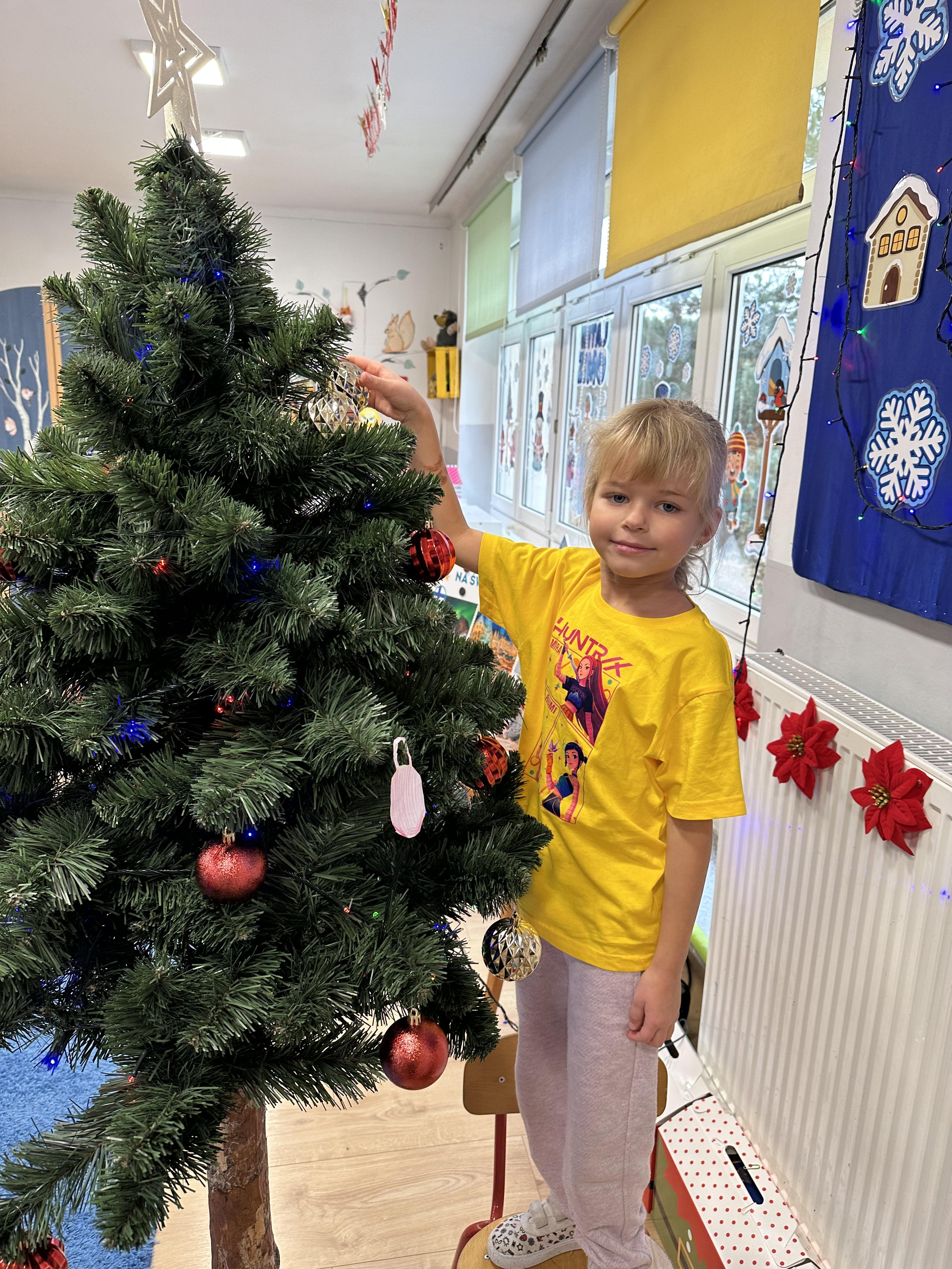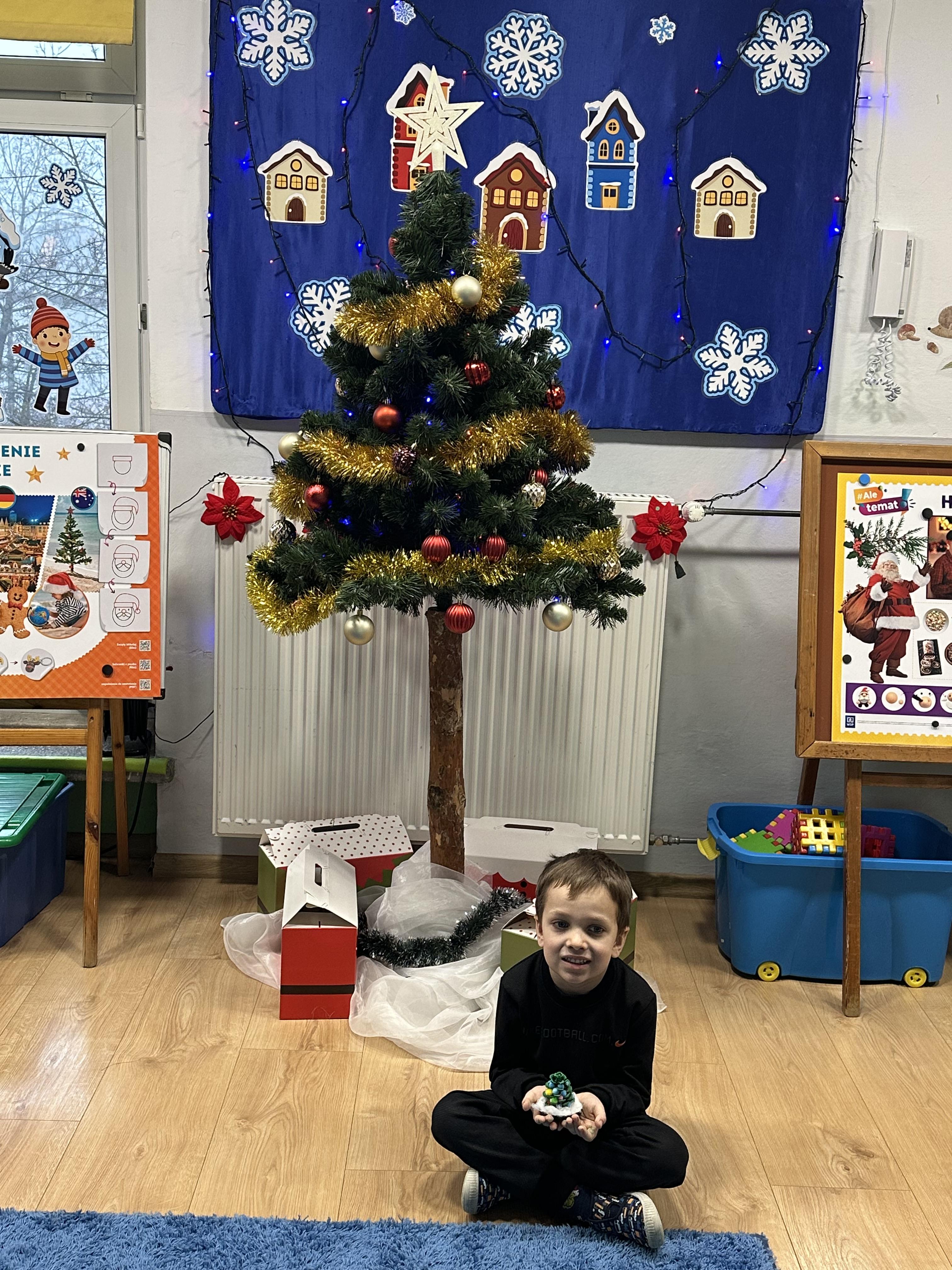 W poniedziałek przedszkolaki wysłuchały opowiadania Marii Pawlisz ,,Idą święta”, po którym miały możliwość wypowiedzieć się, czy lubią spędzać z rodziną święta bożenarodzeniowe. Następnie wspólnie doszły do wniosku, że w każdej rodzinie spędzanie świąt może się różnić i nie ma w tym nic złego. Podczas zajęć dydaktycznych sześciolatki naśladowały czynności wykonywane podczas przygotowań świątecznych. Brały udział w ruchowych zabawach tematycznych, podczas których uczyły się współpracy i integrowały się. Na dworze ćwiczyły mięśnie nóg, skacząc, jak najdalej potrafią. Po powrocie do przedszkola wspólnie wykonywały ćwiczenia gimnastyczne uruchamiające duże grupy mięśniowe, kształtujące prawidłową postawę ciała i orientację w przestrzeni. W trakcie zabawy „Elementy tradycji bożonarodzeniowej” rozpoznawały elementy tradycji świątecznej. Wtorek był poświęcony kształtowaniu umiejętności rozumienia treści życzeń i ich składania. Przedszkolaki wysłuchały piosenkę ,,Srebrne kolczyki”, która stanowiła wprowadzenie do rozmowy o dekoracjach świątecznych na choinkę. Zapoznały się z kolędą ,,Dzisiaj w Betlejem” i wyjaśniały, o kim w niej mowa. Podczas wspólnej pogadanki dzieci rozmawiały o okolicznościach składania życzeń, zastanawiały się, czego można życzyć najbliższej osobie, przybierały wybrane role i uczyły się poprawnego składania życzeń z wykorzystaniem sformułowań podanych przez nauczyciela. W czasie indywidualnej pracy przy stolikach przedszkolaki utrwalały swoje umiejętności językowe. Na dworze wspólnie szukały oznak świąt (ubranych choinek, ozdobnych lampek i innych dekoracji na domach, latarniach, w witrynach sklepów). Tego dnia nie zabrakło również zabawy językowej „Jaka głoska, jaka litera, jaka sylaba?”, w czasie, której dzieci wykorzystały zdobytą wcześniej wiedzę. Rozwijały również małą motorykę podczas rysowania, lepienia, malowania i klejenia. Środa była przeznaczona na rozwijanie umiejętności przeliczania oraz zdolności logicznego myślenia. Sześciolatki uczyły się prawidłowego nakrywania stołu i ćwiczyły pamięć wzrokową. Wysłuchały wiersza ,,Szkoda” i omówiły wspólnie jego treść, zwracając uwagę na rymy. Dzieci brały udział w zabawach językowych, orientacyjno-porządkowych, matematycznych oraz ruchowych z elementami rzutu. W czwartek brały udział w zabawie „Iglaste czy liściaste”, rozpoznawały gatunki drzew i dostrzegały różnicę pomiędzy drzewami iglastymi a liściastymi, rozbudzały również ciekawość przyrodniczą. Podczas zajęć edukacyjnych dzieci układały rytm z figur geometrycznych i według kolorów, pokonywały ścieżkę slalomem, słuchały i zgadywały piosenki. Na spacerze kształtowały umiejętność uważnego obserwowania przyrody i otoczenia, zwracały uwagę na drzewa iglaste i liściaste oraz klasyfikowały, które z nich jest większe, a które mniejsze. Dzień zakończyły pracą rysunkową z wykorzystaniem różnych technik i materiałów plastycznych. W piątek dzieci utrwalały słowa piosenki i bawiły się w grupie. Wspólnie rozwiązywały świąteczne zagadki, eksperymentowały z rodzajami ozdób oraz rozwijały wyobraźnię i kreatywność.