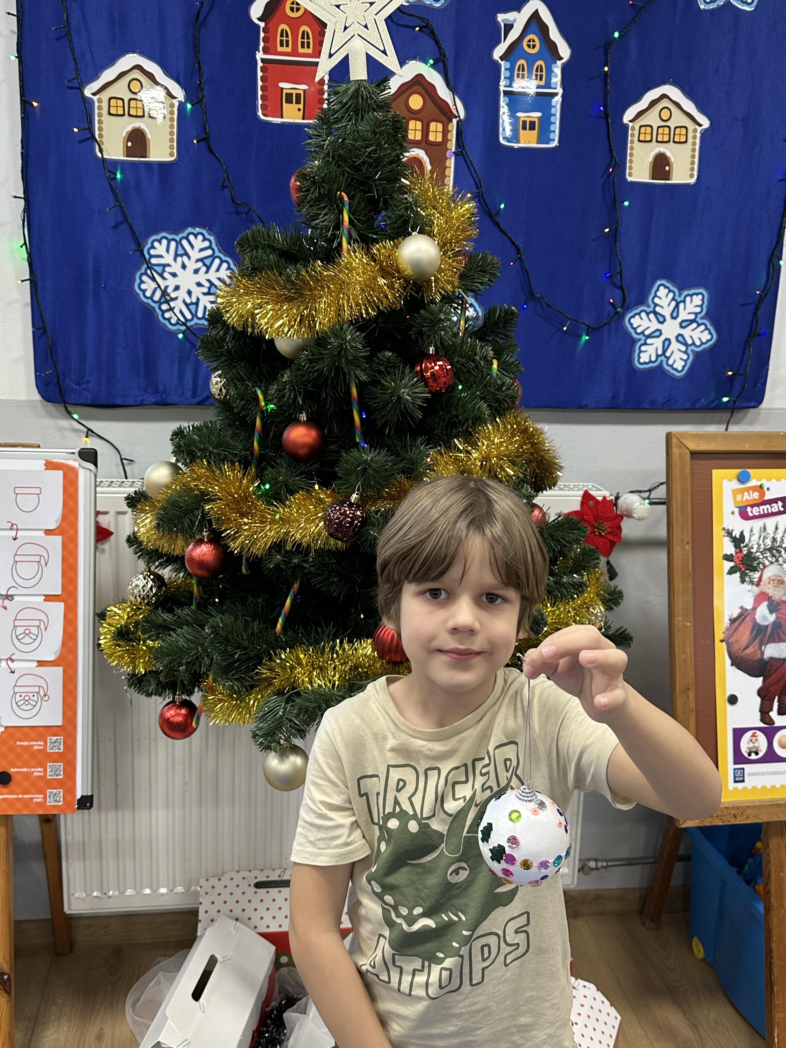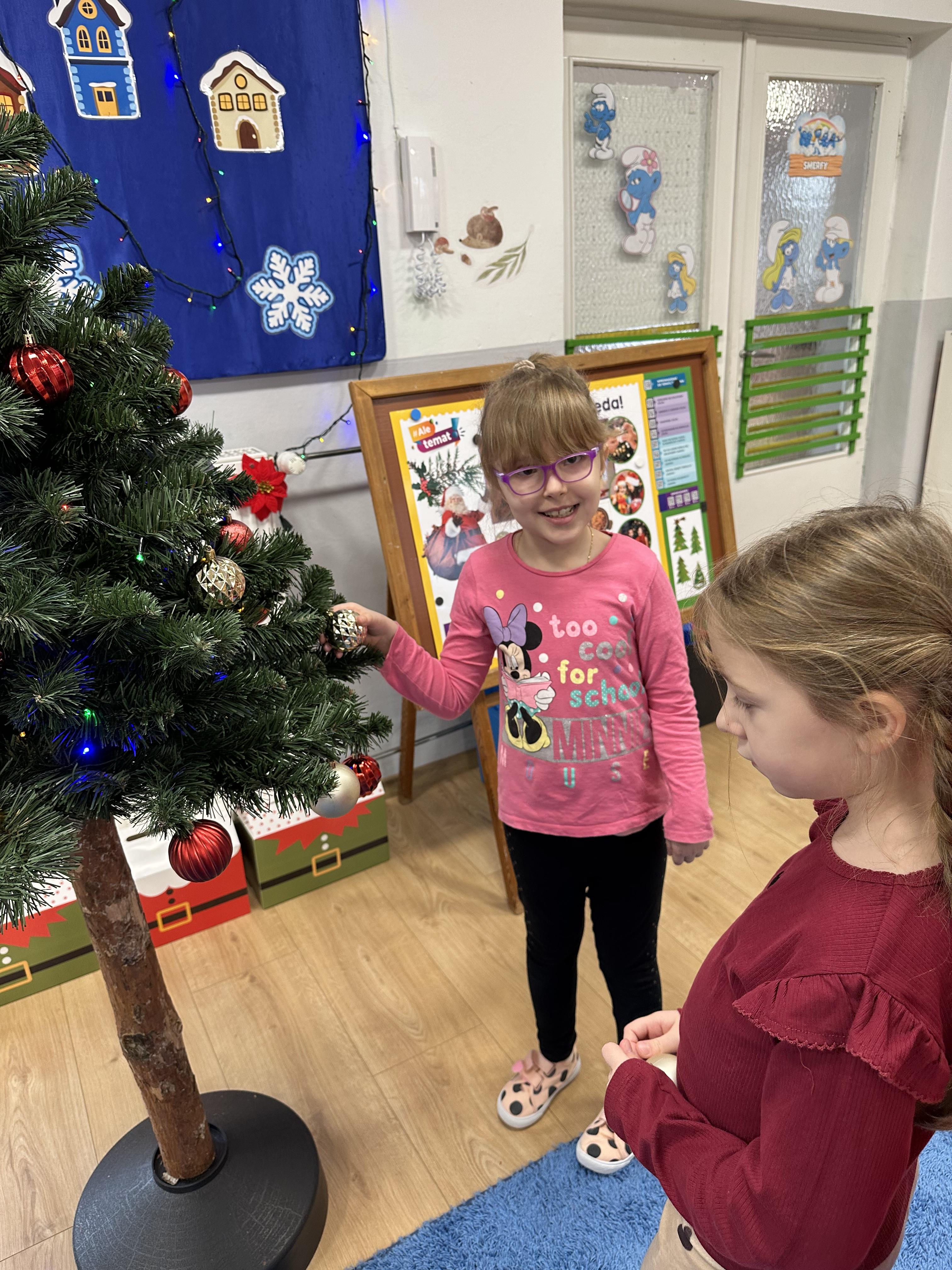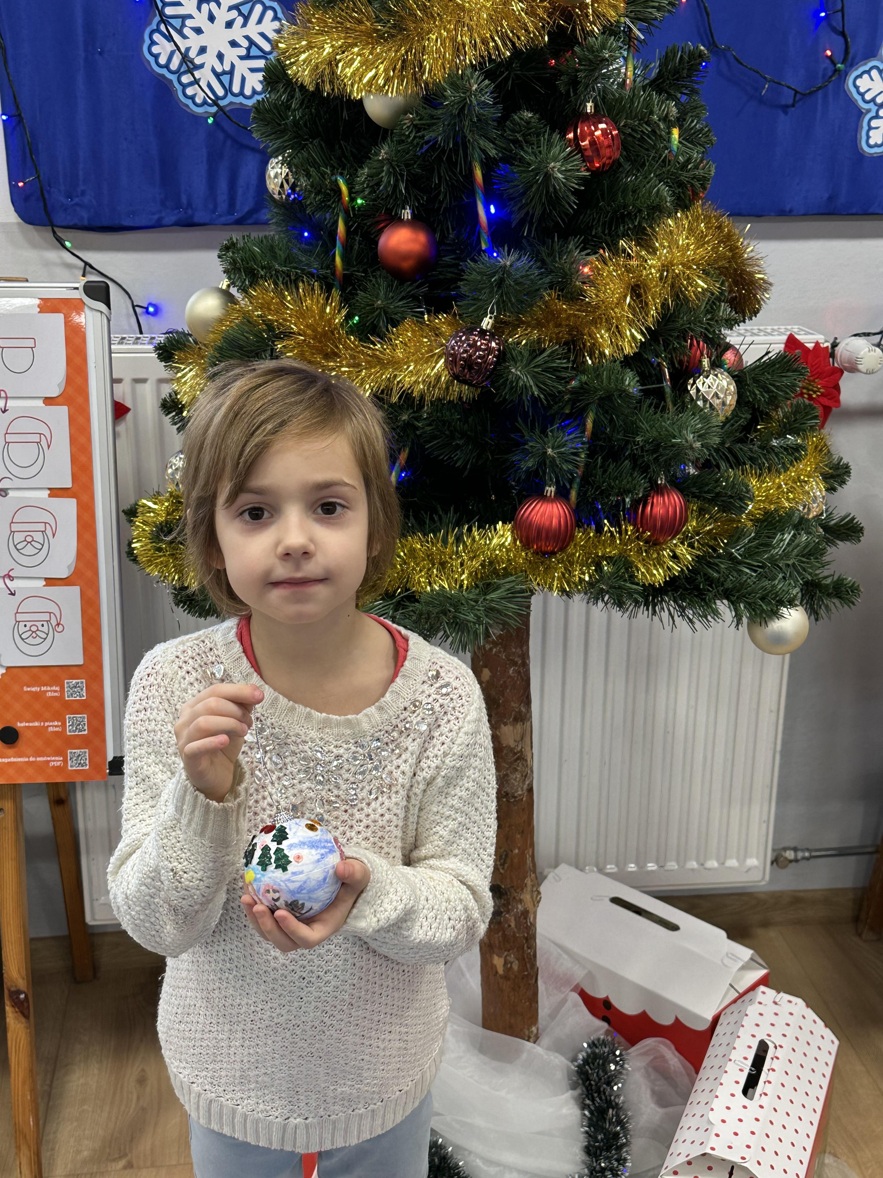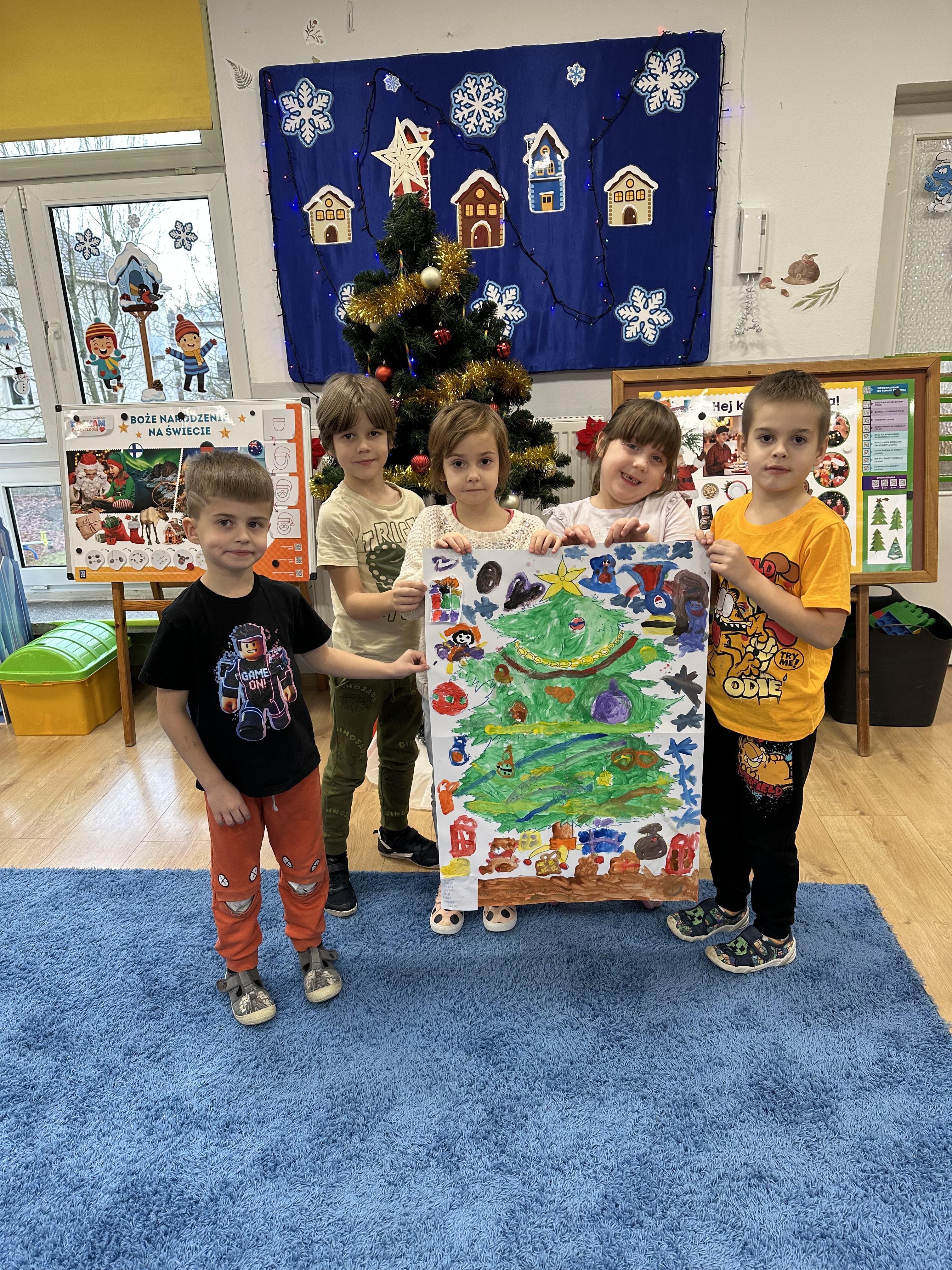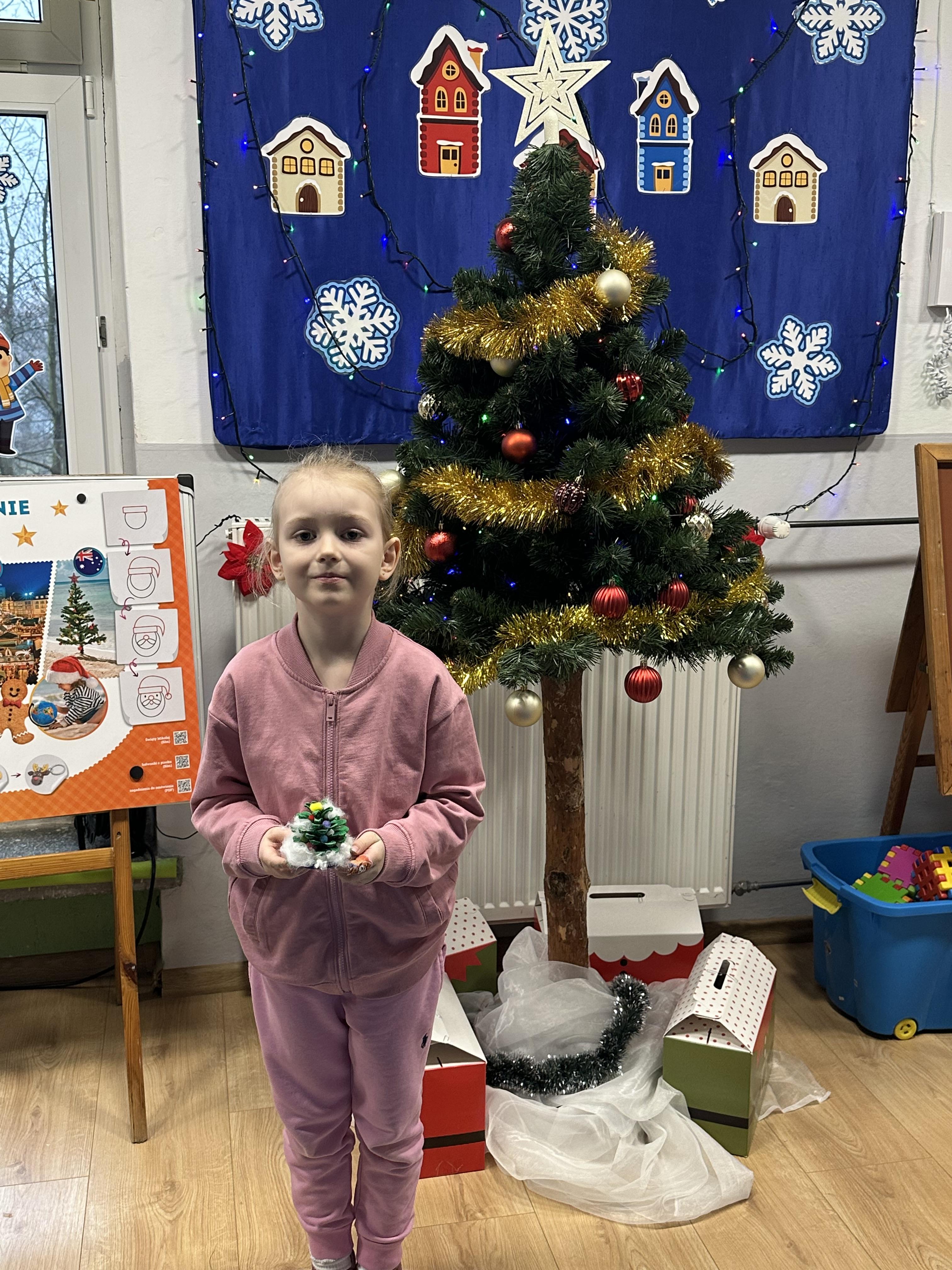 W poniedziałek przedszkolaki wysłuchały opowiadania Marii Pawlisz ,,Idą święta”, po którym miały możliwość wypowiedzieć się, czy lubią spędzać z rodziną święta bożenarodzeniowe. Następnie wspólnie doszły do wniosku, że w każdej rodzinie spędzanie świąt może się różnić i nie ma w tym nic złego. Podczas zajęć dydaktycznych sześciolatki naśladowały czynności wykonywane podczas przygotowań świątecznych. Brały udział w ruchowych zabawach tematycznych, podczas których uczyły się współpracy i integrowały się. Na dworze ćwiczyły mięśnie nóg, skacząc, jak najdalej potrafią. Po powrocie do przedszkola wspólnie wykonywały ćwiczenia gimnastyczne uruchamiające duże grupy mięśniowe, kształtujące prawidłową postawę ciała i orientację w przestrzeni. W trakcie zabawy „Elementy tradycji bożonarodzeniowej” rozpoznawały elementy tradycji świątecznej. Wtorek był poświęcony kształtowaniu umiejętności rozumienia treści życzeń i ich składania. Przedszkolaki wysłuchały piosenkę ,,Srebrne kolczyki”, która stanowiła wprowadzenie do rozmowy o dekoracjach świątecznych na choinkę. Zapoznały się z kolędą ,,Dzisiaj w Betlejem” i wyjaśniały, o kim w niej mowa. Podczas wspólnej pogadanki dzieci rozmawiały o okolicznościach składania życzeń, zastanawiały się, czego można życzyć najbliższej osobie, przybierały wybrane role i uczyły się poprawnego składania życzeń z wykorzystaniem sformułowań podanych przez nauczyciela. W czasie indywidualnej pracy przy stolikach przedszkolaki utrwalały swoje umiejętności językowe. Na dworze wspólnie szukały oznak świąt (ubranych choinek, ozdobnych lampek i innych dekoracji na domach, latarniach, w witrynach sklepów). Tego dnia nie zabrakło również zabawy językowej „Jaka głoska, jaka litera, jaka sylaba?”, w czasie, której dzieci wykorzystały zdobytą wcześniej wiedzę. Rozwijały również małą motorykę podczas rysowania, lepienia, malowania i klejenia. Środa była przeznaczona na rozwijanie umiejętności przeliczania oraz zdolności logicznego myślenia. Sześciolatki uczyły się prawidłowego nakrywania stołu i ćwiczyły pamięć wzrokową. Wysłuchały wiersza ,,Szkoda” i omówiły wspólnie jego treść, zwracając uwagę na rymy. Dzieci brały udział w zabawach językowych, orientacyjno-porządkowych, matematycznych oraz ruchowych z elementami rzutu. W czwartek brały udział w zabawie „Iglaste czy liściaste”, rozpoznawały gatunki drzew i dostrzegały różnicę pomiędzy drzewami iglastymi a liściastymi, rozbudzały również ciekawość przyrodniczą. Podczas zajęć edukacyjnych dzieci układały rytm z figur geometrycznych i według kolorów, pokonywały ścieżkę slalomem, słuchały i zgadywały piosenki. Na spacerze kształtowały umiejętność uważnego obserwowania przyrody i otoczenia, zwracały uwagę na drzewa iglaste i liściaste oraz klasyfikowały, które z nich jest większe, a które mniejsze. Dzień zakończyły pracą rysunkową z wykorzystaniem różnych technik i materiałów plastycznych. W piątek dzieci utrwalały słowa piosenki i bawiły się w grupie. Wspólnie rozwiązywały świąteczne zagadki, eksperymentowały z rodzajami ozdób oraz rozwijały wyobraźnię i kreatywność.
