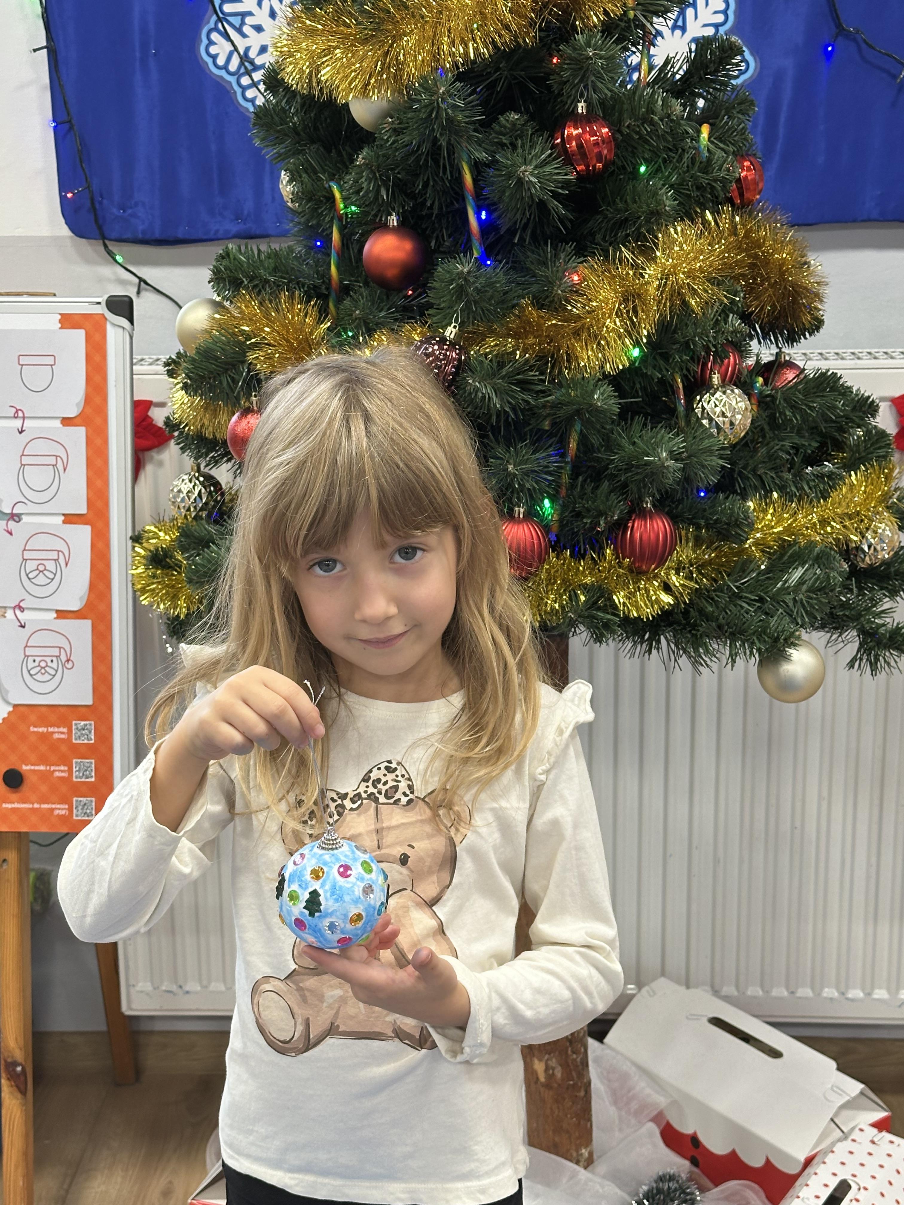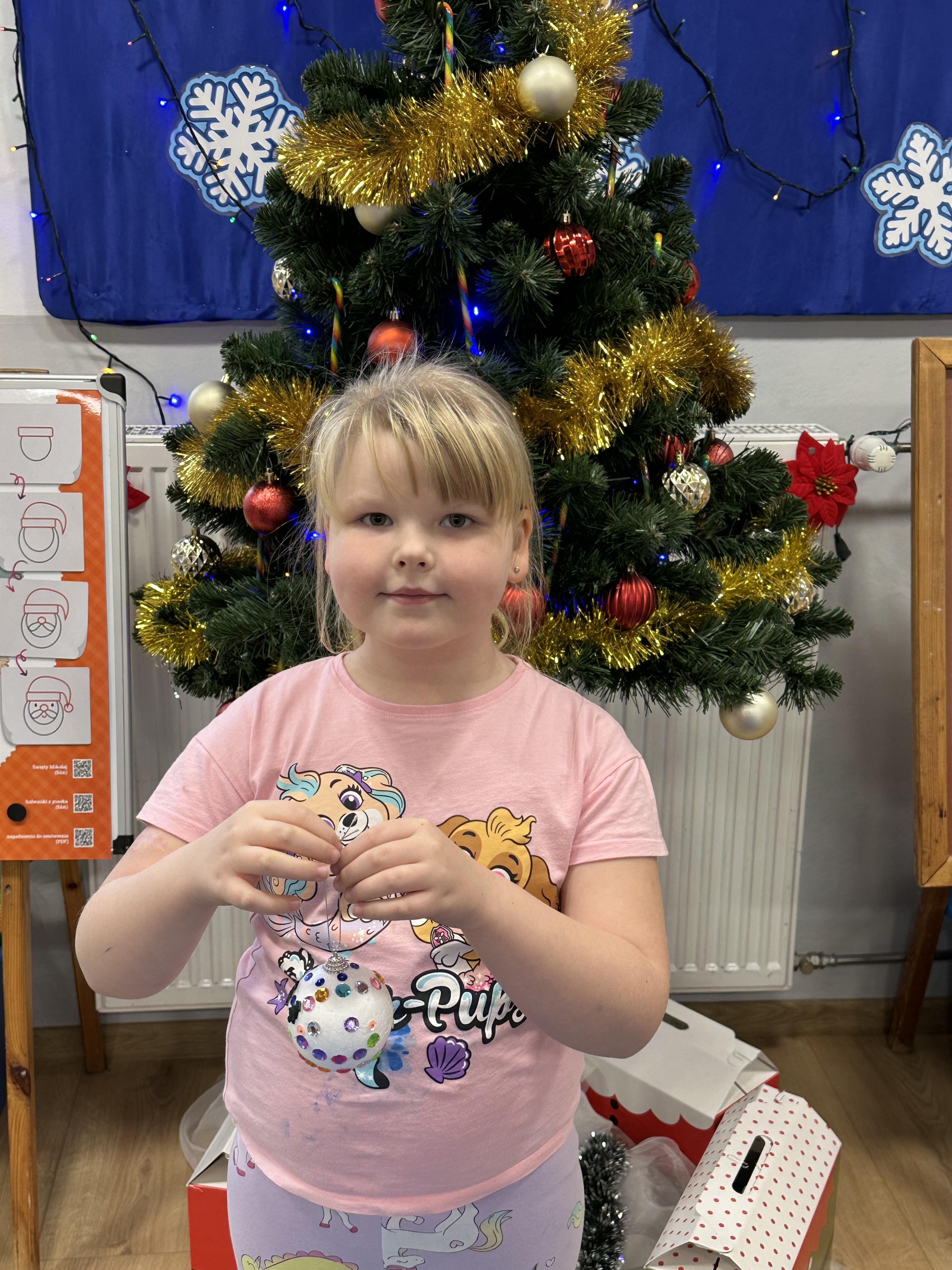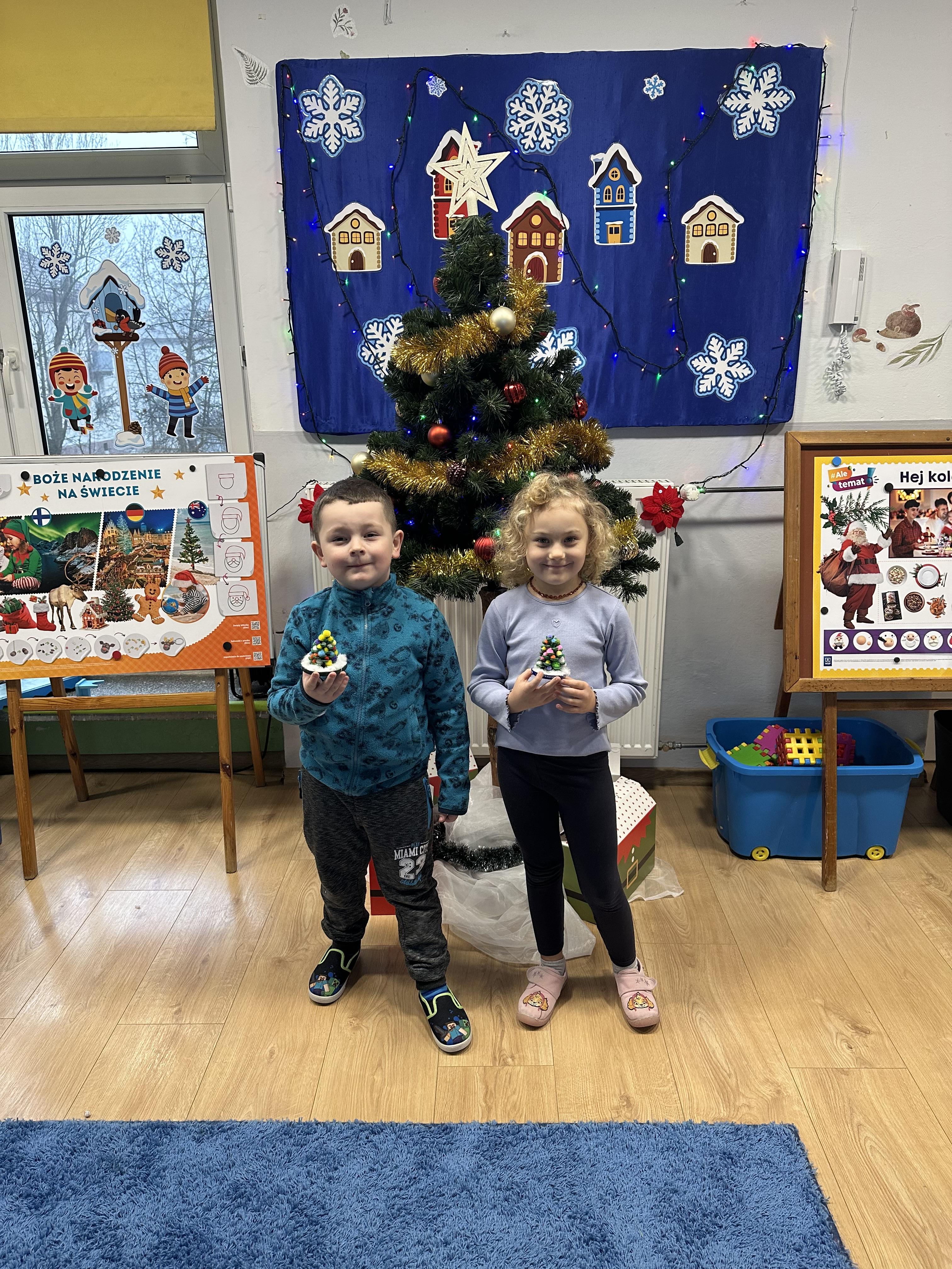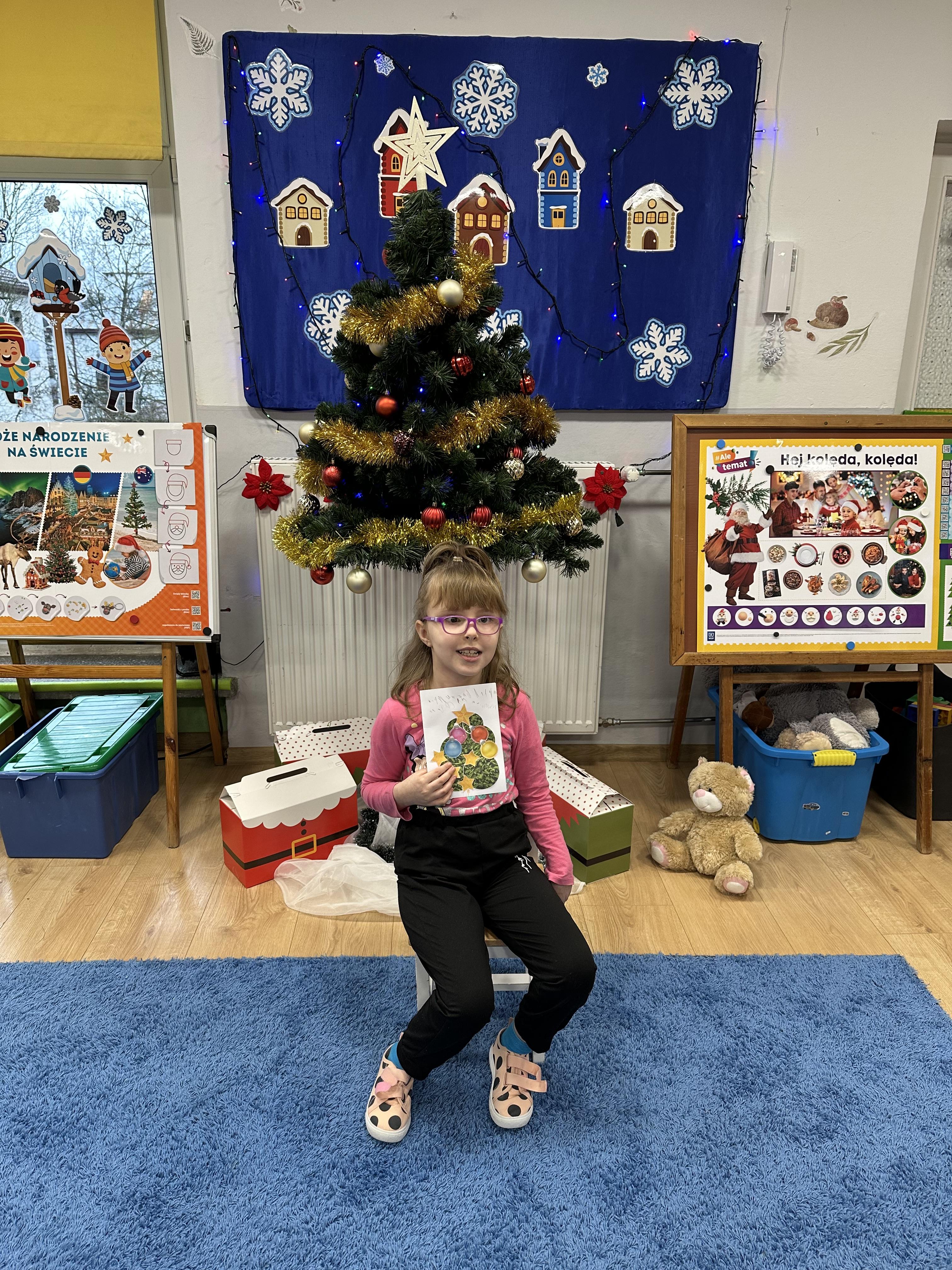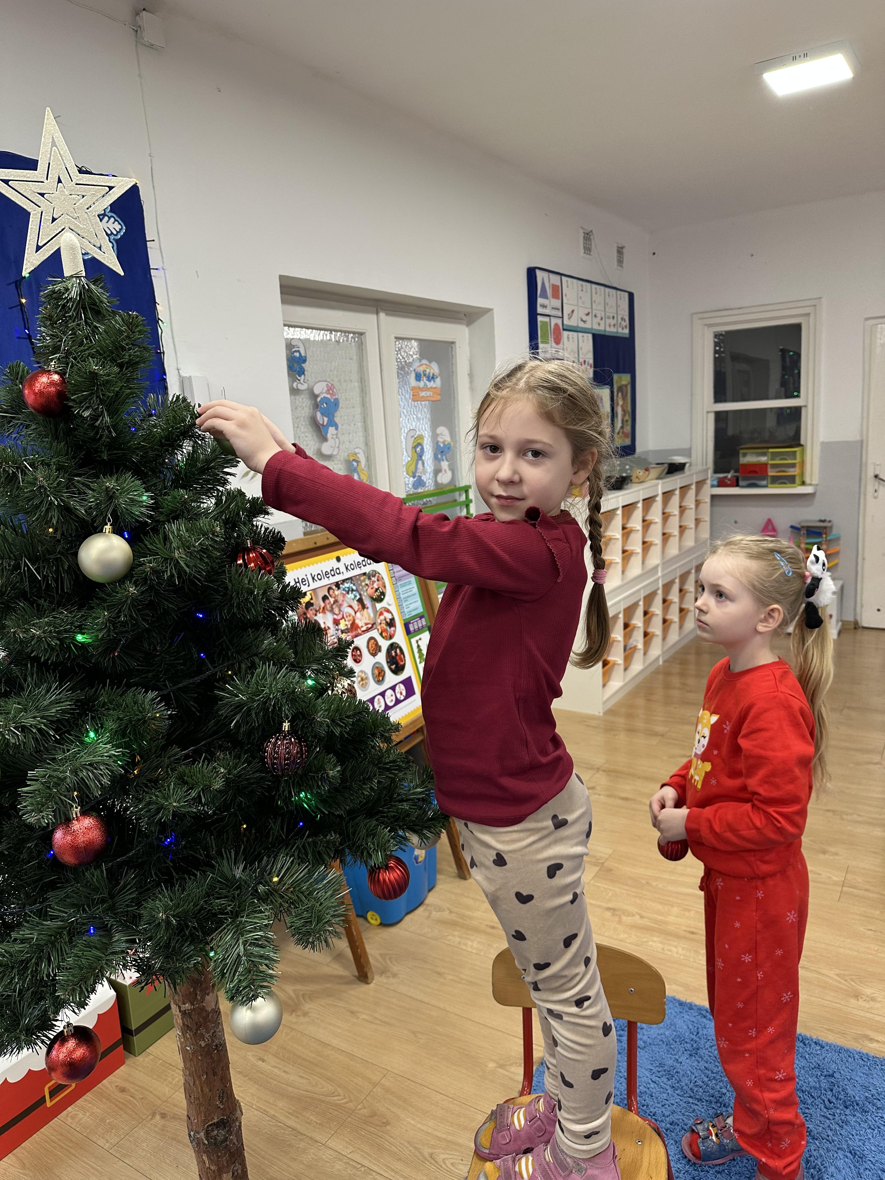 W poniedziałek przedszkolaki wysłuchały opowiadania Marii Pawlisz ,,Idą święta”, po którym miały możliwość wypowiedzieć się, czy lubią spędzać z rodziną święta bożenarodzeniowe. Następnie wspólnie doszły do wniosku, że w każdej rodzinie spędzanie świąt może się różnić i nie ma w tym nic złego. Podczas zajęć dydaktycznych sześciolatki naśladowały czynności wykonywane podczas przygotowań świątecznych. Brały udział w ruchowych zabawach tematycznych, podczas których uczyły się współpracy i integrowały się. Na dworze ćwiczyły mięśnie nóg, skacząc, jak najdalej potrafią. Po powrocie do przedszkola wspólnie wykonywały ćwiczenia gimnastyczne uruchamiające duże grupy mięśniowe, kształtujące prawidłową postawę ciała i orientację w przestrzeni. W trakcie zabawy „Elementy tradycji bożonarodzeniowej” rozpoznawały elementy tradycji świątecznej. Wtorek był poświęcony kształtowaniu umiejętności rozumienia treści życzeń i ich składania. Przedszkolaki wysłuchały piosenkę ,,Srebrne kolczyki”, która stanowiła wprowadzenie do rozmowy o dekoracjach świątecznych na choinkę. Zapoznały się z kolędą ,,Dzisiaj w Betlejem” i wyjaśniały, o kim w niej mowa. Podczas wspólnej pogadanki dzieci rozmawiały o okolicznościach składania życzeń, zastanawiały się, czego można życzyć najbliższej osobie, przybierały wybrane role i uczyły się poprawnego składania życzeń z wykorzystaniem sformułowań podanych przez nauczyciela. W czasie indywidualnej pracy przy stolikach przedszkolaki utrwalały swoje umiejętności językowe. Na dworze wspólnie szukały oznak świąt (ubranych choinek, ozdobnych lampek i innych dekoracji na domach, latarniach, w witrynach sklepów). Tego dnia nie zabrakło również zabawy językowej „Jaka głoska, jaka litera, jaka sylaba?”, w czasie, której dzieci wykorzystały zdobytą wcześniej wiedzę. Rozwijały również małą motorykę podczas rysowania, lepienia, malowania i klejenia. Środa była przeznaczona na rozwijanie umiejętności przeliczania oraz zdolności logicznego myślenia. Sześciolatki uczyły się prawidłowego nakrywania stołu i ćwiczyły pamięć wzrokową. Wysłuchały wiersza ,,Szkoda” i omówiły wspólnie jego treść, zwracając uwagę na rymy. Dzieci brały udział w zabawach językowych, orientacyjno-porządkowych, matematycznych oraz ruchowych z elementami rzutu. W czwartek brały udział w zabawie „Iglaste czy liściaste”, rozpoznawały gatunki drzew i dostrzegały różnicę pomiędzy drzewami iglastymi a liściastymi, rozbudzały również ciekawość przyrodniczą. Podczas zajęć edukacyjnych dzieci układały rytm z figur geometrycznych i według kolorów, pokonywały ścieżkę slalomem, słuchały i zgadywały piosenki. Na spacerze kształtowały umiejętność uważnego obserwowania przyrody i otoczenia, zwracały uwagę na drzewa iglaste i liściaste oraz klasyfikowały, które z nich jest większe, a które mniejsze. Dzień zakończyły pracą rysunkową z wykorzystaniem różnych technik i materiałów plastycznych. W piątek dzieci utrwalały słowa piosenki i bawiły się w grupie. Wspólnie rozwiązywały świąteczne zagadki, eksperymentowały z rodzajami ozdób oraz rozwijały wyobraźnię i kreatywność.