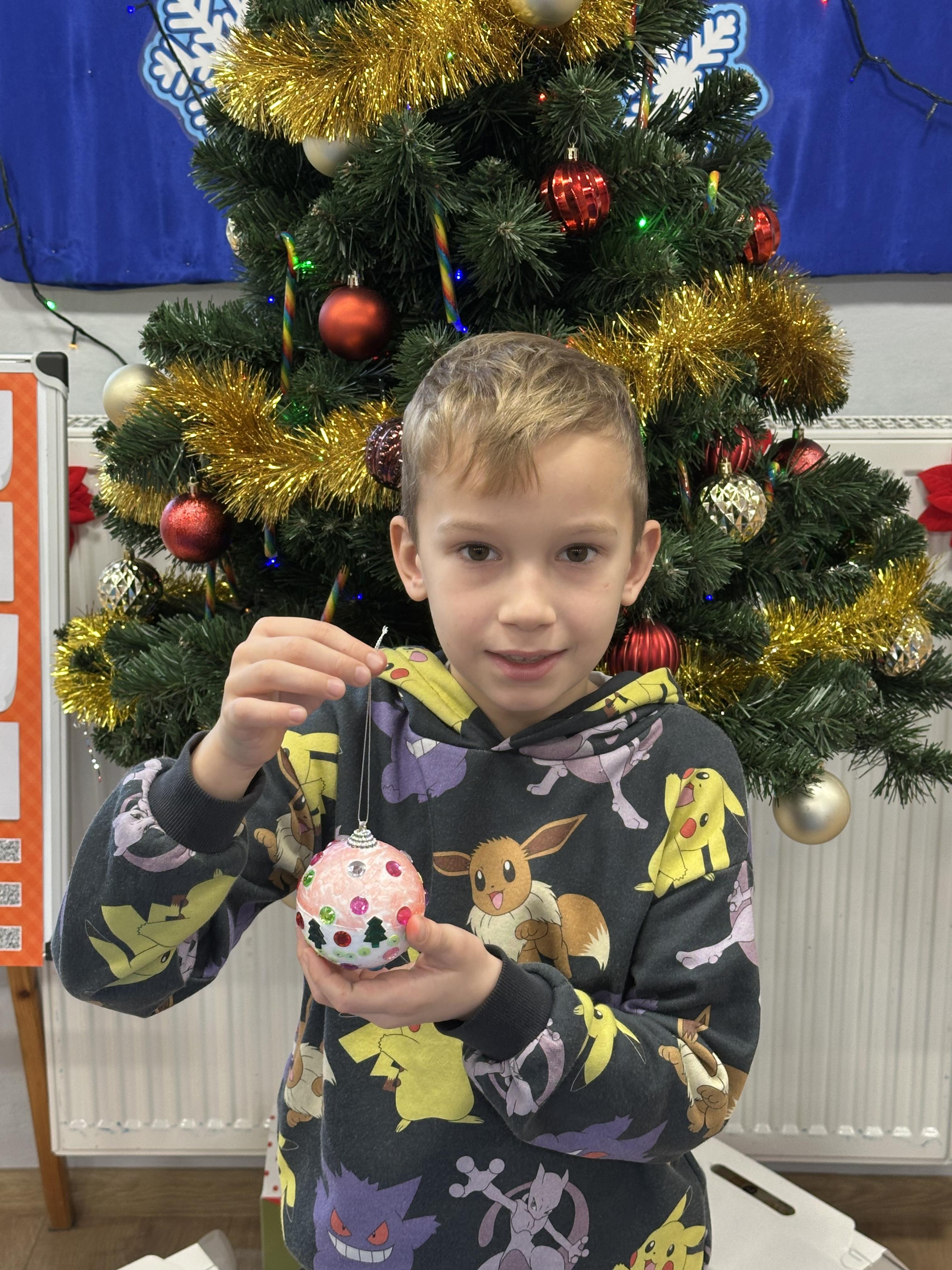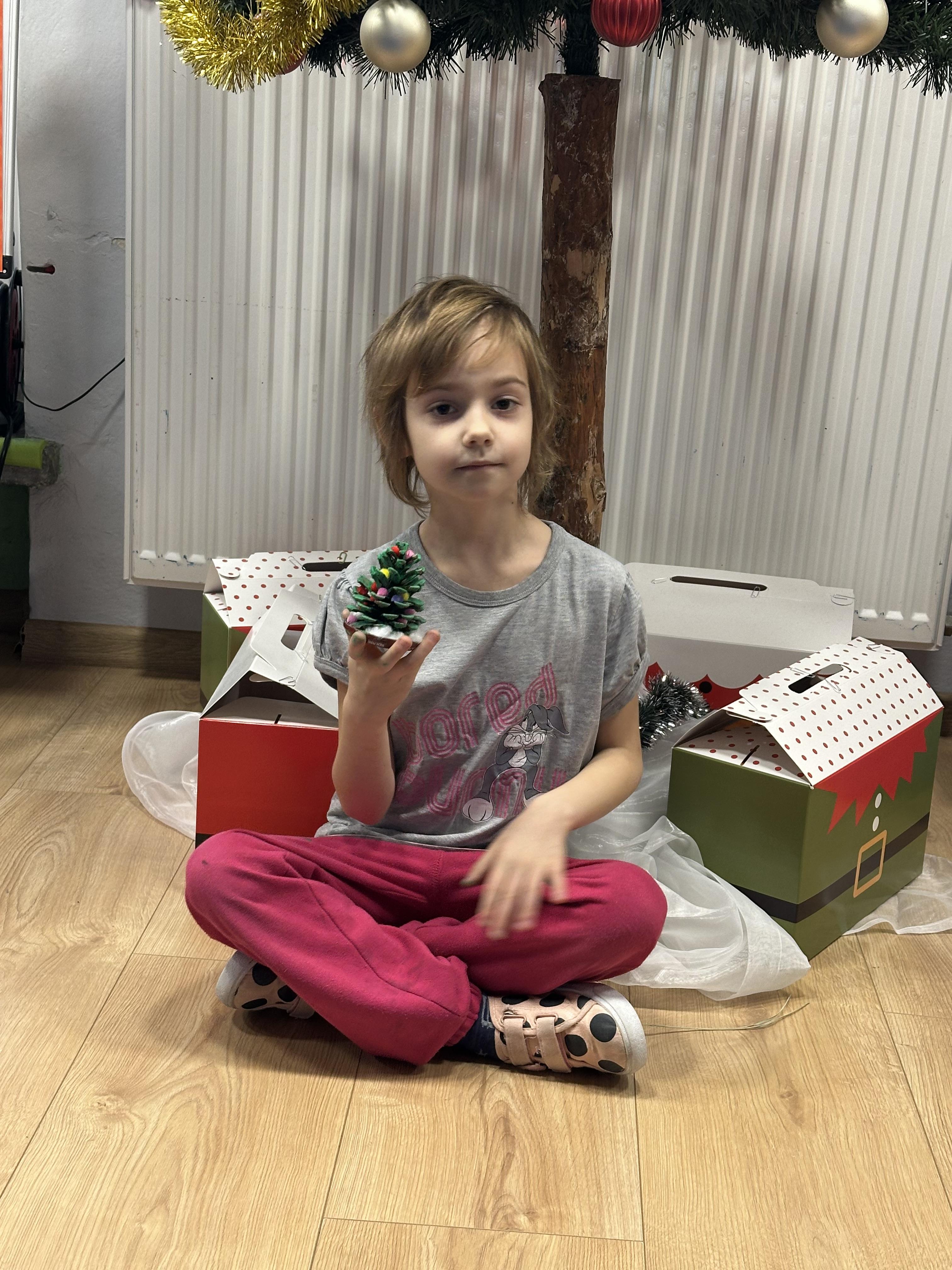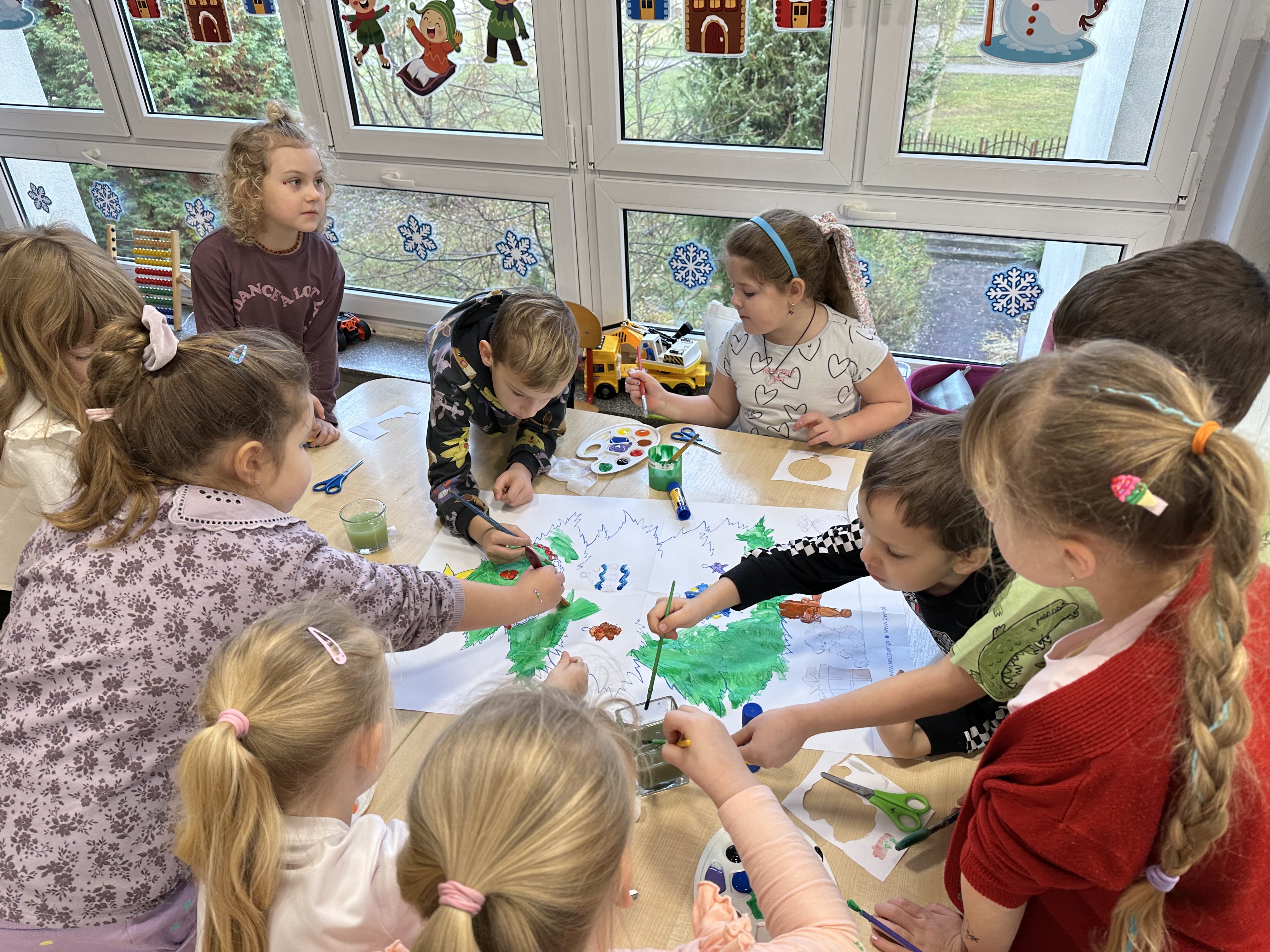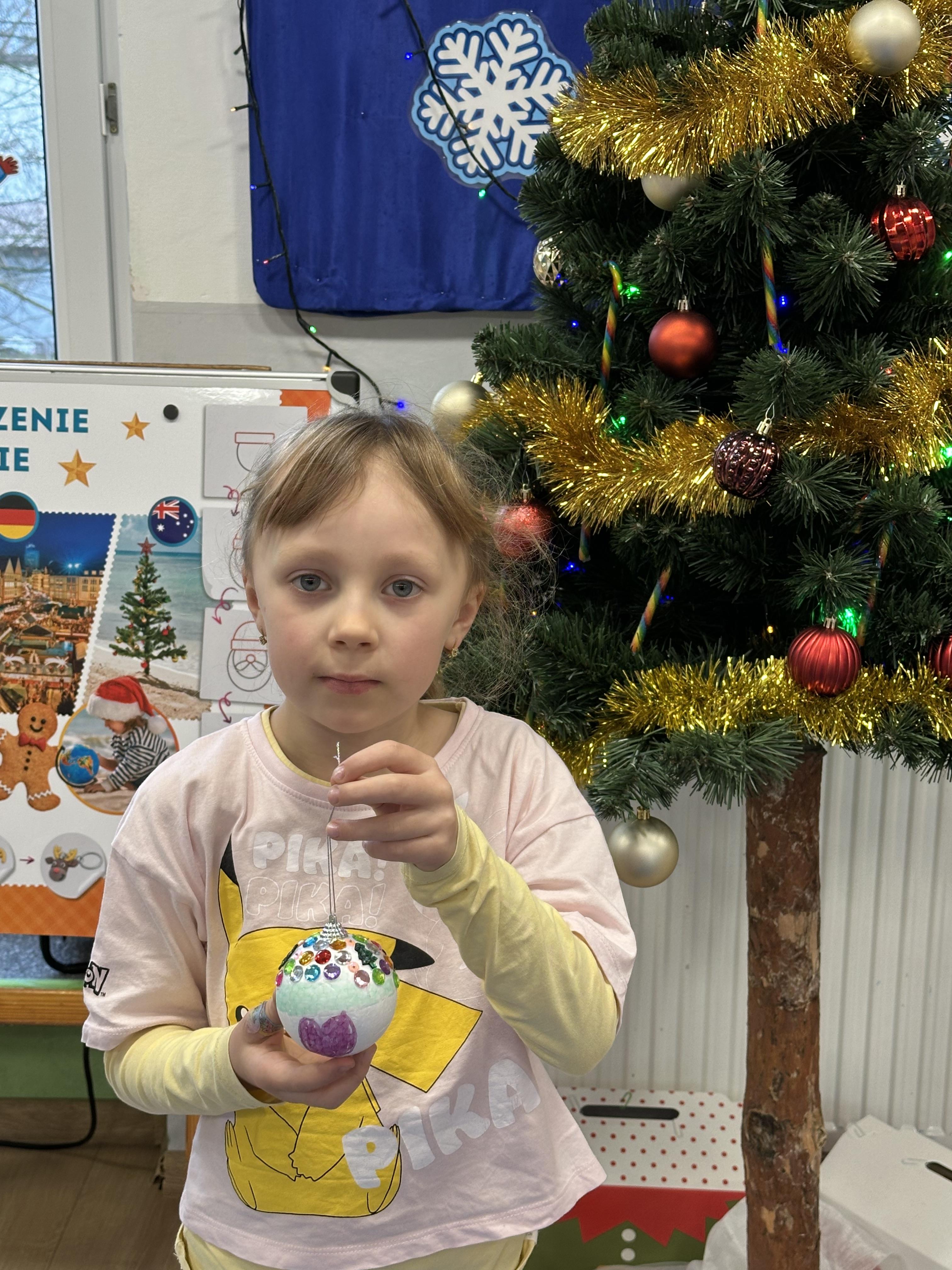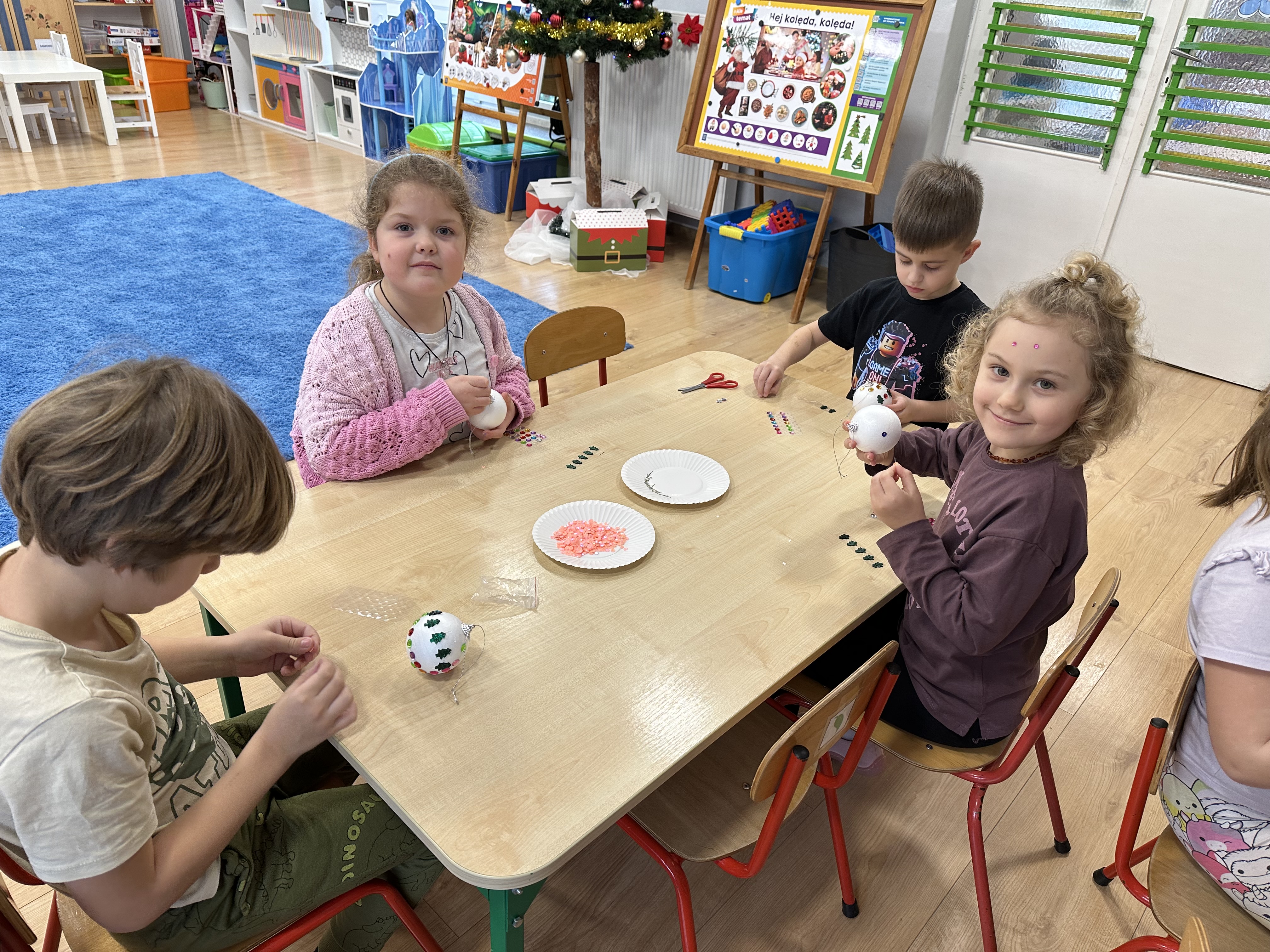 W poniedziałek przedszkolaki wysłuchały opowiadania Marii Pawlisz ,,Idą święta”, po którym miały możliwość wypowiedzieć się, czy lubią spędzać z rodziną święta bożenarodzeniowe. Następnie wspólnie doszły do wniosku, że w każdej rodzinie spędzanie świąt może się różnić i nie ma w tym nic złego. Podczas zajęć dydaktycznych sześciolatki naśladowały czynności wykonywane podczas przygotowań świątecznych. Brały udział w ruchowych zabawach tematycznych, podczas których uczyły się współpracy i integrowały się. Na dworze ćwiczyły mięśnie nóg, skacząc, jak najdalej potrafią. Po powrocie do przedszkola wspólnie wykonywały ćwiczenia gimnastyczne uruchamiające duże grupy mięśniowe, kształtujące prawidłową postawę ciała i orientację w przestrzeni. W trakcie zabawy „Elementy tradycji bożonarodzeniowej” rozpoznawały elementy tradycji świątecznej. Wtorek był poświęcony kształtowaniu umiejętności rozumienia treści życzeń i ich składania. Przedszkolaki wysłuchały piosenkę ,,Srebrne kolczyki”, która stanowiła wprowadzenie do rozmowy o dekoracjach świątecznych na choinkę. Zapoznały się z kolędą ,,Dzisiaj w Betlejem” i wyjaśniały, o kim w niej mowa. Podczas wspólnej pogadanki dzieci rozmawiały o okolicznościach składania życzeń, zastanawiały się, czego można życzyć najbliższej osobie, przybierały wybrane role i uczyły się poprawnego składania życzeń z wykorzystaniem sformułowań podanych przez nauczyciela. W czasie indywidualnej pracy przy stolikach przedszkolaki utrwalały swoje umiejętności językowe. Na dworze wspólnie szukały oznak świąt (ubranych choinek, ozdobnych lampek i innych dekoracji na domach, latarniach, w witrynach sklepów). Tego dnia nie zabrakło również zabawy językowej „Jaka głoska, jaka litera, jaka sylaba?”, w czasie, której dzieci wykorzystały zdobytą wcześniej wiedzę. Rozwijały również małą motorykę podczas rysowania, lepienia, malowania i klejenia. Środa była przeznaczona na rozwijanie umiejętności przeliczania oraz zdolności logicznego myślenia. Sześciolatki uczyły się prawidłowego nakrywania stołu i ćwiczyły pamięć wzrokową. Wysłuchały wiersza ,,Szkoda” i omówiły wspólnie jego treść, zwracając uwagę na rymy. Dzieci brały udział w zabawach językowych, orientacyjno-porządkowych, matematycznych oraz ruchowych z elementami rzutu. W czwartek brały udział w zabawie „Iglaste czy liściaste”, rozpoznawały gatunki drzew i dostrzegały różnicę pomiędzy drzewami iglastymi a liściastymi, rozbudzały również ciekawość przyrodniczą. Podczas zajęć edukacyjnych dzieci układały rytm z figur geometrycznych i według kolorów, pokonywały ścieżkę slalomem, słuchały i zgadywały piosenki. Na spacerze kształtowały umiejętność uważnego obserwowania przyrody i otoczenia, zwracały uwagę na drzewa iglaste i liściaste oraz klasyfikowały, które z nich jest większe, a które mniejsze. Dzień zakończyły pracą rysunkową z wykorzystaniem różnych technik i materiałów plastycznych. W piątek dzieci utrwalały słowa piosenki i bawiły się w grupie. Wspólnie rozwiązywały świąteczne zagadki, eksperymentowały z rodzajami ozdób oraz rozwijały wyobraźnię i kreatywność.