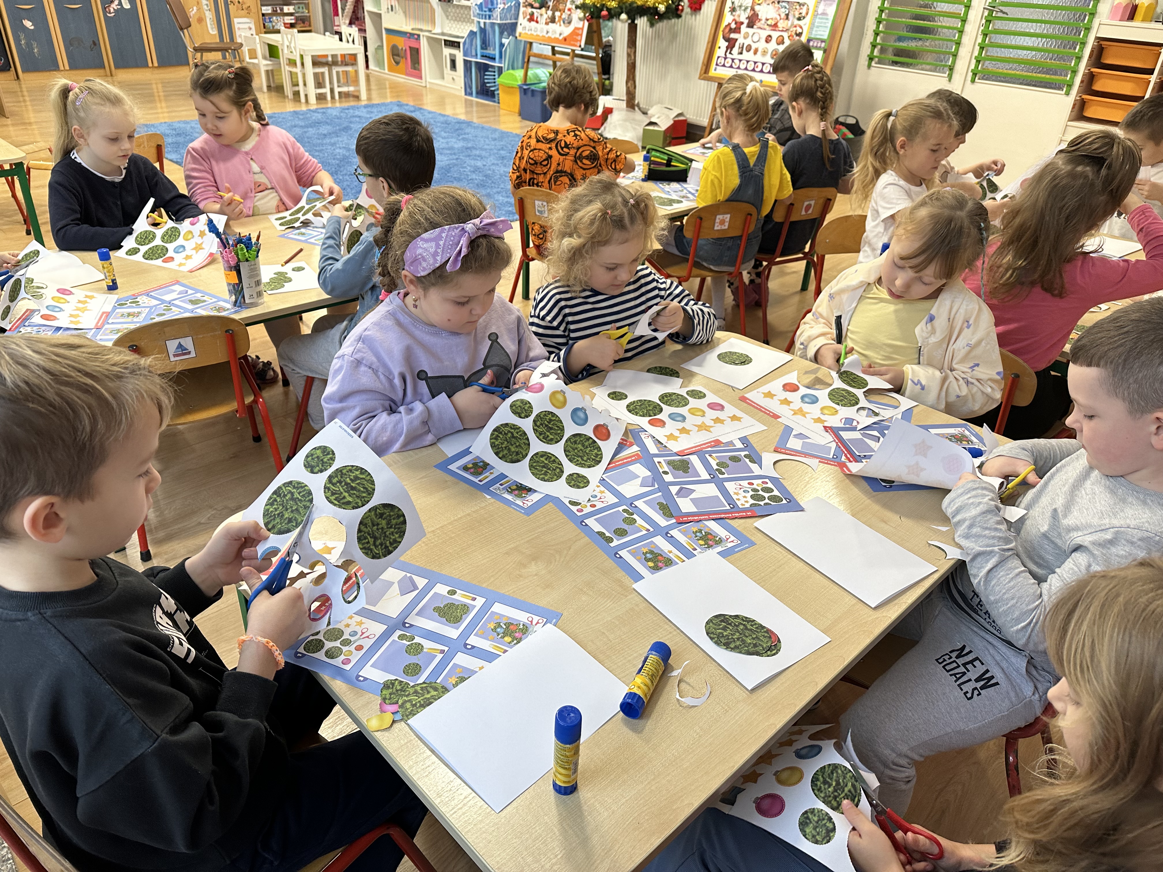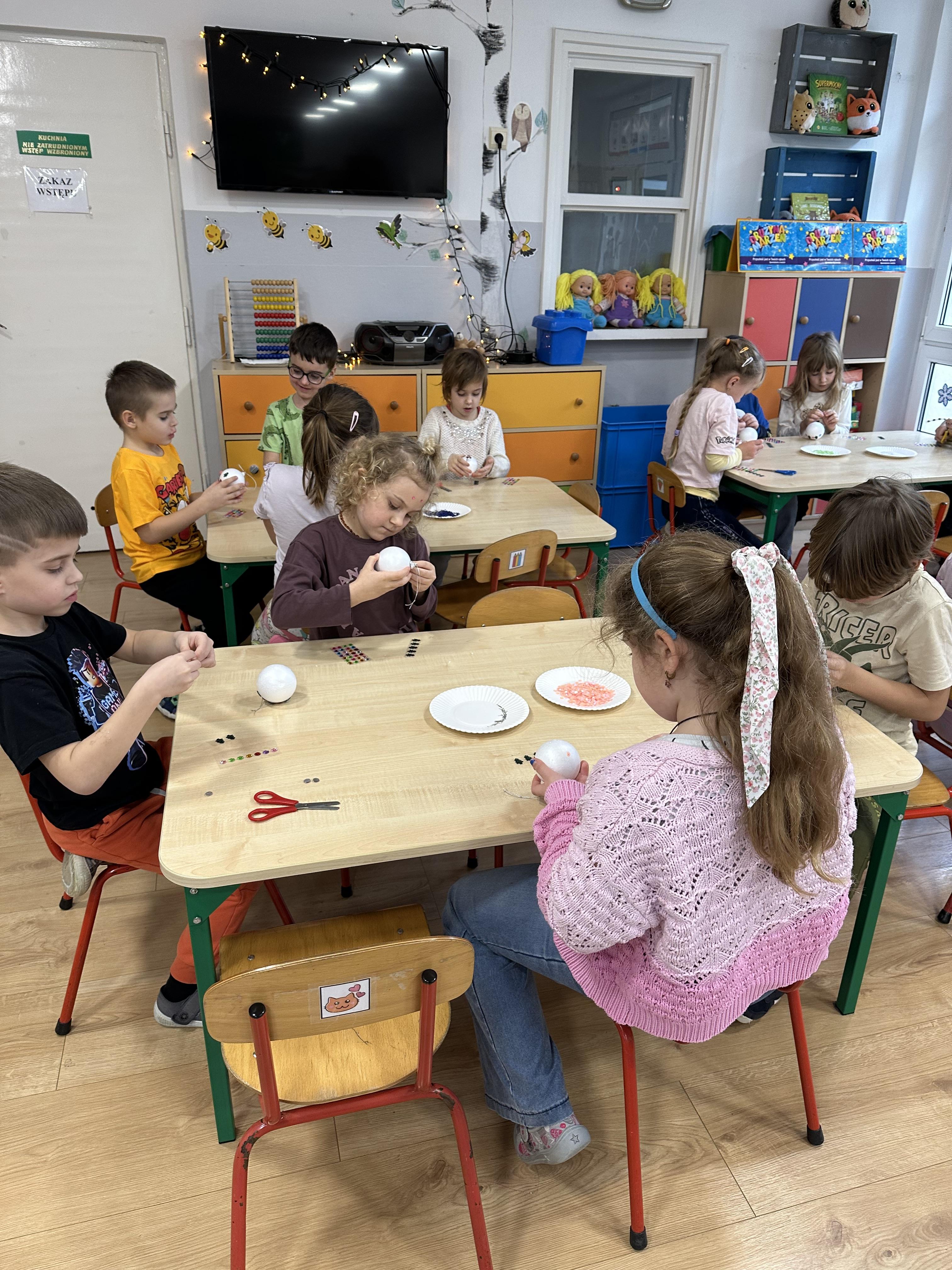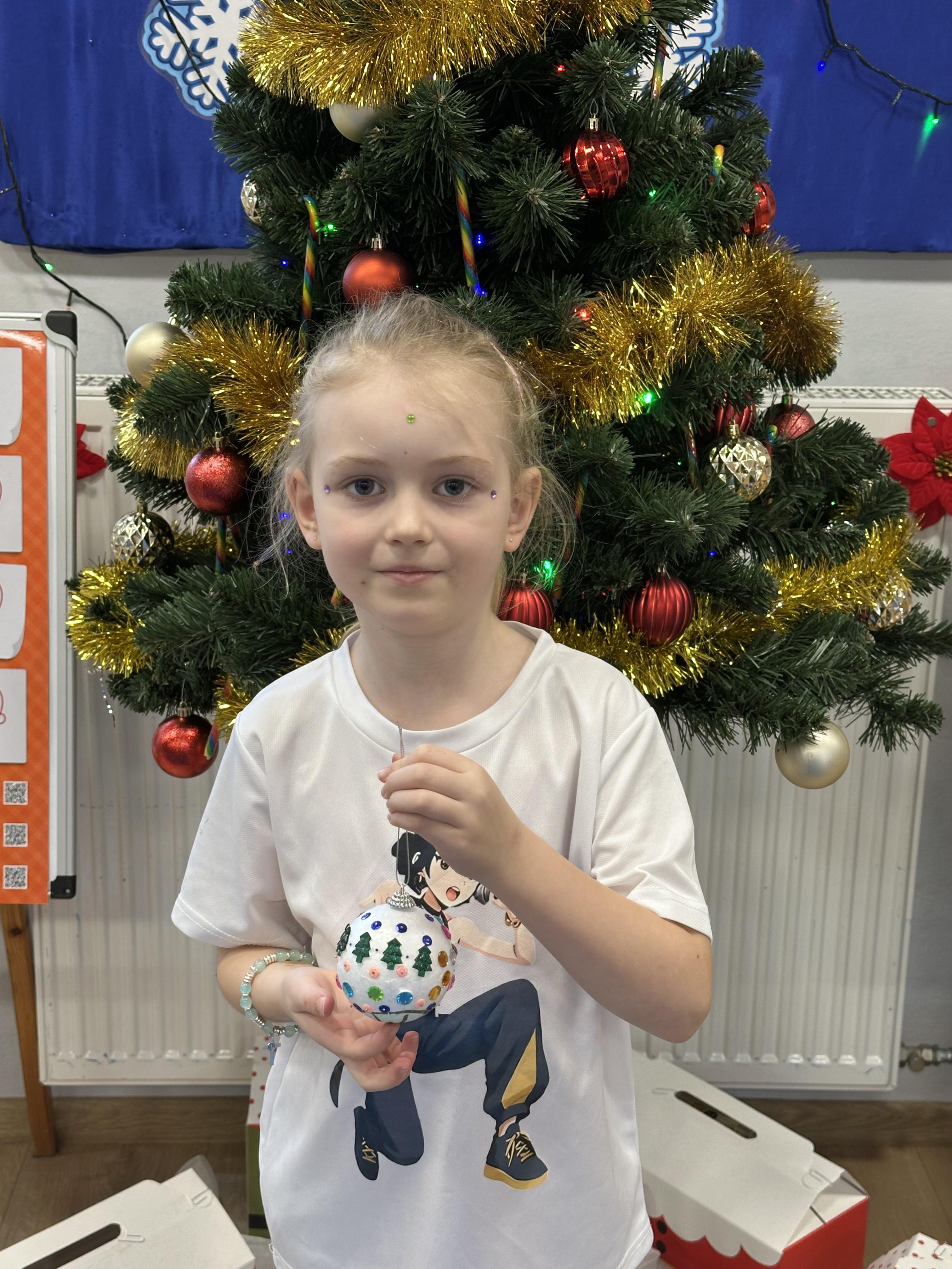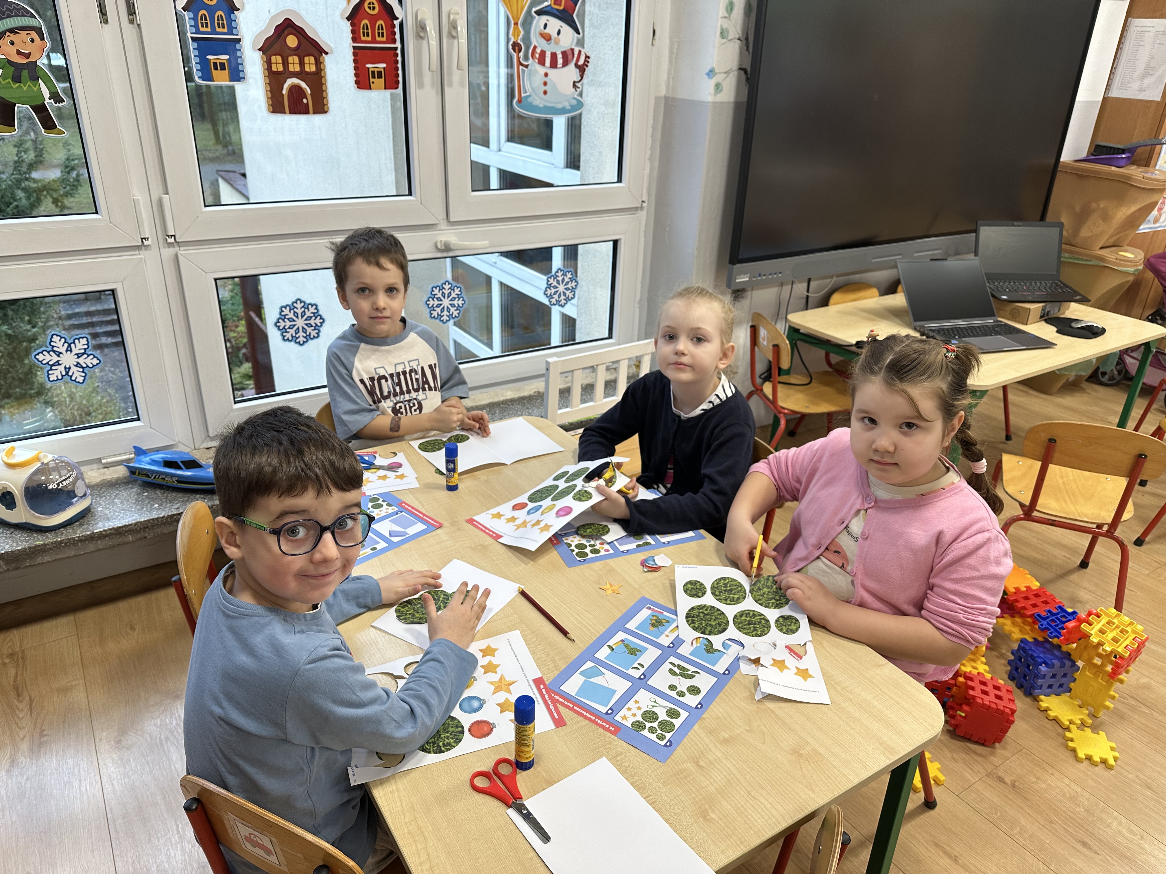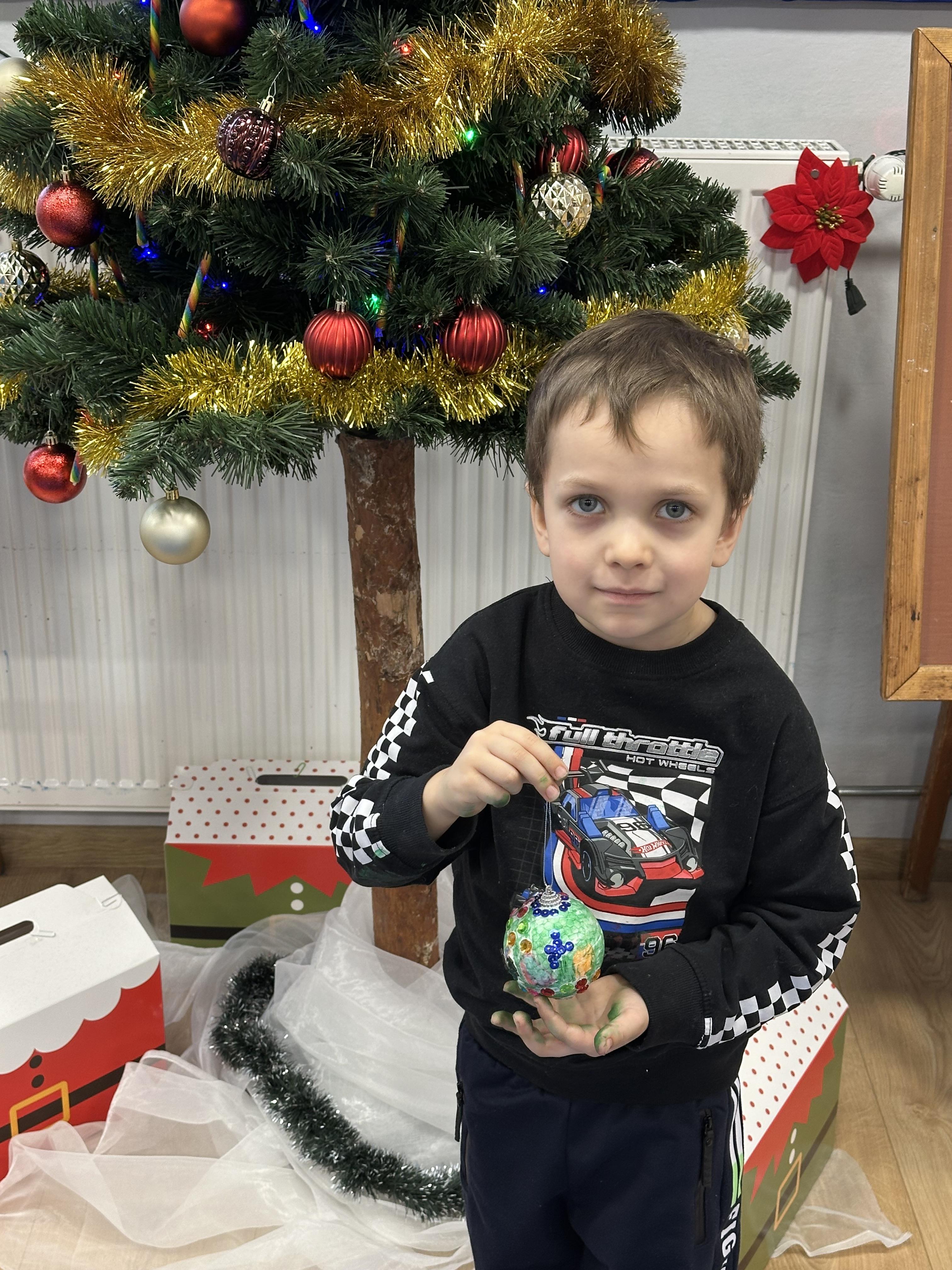 W poniedziałek przedszkolaki wysłuchały opowiadania Marii Pawlisz ,,Idą święta”, po którym miały możliwość wypowiedzieć się, czy lubią spędzać z rodziną święta bożenarodzeniowe. Następnie wspólnie doszły do wniosku, że w każdej rodzinie spędzanie świąt może się różnić i nie ma w tym nic złego. Podczas zajęć dydaktycznych sześciolatki naśladowały czynności wykonywane podczas przygotowań świątecznych. Brały udział w ruchowych zabawach tematycznych, podczas których uczyły się współpracy i integrowały się. Na dworze ćwiczyły mięśnie nóg, skacząc, jak najdalej potrafią. Po powrocie do przedszkola wspólnie wykonywały ćwiczenia gimnastyczne uruchamiające duże grupy mięśniowe, kształtujące prawidłową postawę ciała i orientację w przestrzeni. W trakcie zabawy „Elementy tradycji bożonarodzeniowej” rozpoznawały elementy tradycji świątecznej. Wtorek był poświęcony kształtowaniu umiejętności rozumienia treści życzeń i ich składania. Przedszkolaki wysłuchały piosenkę ,,Srebrne kolczyki”, która stanowiła wprowadzenie do rozmowy o dekoracjach świątecznych na choinkę. Zapoznały się z kolędą ,,Dzisiaj w Betlejem” i wyjaśniały, o kim w niej mowa. Podczas wspólnej pogadanki dzieci rozmawiały o okolicznościach składania życzeń, zastanawiały się, czego można życzyć najbliższej osobie, przybierały wybrane role i uczyły się poprawnego składania życzeń z wykorzystaniem sformułowań podanych przez nauczyciela. W czasie indywidualnej pracy przy stolikach przedszkolaki utrwalały swoje umiejętności językowe. Na dworze wspólnie szukały oznak świąt (ubranych choinek, ozdobnych lampek i innych dekoracji na domach, latarniach, w witrynach sklepów). Tego dnia nie zabrakło również zabawy językowej „Jaka głoska, jaka litera, jaka sylaba?”, w czasie, której dzieci wykorzystały zdobytą wcześniej wiedzę. Rozwijały również małą motorykę podczas rysowania, lepienia, malowania i klejenia. Środa była przeznaczona na rozwijanie umiejętności przeliczania oraz zdolności logicznego myślenia. Sześciolatki uczyły się prawidłowego nakrywania stołu i ćwiczyły pamięć wzrokową. Wysłuchały wiersza ,,Szkoda” i omówiły wspólnie jego treść, zwracając uwagę na rymy. Dzieci brały udział w zabawach językowych, orientacyjno-porządkowych, matematycznych oraz ruchowych z elementami rzutu. W czwartek brały udział w zabawie „Iglaste czy liściaste”, rozpoznawały gatunki drzew i dostrzegały różnicę pomiędzy drzewami iglastymi a liściastymi, rozbudzały również ciekawość przyrodniczą. Podczas zajęć edukacyjnych dzieci układały rytm z figur geometrycznych i według kolorów, pokonywały ścieżkę slalomem, słuchały i zgadywały piosenki. Na spacerze kształtowały umiejętność uważnego obserwowania przyrody i otoczenia, zwracały uwagę na drzewa iglaste i liściaste oraz klasyfikowały, które z nich jest większe, a które mniejsze. Dzień zakończyły pracą rysunkową z wykorzystaniem różnych technik i materiałów plastycznych. W piątek dzieci utrwalały słowa piosenki i bawiły się w grupie. Wspólnie rozwiązywały świąteczne zagadki, eksperymentowały z rodzajami ozdób oraz rozwijały wyobraźnię i kreatywność.