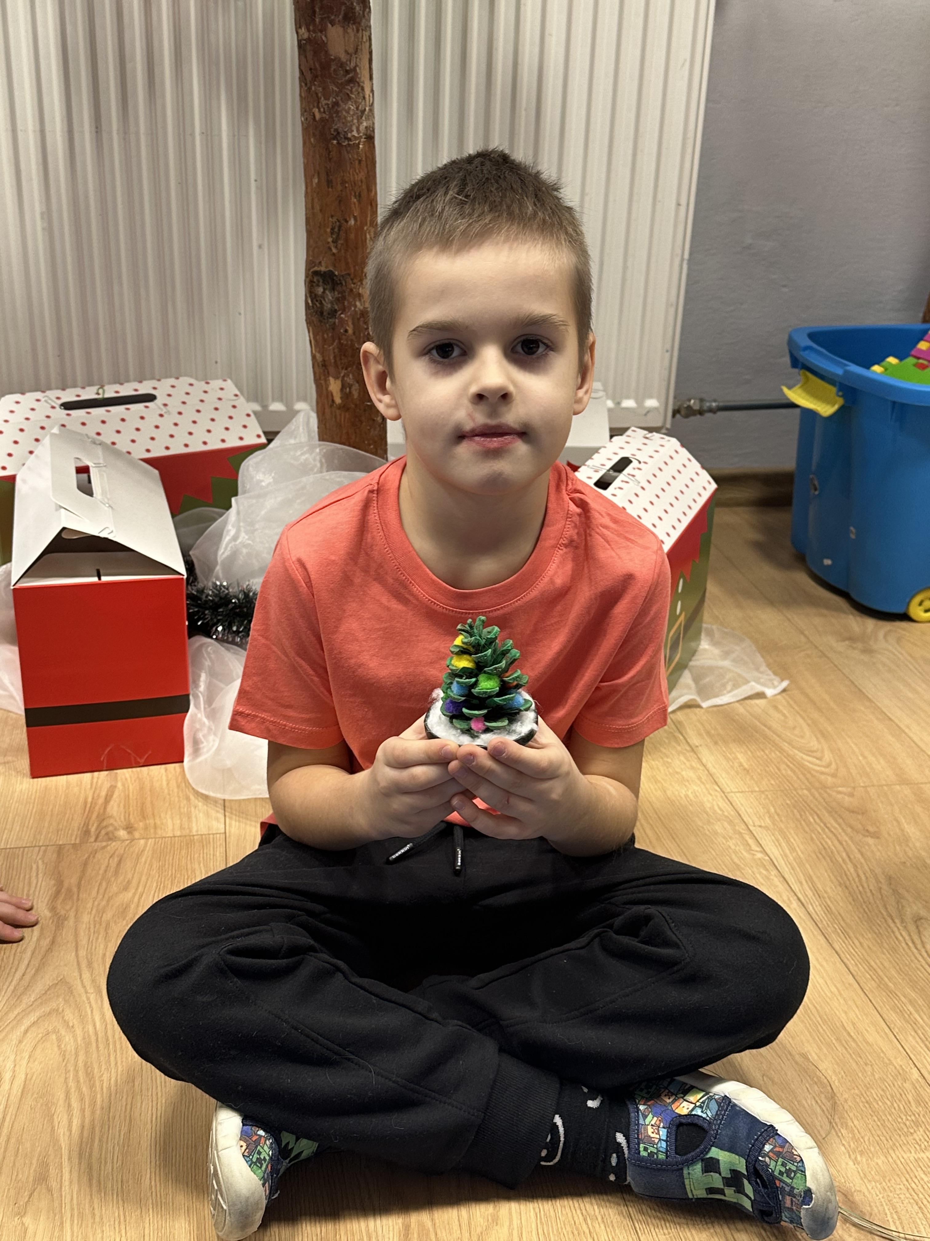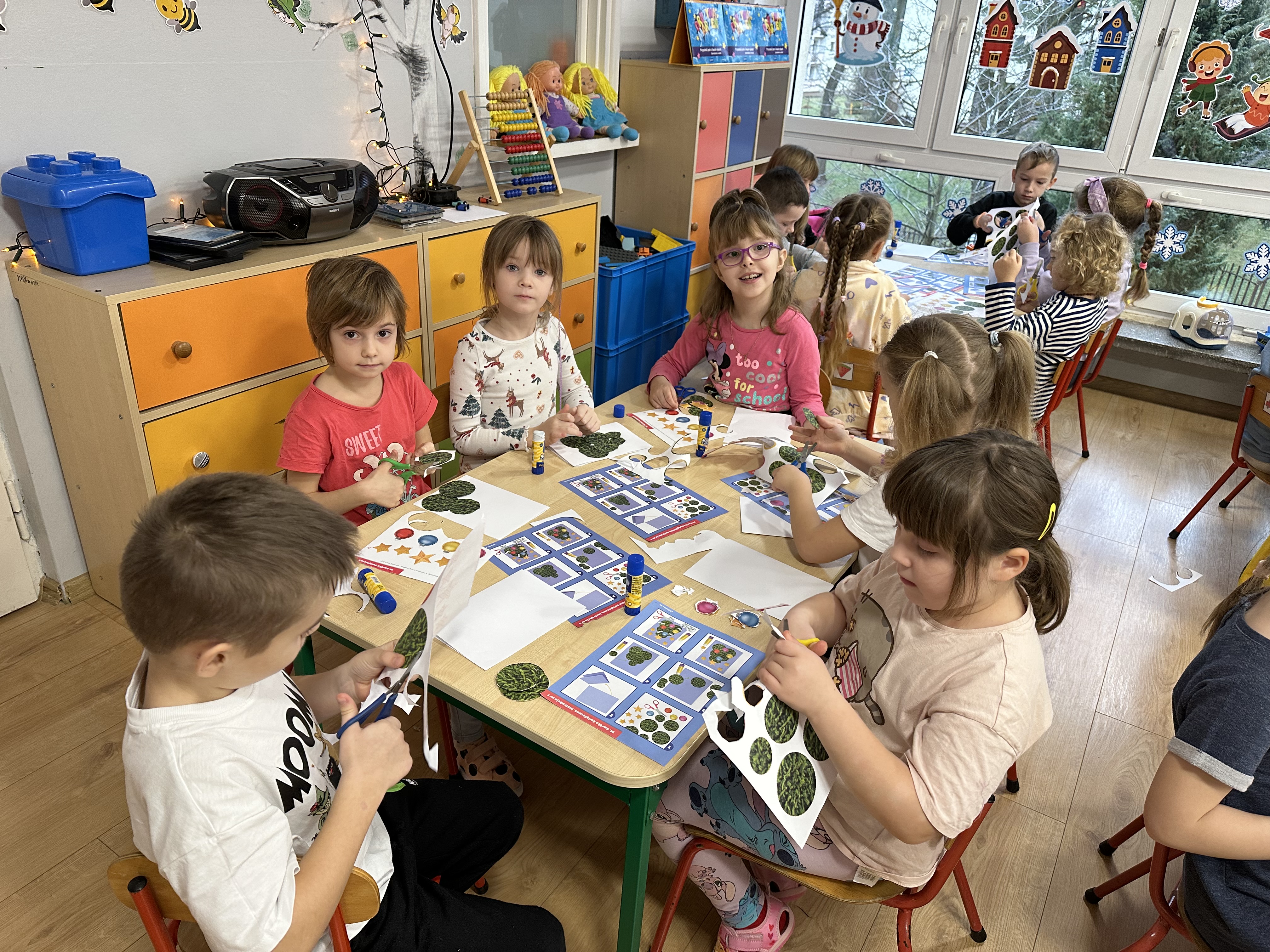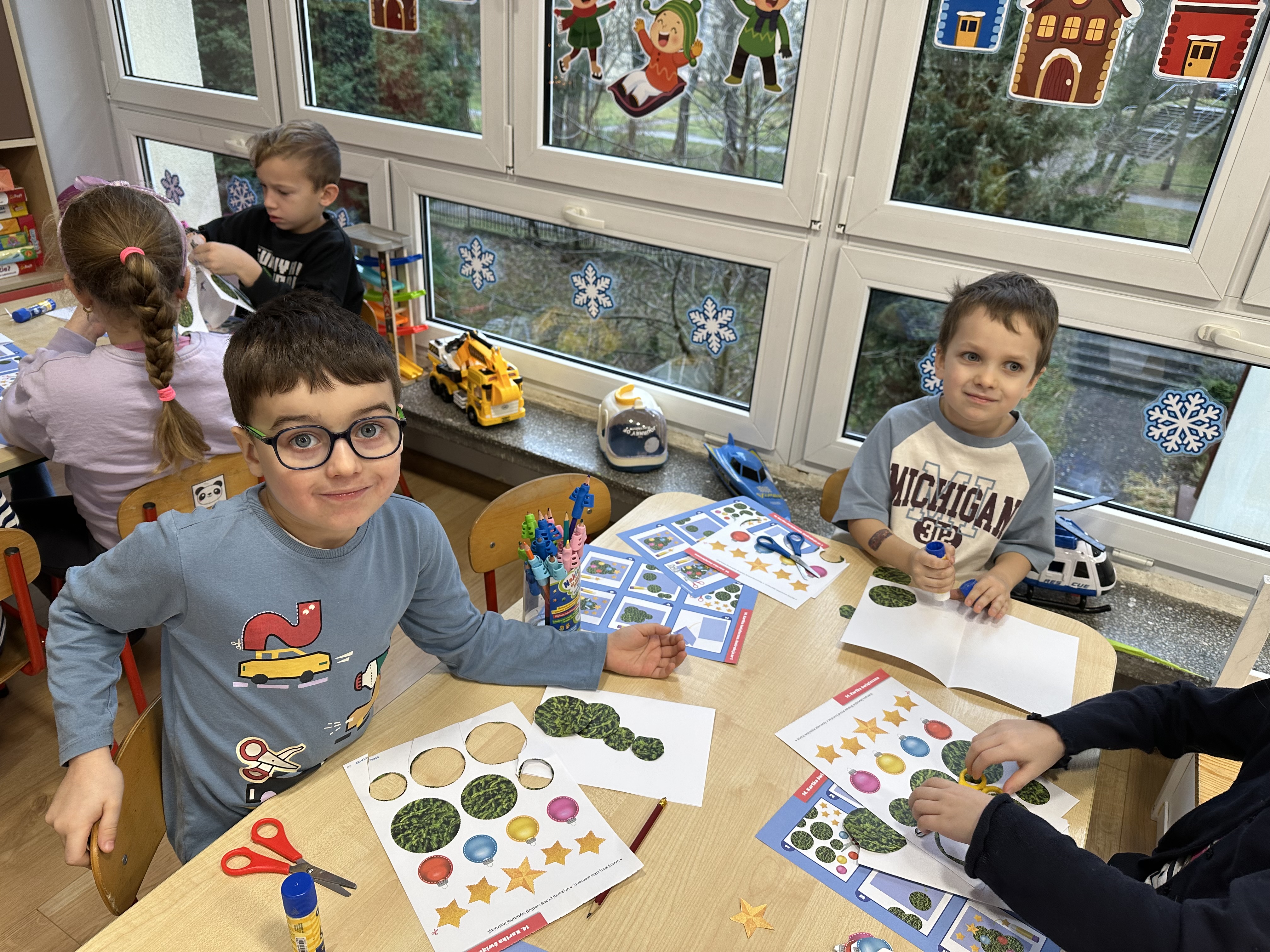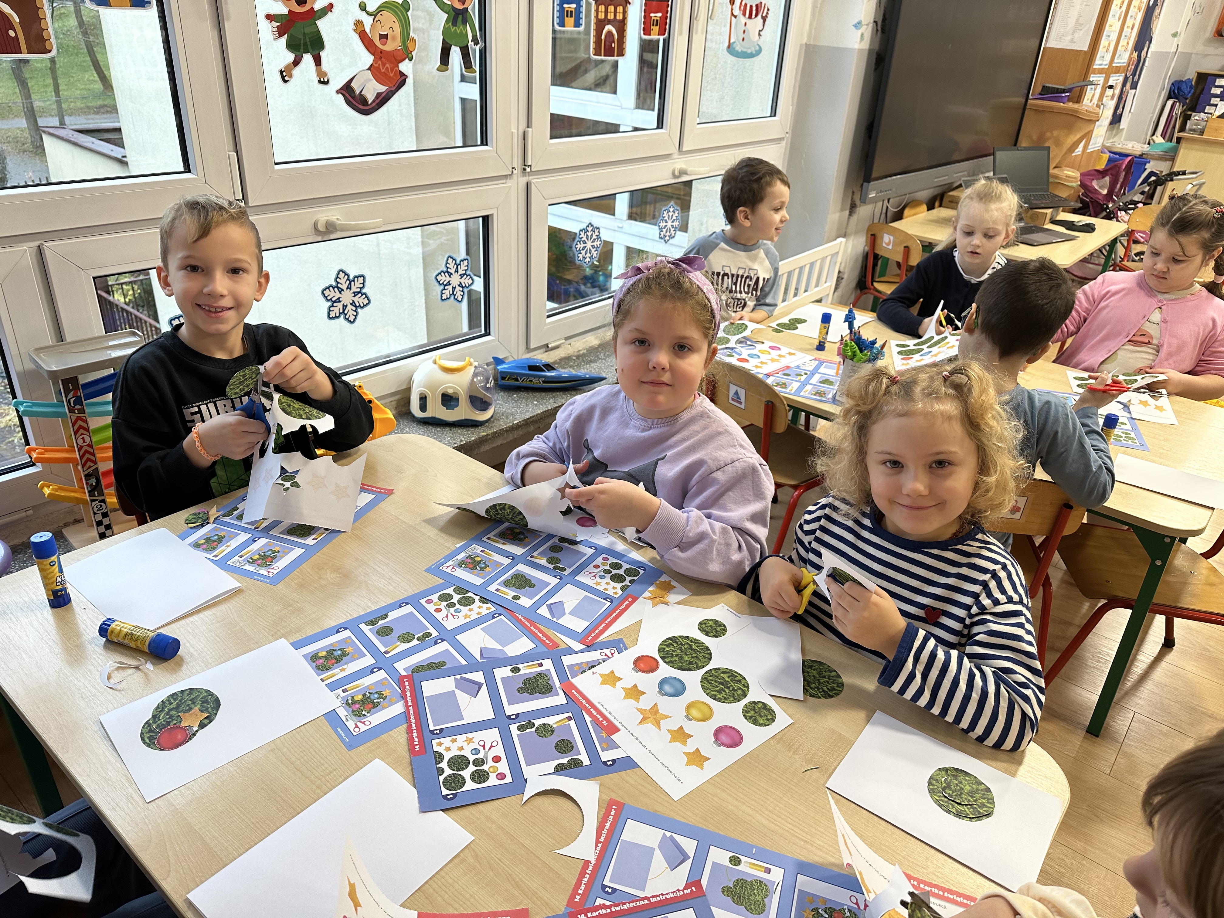 W poniedziałek przedszkolaki wysłuchały opowiadania Marii Pawlisz ,,Idą święta”, po którym miały możliwość wypowiedzieć się, czy lubią spędzać z rodziną święta bożenarodzeniowe. Następnie wspólnie doszły do wniosku, że w każdej rodzinie spędzanie świąt może się różnić i nie ma w tym nic złego. Podczas zajęć dydaktycznych sześciolatki naśladowały czynności wykonywane podczas przygotowań świątecznych. Brały udział w ruchowych zabawach tematycznych, podczas których uczyły się współpracy i integrowały się. Na dworze ćwiczyły mięśnie nóg, skacząc, jak najdalej potrafią. Po powrocie do przedszkola wspólnie wykonywały ćwiczenia gimnastyczne uruchamiające duże grupy mięśniowe, kształtujące prawidłową postawę ciała i orientację w przestrzeni. W trakcie zabawy „Elementy tradycji bożonarodzeniowej” rozpoznawały elementy tradycji świątecznej. Wtorek był poświęcony kształtowaniu umiejętności rozumienia treści życzeń i ich składania. Przedszkolaki wysłuchały piosenkę ,,Srebrne kolczyki”, która stanowiła wprowadzenie do rozmowy o dekoracjach świątecznych na choinkę. Zapoznały się z kolędą ,,Dzisiaj w Betlejem” i wyjaśniały, o kim w niej mowa. Podczas wspólnej pogadanki dzieci rozmawiały o okolicznościach składania życzeń, zastanawiały się, czego można życzyć najbliższej osobie, przybierały wybrane role i uczyły się poprawnego składania życzeń z wykorzystaniem sformułowań podanych przez nauczyciela. W czasie indywidualnej pracy przy stolikach przedszkolaki utrwalały swoje umiejętności językowe. Na dworze wspólnie szukały oznak świąt (ubranych choinek, ozdobnych lampek i innych dekoracji na domach, latarniach, w witrynach sklepów). Tego dnia nie zabrakło również zabawy językowej „Jaka głoska, jaka litera, jaka sylaba?”, w czasie, której dzieci wykorzystały zdobytą wcześniej wiedzę. Rozwijały również małą motorykę podczas rysowania, lepienia, malowania i klejenia. Środa była przeznaczona na rozwijanie umiejętności przeliczania oraz zdolności logicznego myślenia. Sześciolatki uczyły się prawidłowego nakrywania stołu i ćwiczyły pamięć wzrokową. Wysłuchały wiersza ,,Szkoda” i omówiły wspólnie jego treść, zwracając uwagę na rymy. Dzieci brały udział w zabawach językowych, orientacyjno-porządkowych, matematycznych oraz ruchowych z elementami rzutu. W czwartek brały udział w zabawie „Iglaste czy liściaste”, rozpoznawały gatunki drzew i dostrzegały różnicę pomiędzy drzewami iglastymi a liściastymi, rozbudzały również ciekawość przyrodniczą. Podczas zajęć edukacyjnych dzieci układały rytm z figur geometrycznych i według kolorów, pokonywały ścieżkę slalomem, słuchały i zgadywały piosenki. Na spacerze kształtowały umiejętność uważnego obserwowania przyrody i otoczenia, zwracały uwagę na drzewa iglaste i liściaste oraz klasyfikowały, które z nich jest większe, a które mniejsze. Dzień zakończyły pracą rysunkową z wykorzystaniem różnych technik i materiałów plastycznych. W piątek dzieci utrwalały słowa piosenki i bawiły się w grupie. Wspólnie rozwiązywały świąteczne zagadki, eksperymentowały z rodzajami ozdób oraz rozwijały wyobraźnię i kreatywność.