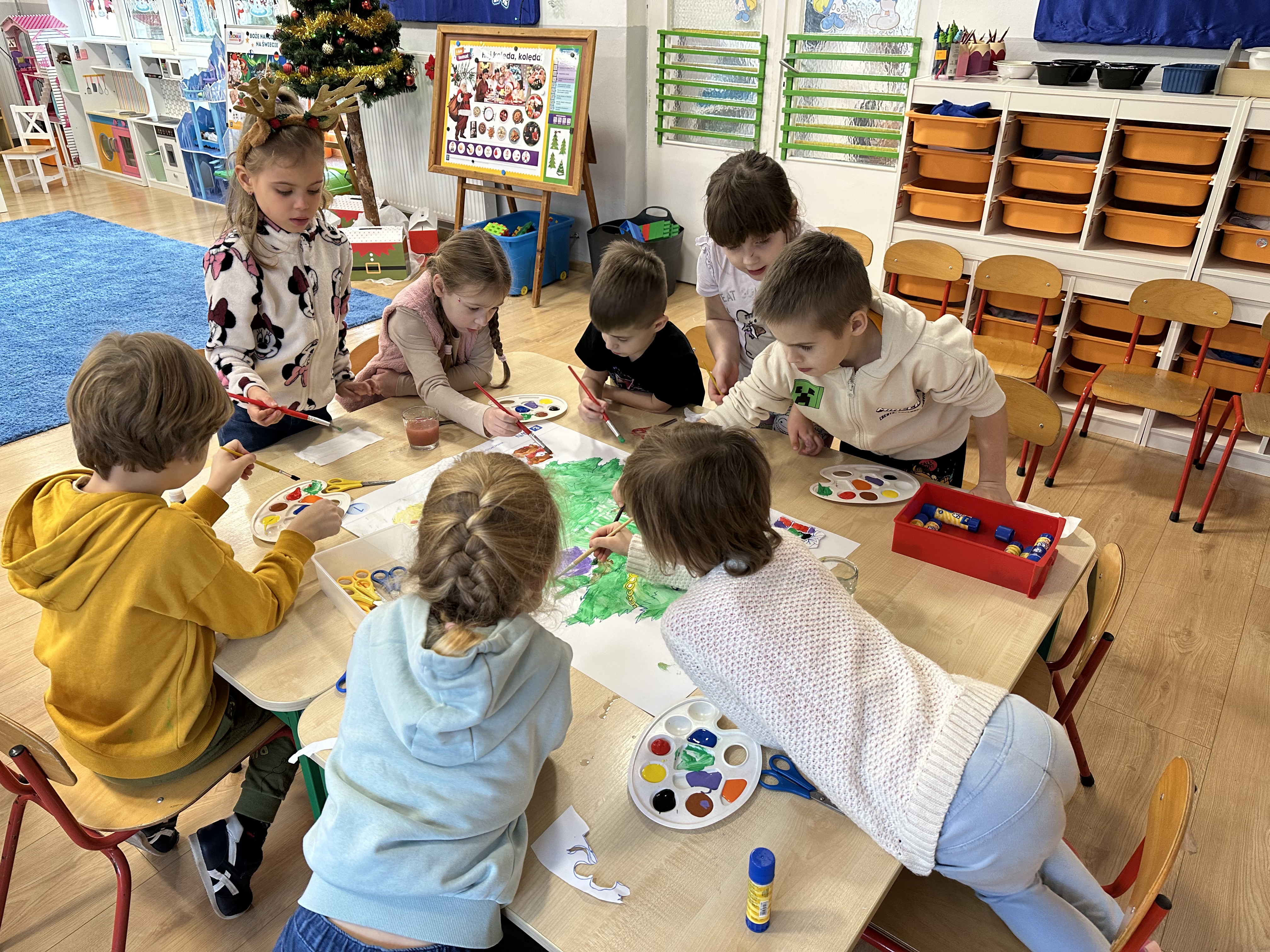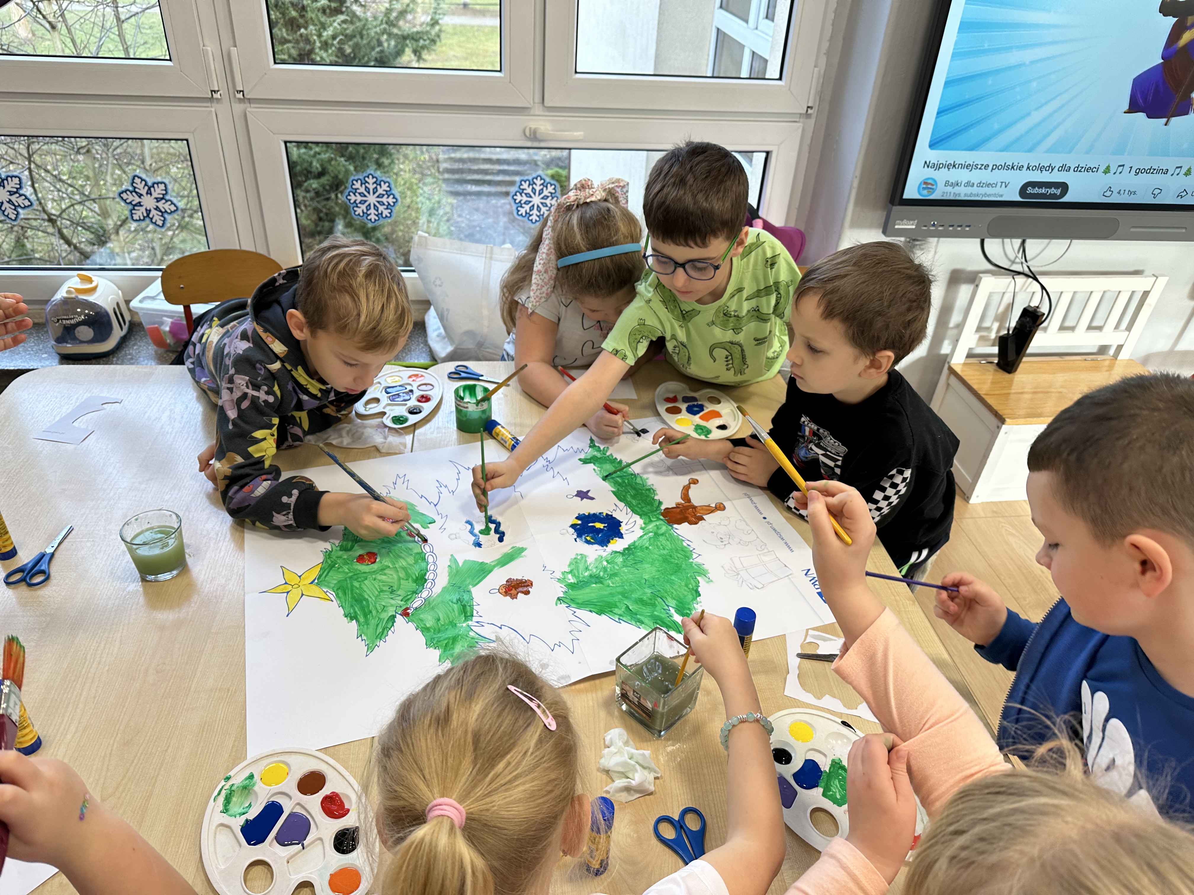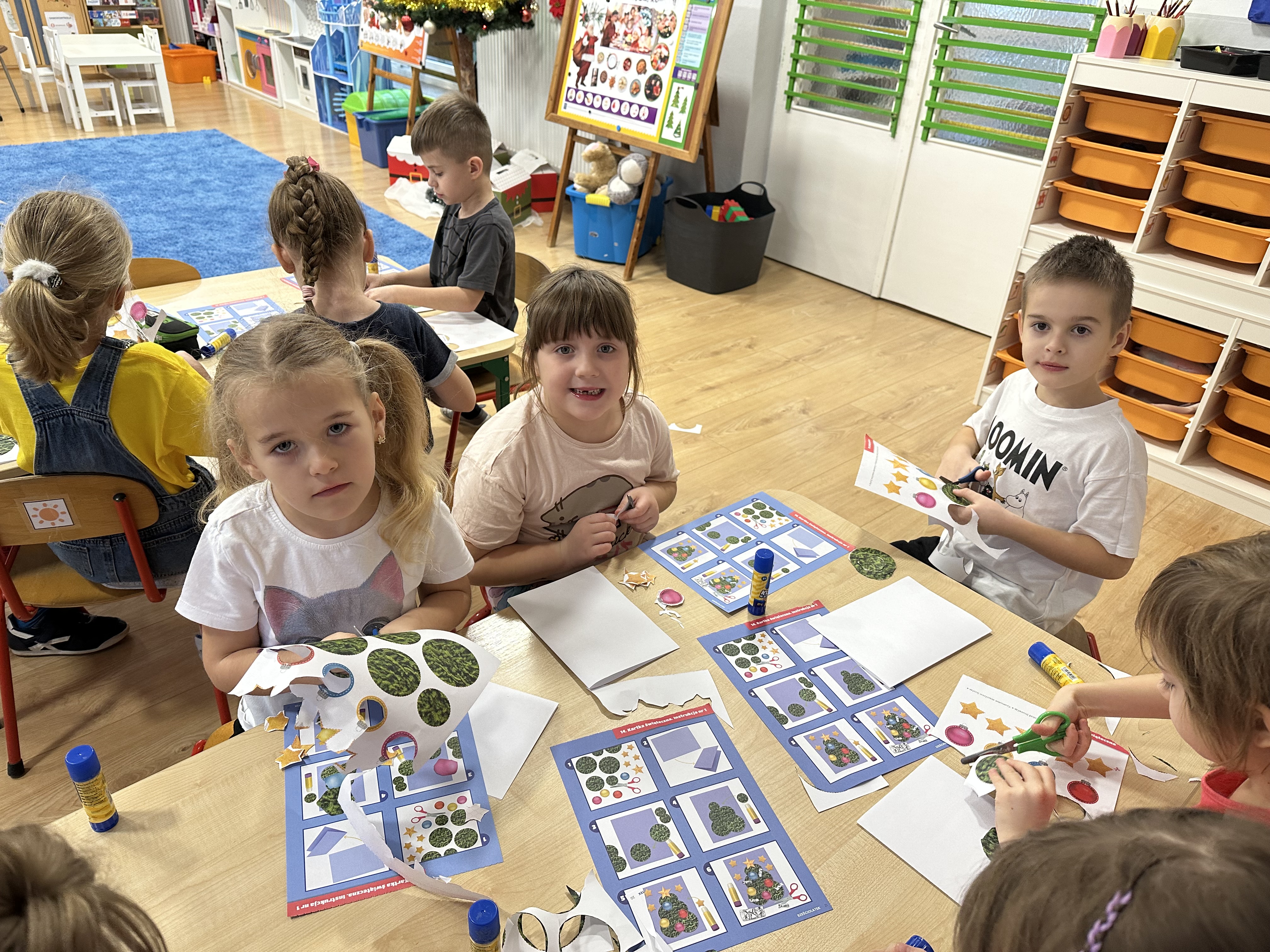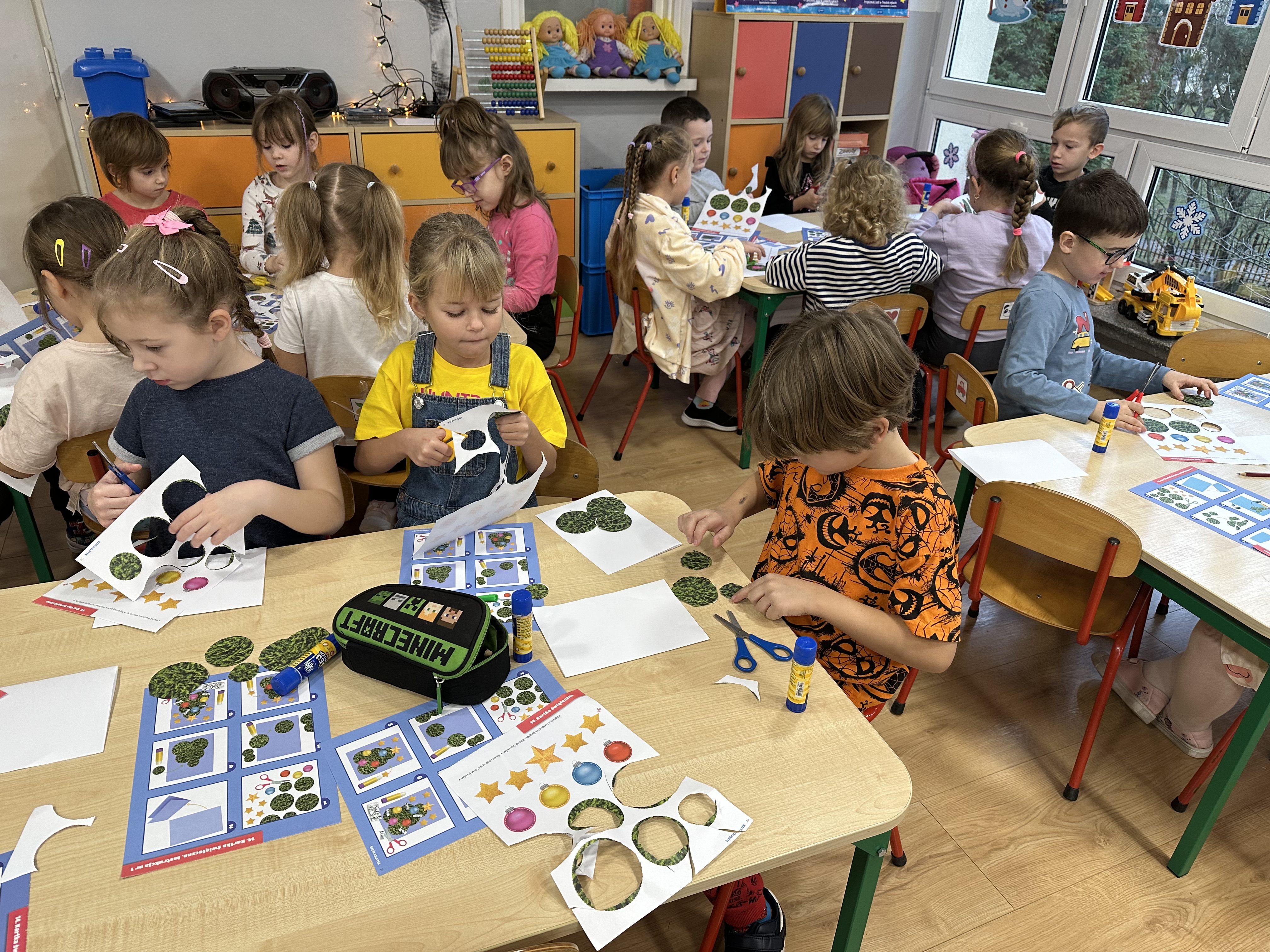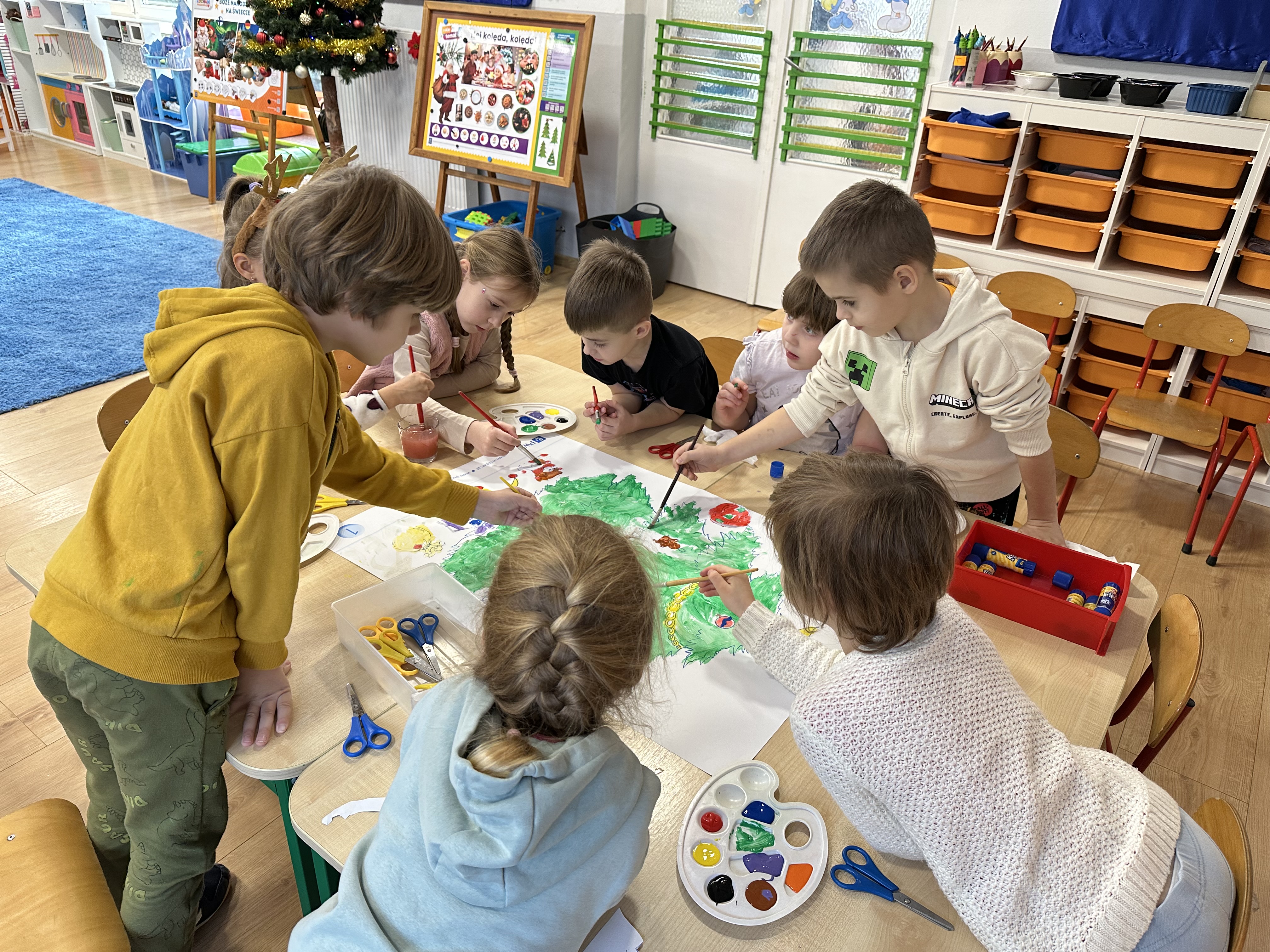 W poniedziałek przedszkolaki wysłuchały opowiadania Marii Pawlisz ,,Idą święta”, po którym miały możliwość wypowiedzieć się, czy lubią spędzać z rodziną święta bożenarodzeniowe. Następnie wspólnie doszły do wniosku, że w każdej rodzinie spędzanie świąt może się różnić i nie ma w tym nic złego. Podczas zajęć dydaktycznych sześciolatki naśladowały czynności wykonywane podczas przygotowań świątecznych. Brały udział w ruchowych zabawach tematycznych, podczas których uczyły się współpracy i integrowały się. Na dworze ćwiczyły mięśnie nóg, skacząc, jak najdalej potrafią. Po powrocie do przedszkola wspólnie wykonywały ćwiczenia gimnastyczne uruchamiające duże grupy mięśniowe, kształtujące prawidłową postawę ciała i orientację w przestrzeni. W trakcie zabawy „Elementy tradycji bożonarodzeniowej” rozpoznawały elementy tradycji świątecznej. Wtorek był poświęcony kształtowaniu umiejętności rozumienia treści życzeń i ich składania. Przedszkolaki wysłuchały piosenkę ,,Srebrne kolczyki”, która stanowiła wprowadzenie do rozmowy o dekoracjach świątecznych na choinkę. Zapoznały się z kolędą ,,Dzisiaj w Betlejem” i wyjaśniały, o kim w niej mowa. Podczas wspólnej pogadanki dzieci rozmawiały o okolicznościach składania życzeń, zastanawiały się, czego można życzyć najbliższej osobie, przybierały wybrane role i uczyły się poprawnego składania życzeń z wykorzystaniem sformułowań podanych przez nauczyciela. W czasie indywidualnej pracy przy stolikach przedszkolaki utrwalały swoje umiejętności językowe. Na dworze wspólnie szukały oznak świąt (ubranych choinek, ozdobnych lampek i innych dekoracji na domach, latarniach, w witrynach sklepów). Tego dnia nie zabrakło również zabawy językowej „Jaka głoska, jaka litera, jaka sylaba?”, w czasie, której dzieci wykorzystały zdobytą wcześniej wiedzę. Rozwijały również małą motorykę podczas rysowania, lepienia, malowania i klejenia. Środa była przeznaczona na rozwijanie umiejętności przeliczania oraz zdolności logicznego myślenia. Sześciolatki uczyły się prawidłowego nakrywania stołu i ćwiczyły pamięć wzrokową. Wysłuchały wiersza ,,Szkoda” i omówiły wspólnie jego treść, zwracając uwagę na rymy. Dzieci brały udział w zabawach językowych, orientacyjno-porządkowych, matematycznych oraz ruchowych z elementami rzutu. W czwartek brały udział w zabawie „Iglaste czy liściaste”, rozpoznawały gatunki drzew i dostrzegały różnicę pomiędzy drzewami iglastymi a liściastymi, rozbudzały również ciekawość przyrodniczą. Podczas zajęć edukacyjnych dzieci układały rytm z figur geometrycznych i według kolorów, pokonywały ścieżkę slalomem, słuchały i zgadywały piosenki. Na spacerze kształtowały umiejętność uważnego obserwowania przyrody i otoczenia, zwracały uwagę na drzewa iglaste i liściaste oraz klasyfikowały, które z nich jest większe, a które mniejsze. Dzień zakończyły pracą rysunkową z wykorzystaniem różnych technik i materiałów plastycznych. W piątek dzieci utrwalały słowa piosenki i bawiły się w grupie. Wspólnie rozwiązywały świąteczne zagadki, eksperymentowały z rodzajami ozdób oraz rozwijały wyobraźnię i kreatywność.