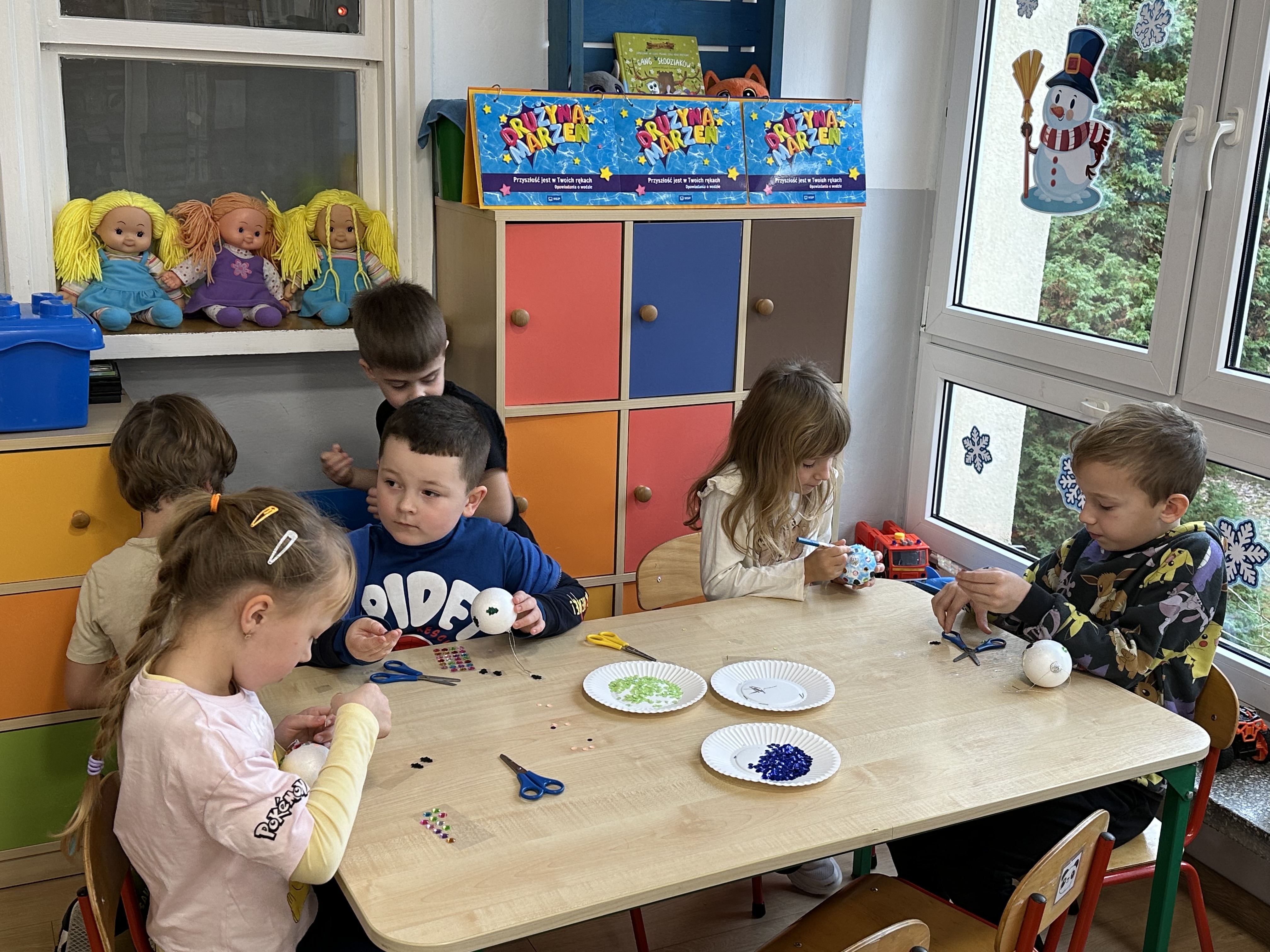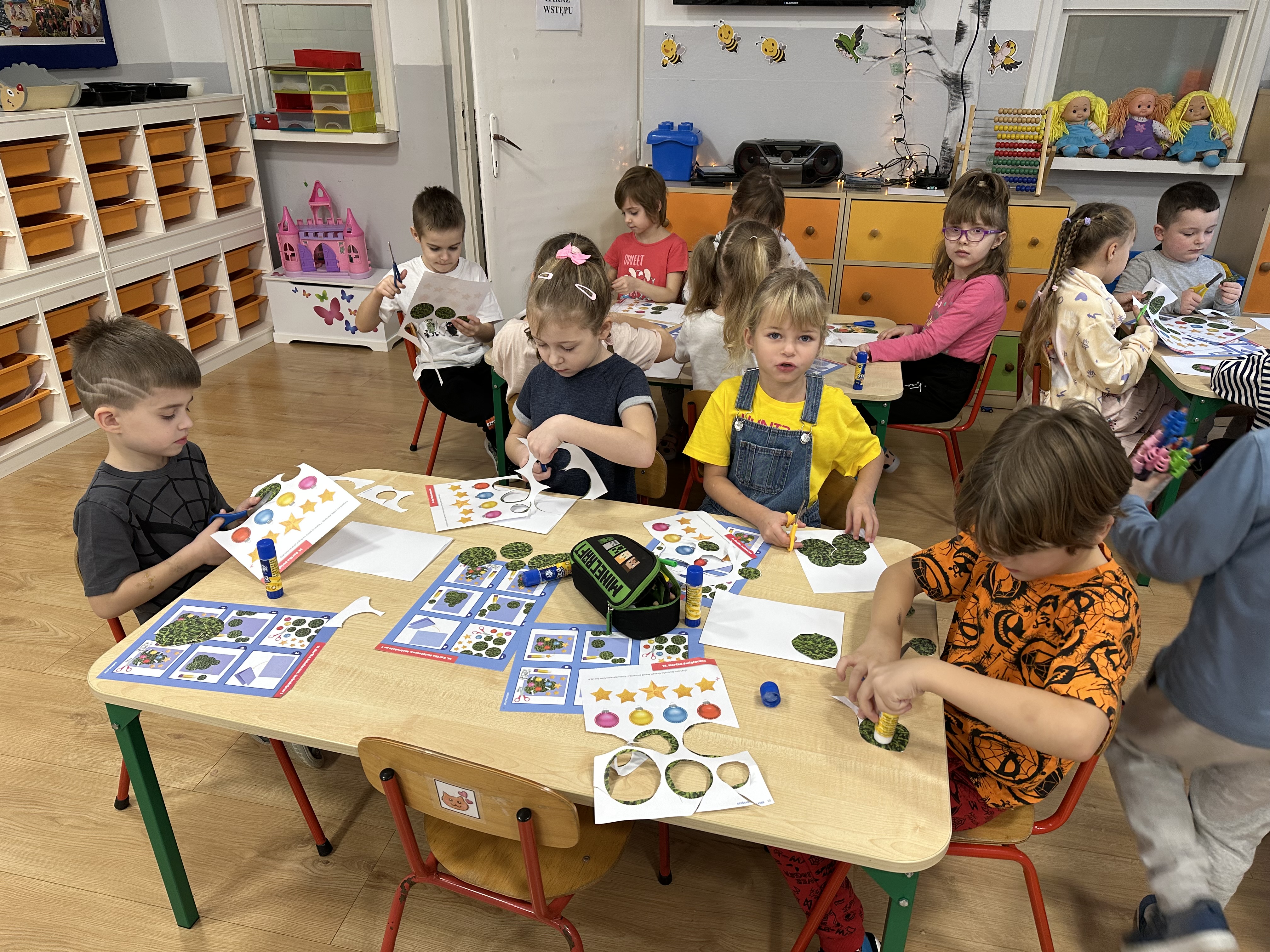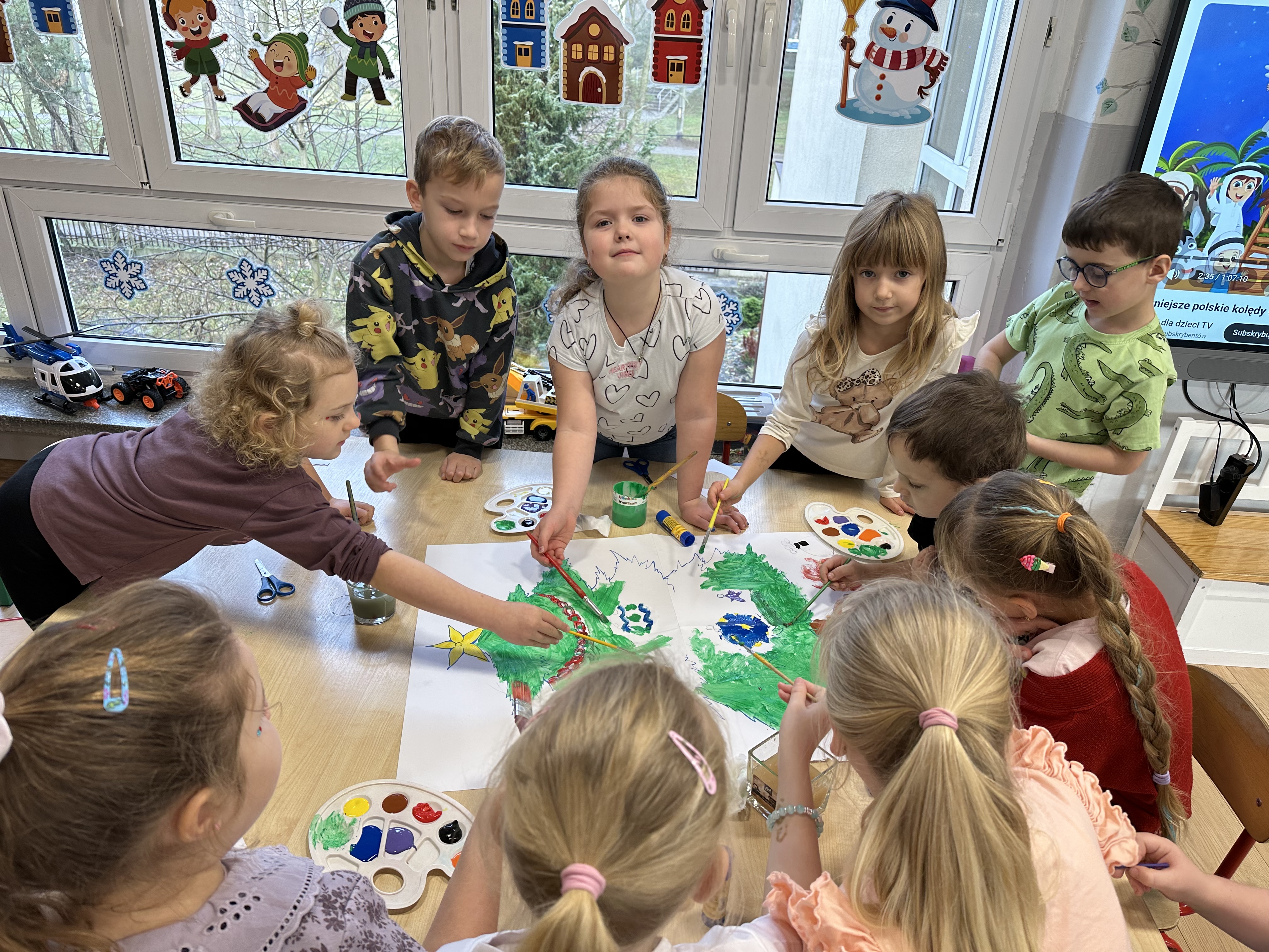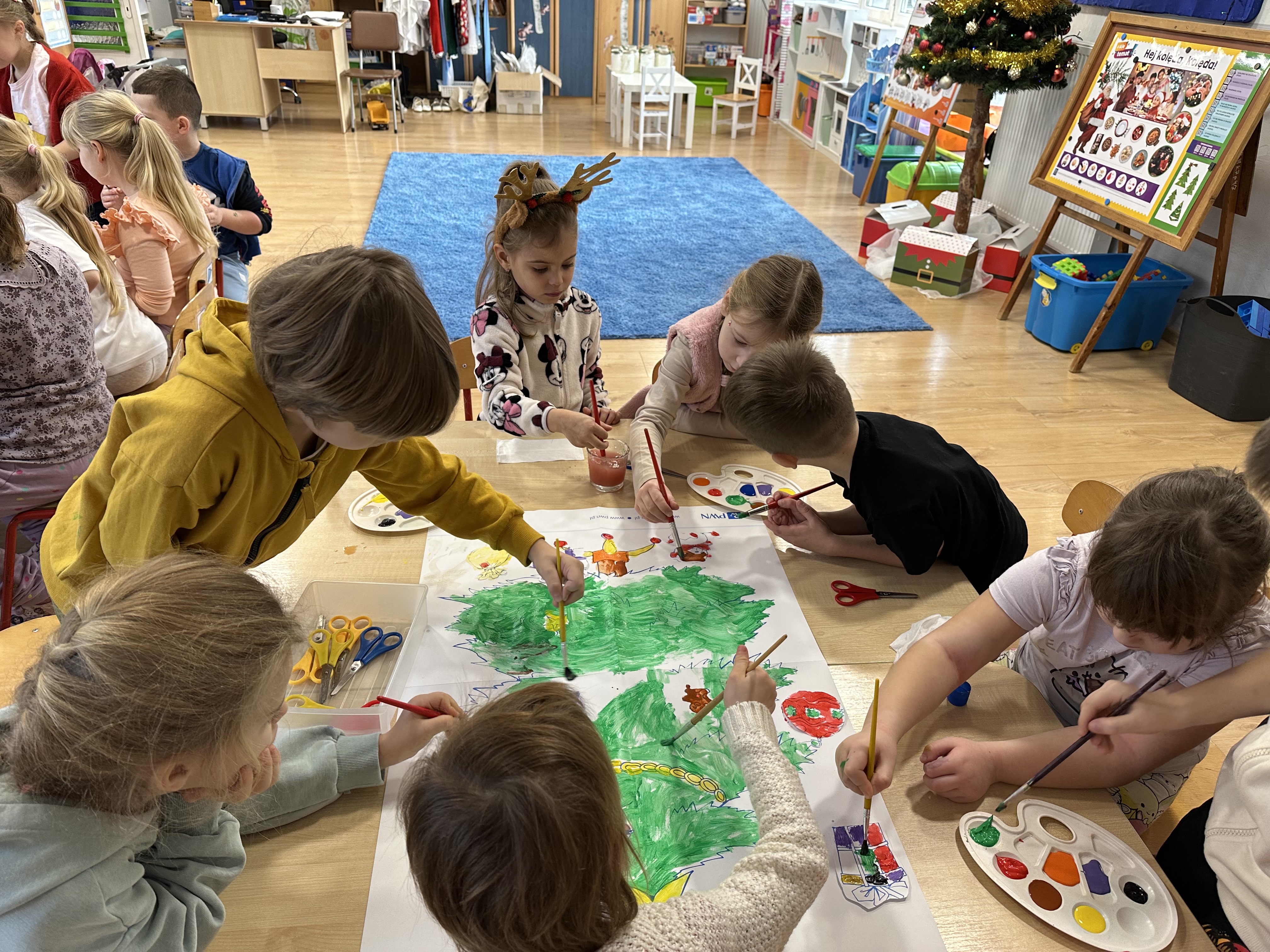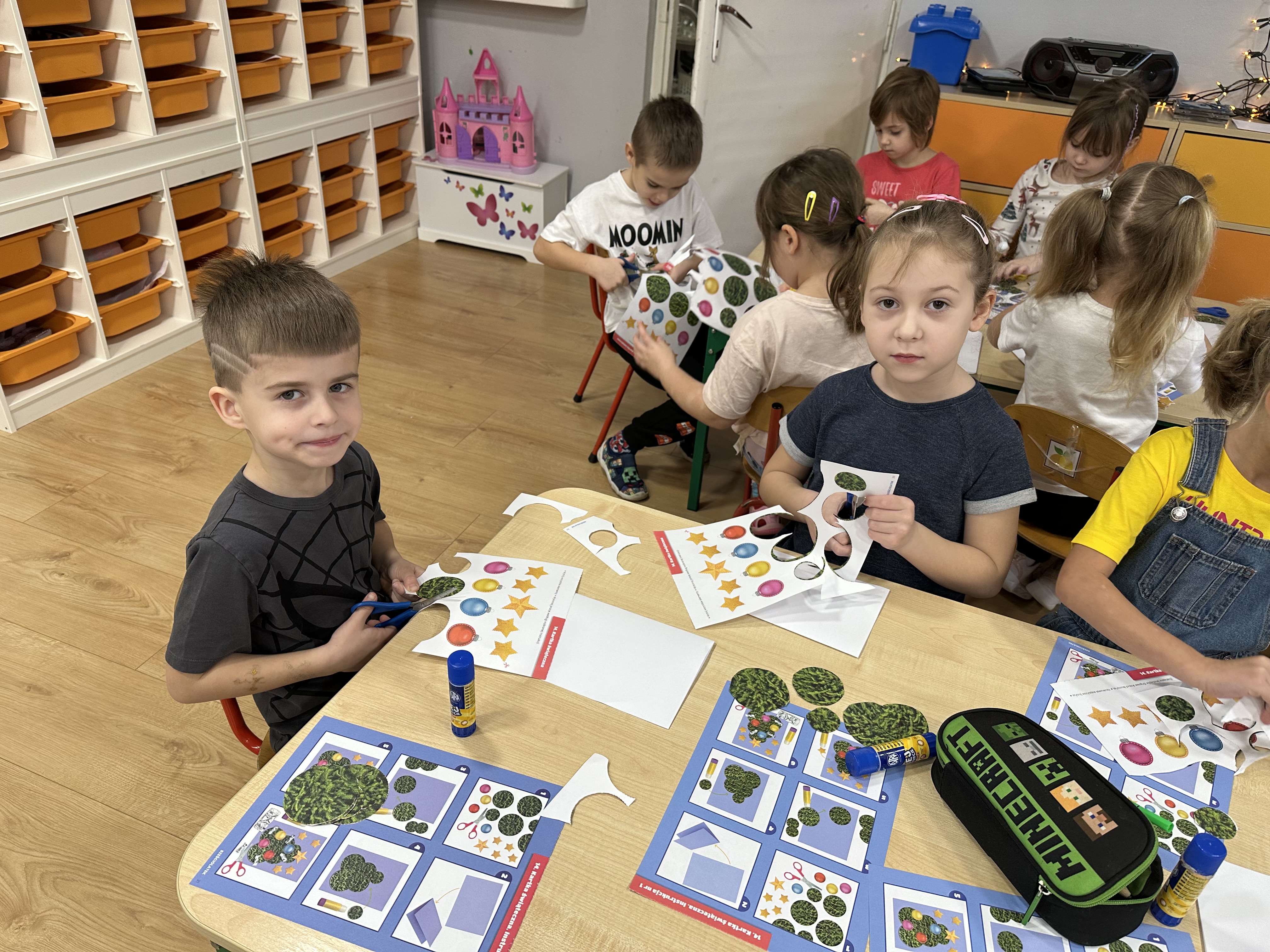 W poniedziałek przedszkolaki wysłuchały opowiadania Marii Pawlisz ,,Idą święta”, po którym miały możliwość wypowiedzieć się, czy lubią spędzać z rodziną święta bożenarodzeniowe. Następnie wspólnie doszły do wniosku, że w każdej rodzinie spędzanie świąt może się różnić i nie ma w tym nic złego. Podczas zajęć dydaktycznych sześciolatki naśladowały czynności wykonywane podczas przygotowań świątecznych. Brały udział w ruchowych zabawach tematycznych, podczas których uczyły się współpracy i integrowały się. Na dworze ćwiczyły mięśnie nóg, skacząc, jak najdalej potrafią. Po powrocie do przedszkola wspólnie wykonywały ćwiczenia gimnastyczne uruchamiające duże grupy mięśniowe, kształtujące prawidłową postawę ciała i orientację w przestrzeni. W trakcie zabawy „Elementy tradycji bożonarodzeniowej” rozpoznawały elementy tradycji świątecznej. Wtorek był poświęcony kształtowaniu umiejętności rozumienia treści życzeń i ich składania. Przedszkolaki wysłuchały piosenkę ,,Srebrne kolczyki”, która stanowiła wprowadzenie do rozmowy o dekoracjach świątecznych na choinkę. Zapoznały się z kolędą ,,Dzisiaj w Betlejem” i wyjaśniały, o kim w niej mowa. Podczas wspólnej pogadanki dzieci rozmawiały o okolicznościach składania życzeń, zastanawiały się, czego można życzyć najbliższej osobie, przybierały wybrane role i uczyły się poprawnego składania życzeń z wykorzystaniem sformułowań podanych przez nauczyciela. W czasie indywidualnej pracy przy stolikach przedszkolaki utrwalały swoje umiejętności językowe. Na dworze wspólnie szukały oznak świąt (ubranych choinek, ozdobnych lampek i innych dekoracji na domach, latarniach, w witrynach sklepów). Tego dnia nie zabrakło również zabawy językowej „Jaka głoska, jaka litera, jaka sylaba?”, w czasie, której dzieci wykorzystały zdobytą wcześniej wiedzę. Rozwijały również małą motorykę podczas rysowania, lepienia, malowania i klejenia. Środa była przeznaczona na rozwijanie umiejętności przeliczania oraz zdolności logicznego myślenia. Sześciolatki uczyły się prawidłowego nakrywania stołu i ćwiczyły pamięć wzrokową. Wysłuchały wiersza ,,Szkoda” i omówiły wspólnie jego treść, zwracając uwagę na rymy. Dzieci brały udział w zabawach językowych, orientacyjno-porządkowych, matematycznych oraz ruchowych z elementami rzutu. W czwartek brały udział w zabawie „Iglaste czy liściaste”, rozpoznawały gatunki drzew i dostrzegały różnicę pomiędzy drzewami iglastymi a liściastymi, rozbudzały również ciekawość przyrodniczą. Podczas zajęć edukacyjnych dzieci układały rytm z figur geometrycznych i według kolorów, pokonywały ścieżkę slalomem, słuchały i zgadywały piosenki. Na spacerze kształtowały umiejętność uważnego obserwowania przyrody i otoczenia, zwracały uwagę na drzewa iglaste i liściaste oraz klasyfikowały, które z nich jest większe, a które mniejsze. Dzień zakończyły pracą rysunkową z wykorzystaniem różnych technik i materiałów plastycznych. W piątek dzieci utrwalały słowa piosenki i bawiły się w grupie. Wspólnie rozwiązywały świąteczne zagadki, eksperymentowały z rodzajami ozdób oraz rozwijały wyobraźnię i kreatywność.
