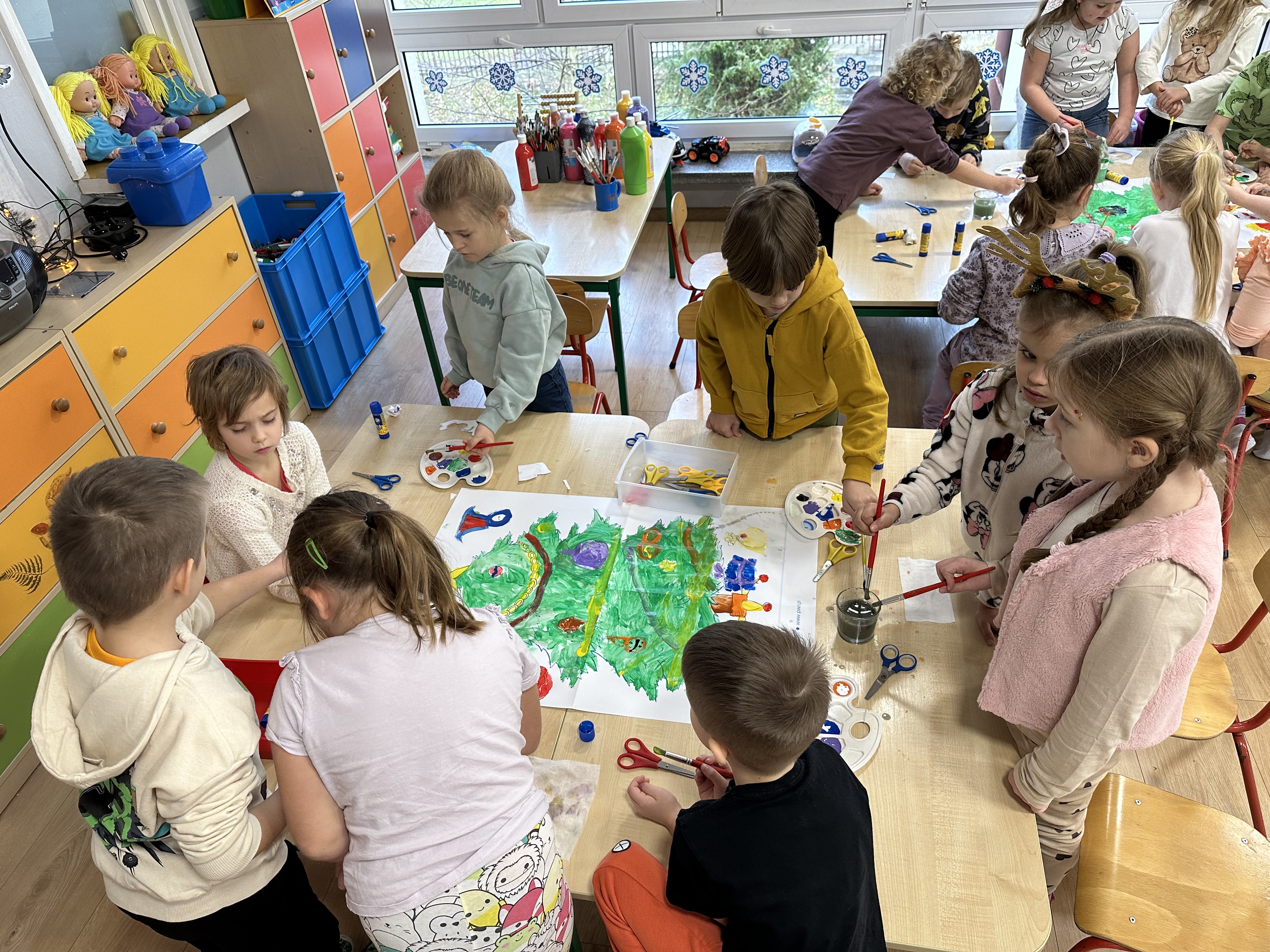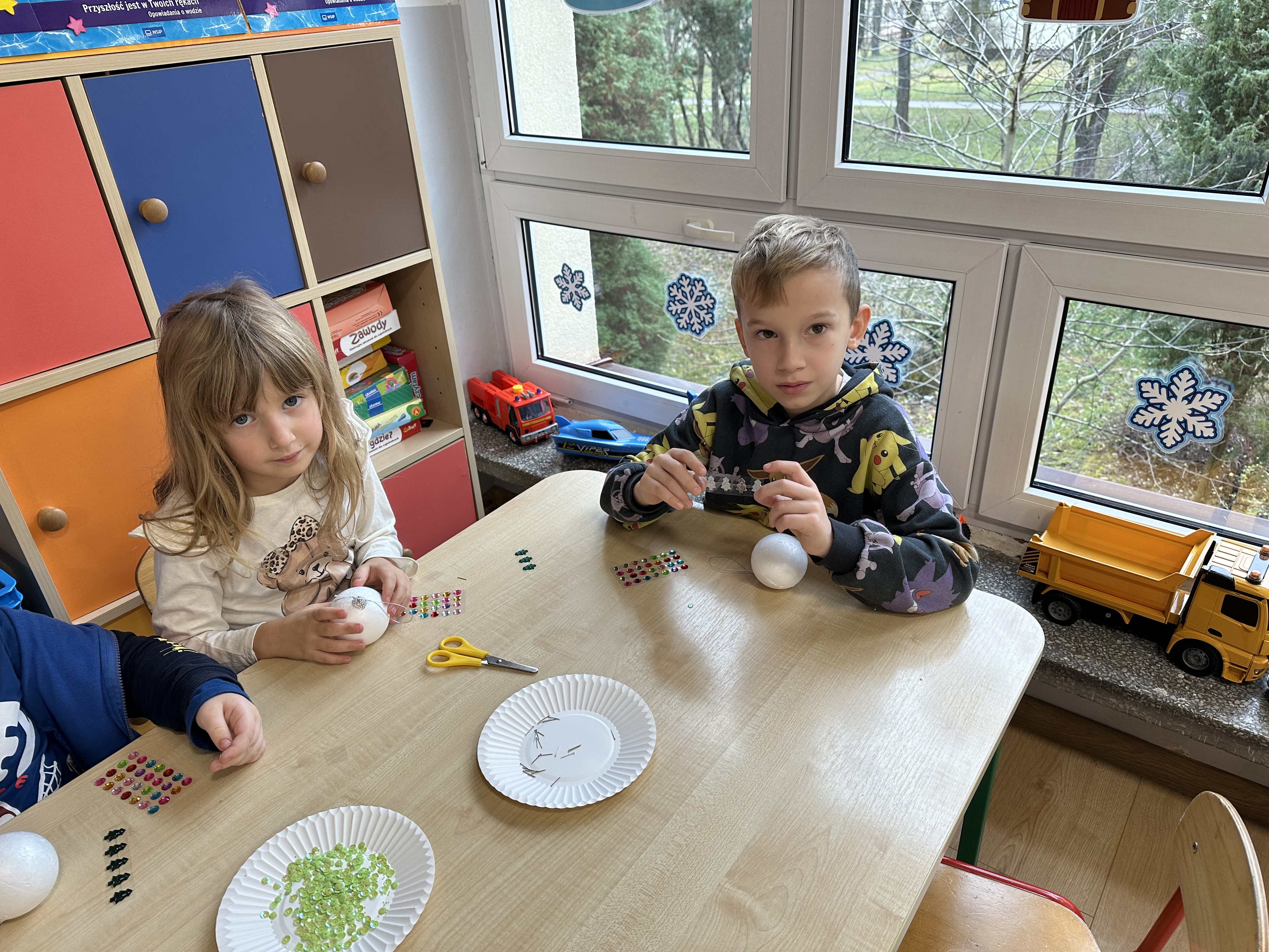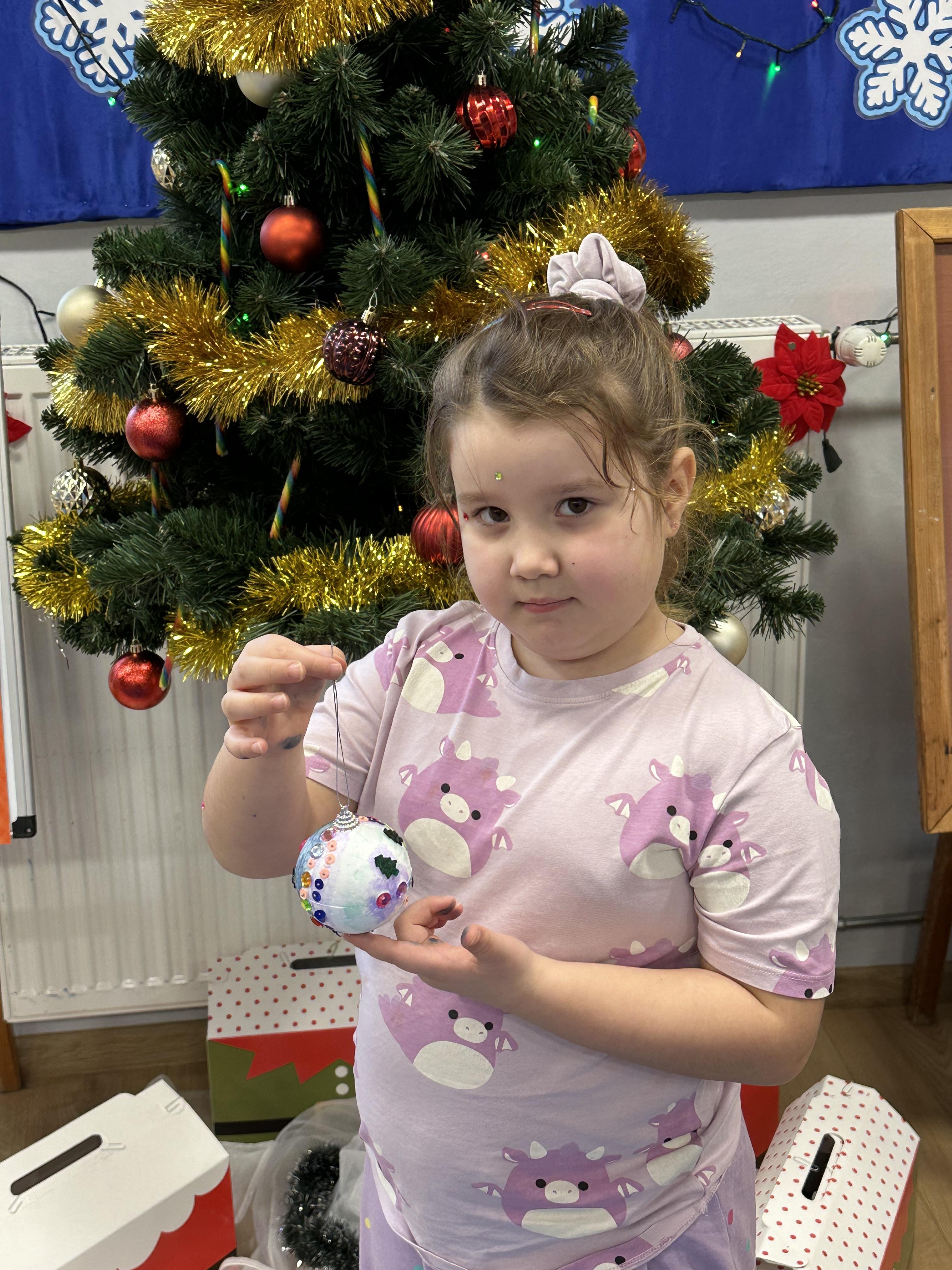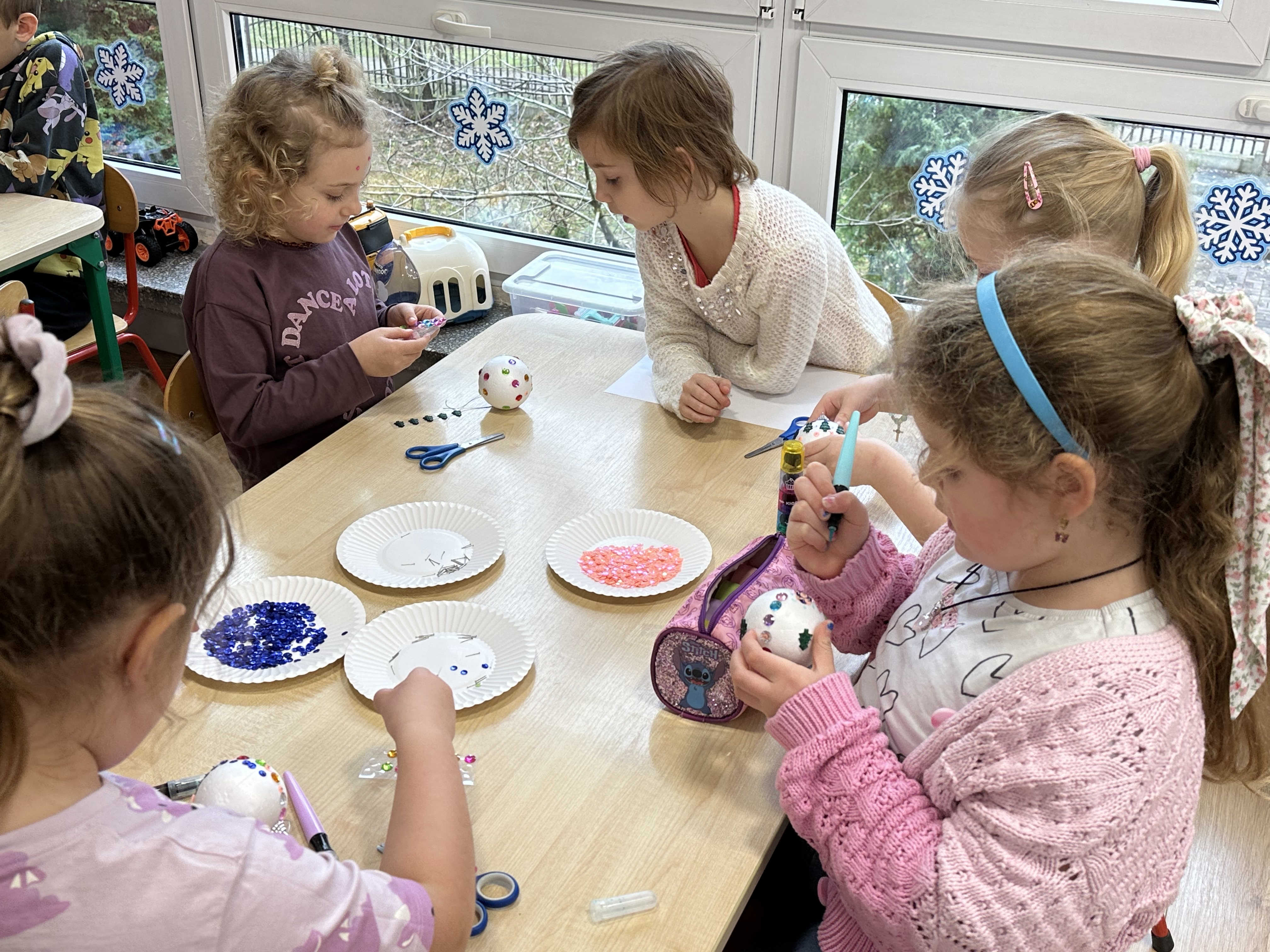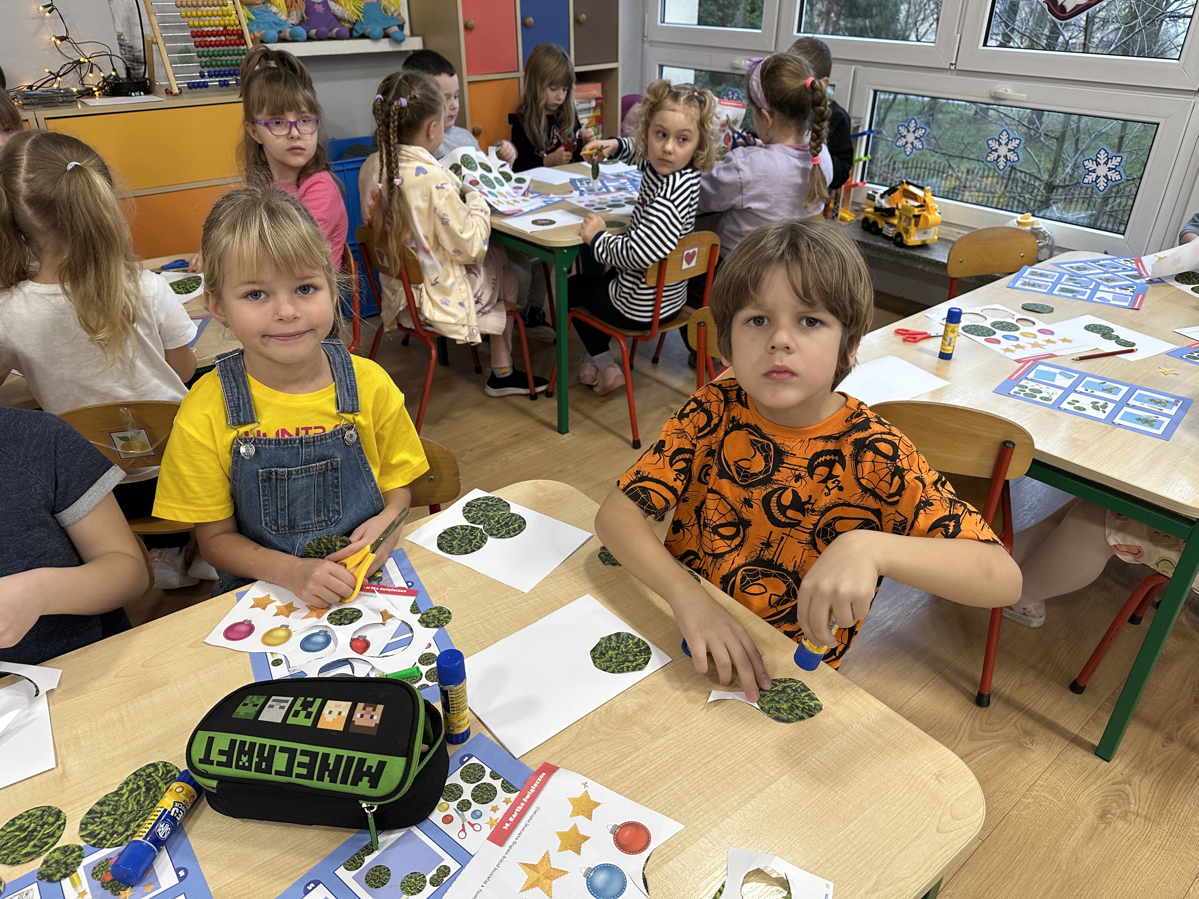 W poniedziałek przedszkolaki wysłuchały opowiadania Marii Pawlisz ,,Idą święta”, po którym miały możliwość wypowiedzieć się, czy lubią spędzać z rodziną święta bożenarodzeniowe. Następnie wspólnie doszły do wniosku, że w każdej rodzinie spędzanie świąt może się różnić i nie ma w tym nic złego. Podczas zajęć dydaktycznych sześciolatki naśladowały czynności wykonywane podczas przygotowań świątecznych. Brały udział w ruchowych zabawach tematycznych, podczas których uczyły się współpracy i integrowały się. Na dworze ćwiczyły mięśnie nóg, skacząc, jak najdalej potrafią. Po powrocie do przedszkola wspólnie wykonywały ćwiczenia gimnastyczne uruchamiające duże grupy mięśniowe, kształtujące prawidłową postawę ciała i orientację w przestrzeni. W trakcie zabawy „Elementy tradycji bożonarodzeniowej” rozpoznawały elementy tradycji świątecznej. Wtorek był poświęcony kształtowaniu umiejętności rozumienia treści życzeń i ich składania. Przedszkolaki wysłuchały piosenkę ,,Srebrne kolczyki”, która stanowiła wprowadzenie do rozmowy o dekoracjach świątecznych na choinkę. Zapoznały się z kolędą ,,Dzisiaj w Betlejem” i wyjaśniały, o kim w niej mowa. Podczas wspólnej pogadanki dzieci rozmawiały o okolicznościach składania życzeń, zastanawiały się, czego można życzyć najbliższej osobie, przybierały wybrane role i uczyły się poprawnego składania życzeń z wykorzystaniem sformułowań podanych przez nauczyciela. W czasie indywidualnej pracy przy stolikach przedszkolaki utrwalały swoje umiejętności językowe. Na dworze wspólnie szukały oznak świąt (ubranych choinek, ozdobnych lampek i innych dekoracji na domach, latarniach, w witrynach sklepów). Tego dnia nie zabrakło również zabawy językowej „Jaka głoska, jaka litera, jaka sylaba?”, w czasie, której dzieci wykorzystały zdobytą wcześniej wiedzę. Rozwijały również małą motorykę podczas rysowania, lepienia, malowania i klejenia. Środa była przeznaczona na rozwijanie umiejętności przeliczania oraz zdolności logicznego myślenia. Sześciolatki uczyły się prawidłowego nakrywania stołu i ćwiczyły pamięć wzrokową. Wysłuchały wiersza ,,Szkoda” i omówiły wspólnie jego treść, zwracając uwagę na rymy. Dzieci brały udział w zabawach językowych, orientacyjno-porządkowych, matematycznych oraz ruchowych z elementami rzutu. W czwartek brały udział w zabawie „Iglaste czy liściaste”, rozpoznawały gatunki drzew i dostrzegały różnicę pomiędzy drzewami iglastymi a liściastymi, rozbudzały również ciekawość przyrodniczą. Podczas zajęć edukacyjnych dzieci układały rytm z figur geometrycznych i według kolorów, pokonywały ścieżkę slalomem, słuchały i zgadywały piosenki. Na spacerze kształtowały umiejętność uważnego obserwowania przyrody i otoczenia, zwracały uwagę na drzewa iglaste i liściaste oraz klasyfikowały, które z nich jest większe, a które mniejsze. Dzień zakończyły pracą rysunkową z wykorzystaniem różnych technik i materiałów plastycznych. W piątek dzieci utrwalały słowa piosenki i bawiły się w grupie. Wspólnie rozwiązywały świąteczne zagadki, eksperymentowały z rodzajami ozdób oraz rozwijały wyobraźnię i kreatywność.