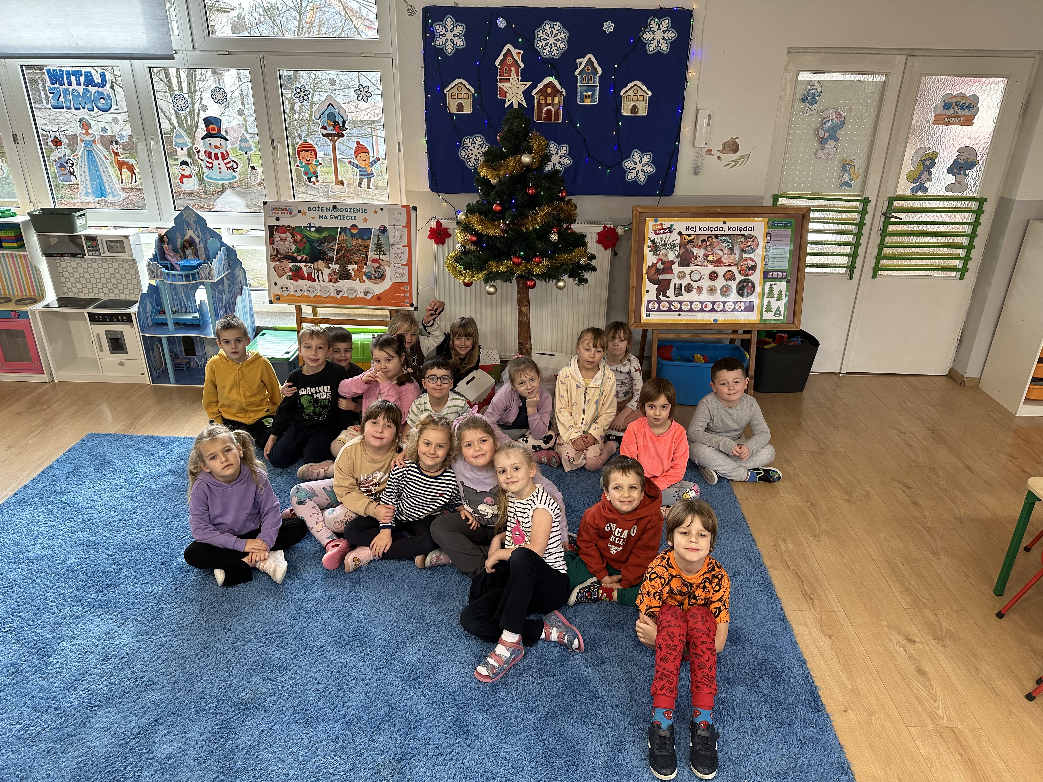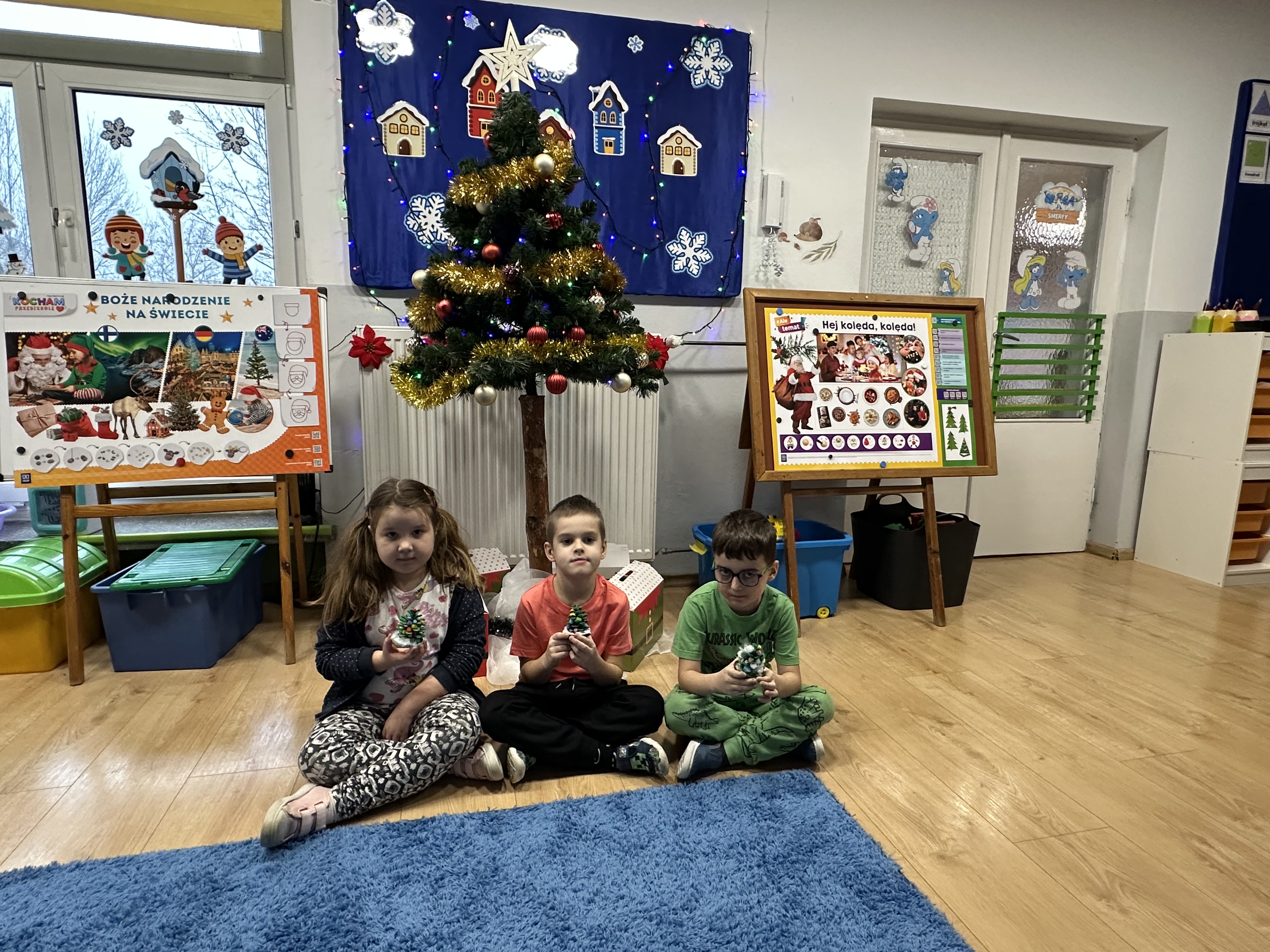 Każdego ranka nastrój w przedszkolu budowała powitanka ,,Święta za pasem”, którą dzieci ilustrowały ruchem.