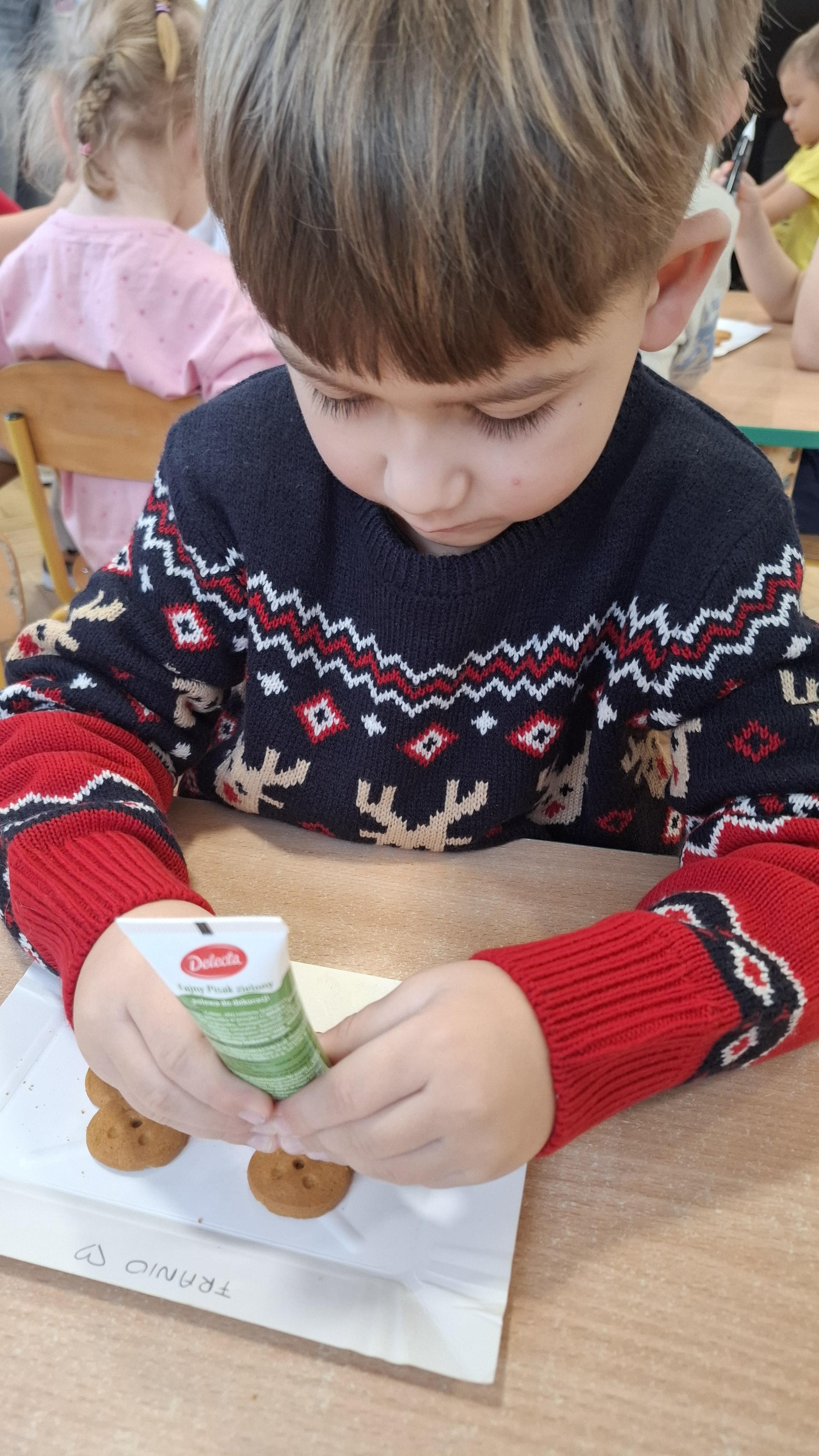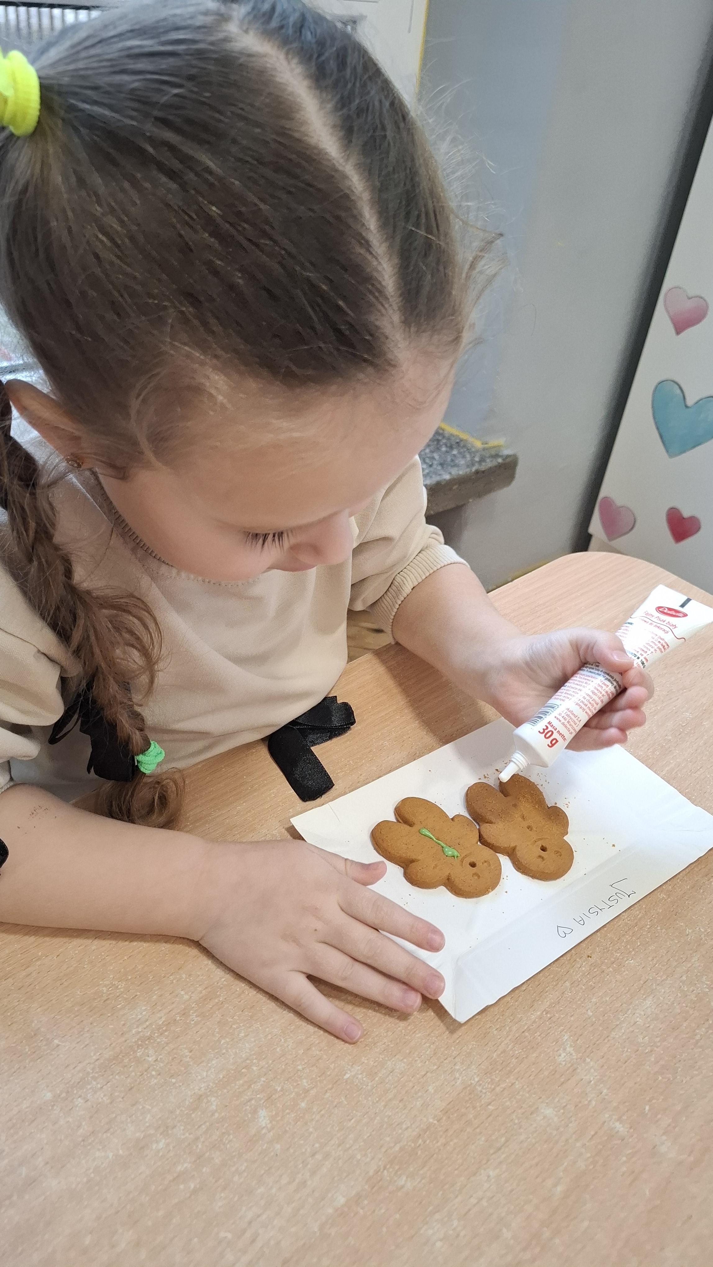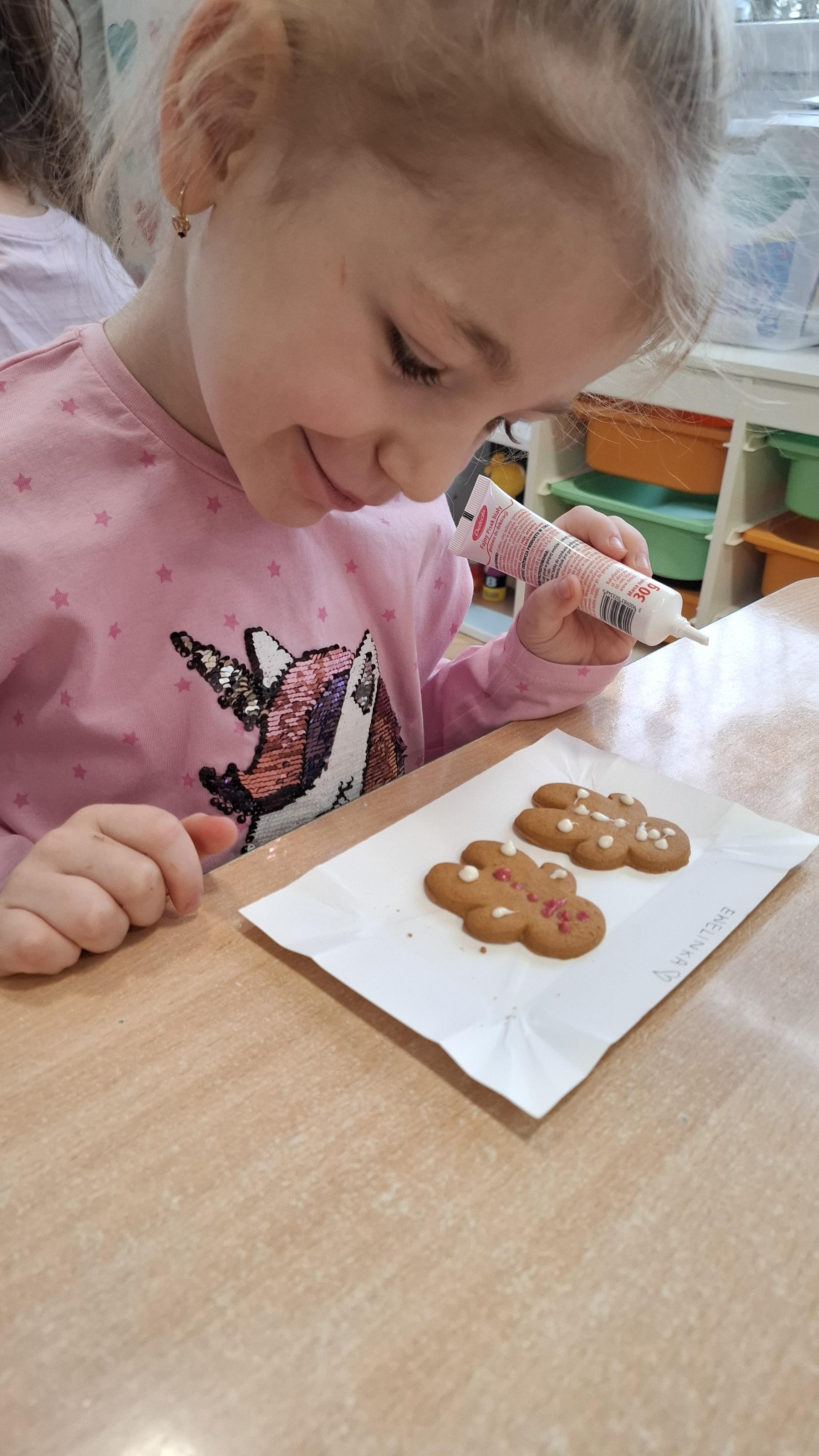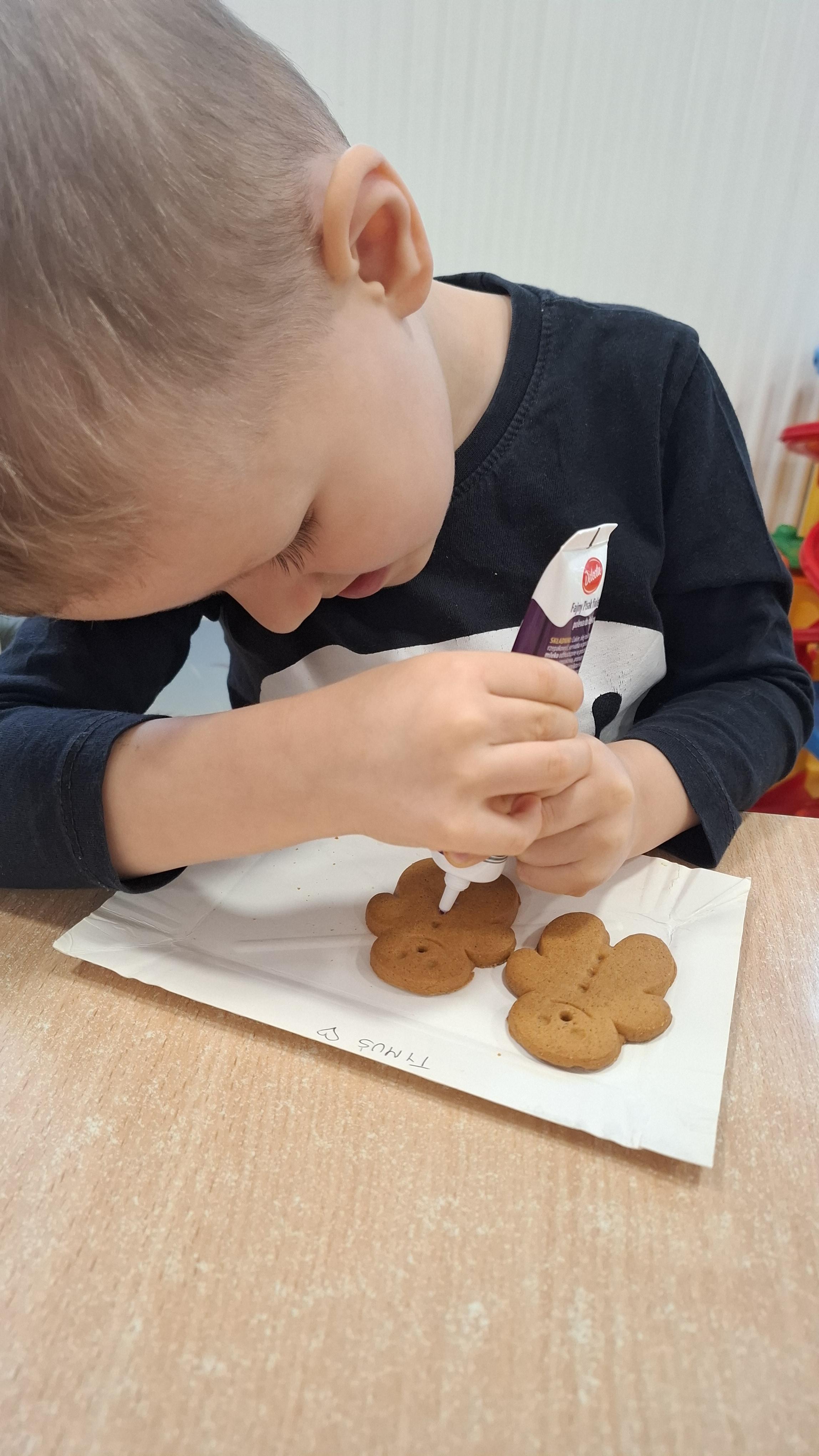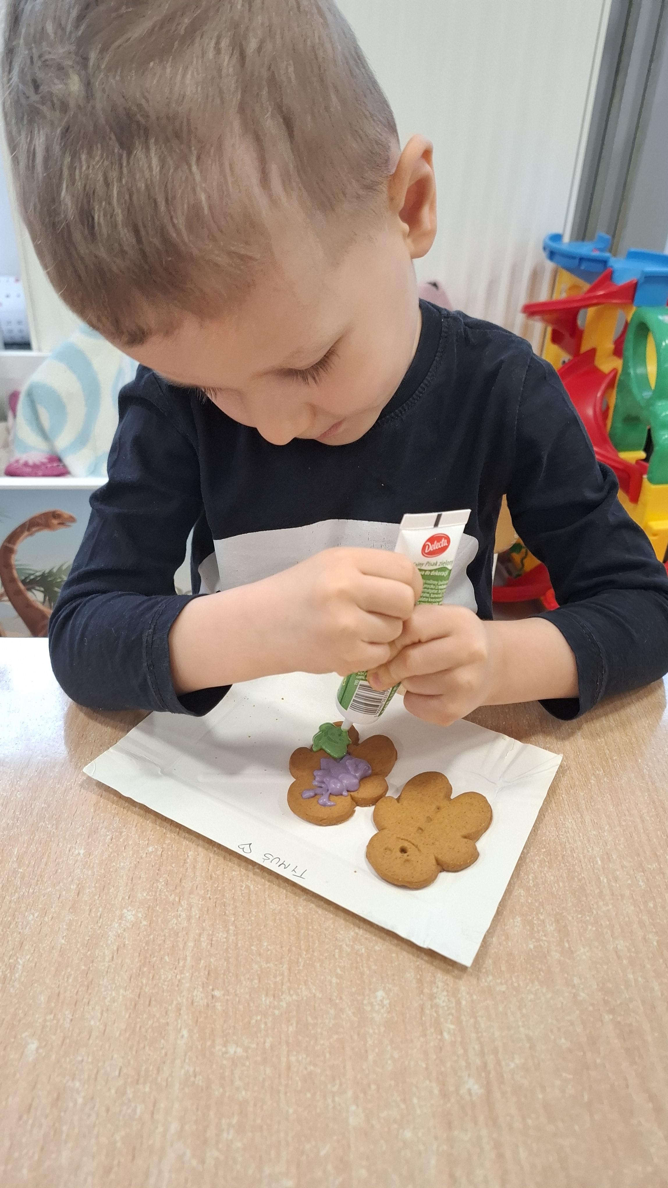 Dzieci z wielkim zapałem dekorowały pierniczki kolorowym lukrem, tworząc własne, wyjątkowe wzory i kształty. Każdy przedszkolak mógł puścić wodze wyobraźni, mieszając kolory i ozdabiając ciasteczka według własnego pomysłu. Wspólne dekorowanie było nie tylko kreatywną zabawą, ale też okazją do ćwiczenia precyzji, cierpliwości i dzielenia się radością z kolegami i koleżankami.