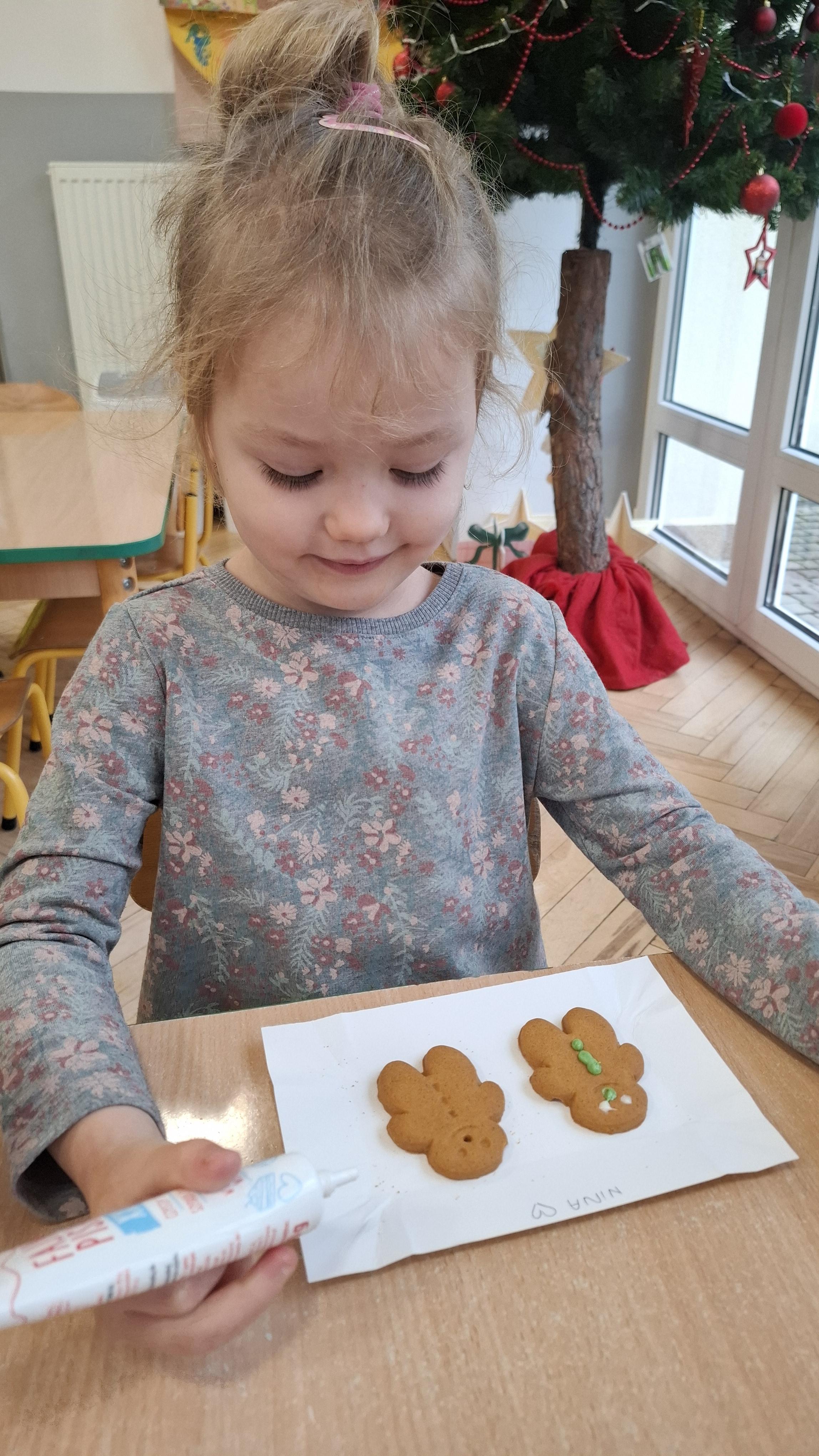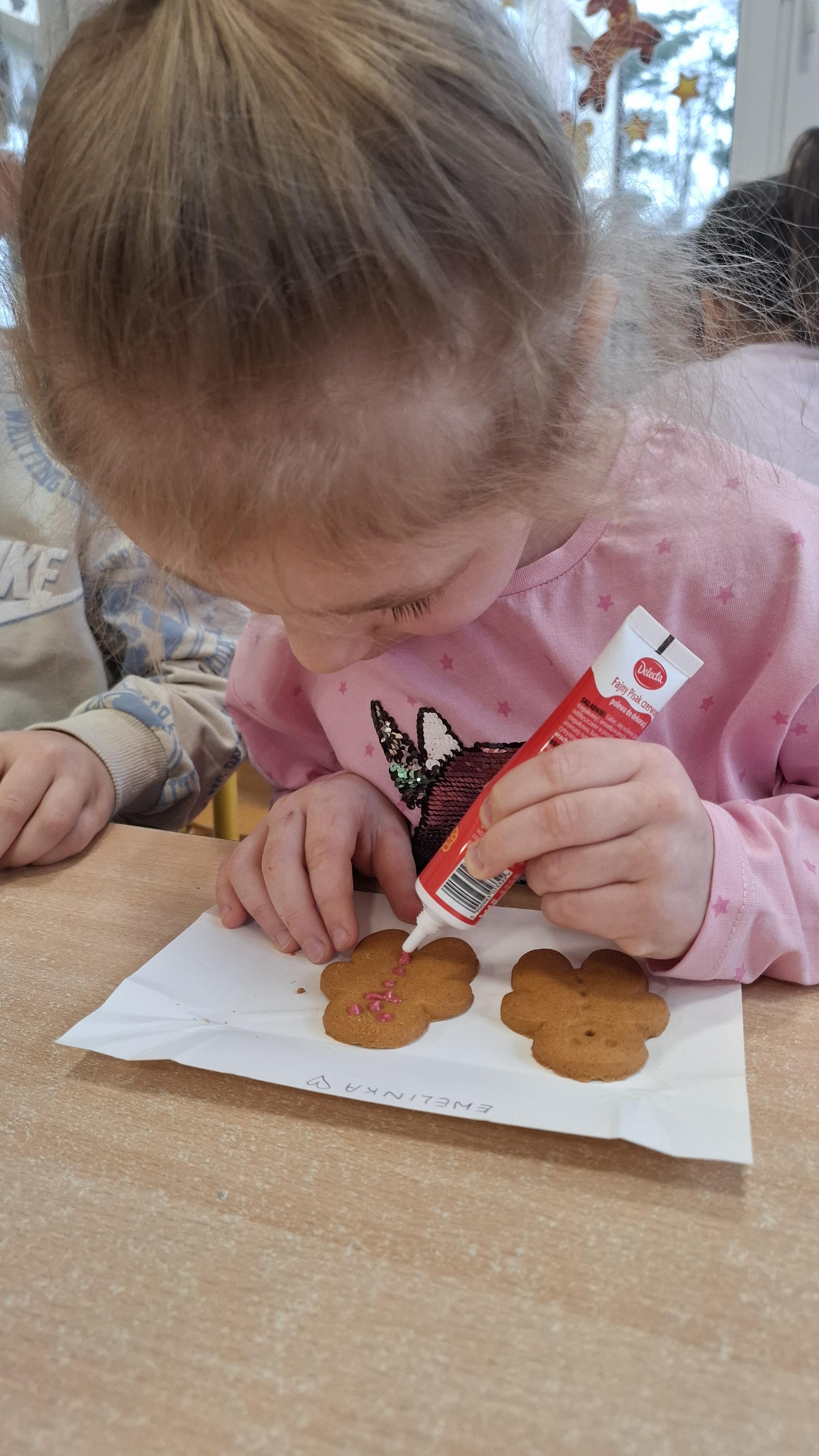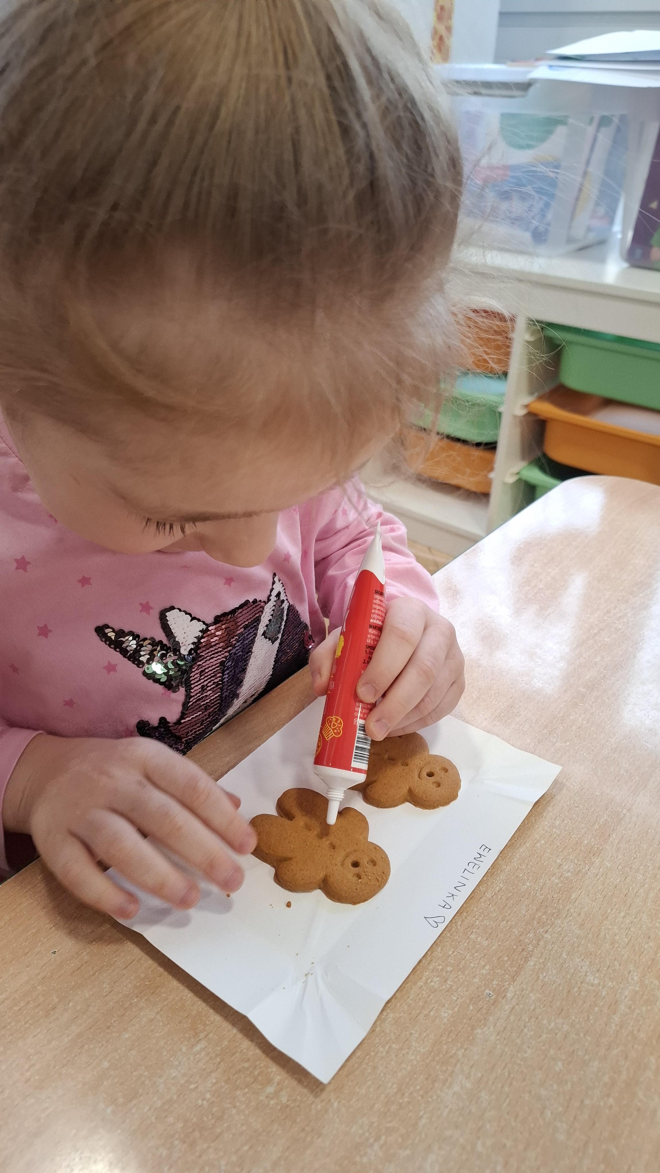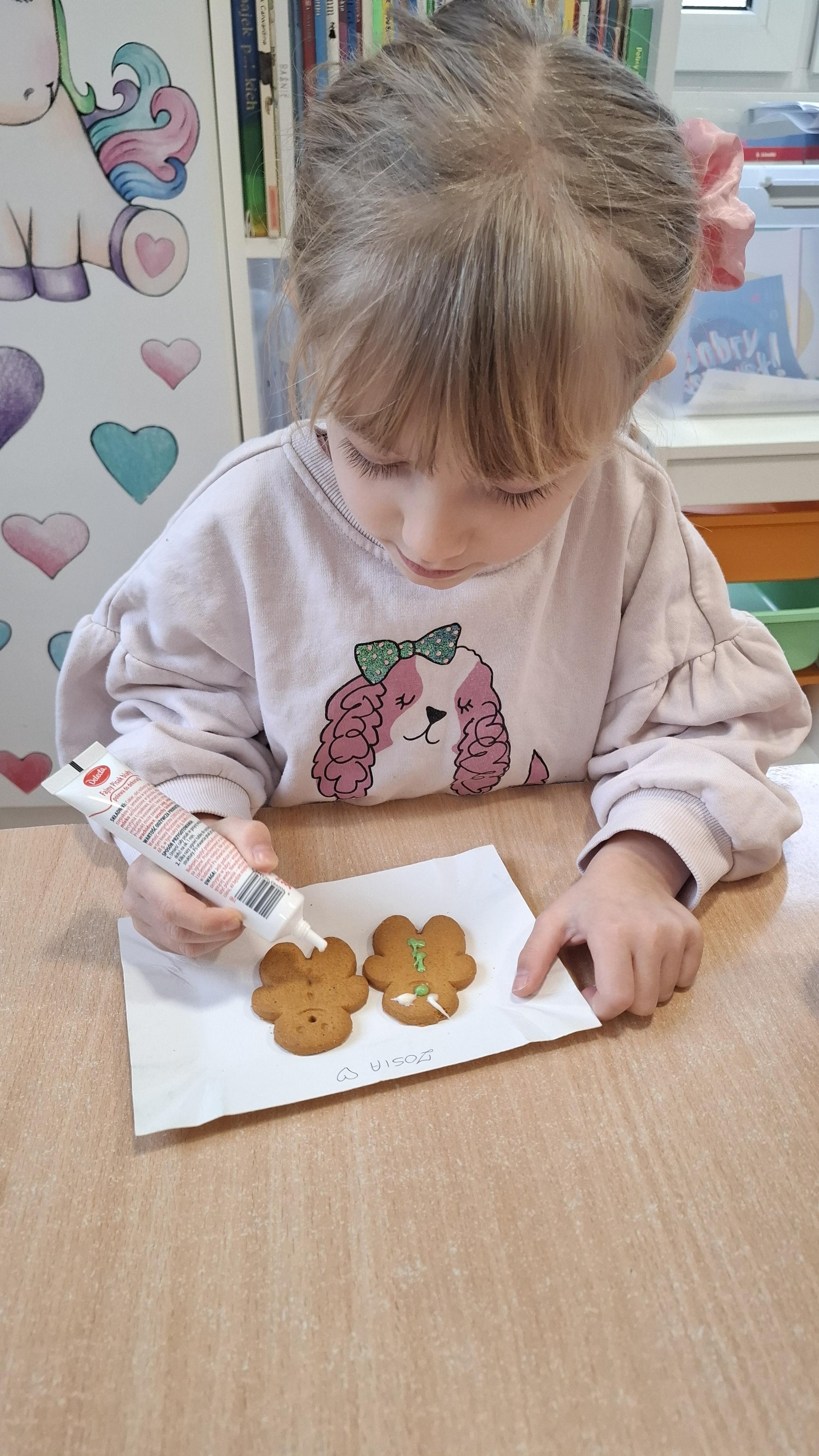 Dzieci z wielkim zapałem dekorowały pierniczki kolorowym lukrem, tworząc własne, wyjątkowe wzory i kształty. Każdy przedszkolak mógł puścić wodze wyobraźni, mieszając kolory i ozdabiając ciasteczka według własnego pomysłu. Wspólne dekorowanie było nie tylko kreatywną zabawą, ale też okazją do ćwiczenia precyzji, cierpliwości i dzielenia się radością z kolegami i koleżankami.