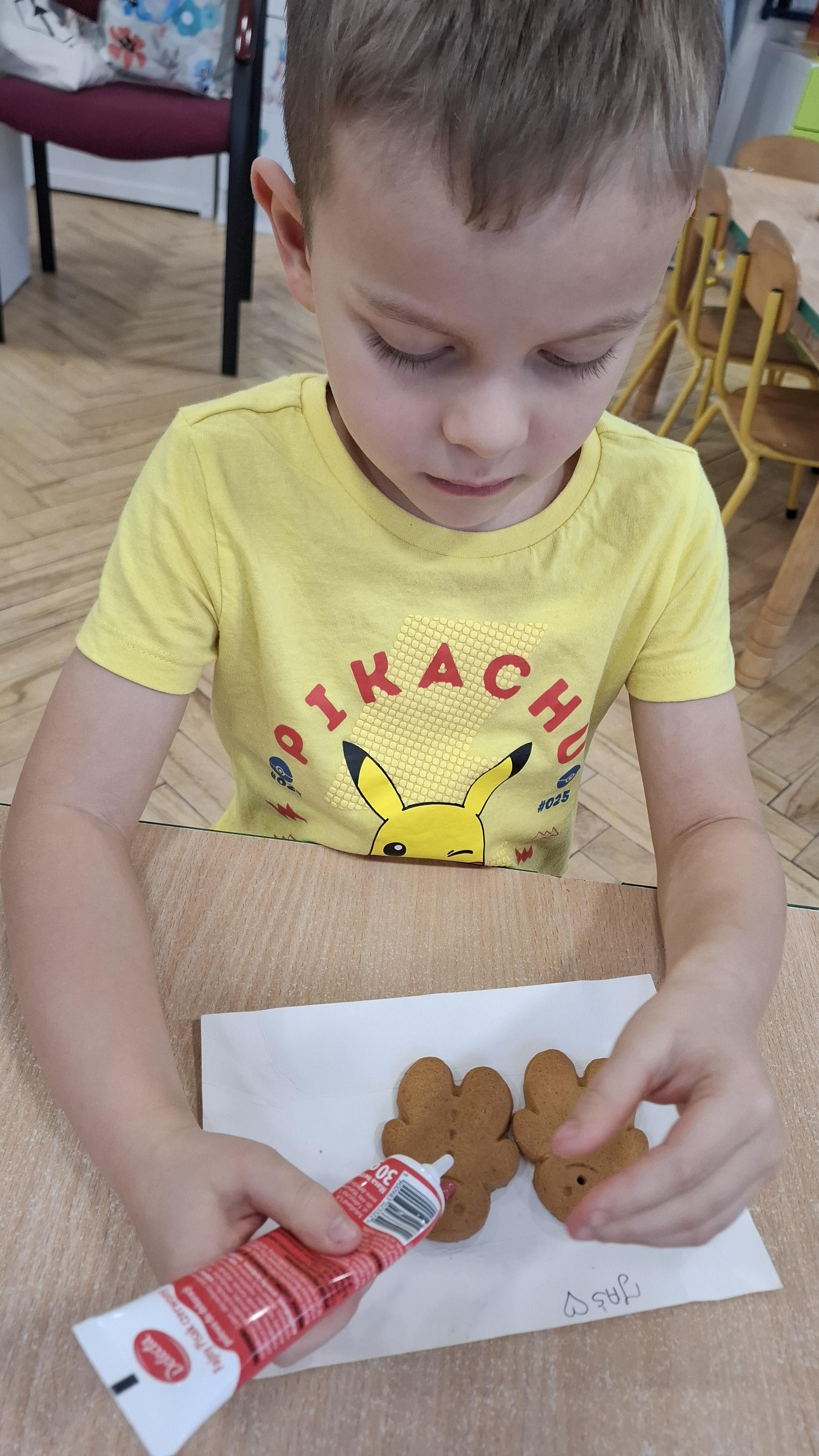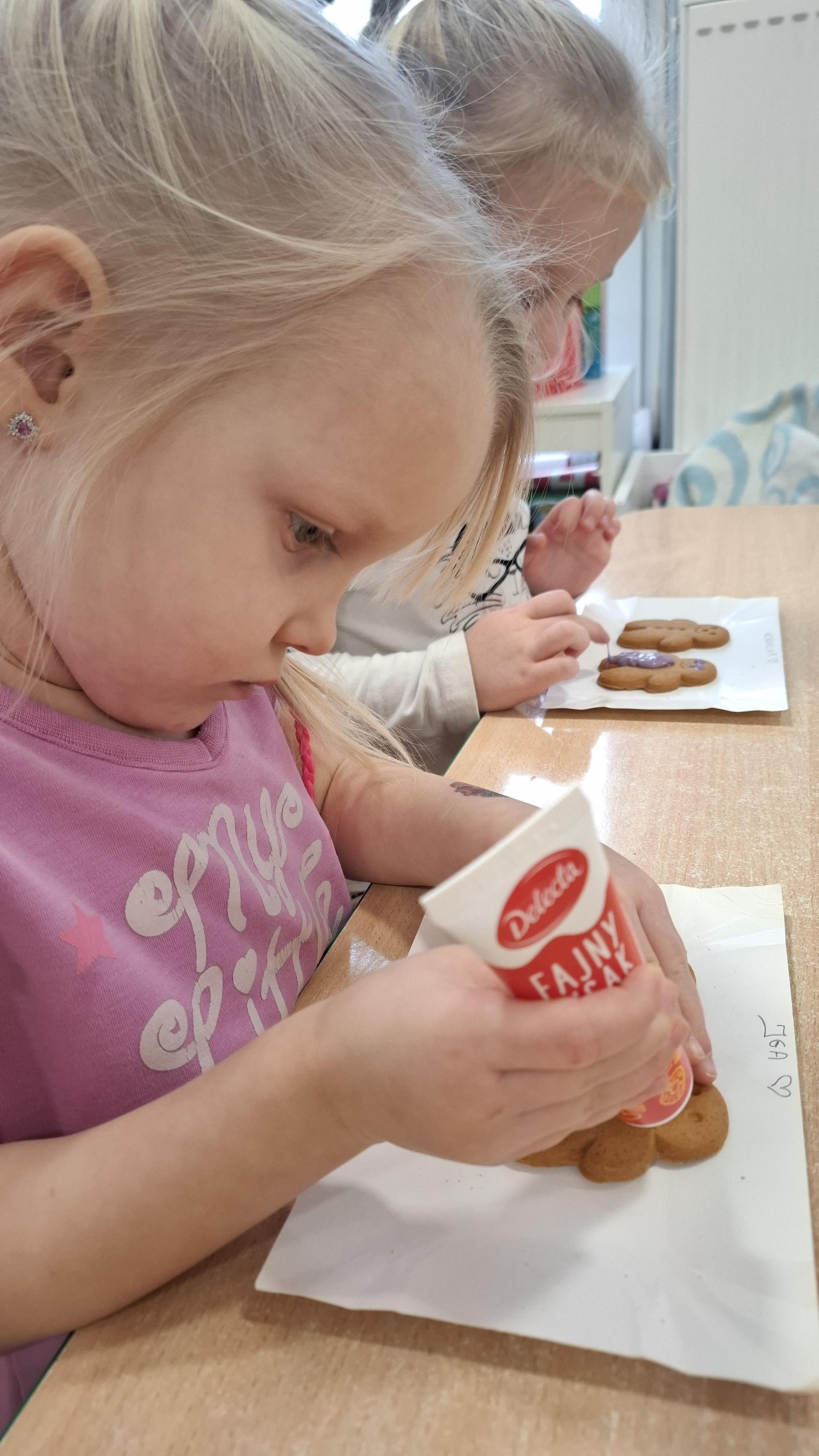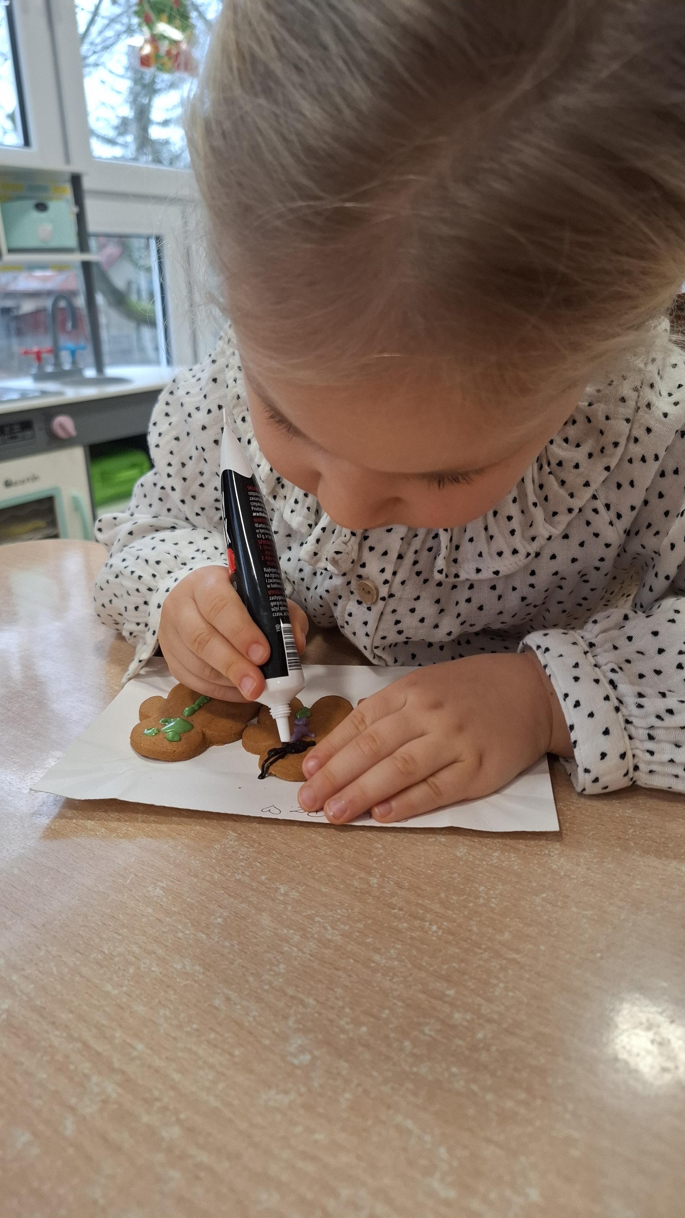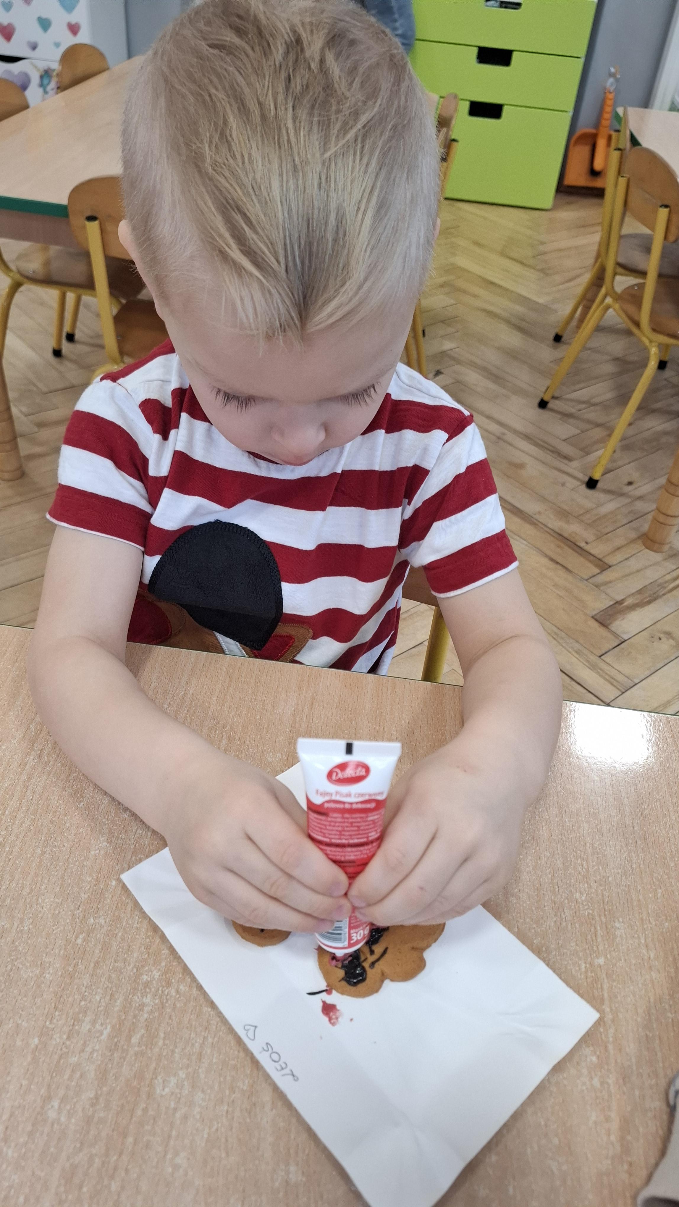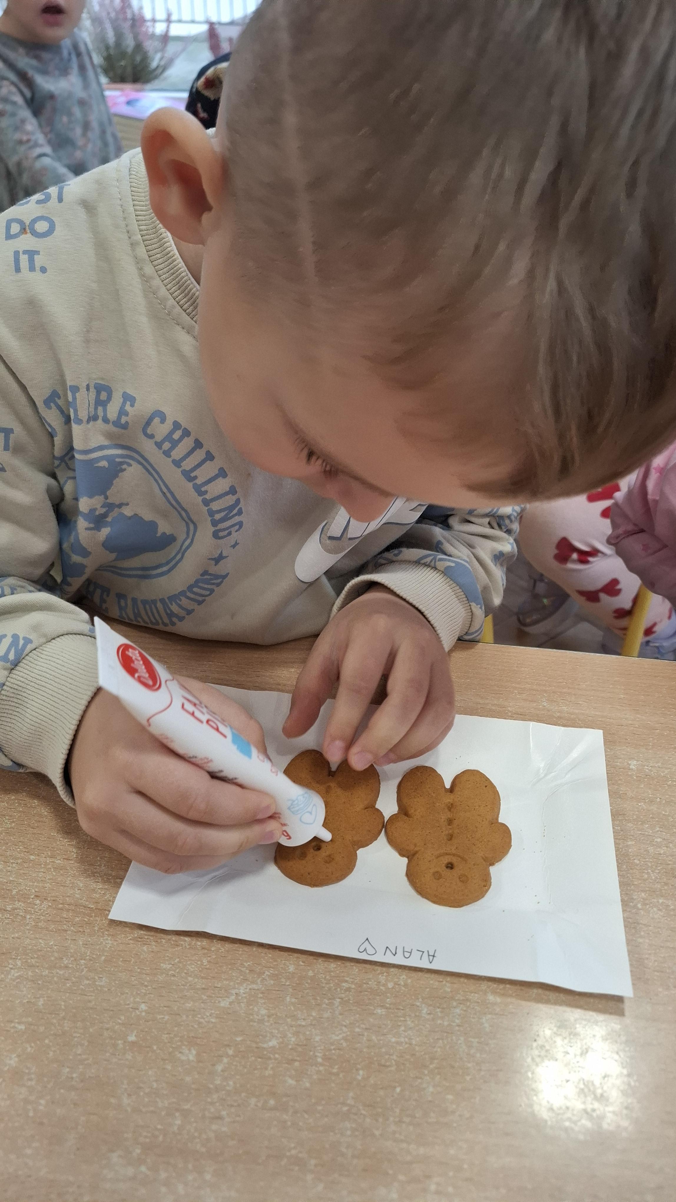 Dzieci z wielkim zapałem dekorowały pierniczki kolorowym lukrem, tworząc własne, wyjątkowe wzory i kształty. Każdy przedszkolak mógł puścić wodze wyobraźni, mieszając kolory i ozdabiając ciasteczka według własnego pomysłu. Wspólne dekorowanie było nie tylko kreatywną zabawą, ale też okazją do ćwiczenia precyzji, cierpliwości i dzielenia się radością z kolegami i koleżankami.