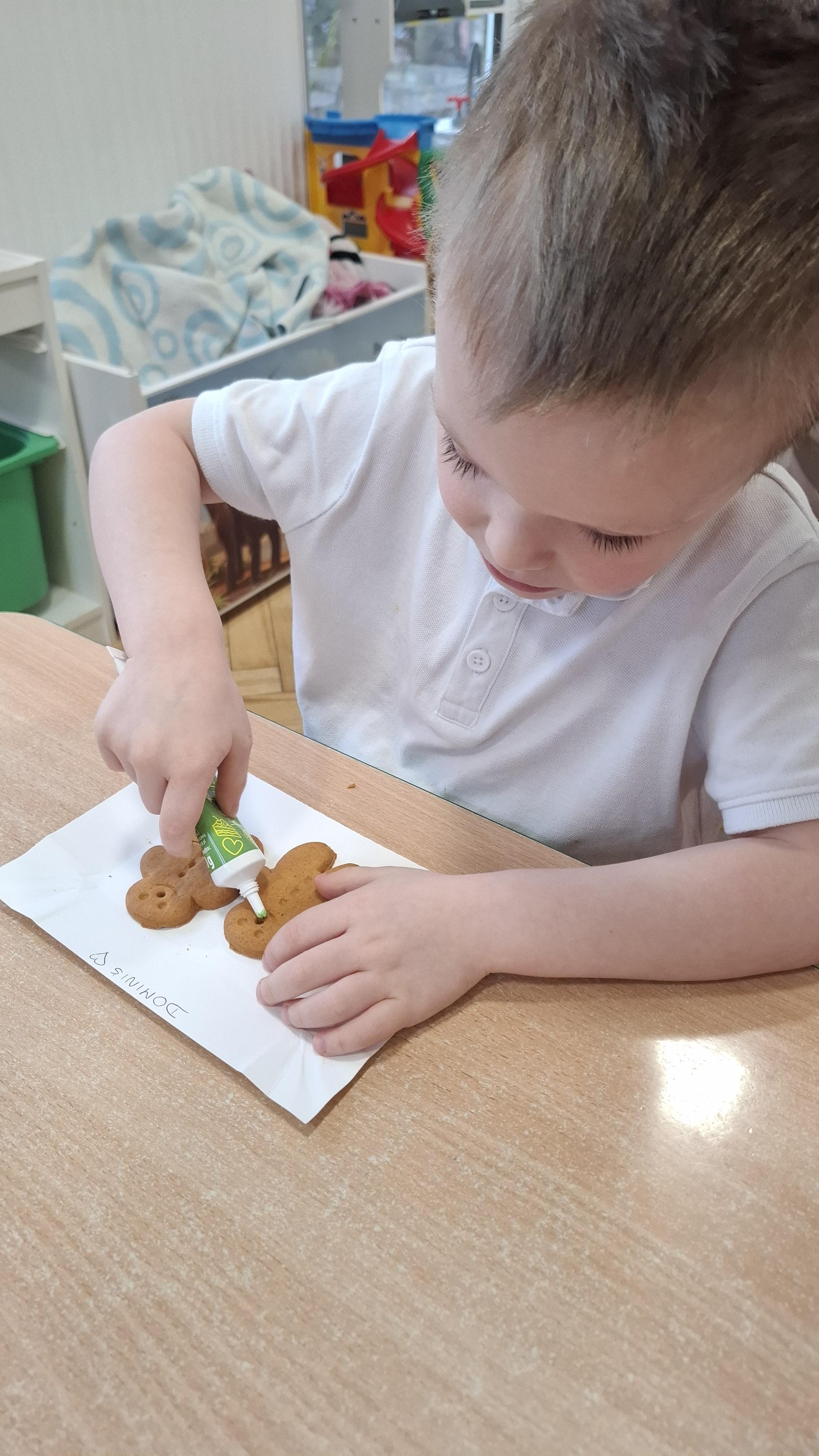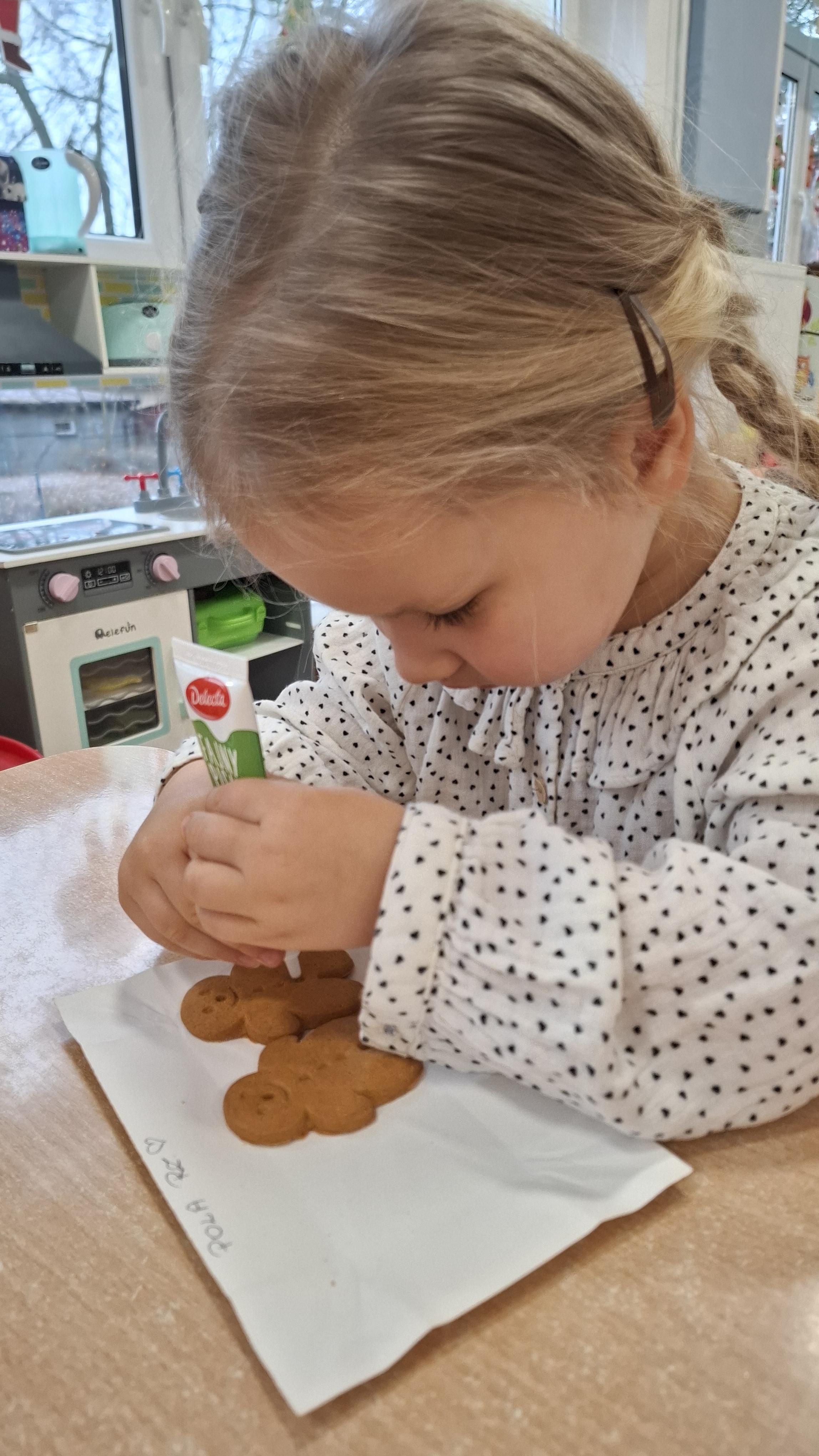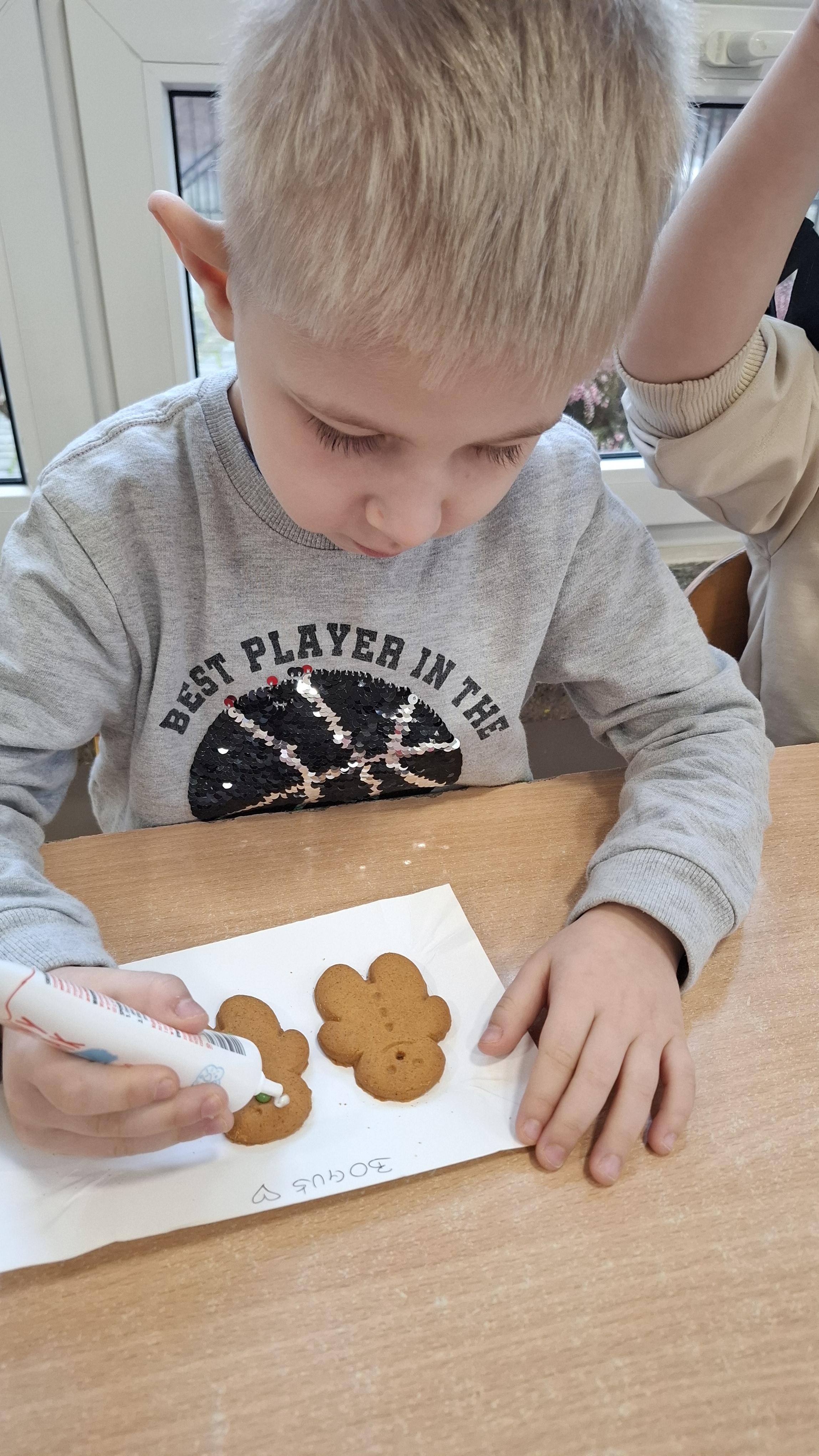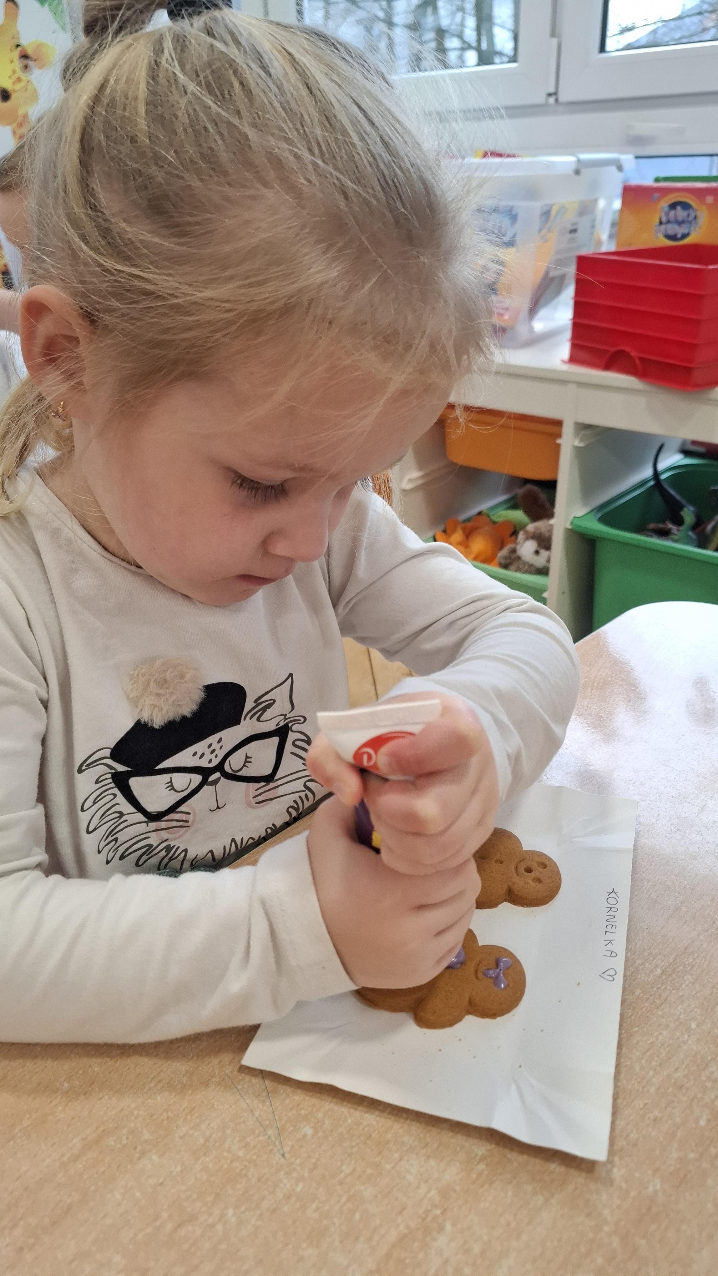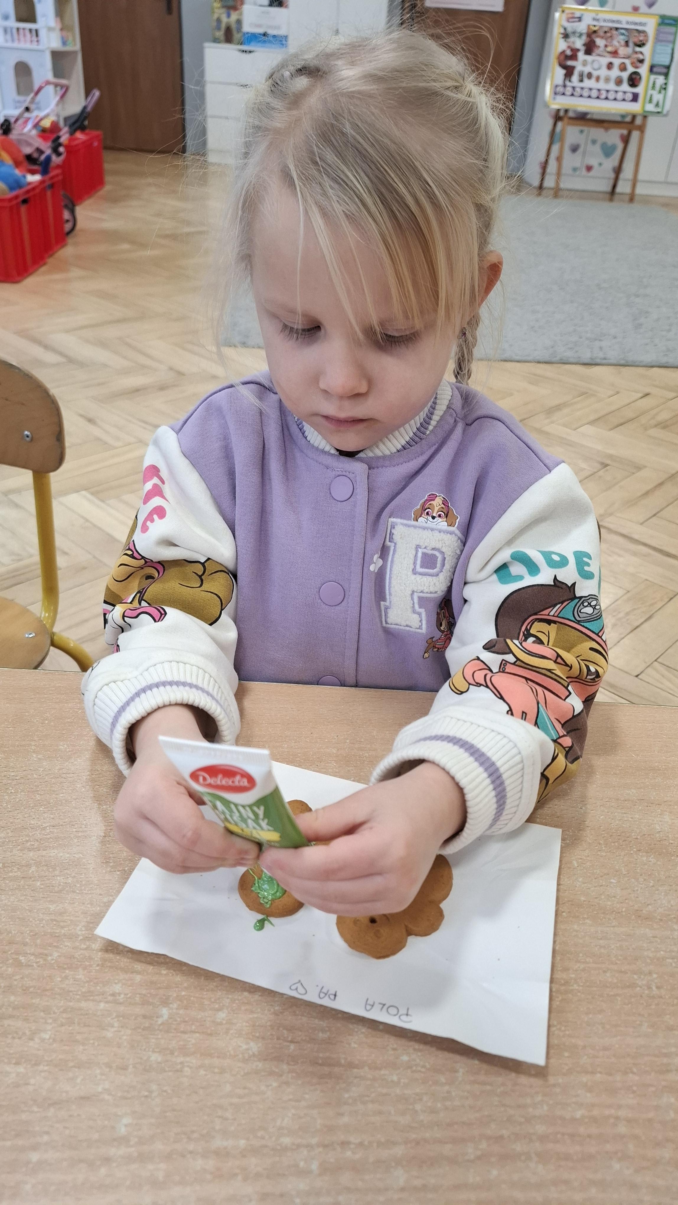 Dzieci z wielkim zapałem dekorowały pierniczki kolorowym lukrem, tworząc własne, wyjątkowe wzory i kształty. Każdy przedszkolak mógł puścić wodze wyobraźni, mieszając kolory i ozdabiając ciasteczka według własnego pomysłu. Wspólne dekorowanie było nie tylko kreatywną zabawą, ale też okazją do ćwiczenia precyzji, cierpliwości i dzielenia się radością z kolegami i koleżankami.