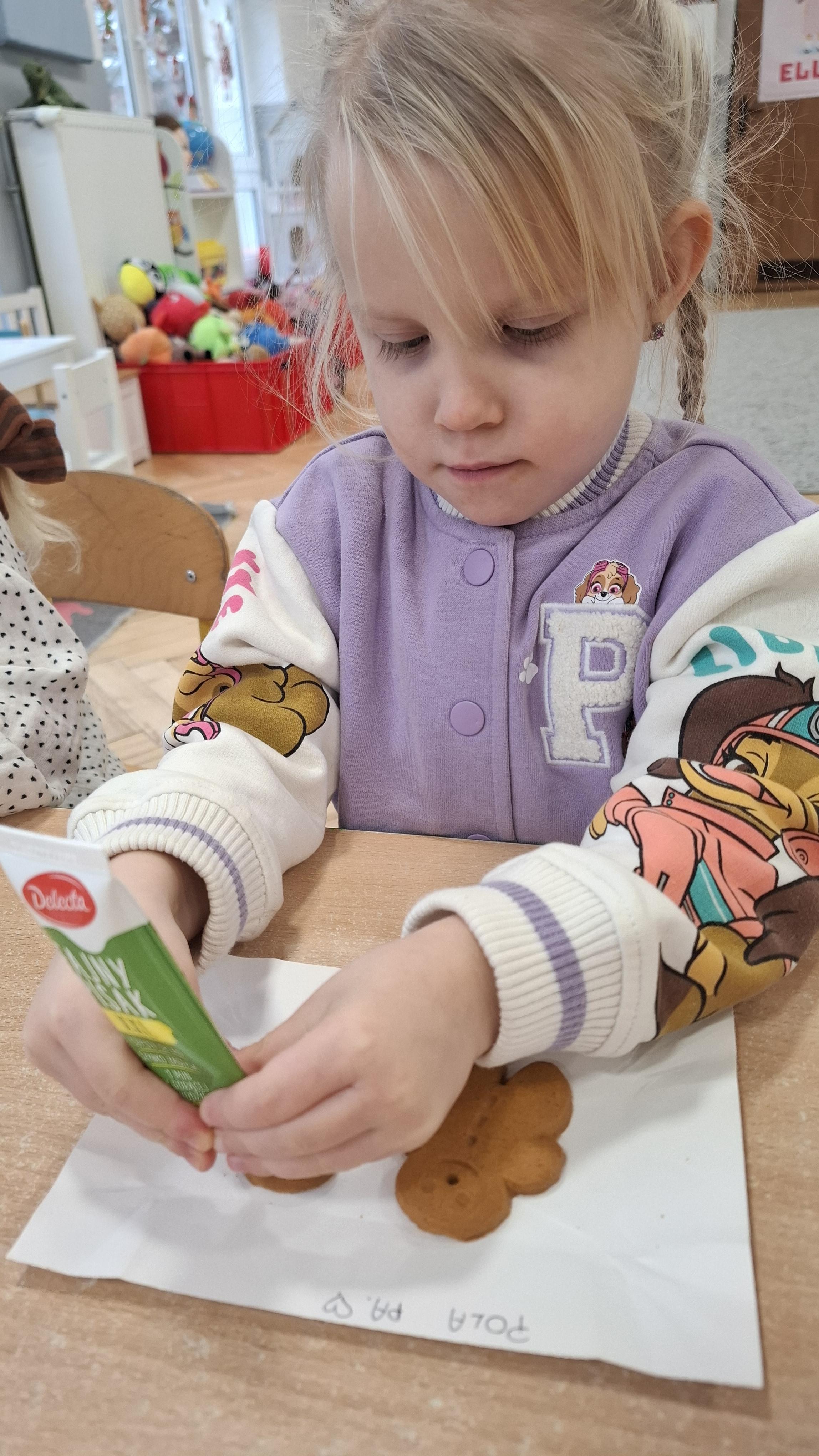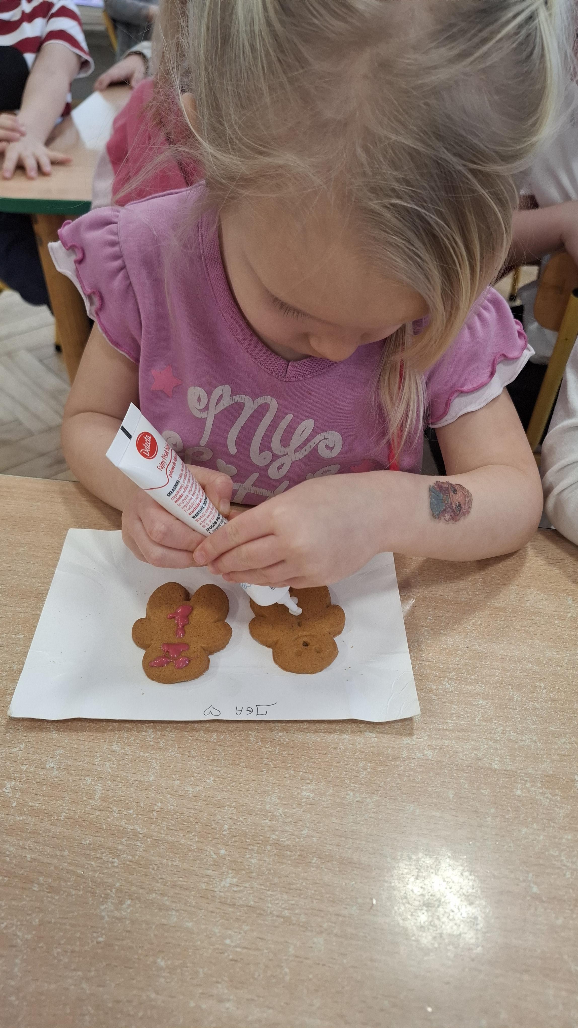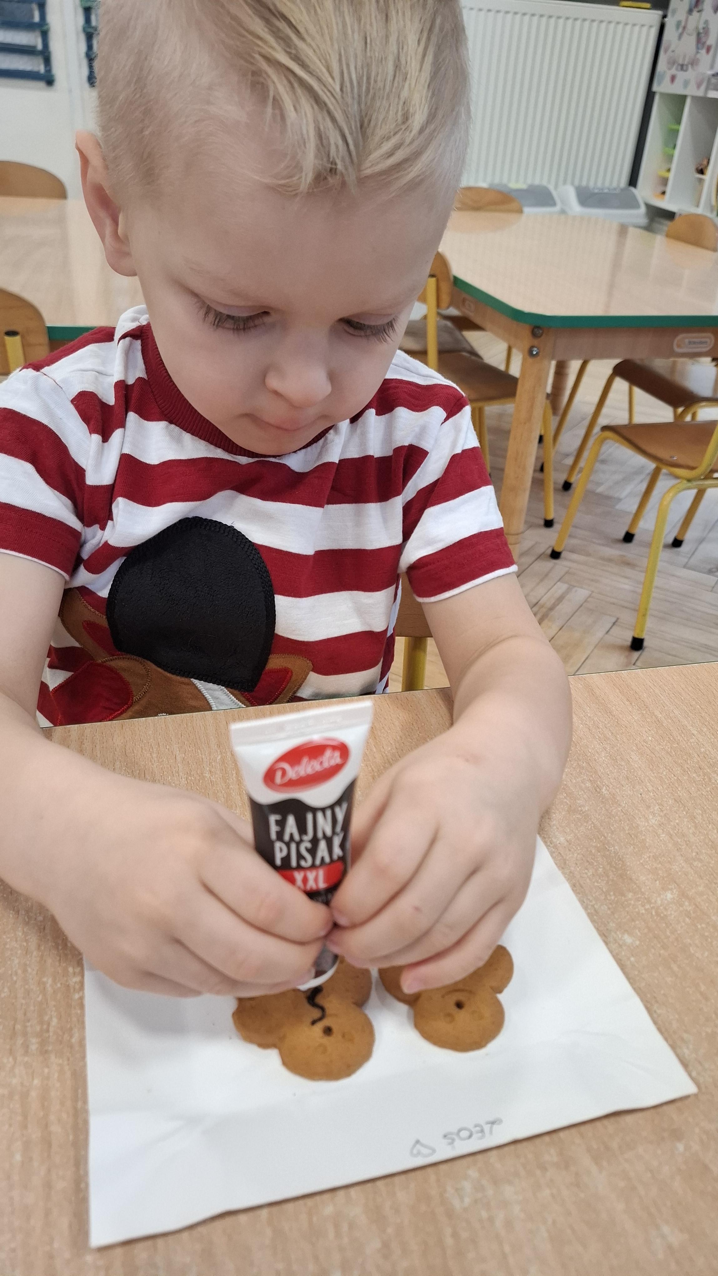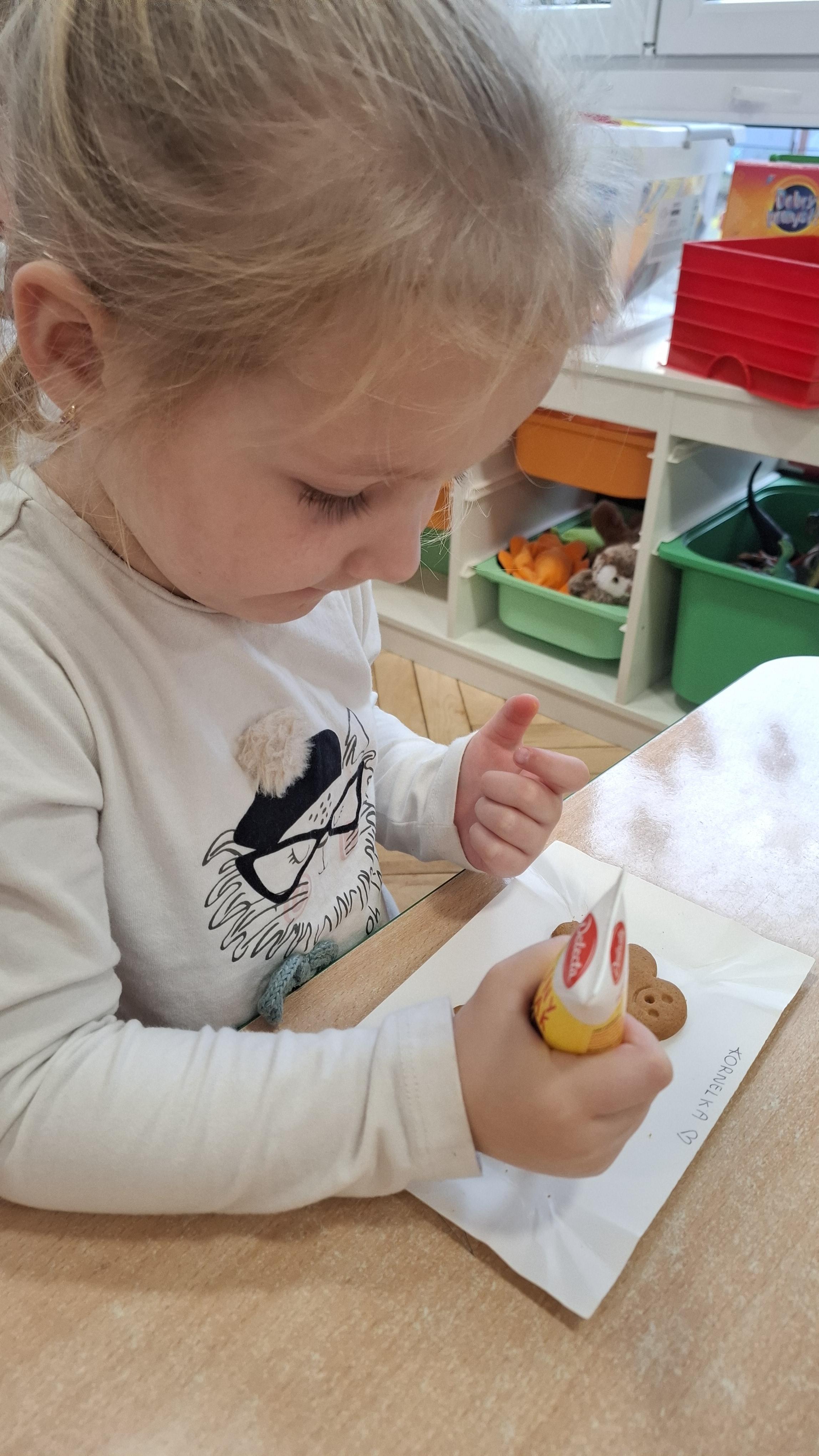Dzieci z wielkim zapałem dekorowały pierniczki kolorowym lukrem, tworząc własne, wyjątkowe wzory i kształty. Każdy przedszkolak mógł puścić wodze wyobraźni, mieszając kolory i ozdabiając ciasteczka według własnego pomysłu. Wspólne dekorowanie było nie tylko kreatywną zabawą, ale też okazją do ćwiczenia precyzji, cierpliwości i dzielenia się radością z kolegami i koleżankami.