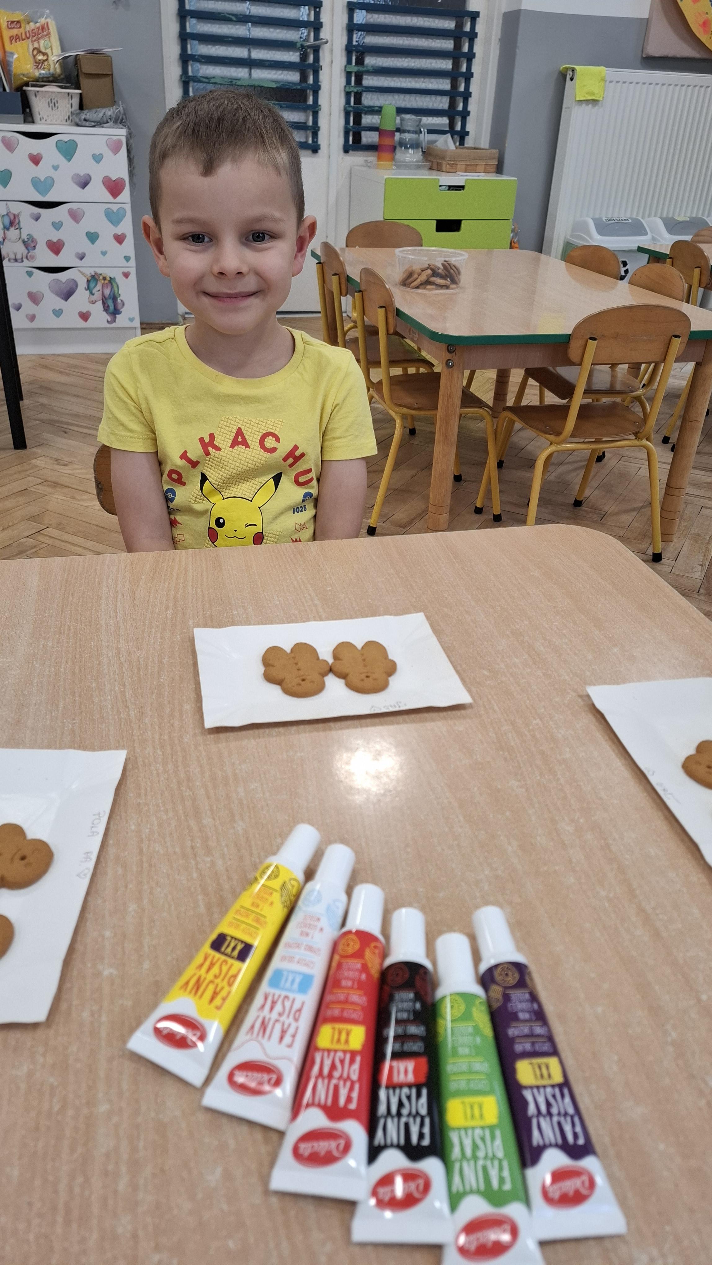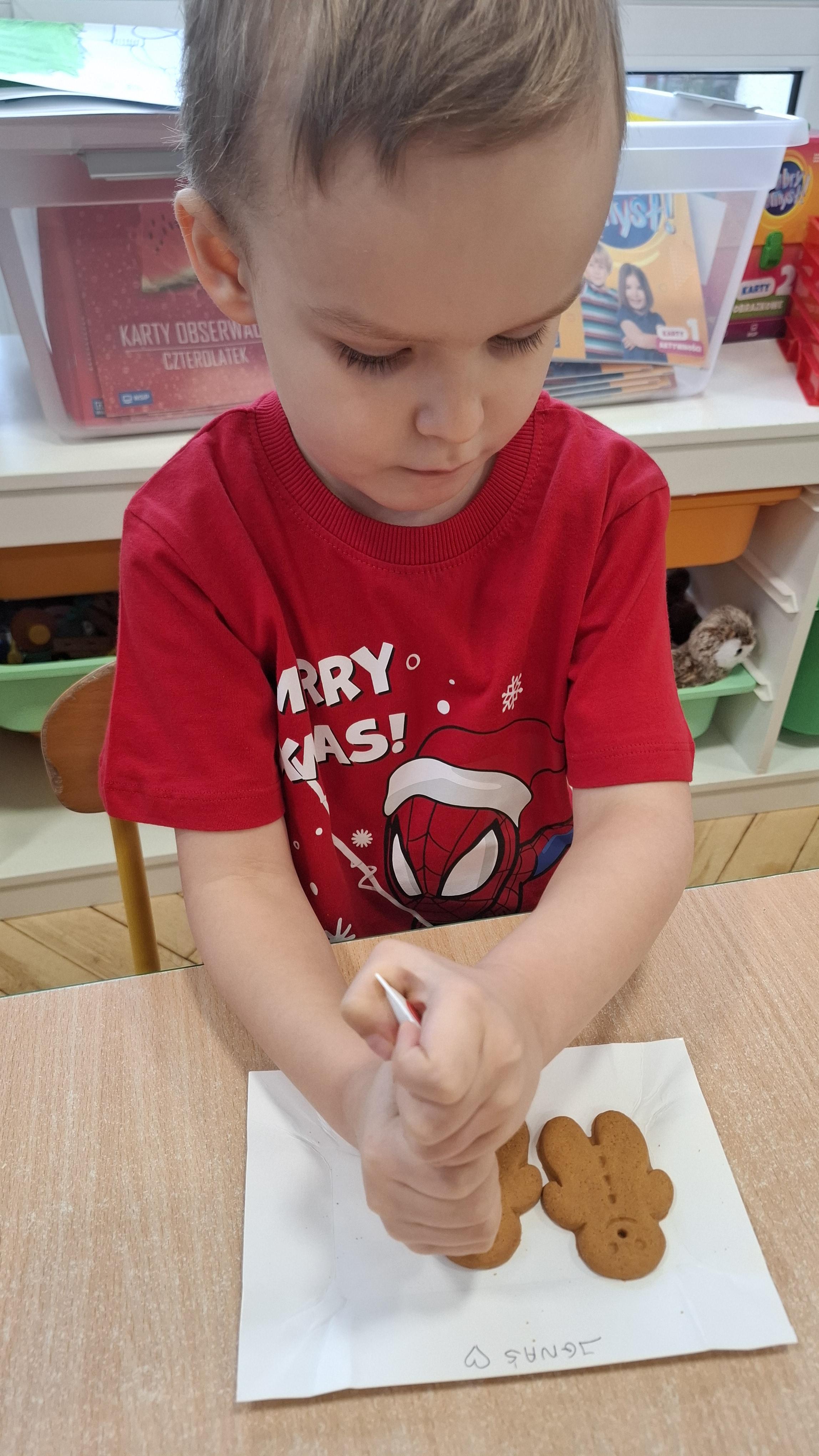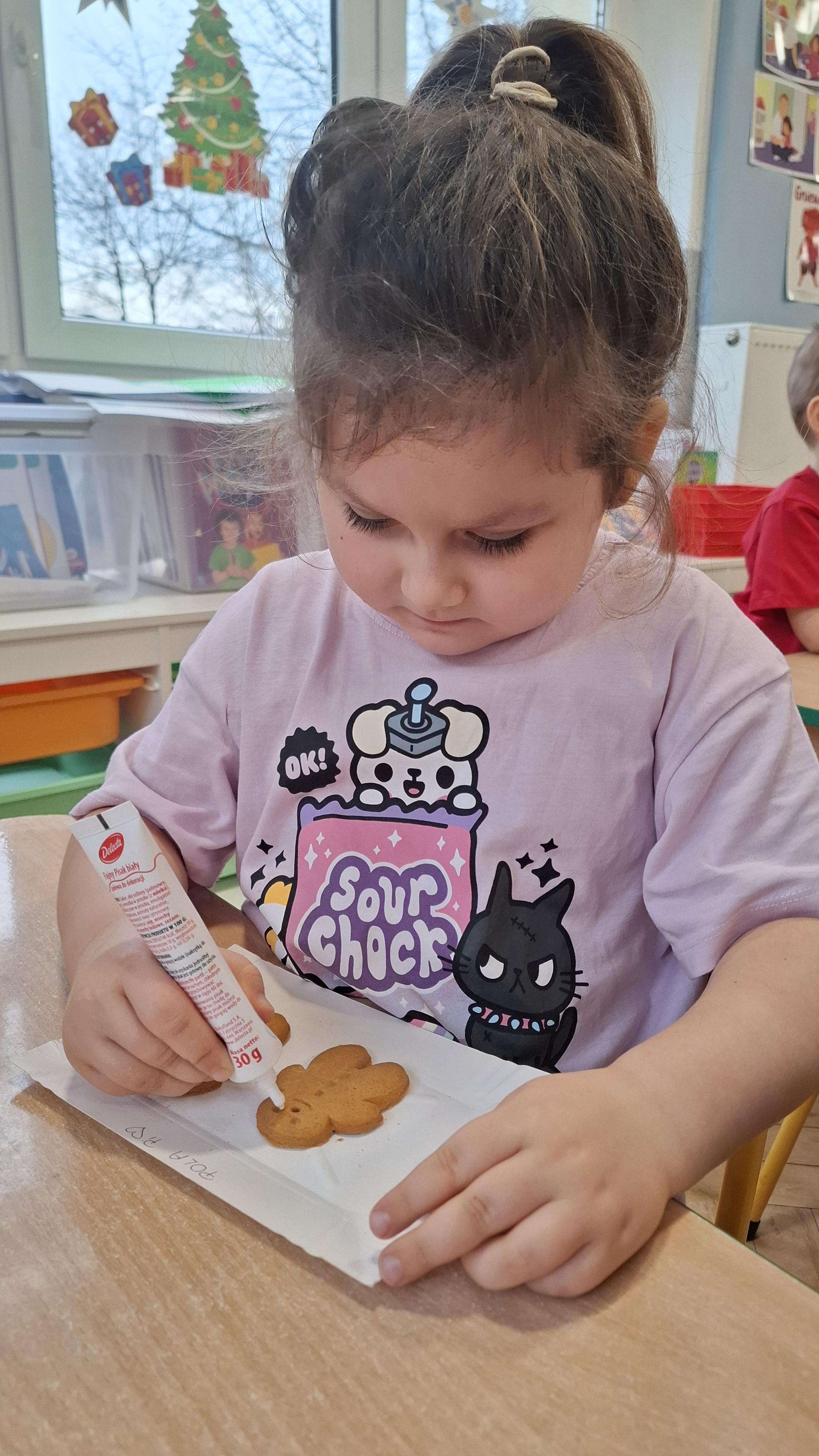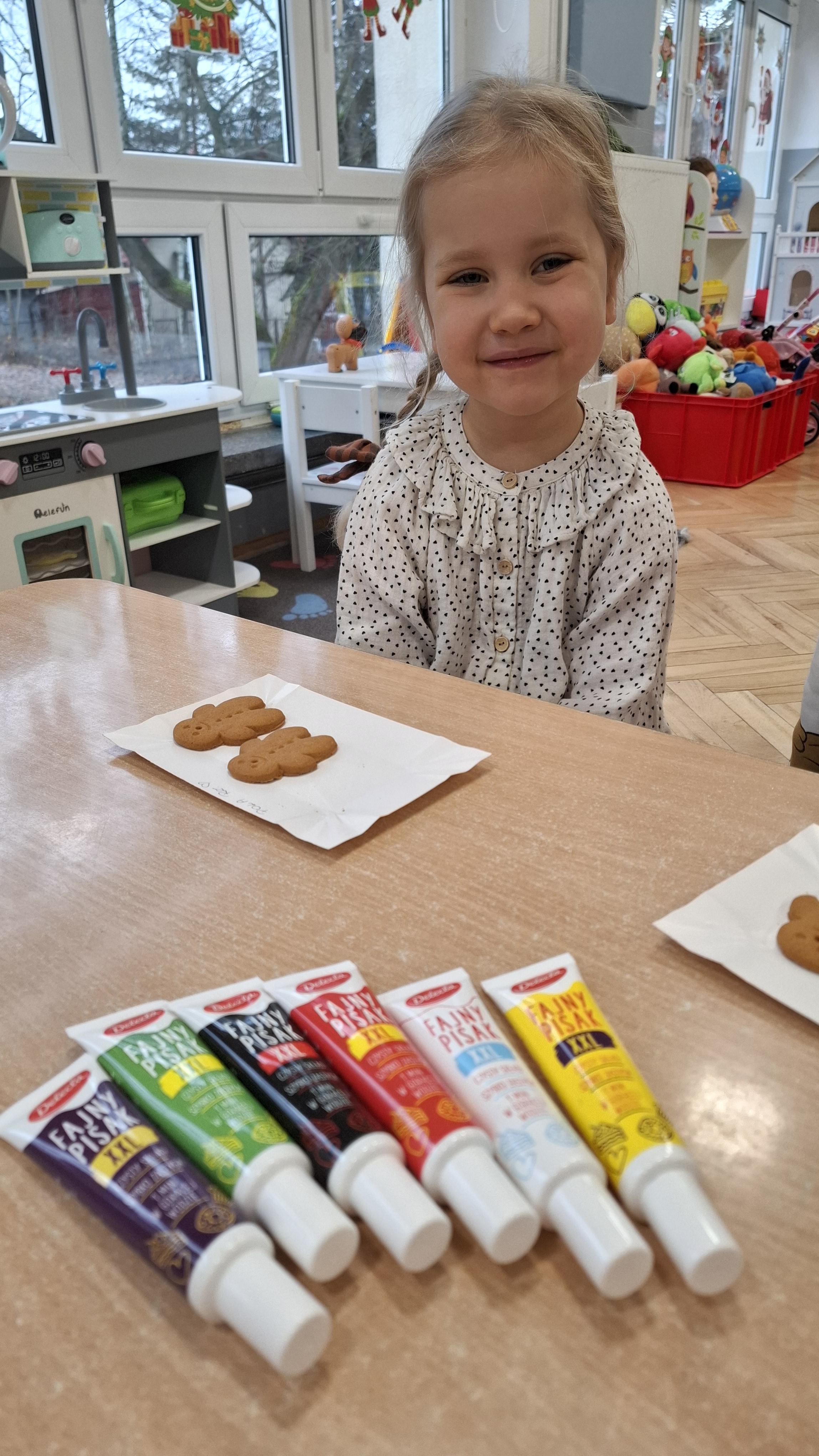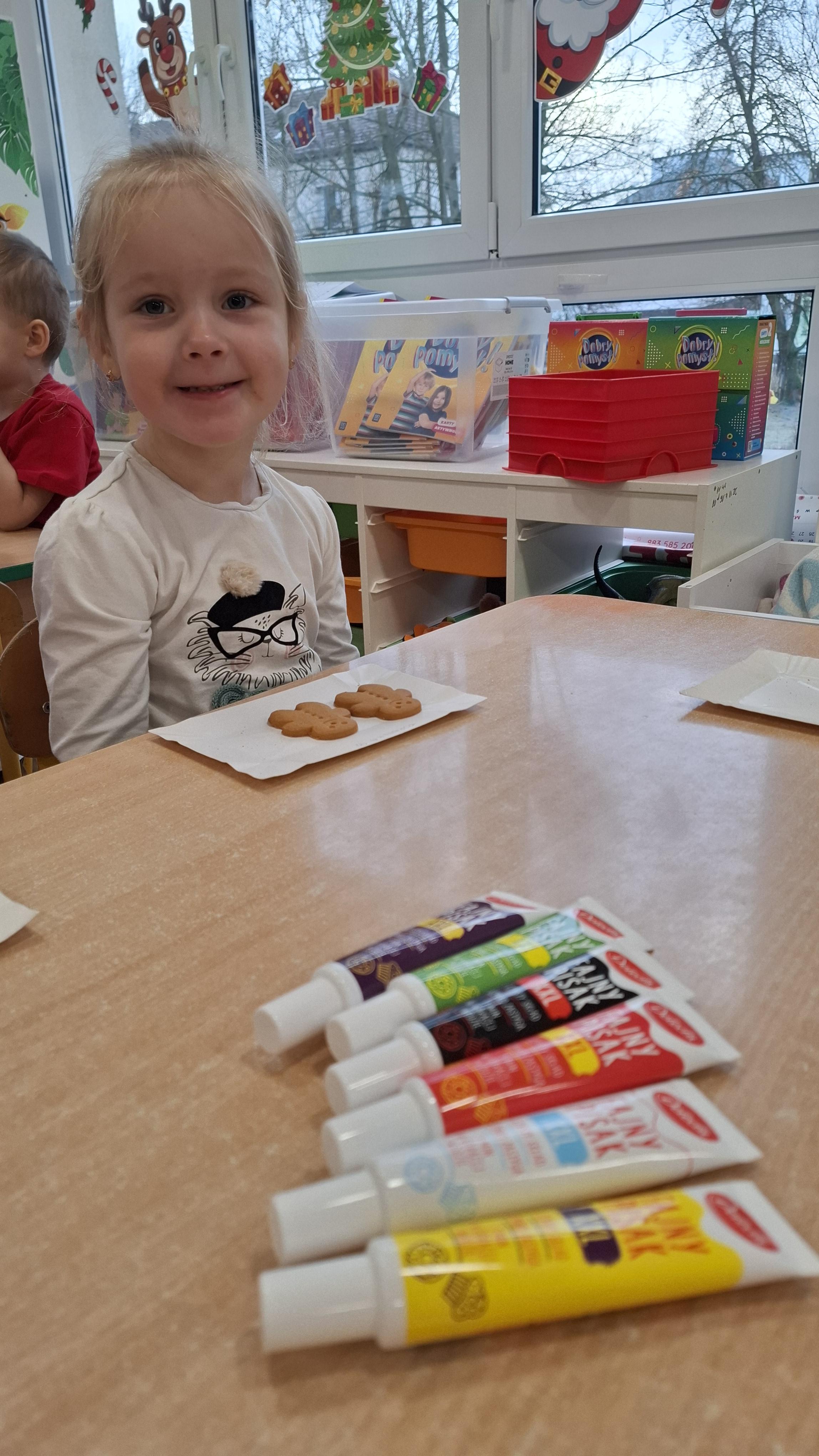 Dzieci z wielkim zapałem dekorowały pierniczki kolorowym lukrem, tworząc własne, wyjątkowe wzory i kształty. Każdy przedszkolak mógł puścić wodze wyobraźni, mieszając kolory i ozdabiając ciasteczka według własnego pomysłu. Wspólne dekorowanie było nie tylko kreatywną zabawą, ale też okazją do ćwiczenia precyzji, cierpliwości i dzielenia się radością z kolegami i koleżankami.