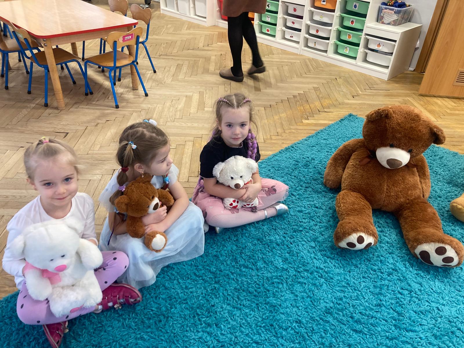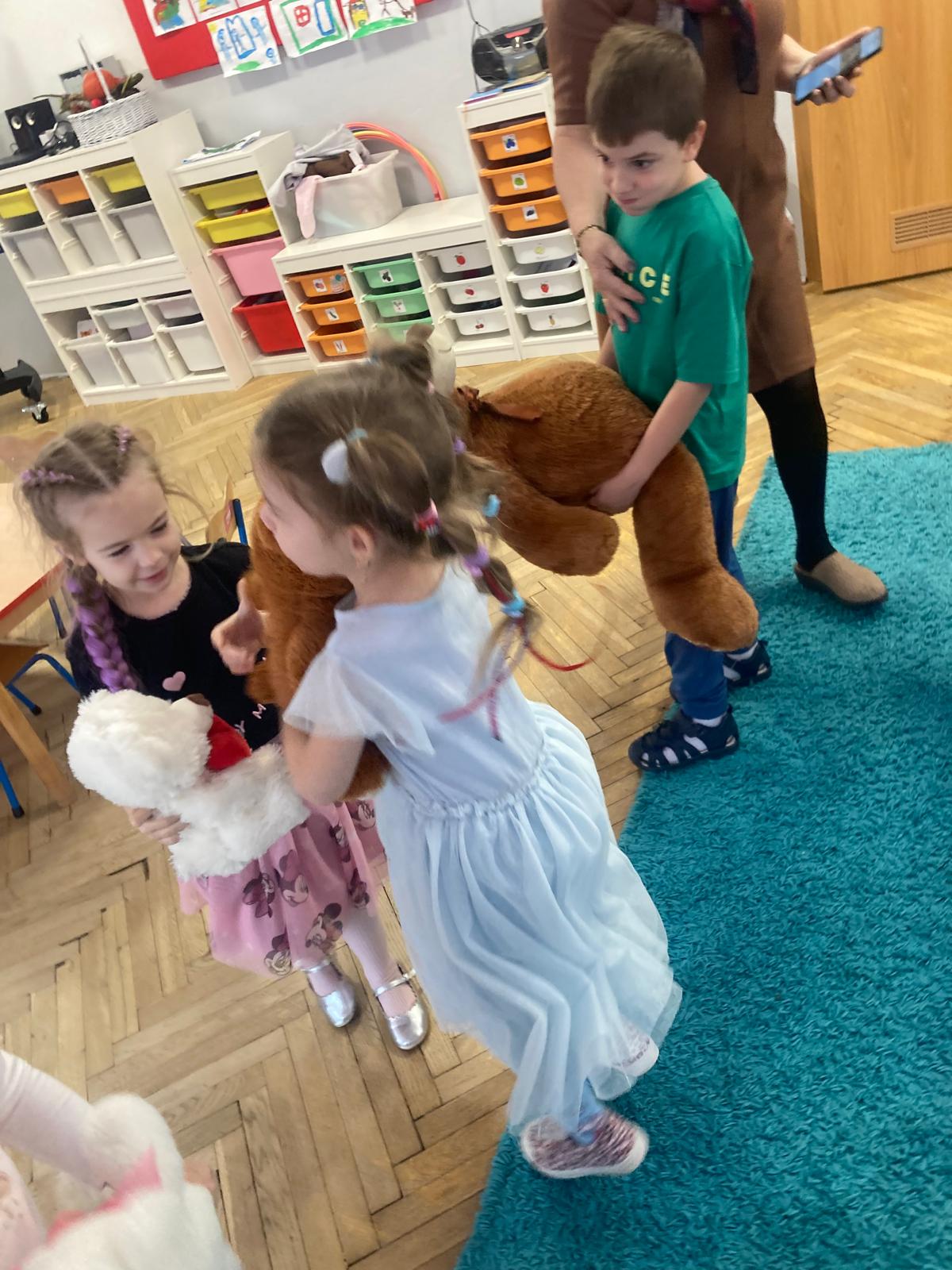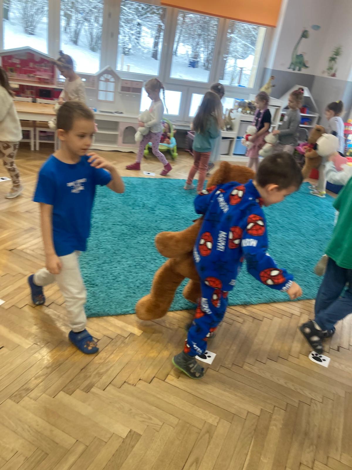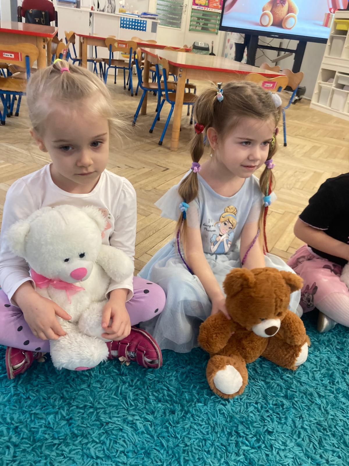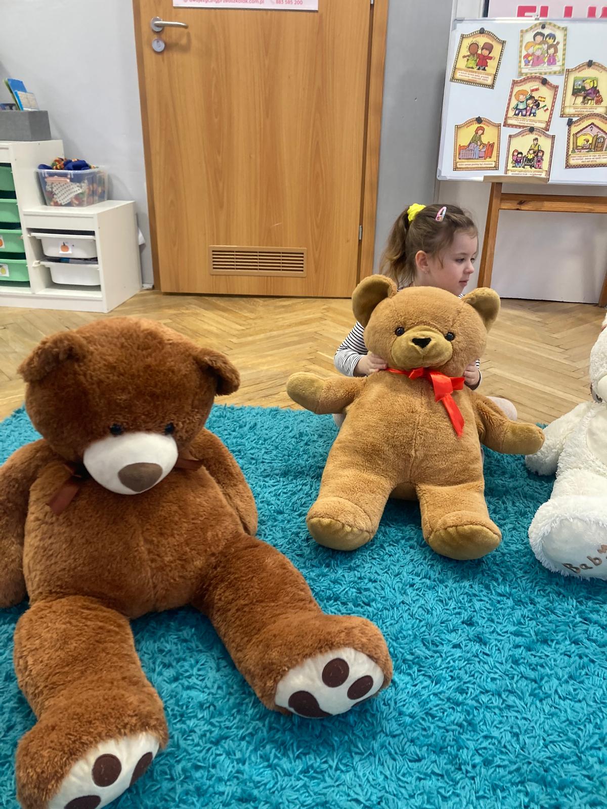 Dzisiaj do przedszkola dzieciaki przyniosły swoje przytualnki-misie.Pluszaki byly dziś przedmiotem zabaw.Był misiowa dyskoteka, szukanie "po śladzie misia" dzieci dotarly do misiowych niespodzianek.Z misiami utrwalaliśmy pojecia o przestrzeni: na, po,obok,za. Rozmawialiśmy o różnych misiach znanych dzieciom z bajek a także o tym czym miś jest dla dziecka. Badalismy misia sensorycznie-Jaki miś jest w dotyku? Misiowe zabawy uzupelniliśmy o słuchanie bajeczki w języku angielskim, osluchujac się z angiielska nazwą pluszaka"Teddy bear".Na koniec pamiątkowa fotografia a także praca plastyczna- kolorowanie dyplomu "Przyjaciel pluszowego misia". ??