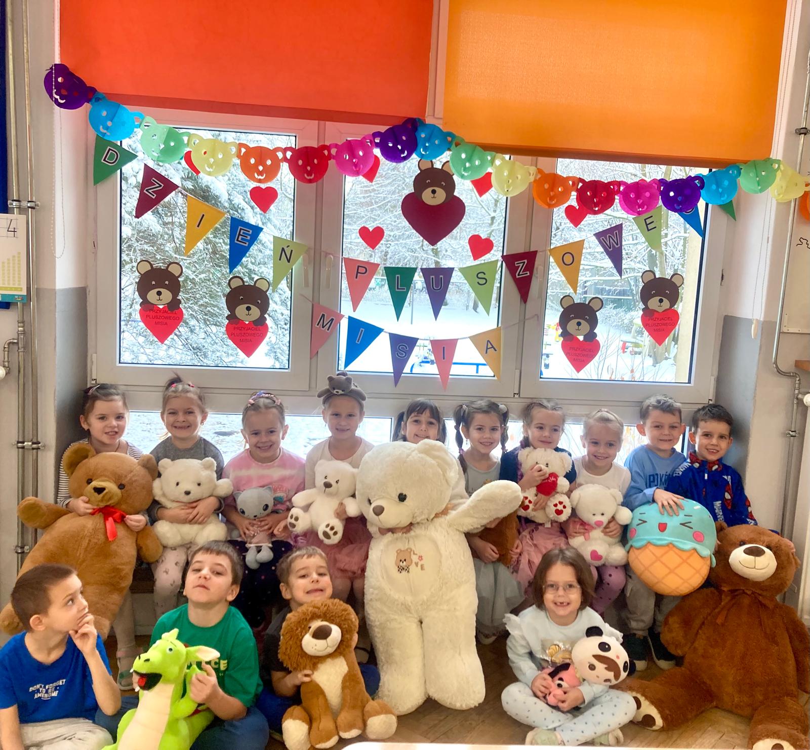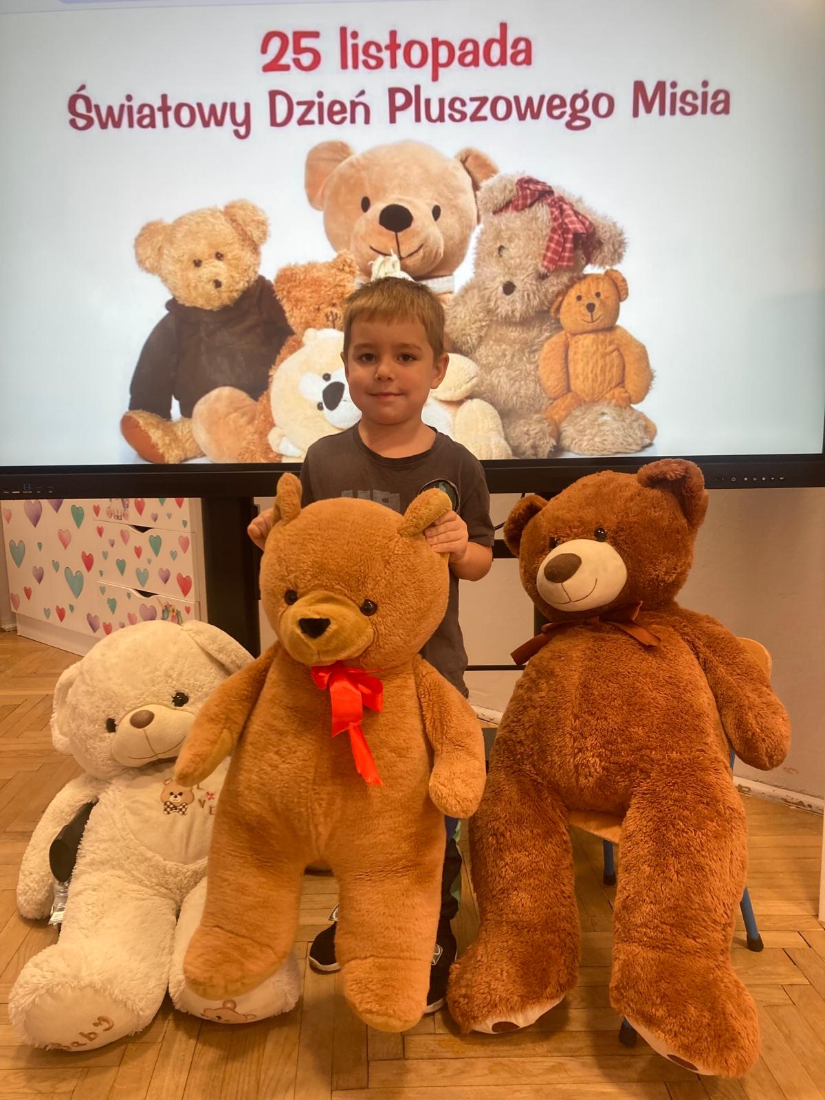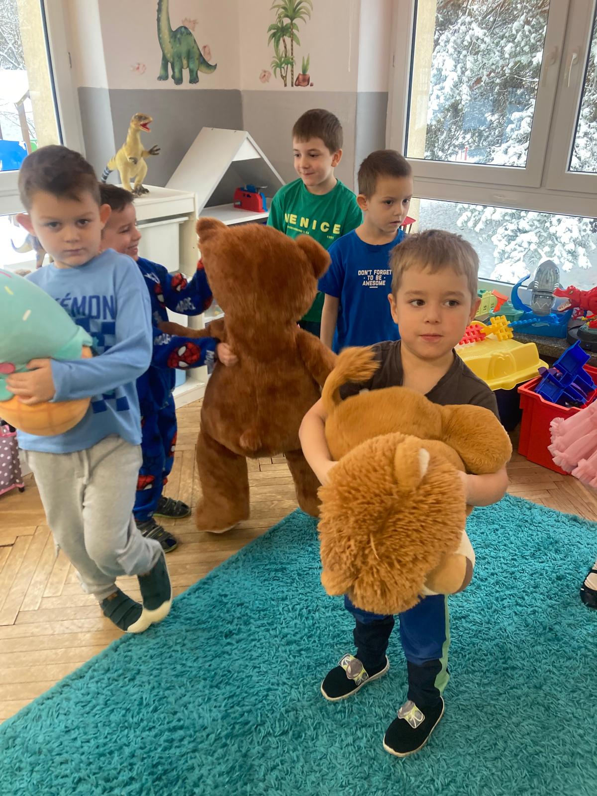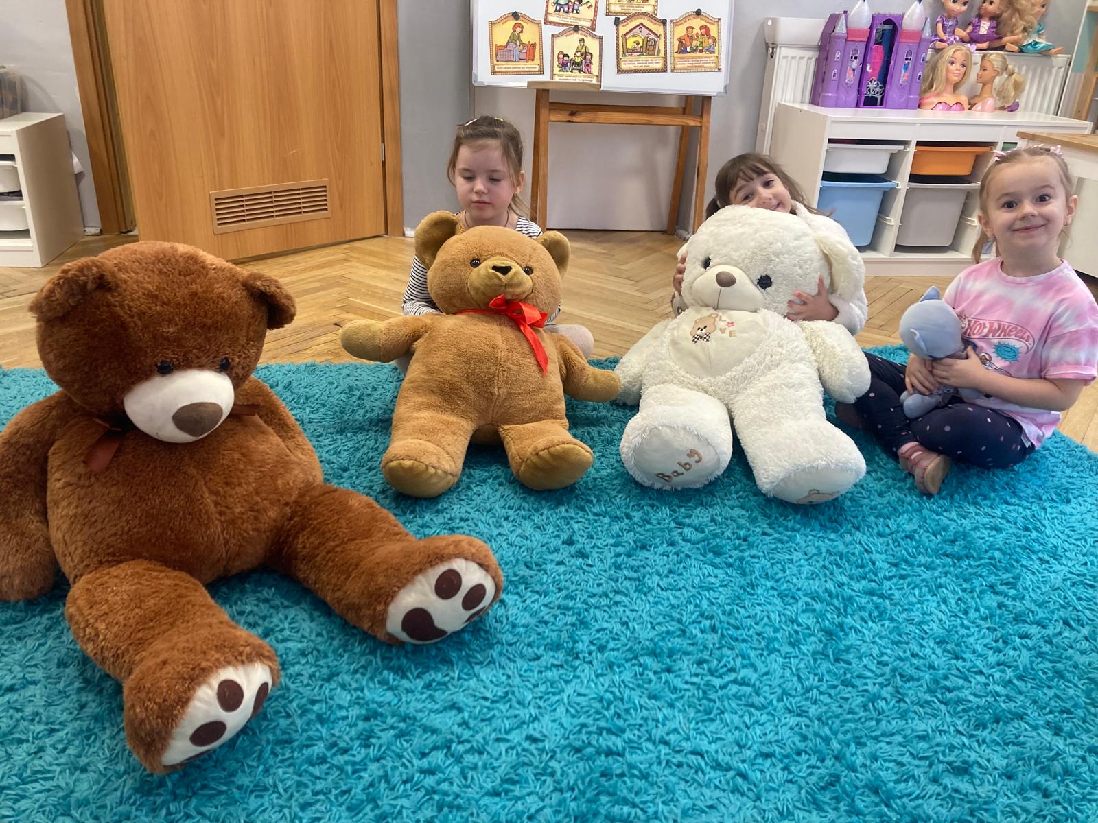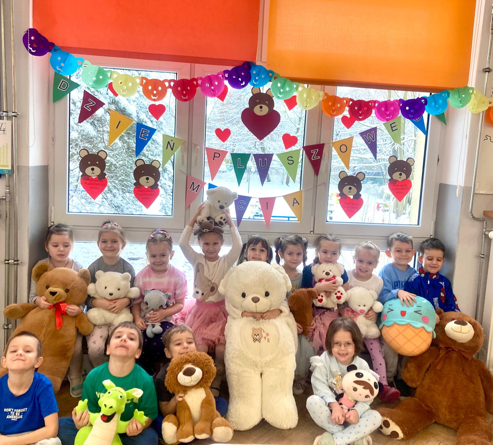 Dzisiaj do przedszkola dzieciaki przyniosły swoje przytualnki-misie.Pluszaki byly dziś przedmiotem zabaw.Był misiowa dyskoteka, szukanie "po śladzie misia" dzieci dotarly do misiowych niespodzianek.Z misiami utrwalaliśmy pojecia o przestrzeni: na, po,obok,za. Rozmawialiśmy o różnych misiach znanych dzieciom z bajek a także o tym czym miś jest dla dziecka. Badalismy misia sensorycznie-Jaki miś jest w dotyku? Misiowe zabawy uzupelniliśmy o słuchanie bajeczki w języku angielskim, osluchujac się z angiielska nazwą pluszaka"Teddy bear".Na koniec pamiątkowa fotografia a także praca plastyczna- kolorowanie dyplomu "Przyjaciel pluszowego misia". ??