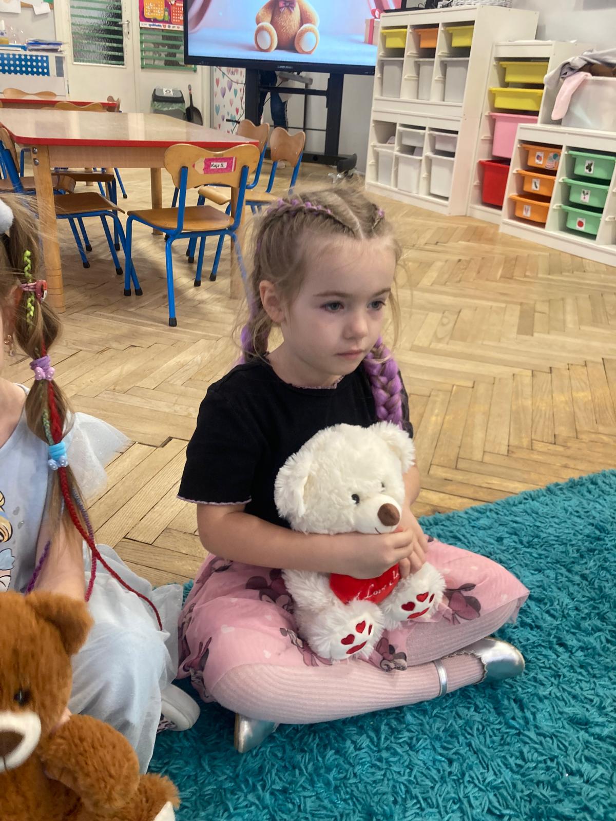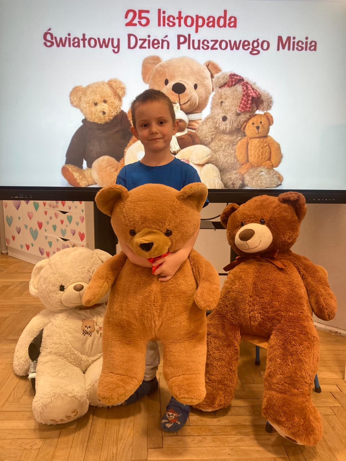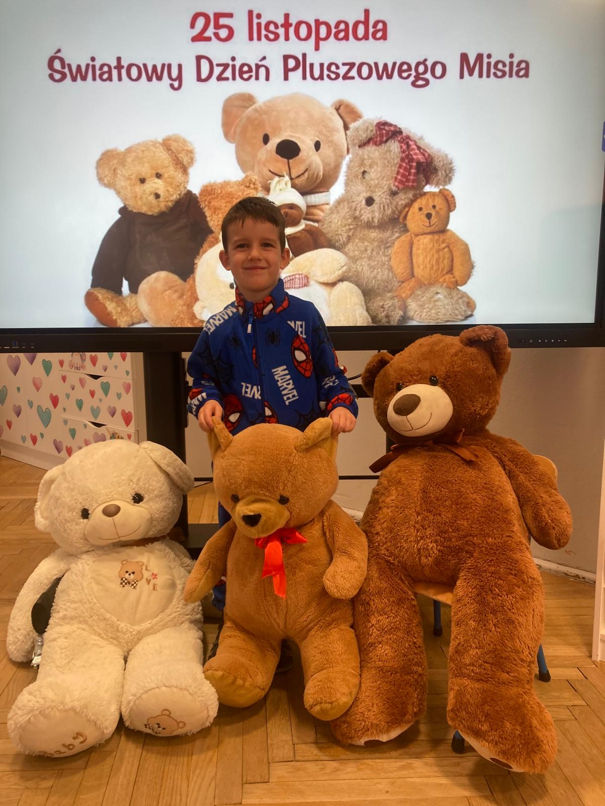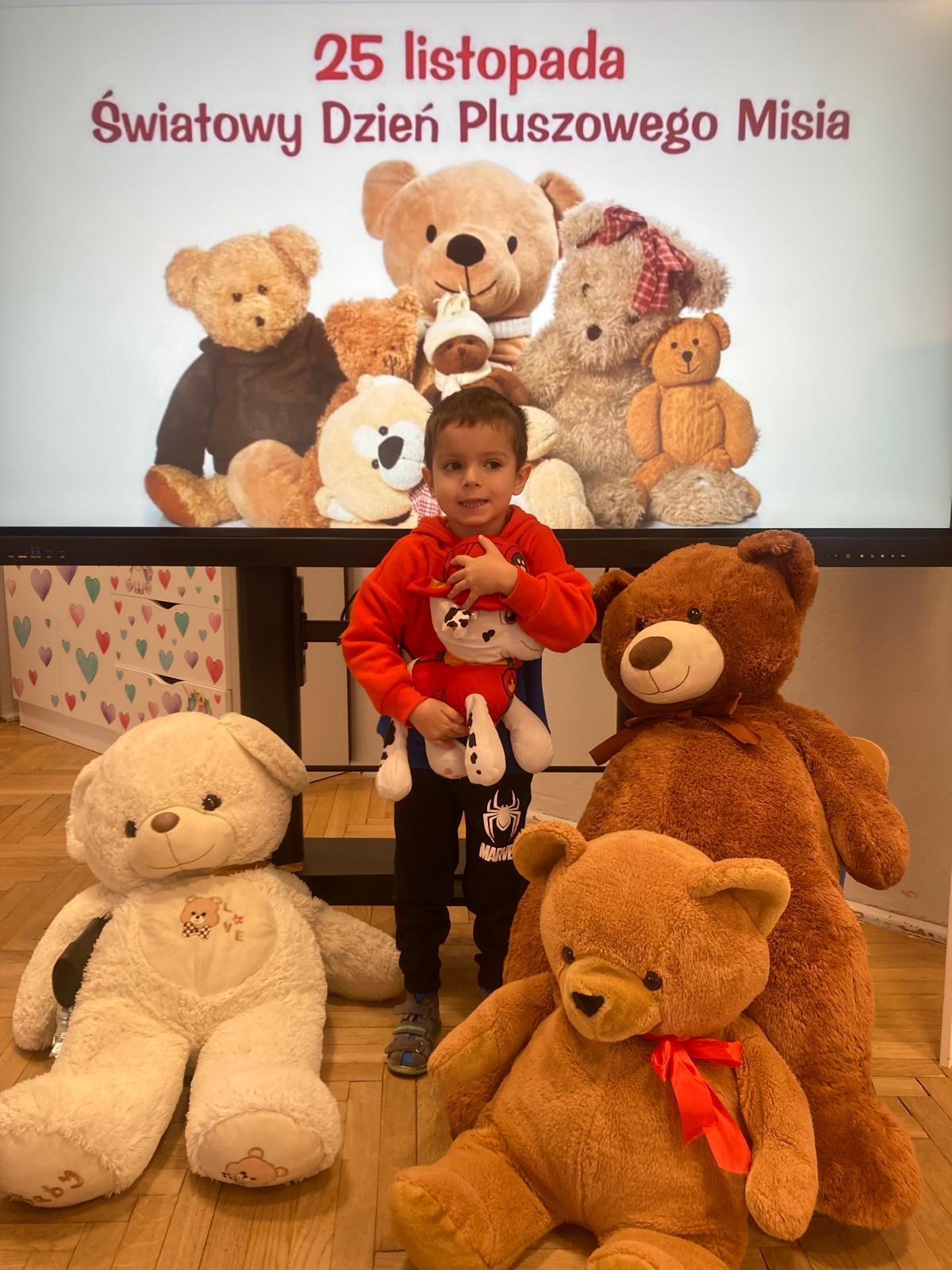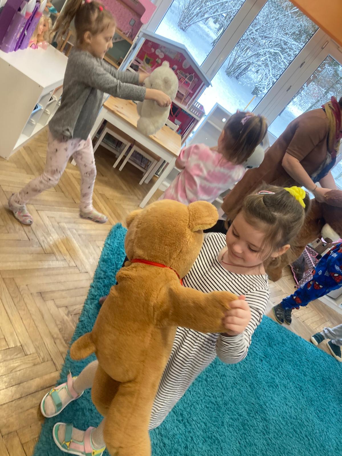 Dzisiaj do przedszkola dzieciaki przyniosły swoje przytualnki-misie.Pluszaki byly dziś przedmiotem zabaw.Był misiowa dyskoteka, szukanie "po śladzie misia" dzieci dotarly do misiowych niespodzianek.Z misiami utrwalaliśmy pojecia o przestrzeni: na, po,obok,za. Rozmawialiśmy o różnych misiach znanych dzieciom z bajek a także o tym czym miś jest dla dziecka. Badalismy misia sensorycznie-Jaki miś jest w dotyku? Misiowe zabawy uzupelniliśmy o słuchanie bajeczki w języku angielskim, osluchujac się z angiielska nazwą pluszaka"Teddy bear".Na koniec pamiątkowa fotografia a także praca plastyczna- kolorowanie dyplomu "Przyjaciel pluszowego misia". ??