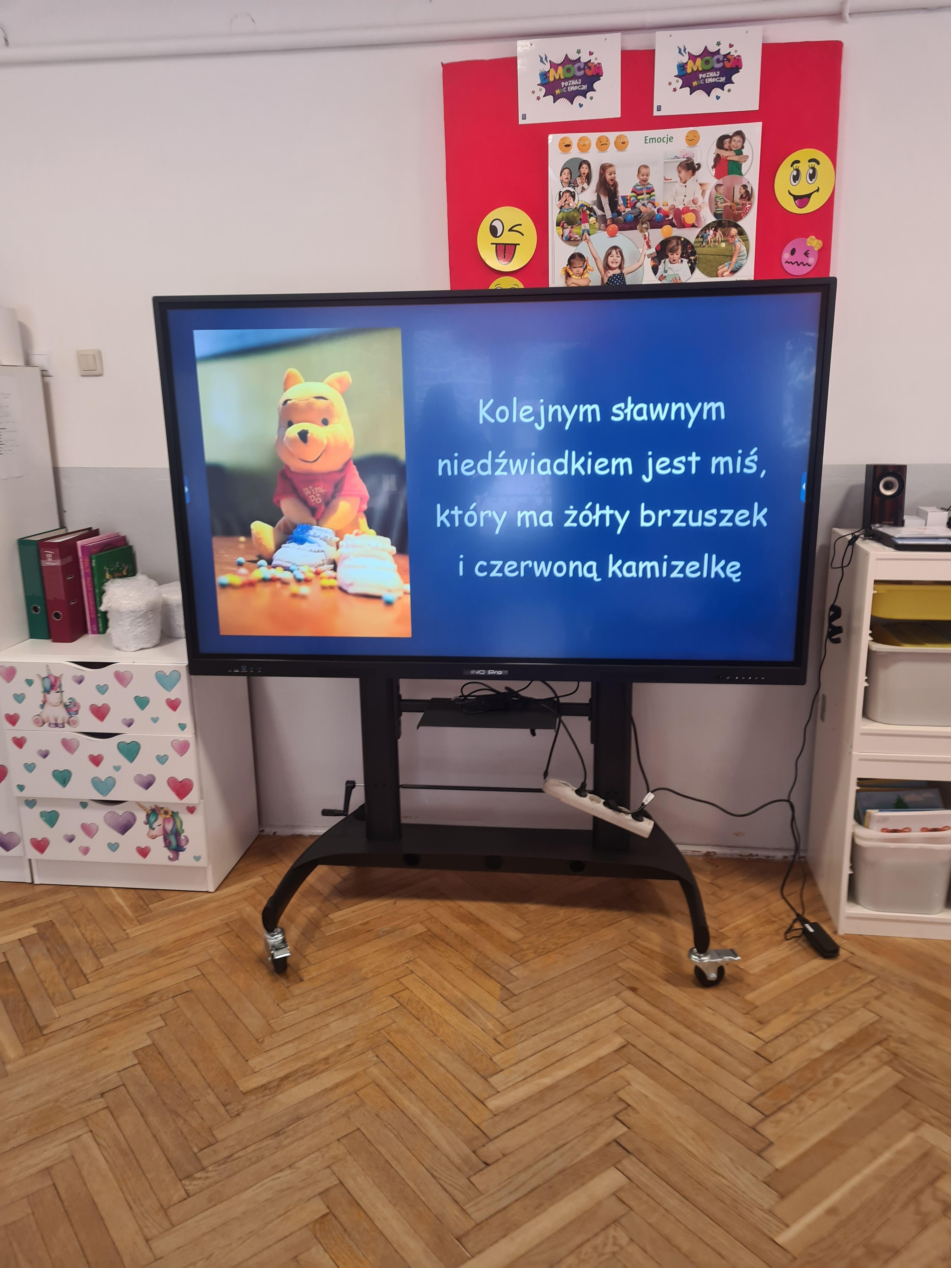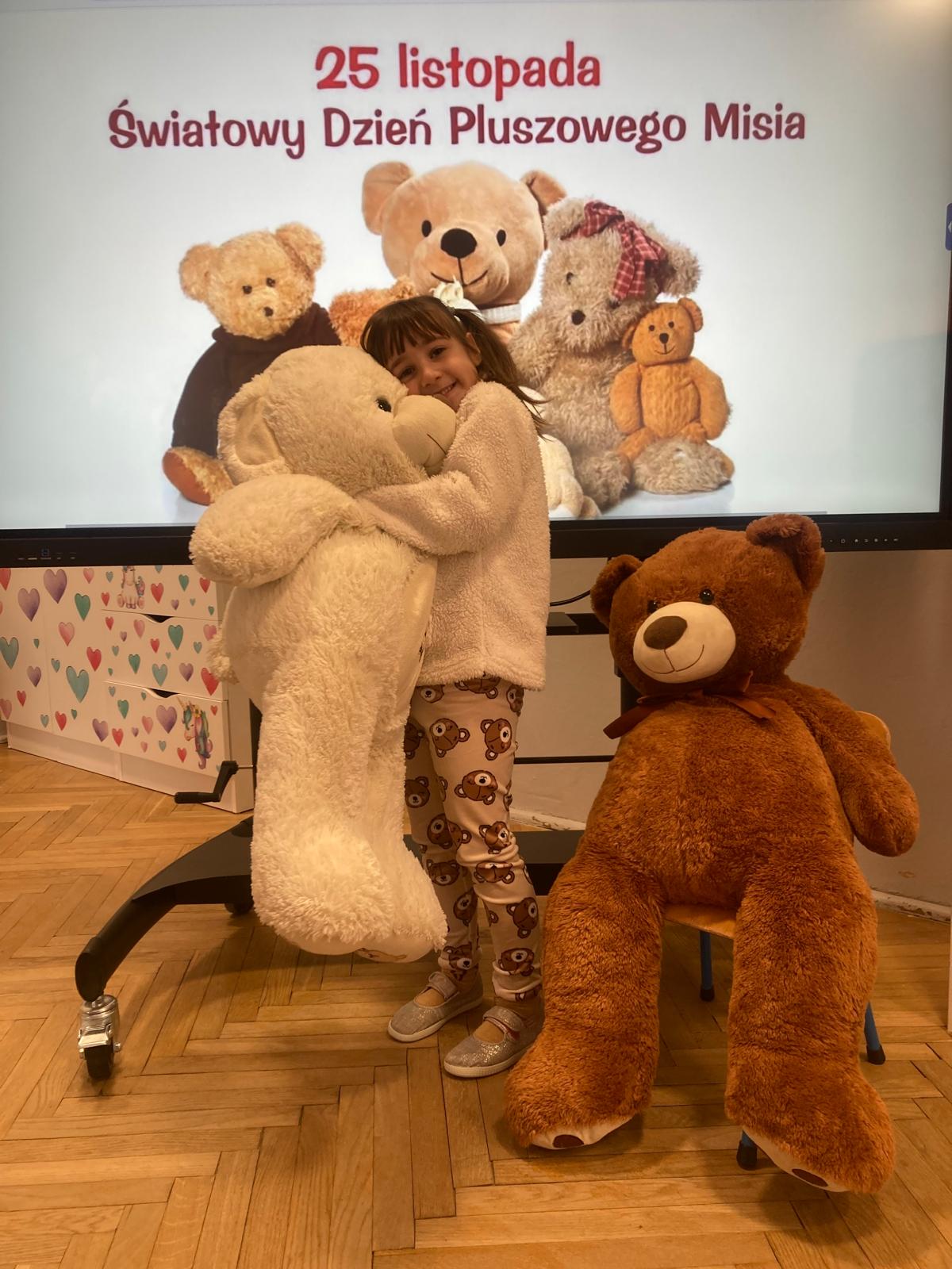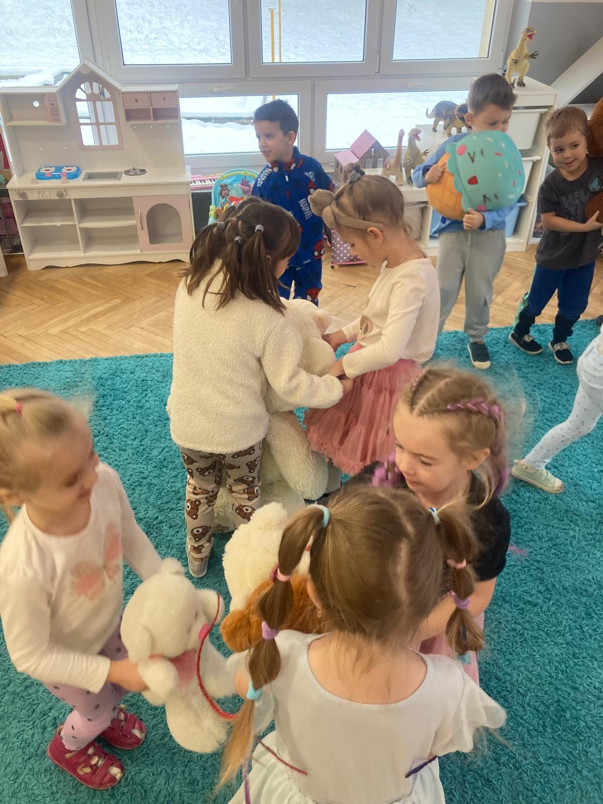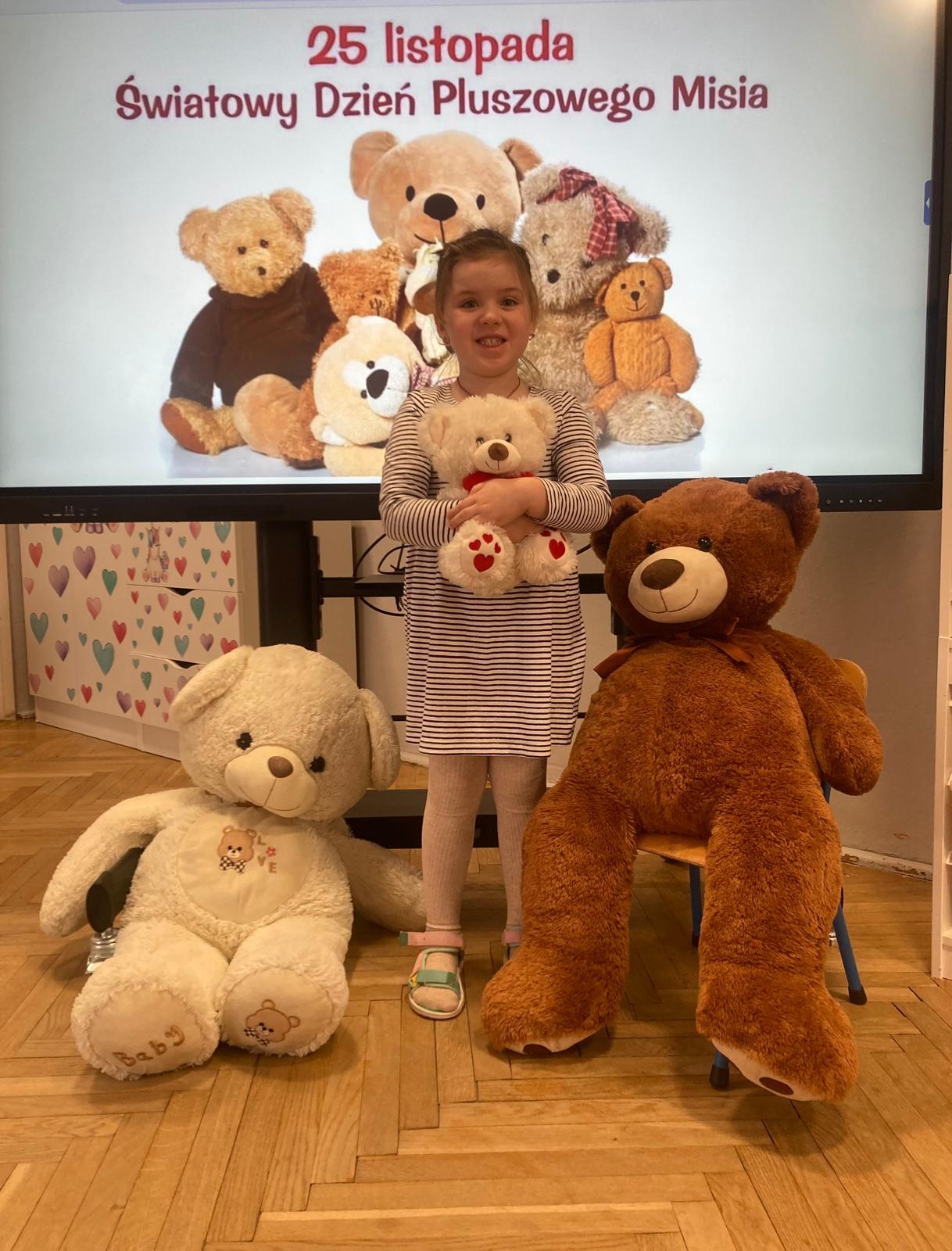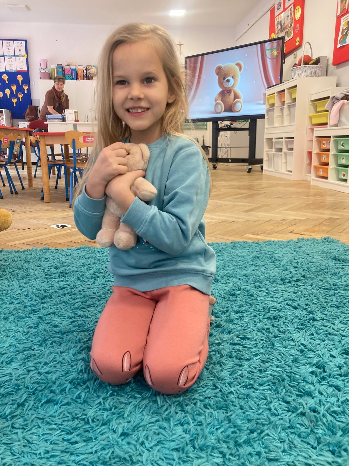 Dzisiaj do przedszkola dzieciaki przyniosły swoje przytualnki-misie.Pluszaki byly dziś przedmiotem zabaw.Był misiowa dyskoteka, szukanie "po śladzie misia" dzieci dotarly do misiowych niespodzianek.Z misiami utrwalaliśmy pojecia o przestrzeni: na, po,obok,za. Rozmawialiśmy o różnych misiach znanych dzieciom z bajek a także o tym czym miś jest dla dziecka. Badalismy misia sensorycznie-Jaki miś jest w dotyku? Misiowe zabawy uzupelniliśmy o słuchanie bajeczki w języku angielskim, osluchujac się z angiielska nazwą pluszaka"Teddy bear".Na koniec pamiątkowa fotografia a także praca plastyczna- kolorowanie dyplomu "Przyjaciel pluszowego misia". ??