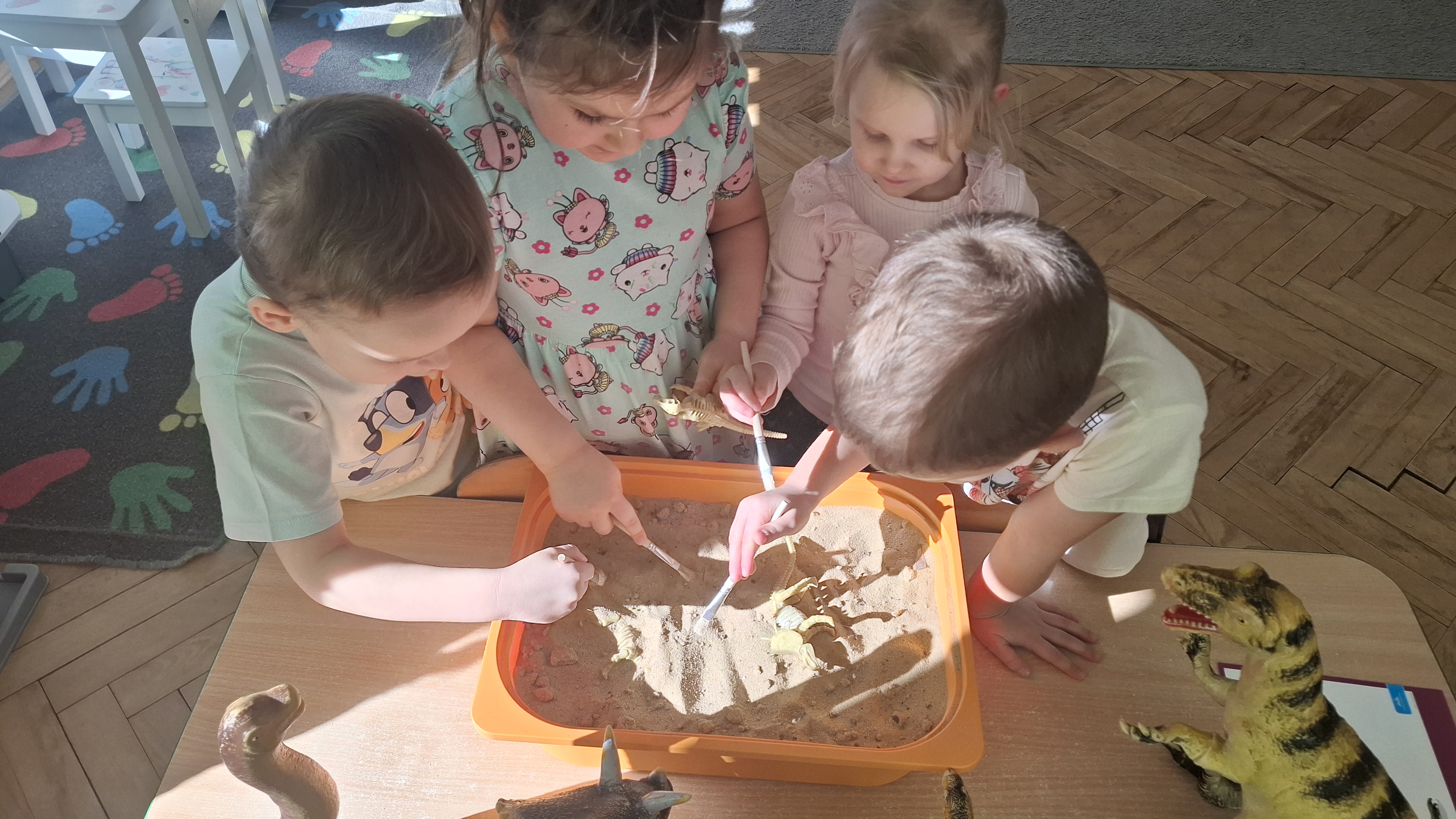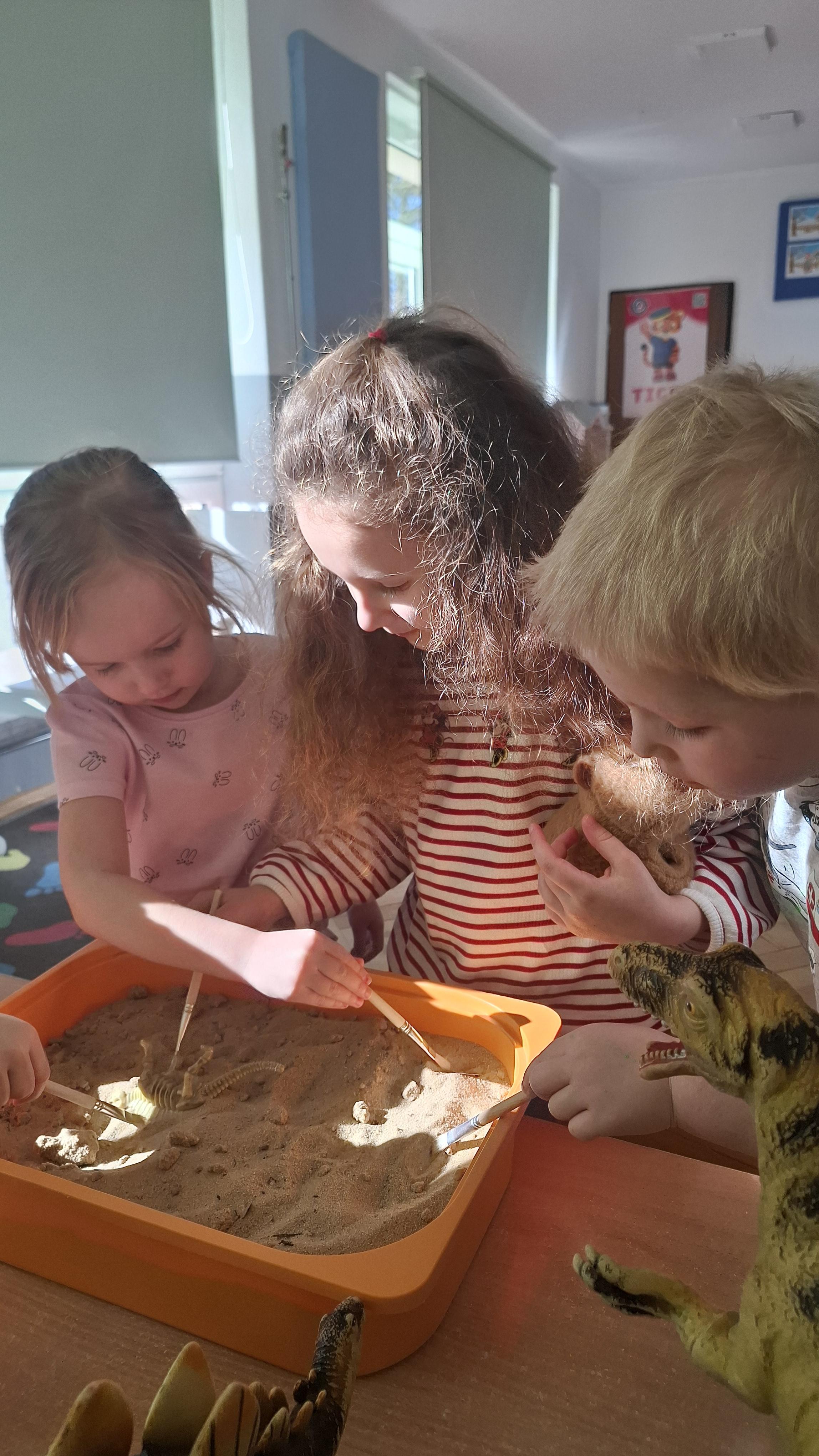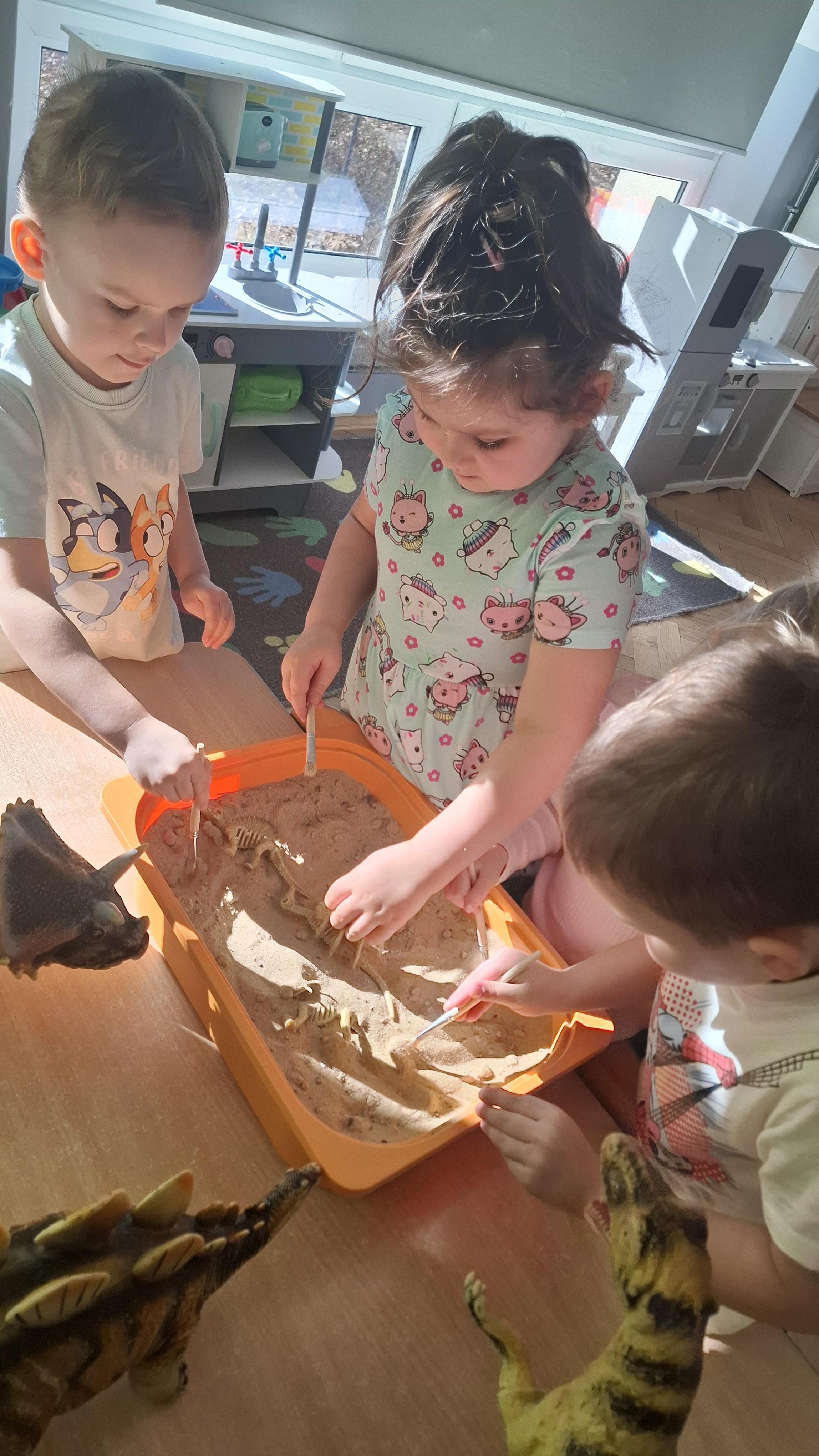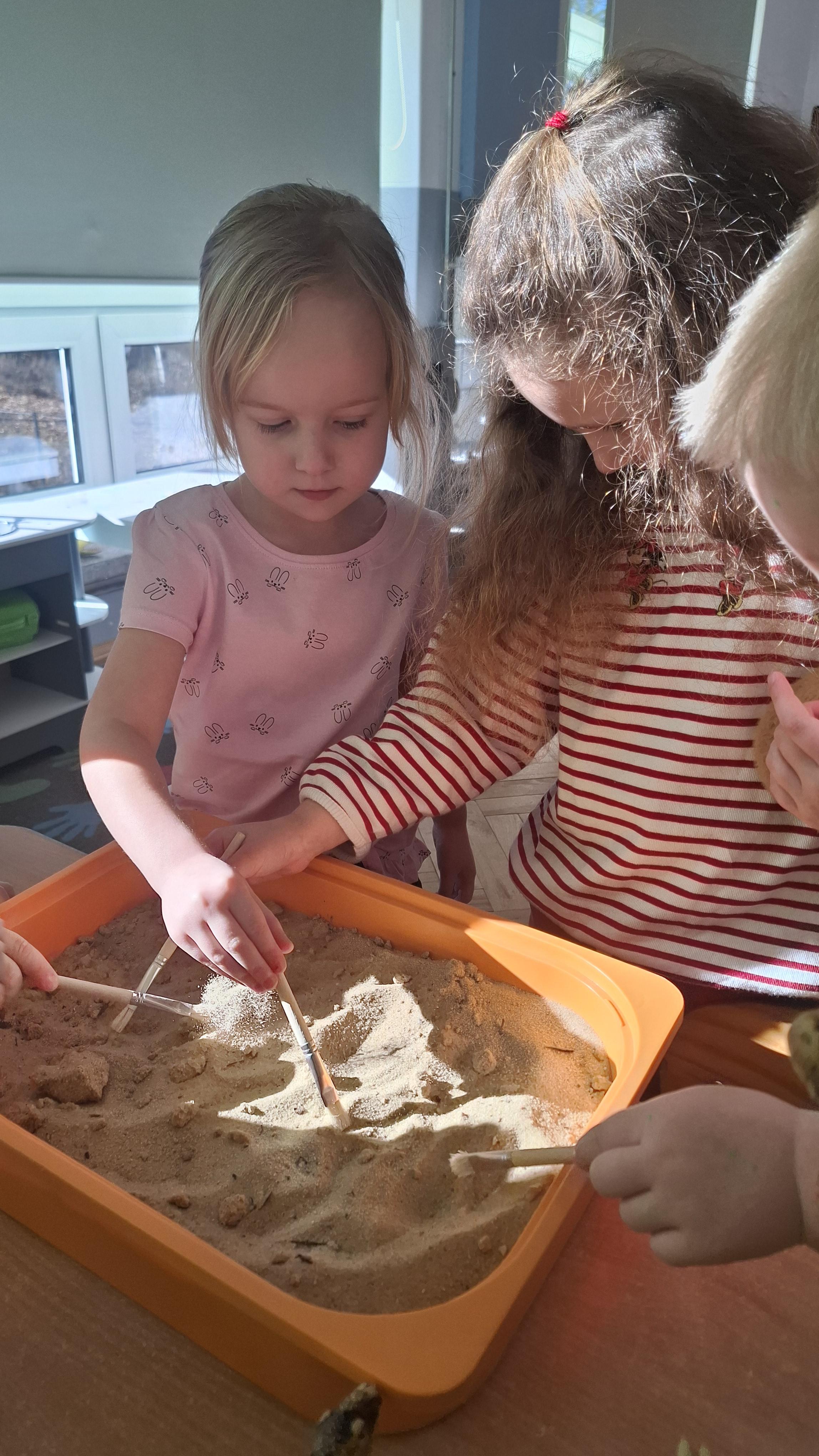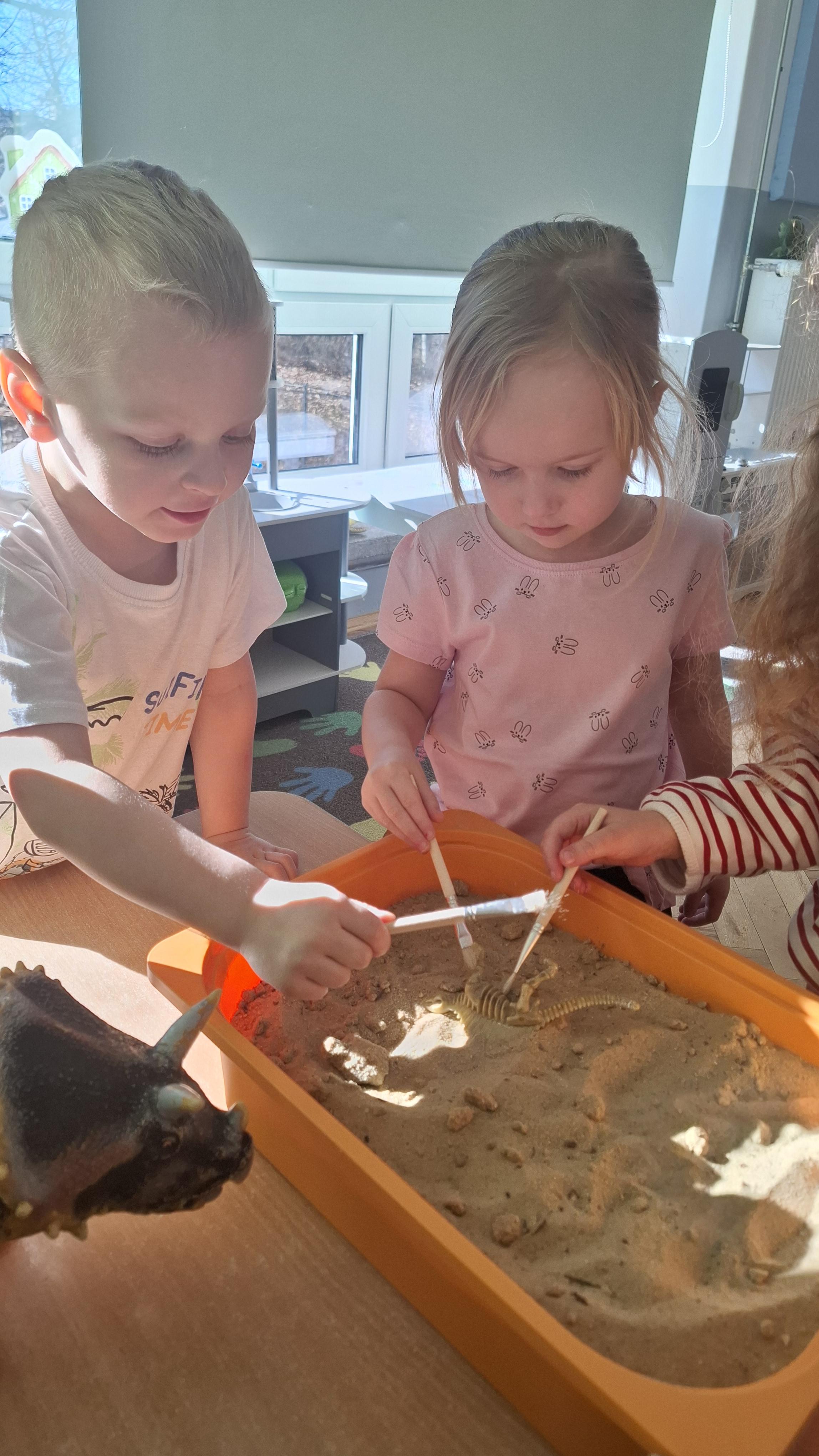 Dużym zainteresowaniem cieszył się eksperyment polegający na odkrywaniu „skarbów” ukrytych w pustynnym piasku. Był on punktem wyjścia do rozmowy o śladach przeszłości. Podczas zabawy „Epoka lodowcowa” dzieci poznały zwierzęta, które żyły dawno temu, takie jak mamut czy tygrys szablozębny, i dowiedziały się, że były one przodkami współczesnych gatunków.