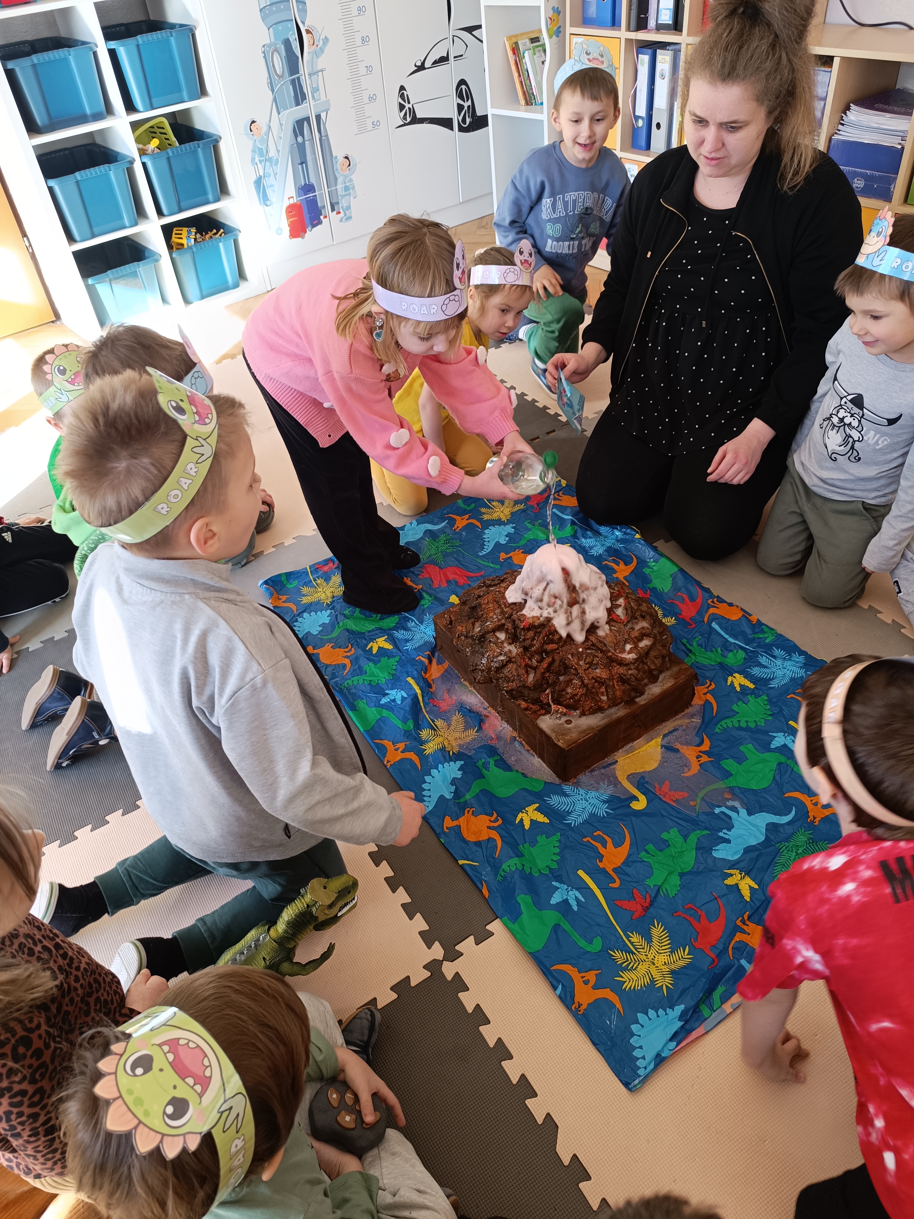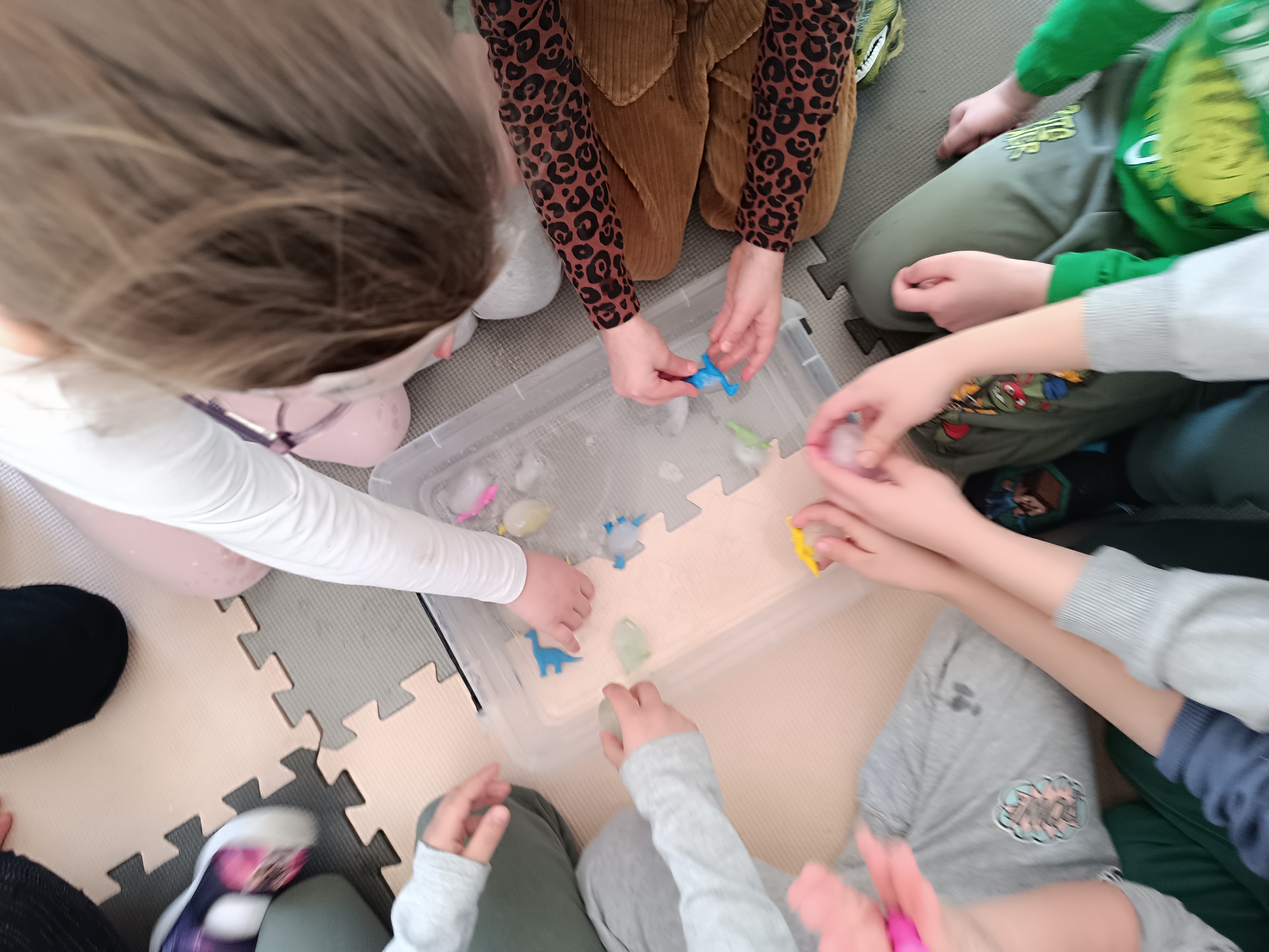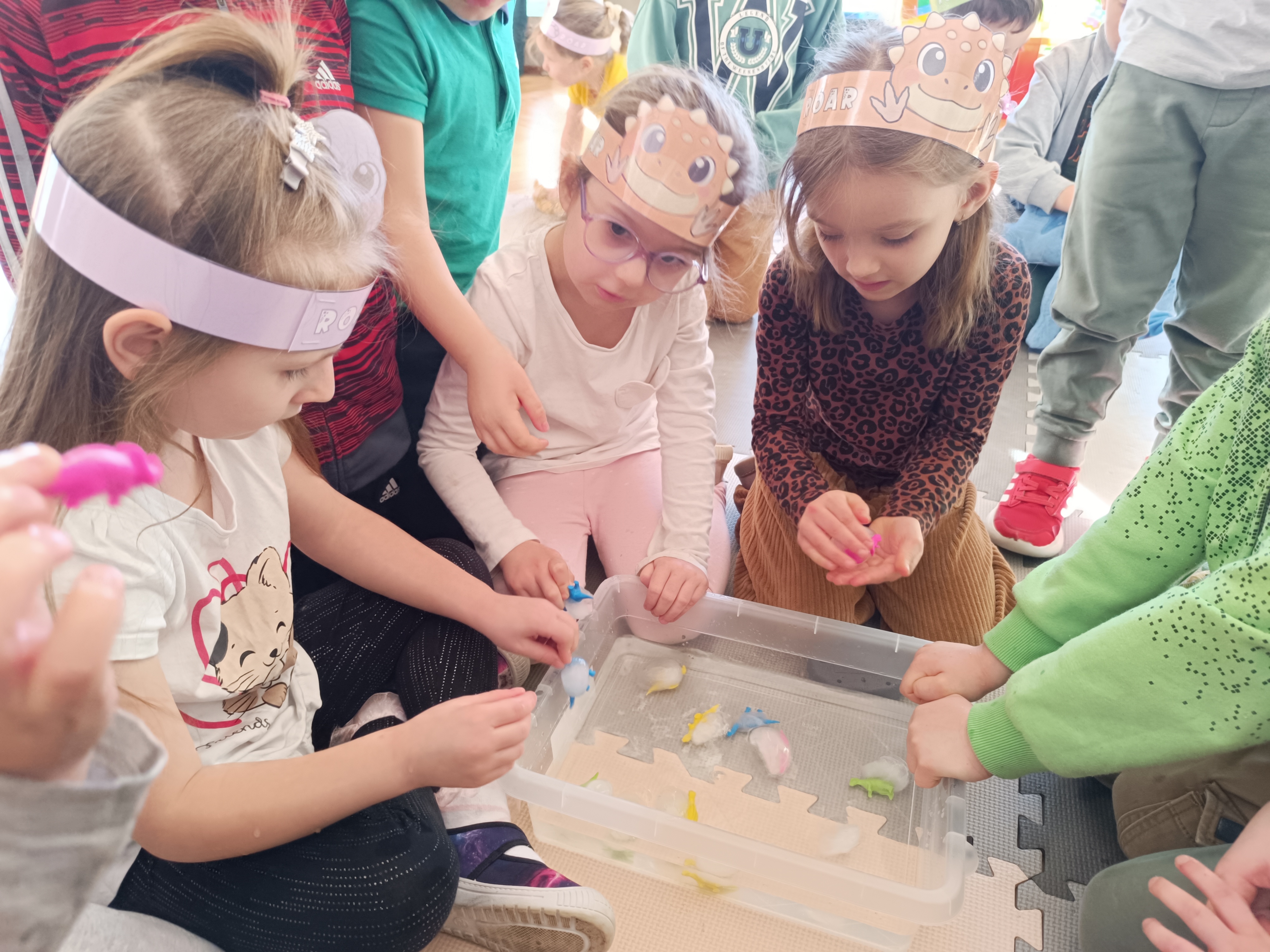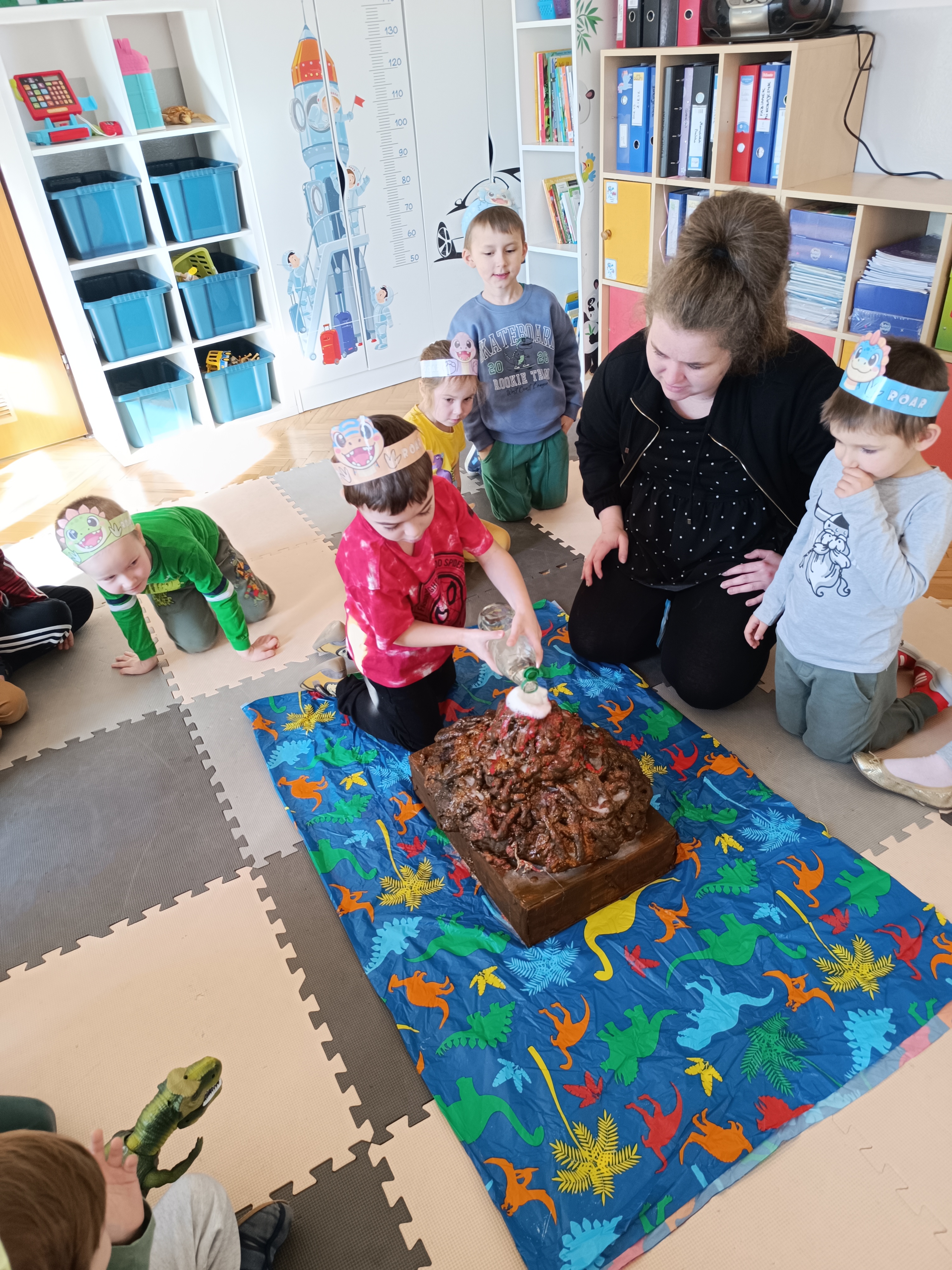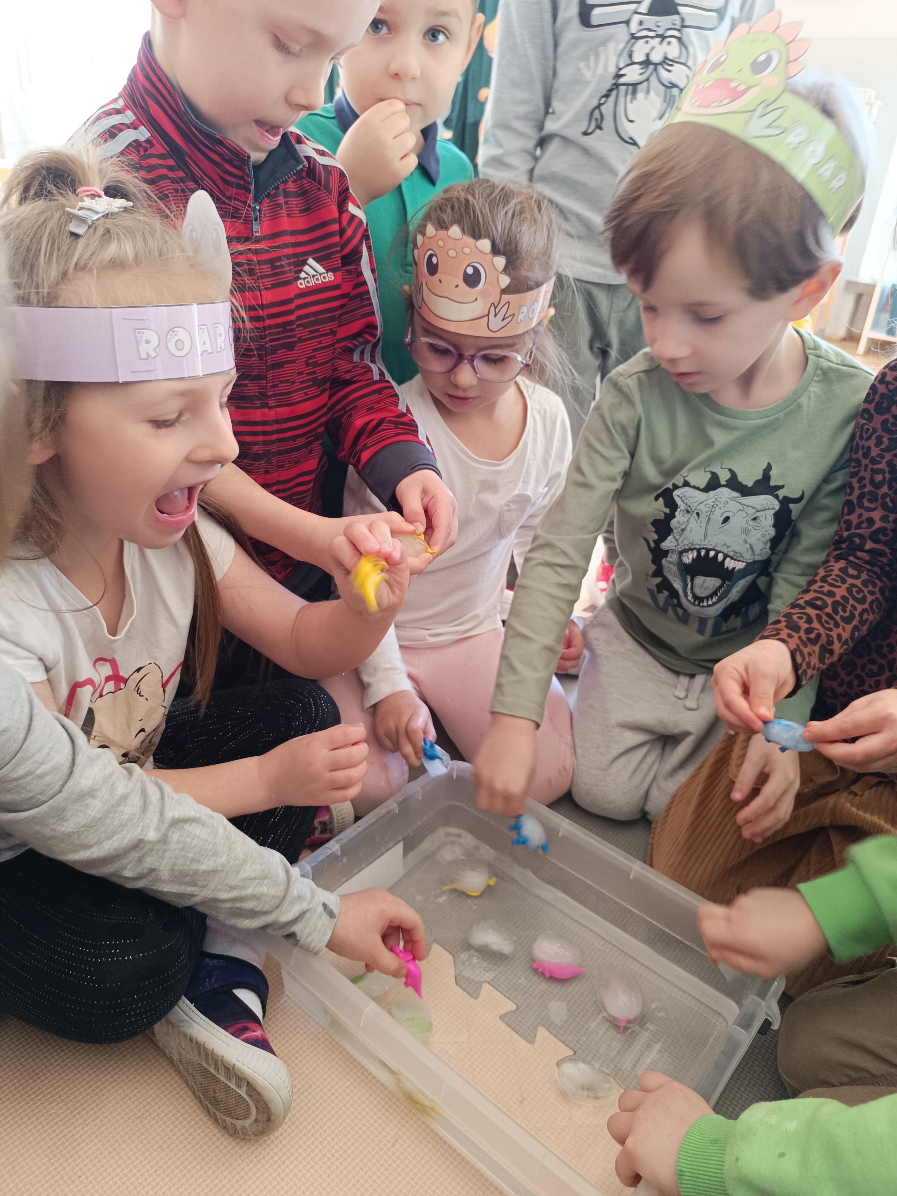 Z okazji Dnia Dinozaura przygotowaliśmy wiele atrakcyjnych aktywności i eksperymentów. Wykonaliśmy spektakularny wybuch wulkanu z sody i octu, obserwując reakcję chemiczną. Dzieci uwalniały zamarznięte dinozaury ukryte w lodowych jajach, ćwicząc cierpliwość i sprawność manualną. Szukaliśmy także ukrytych dinozaurów w sali, a następnie wcieliliśmy się w małych paleontologów, rozbijając gipsowe bryły i odkrywając w nich „skamieliny”.