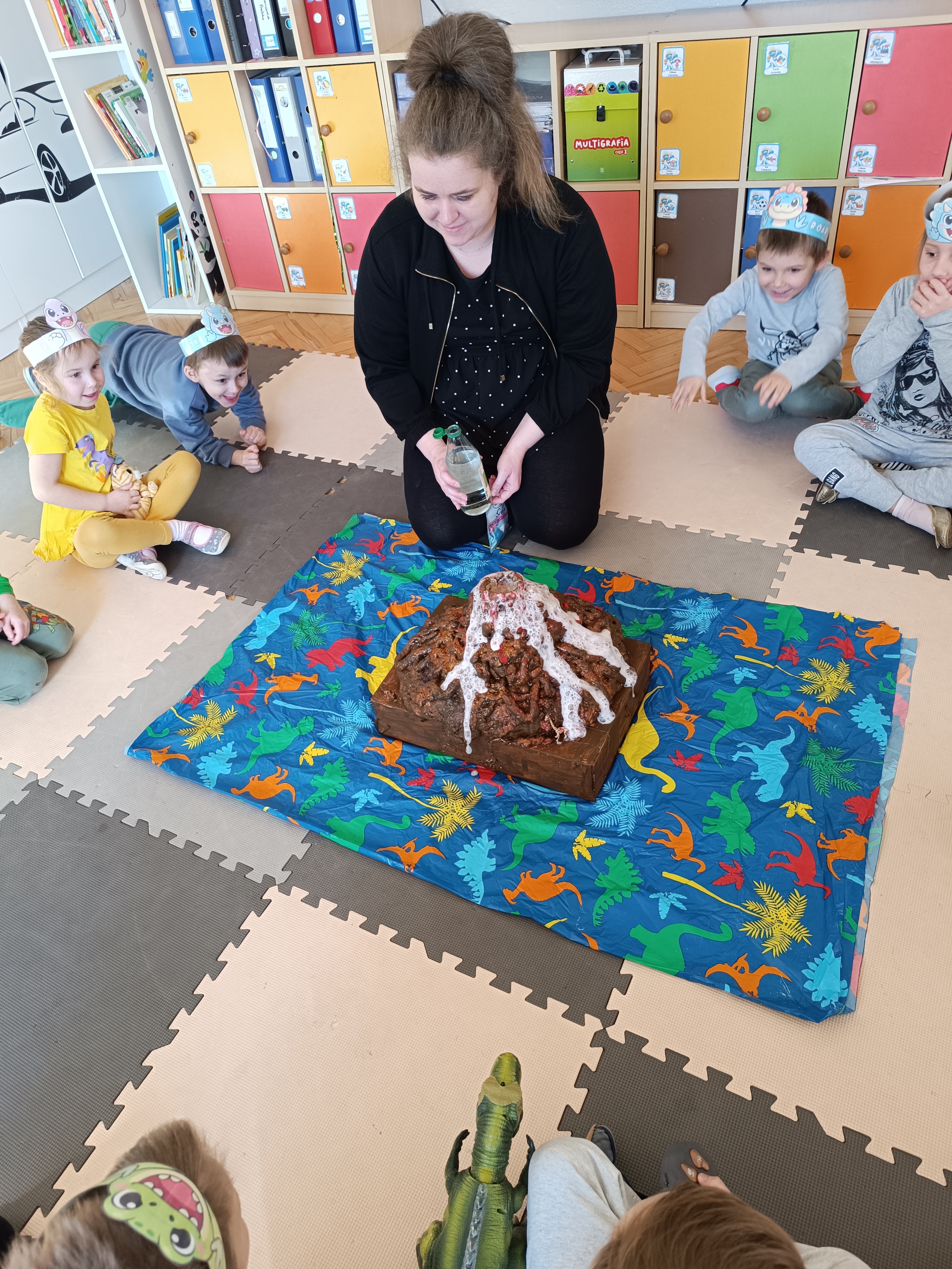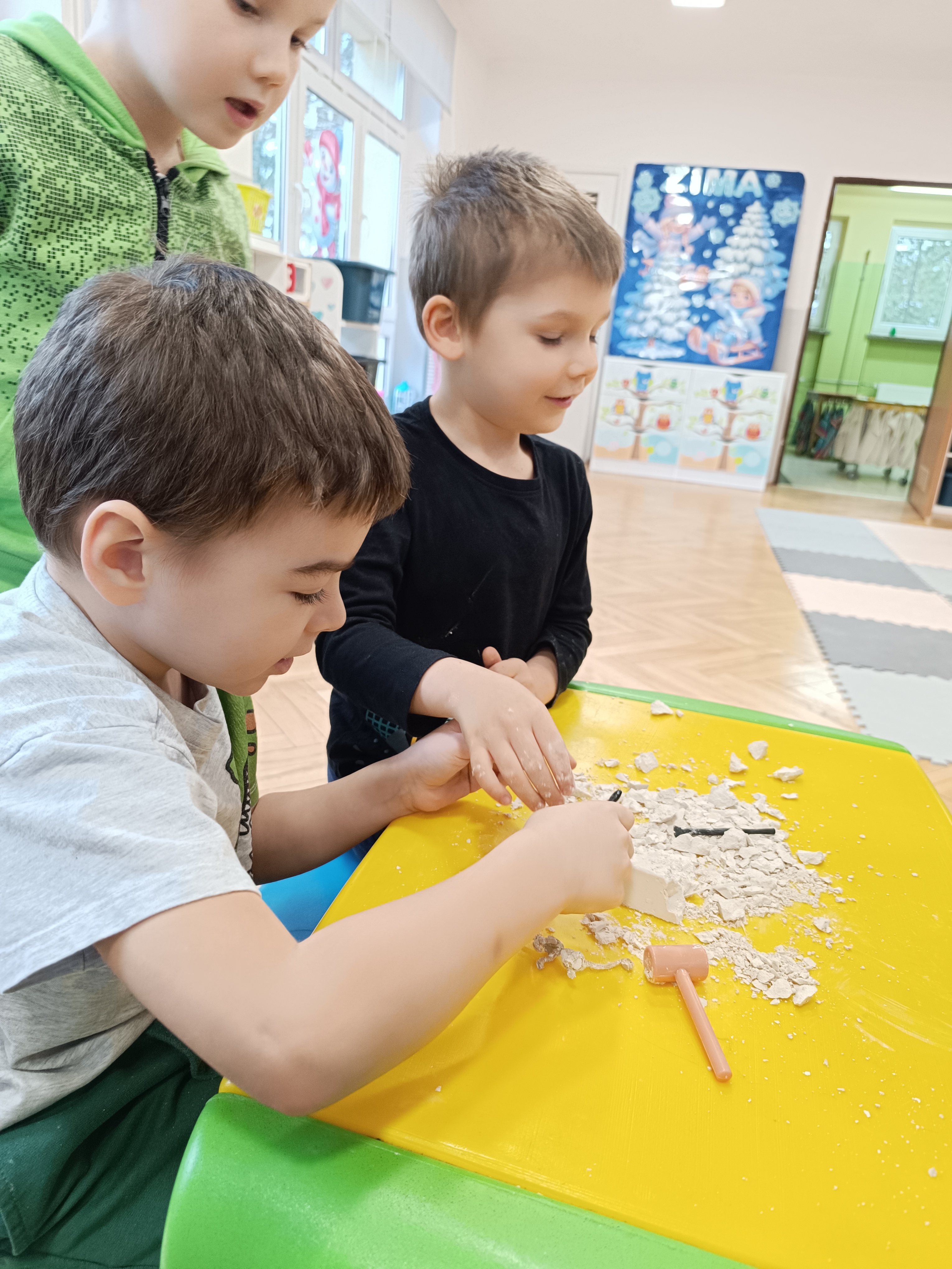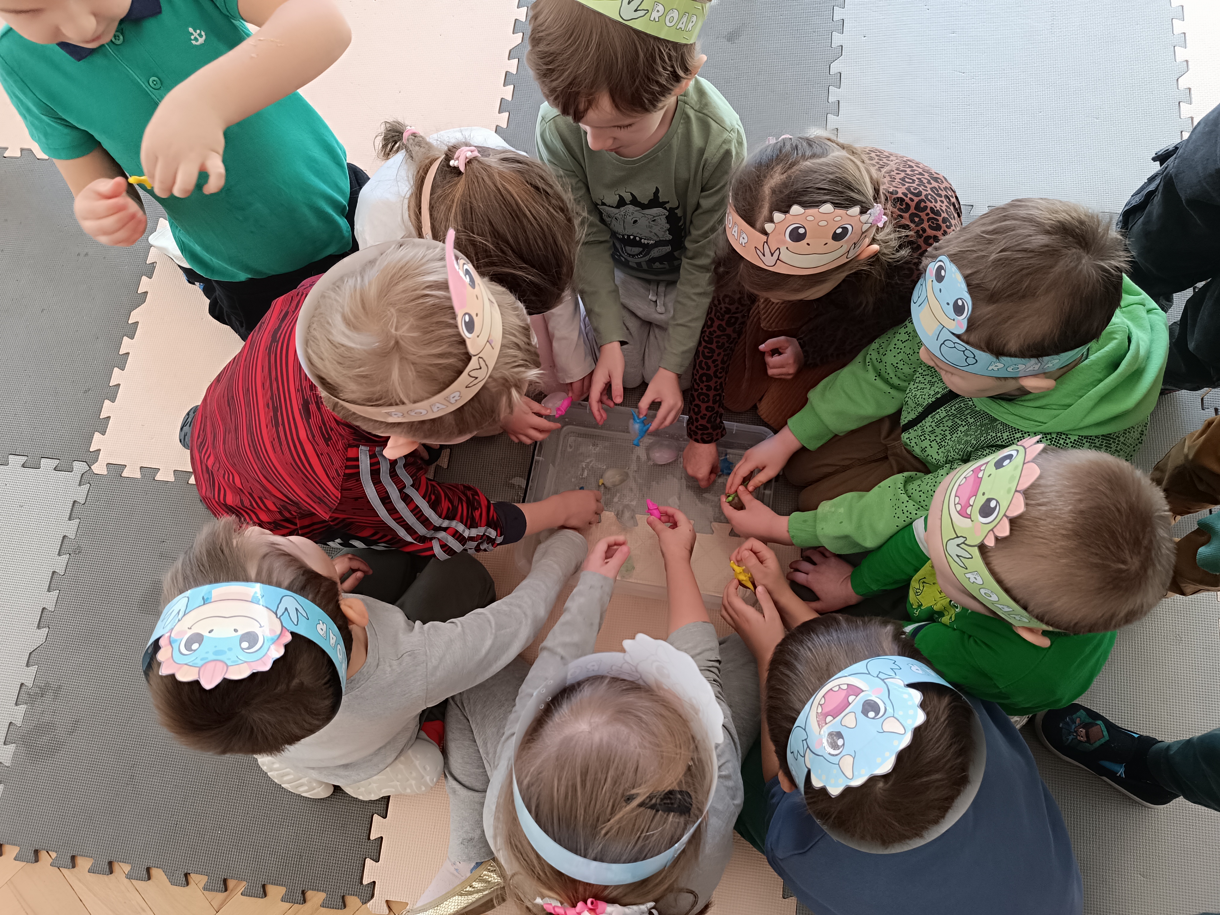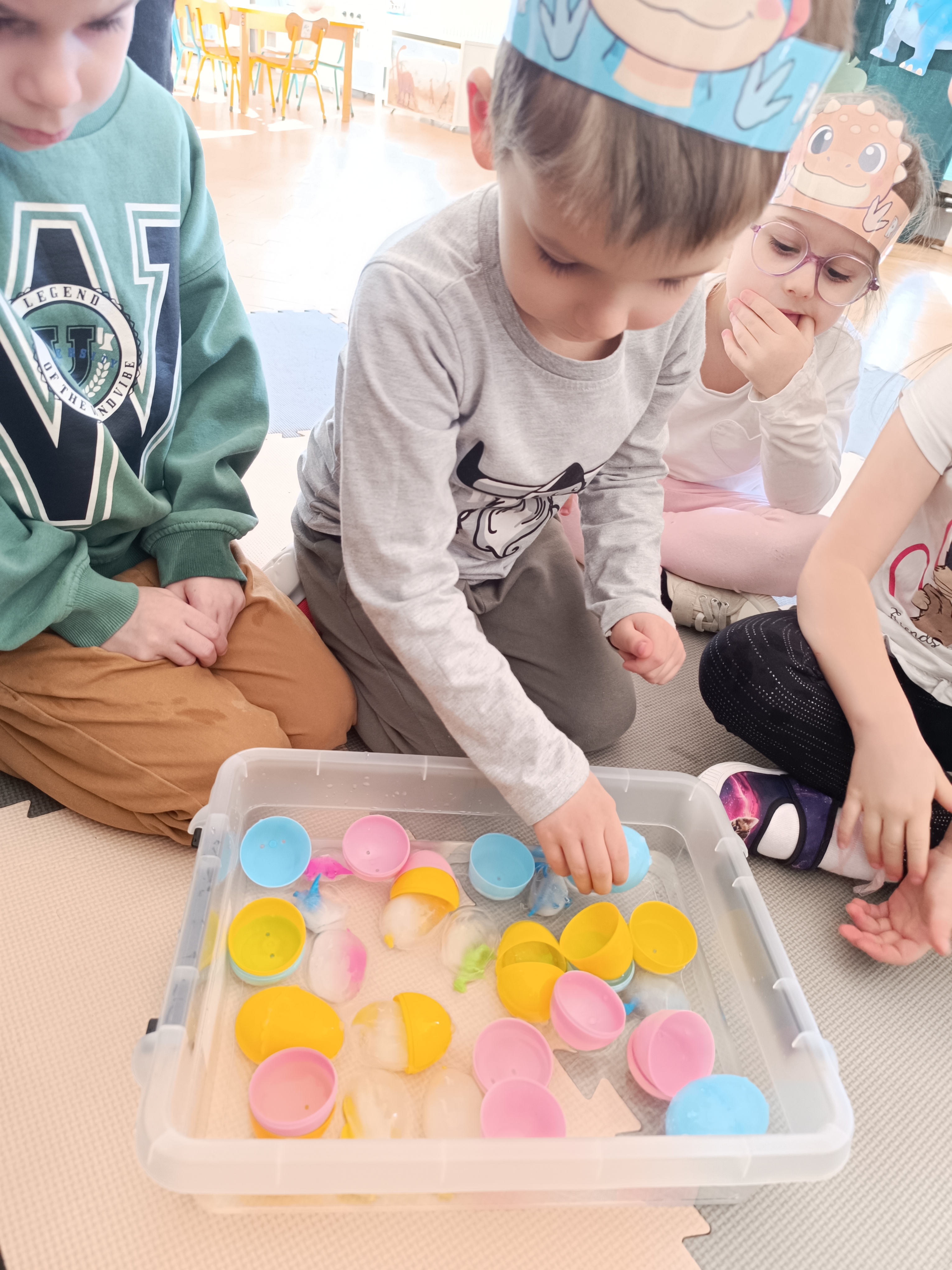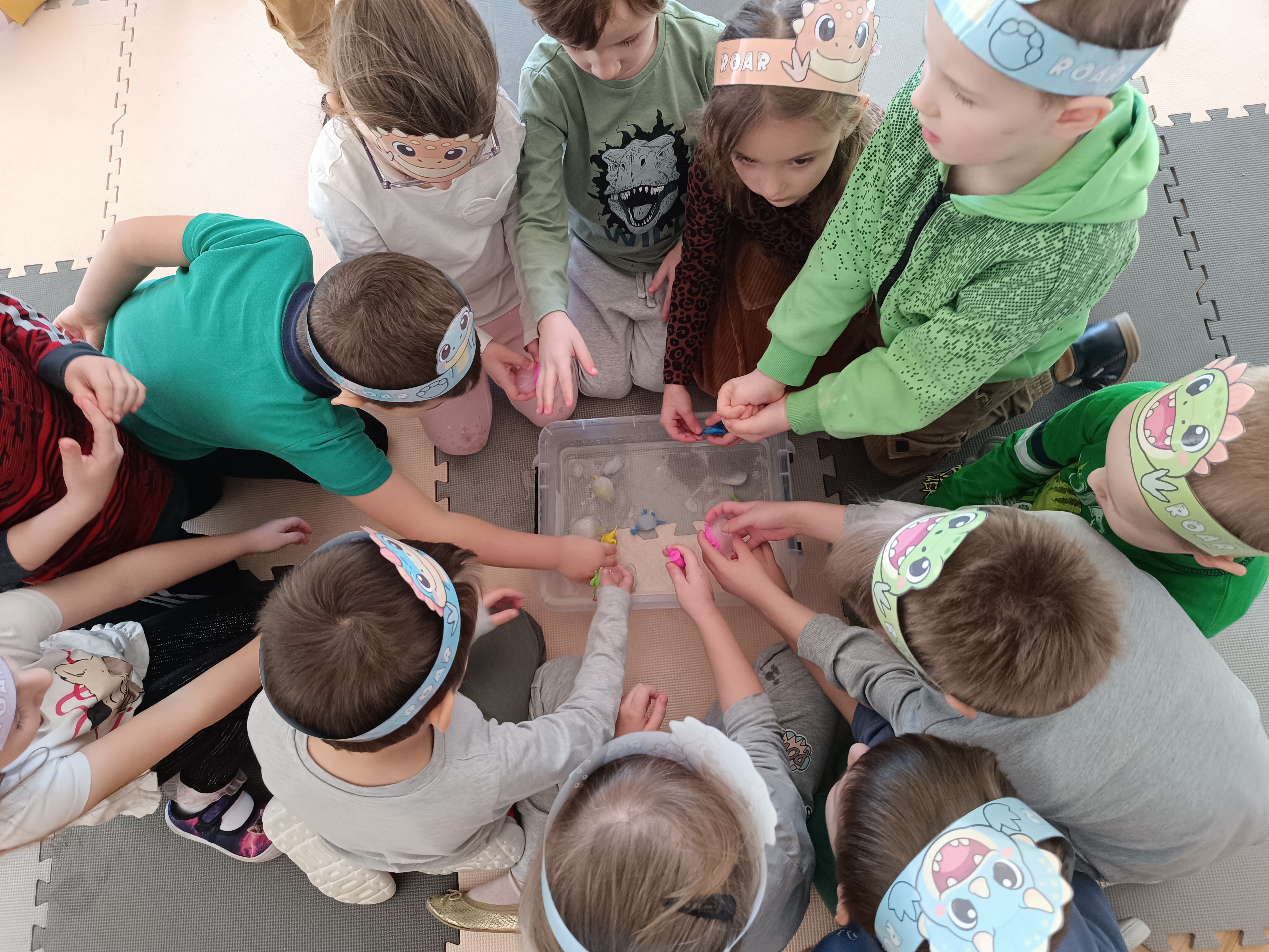Z okazji Dnia Dinozaura przygotowaliśmy wiele atrakcyjnych aktywności i eksperymentów. Wykonaliśmy spektakularny wybuch wulkanu z sody i octu, obserwując reakcję chemiczną. Dzieci uwalniały zamarznięte dinozaury ukryte w lodowych jajach, ćwicząc cierpliwość i sprawność manualną. Szukaliśmy także ukrytych dinozaurów w sali, a następnie wcieliliśmy się w małych paleontologów, rozbijając gipsowe bryły i odkrywając w nich „skamieliny”.