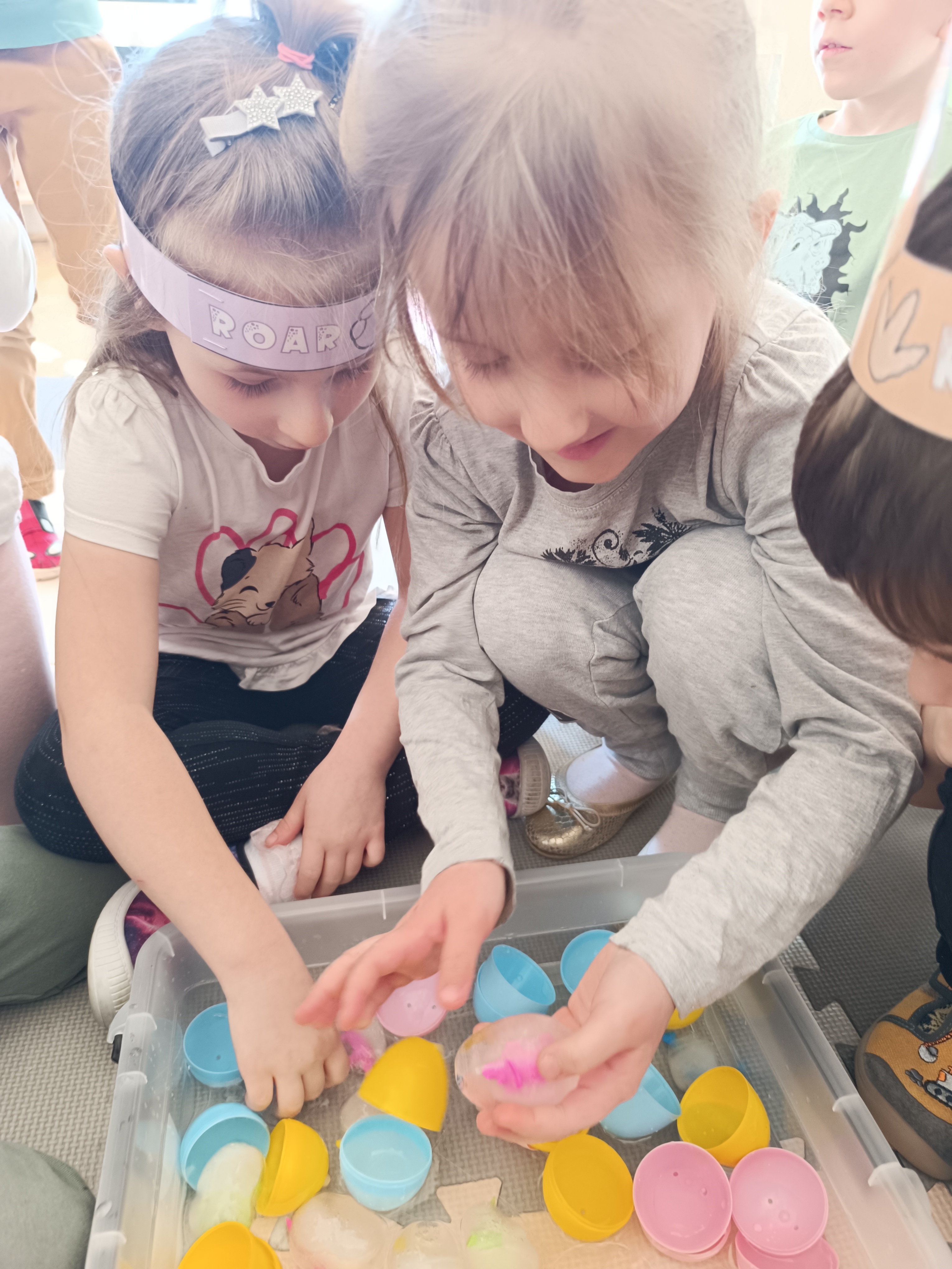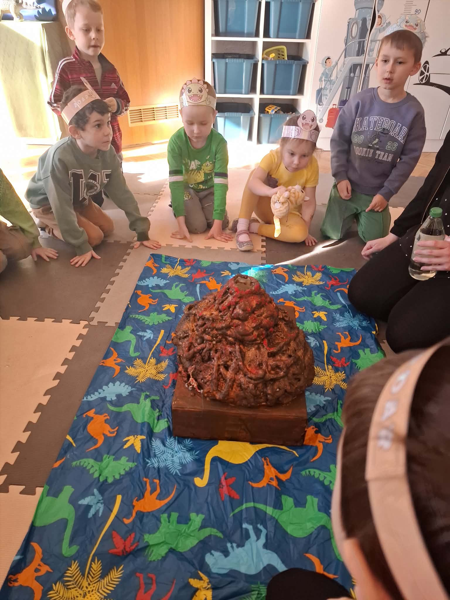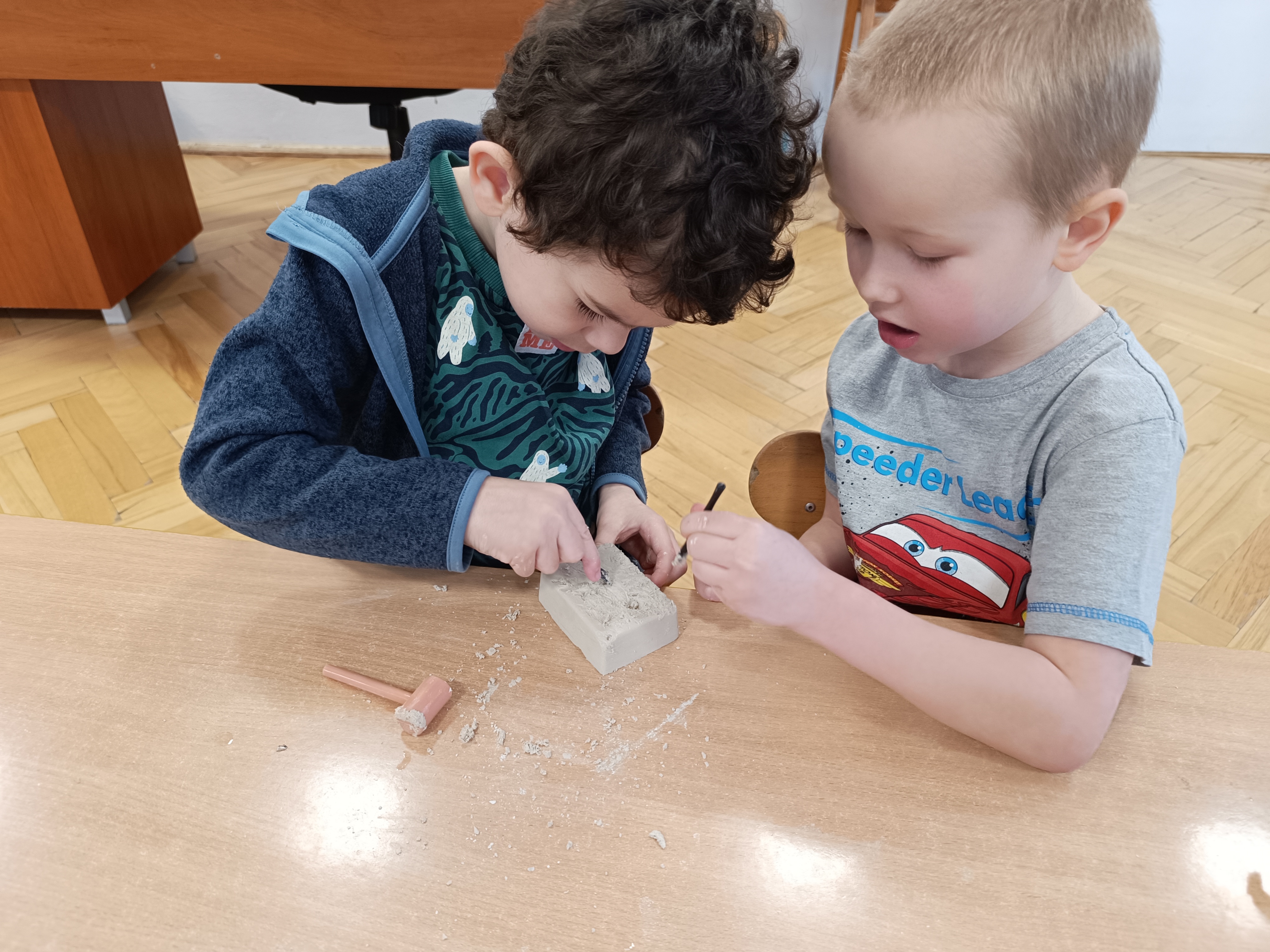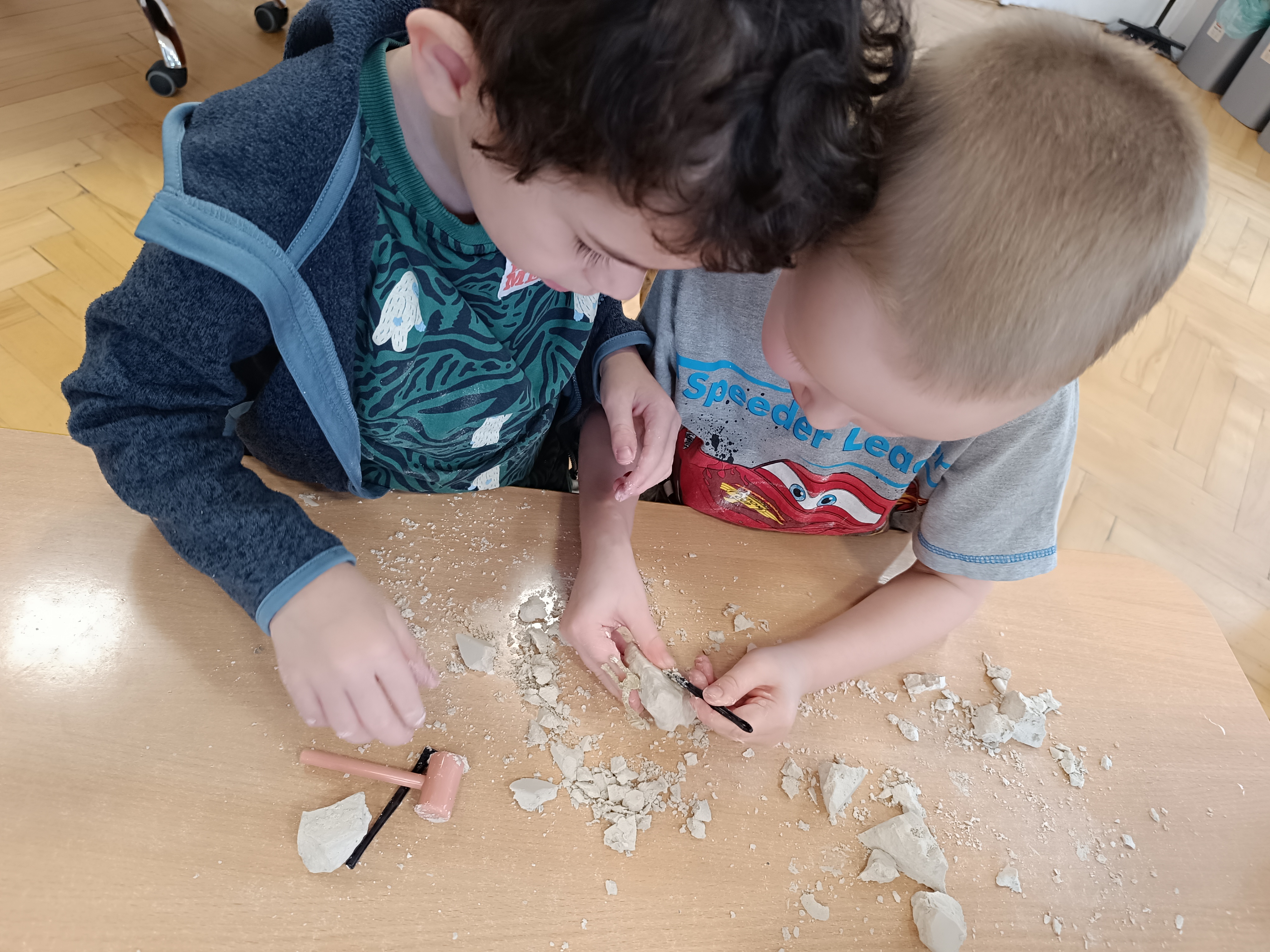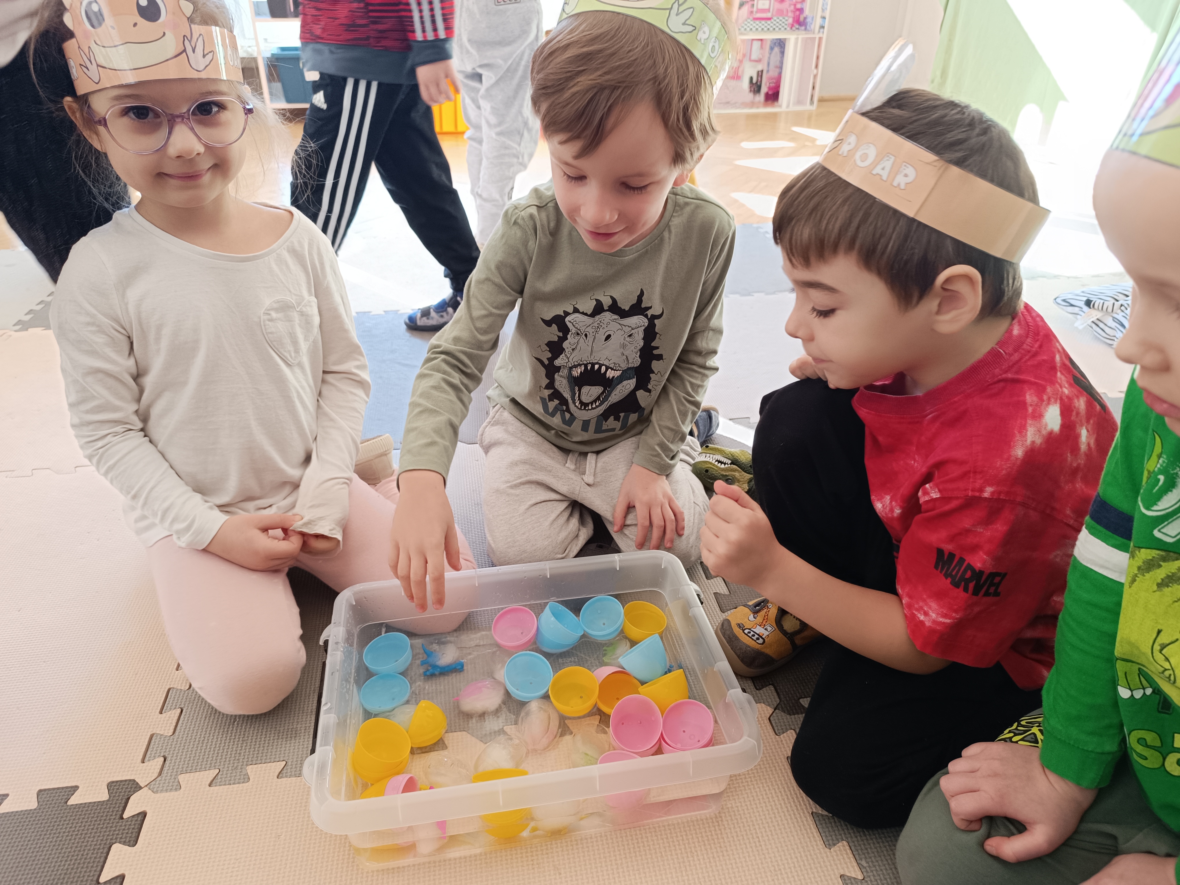 Z okazji Dnia Dinozaura przygotowaliśmy wiele atrakcyjnych aktywności i eksperymentów. Wykonaliśmy spektakularny wybuch wulkanu z sody i octu, obserwując reakcję chemiczną. Dzieci uwalniały zamarznięte dinozaury ukryte w lodowych jajach, ćwicząc cierpliwość i sprawność manualną. Szukaliśmy także ukrytych dinozaurów w sali, a następnie wcieliliśmy się w małych paleontologów, rozbijając gipsowe bryły i odkrywając w nich „skamieliny”.