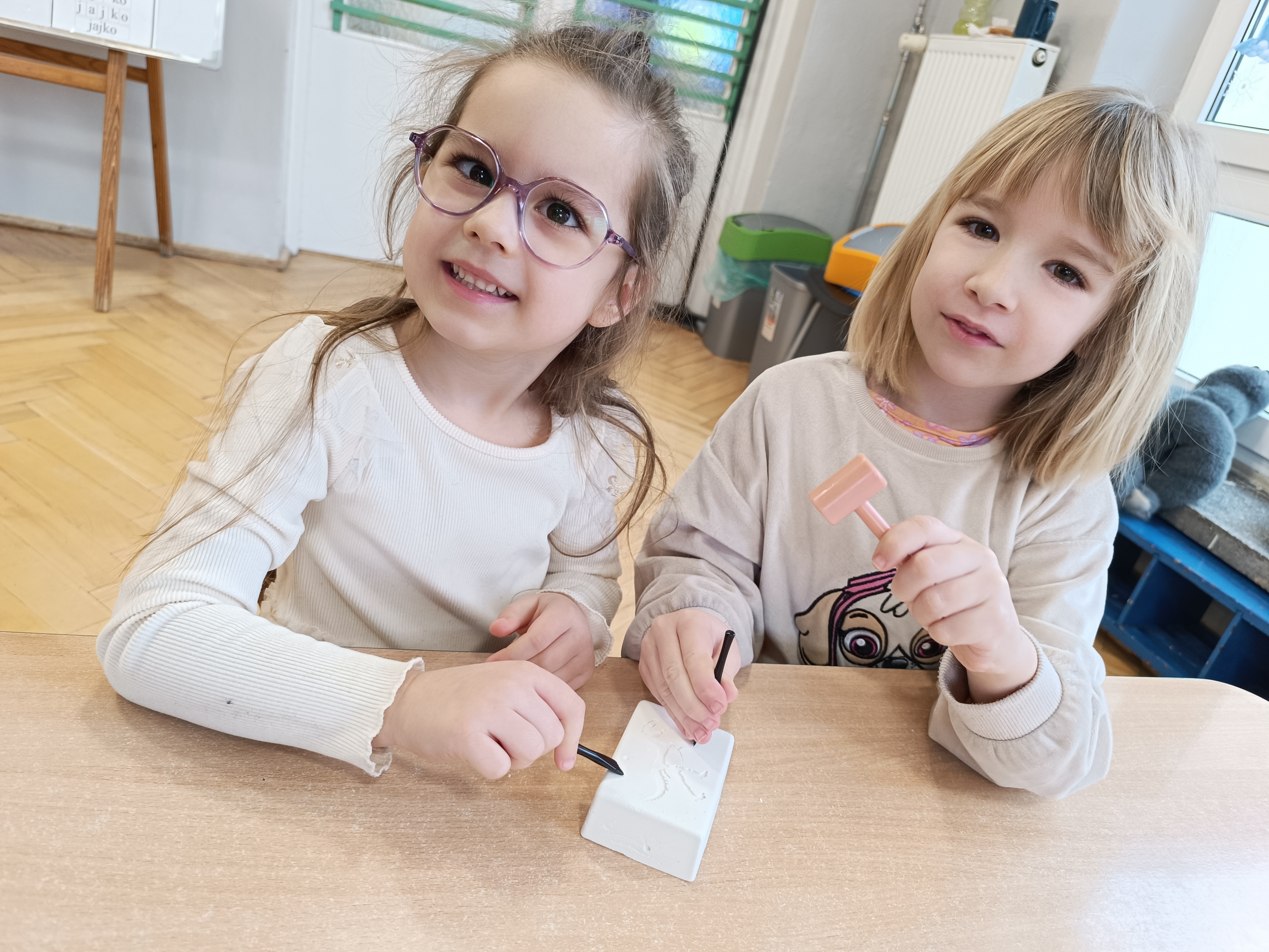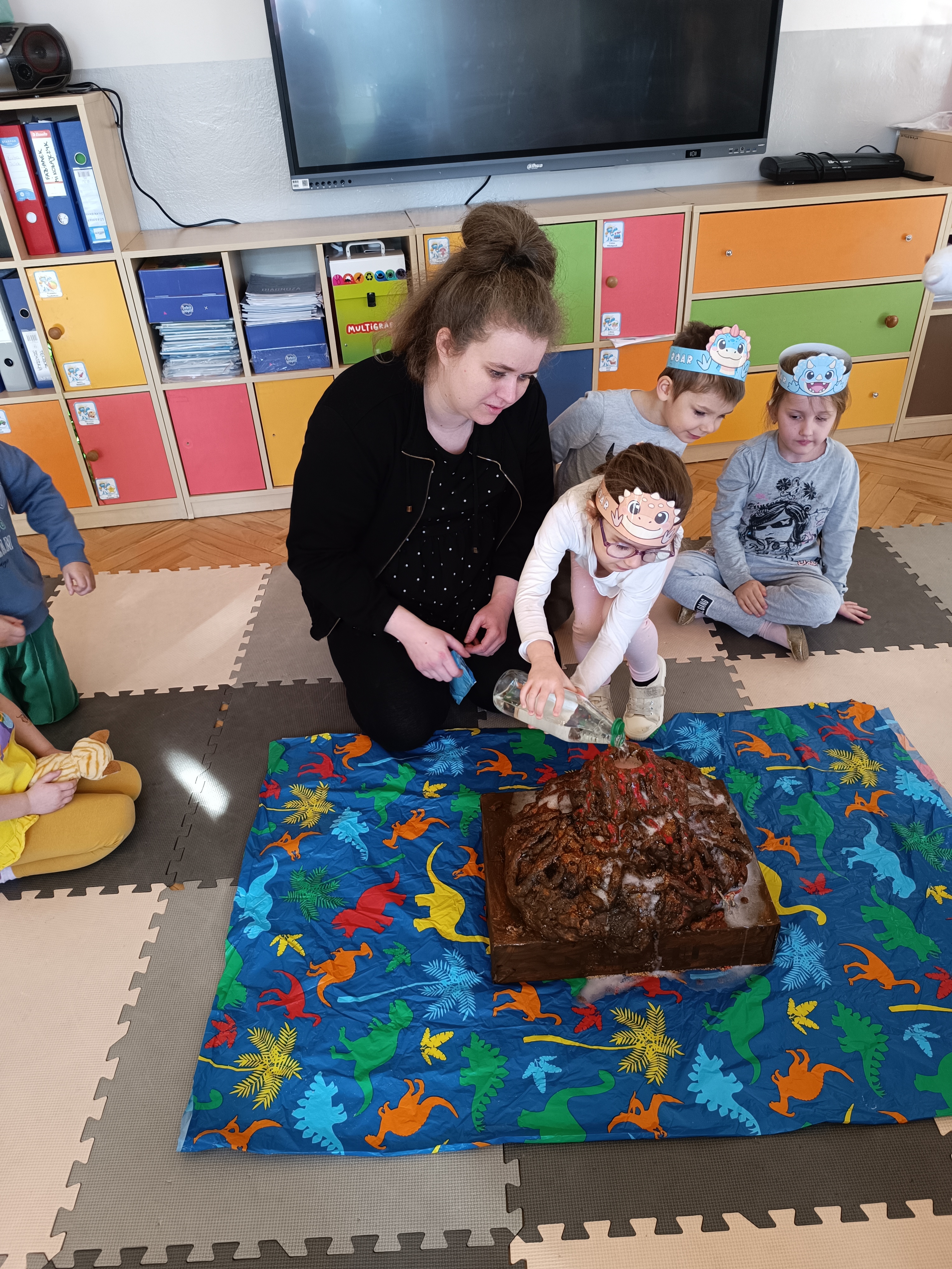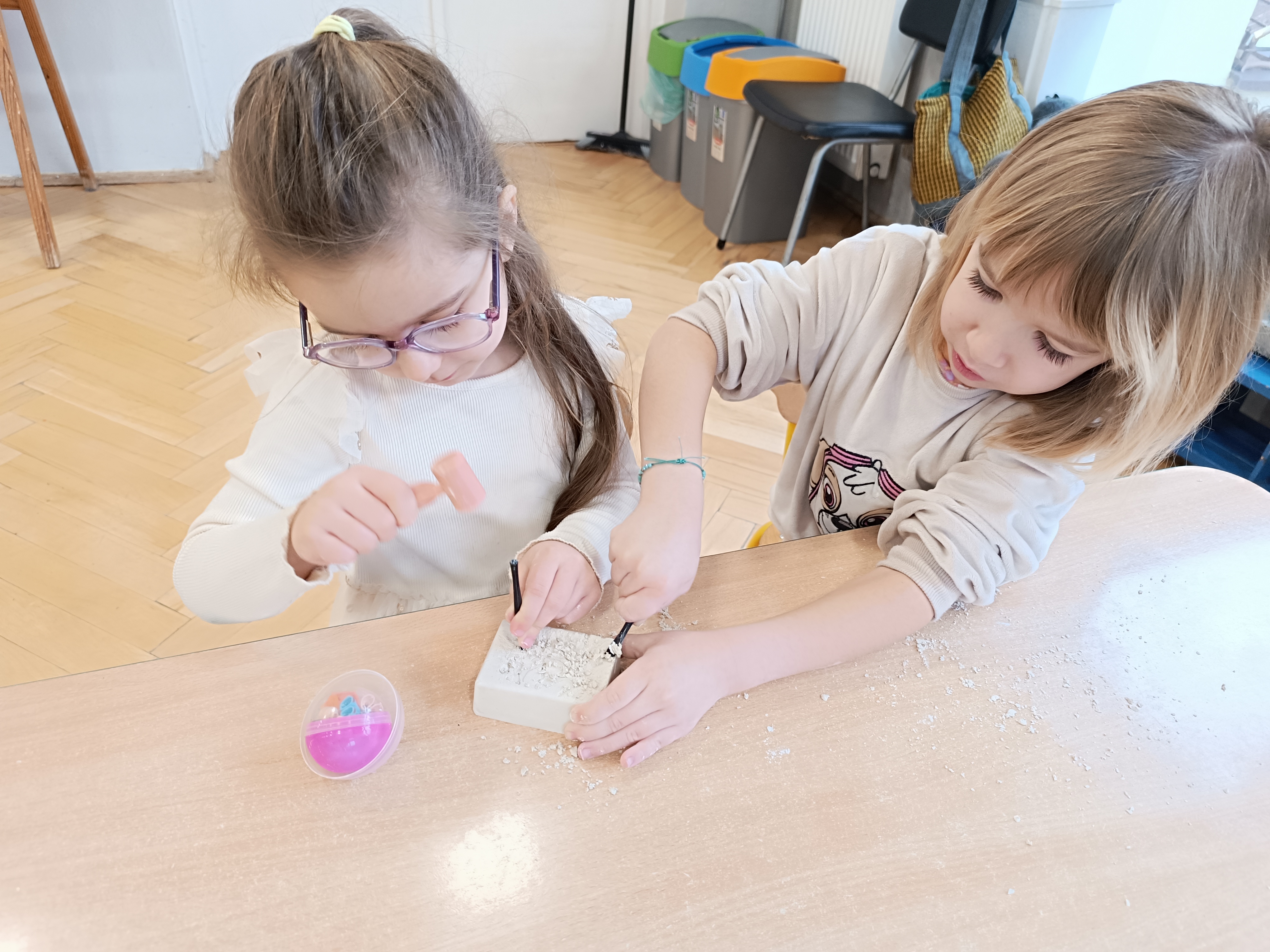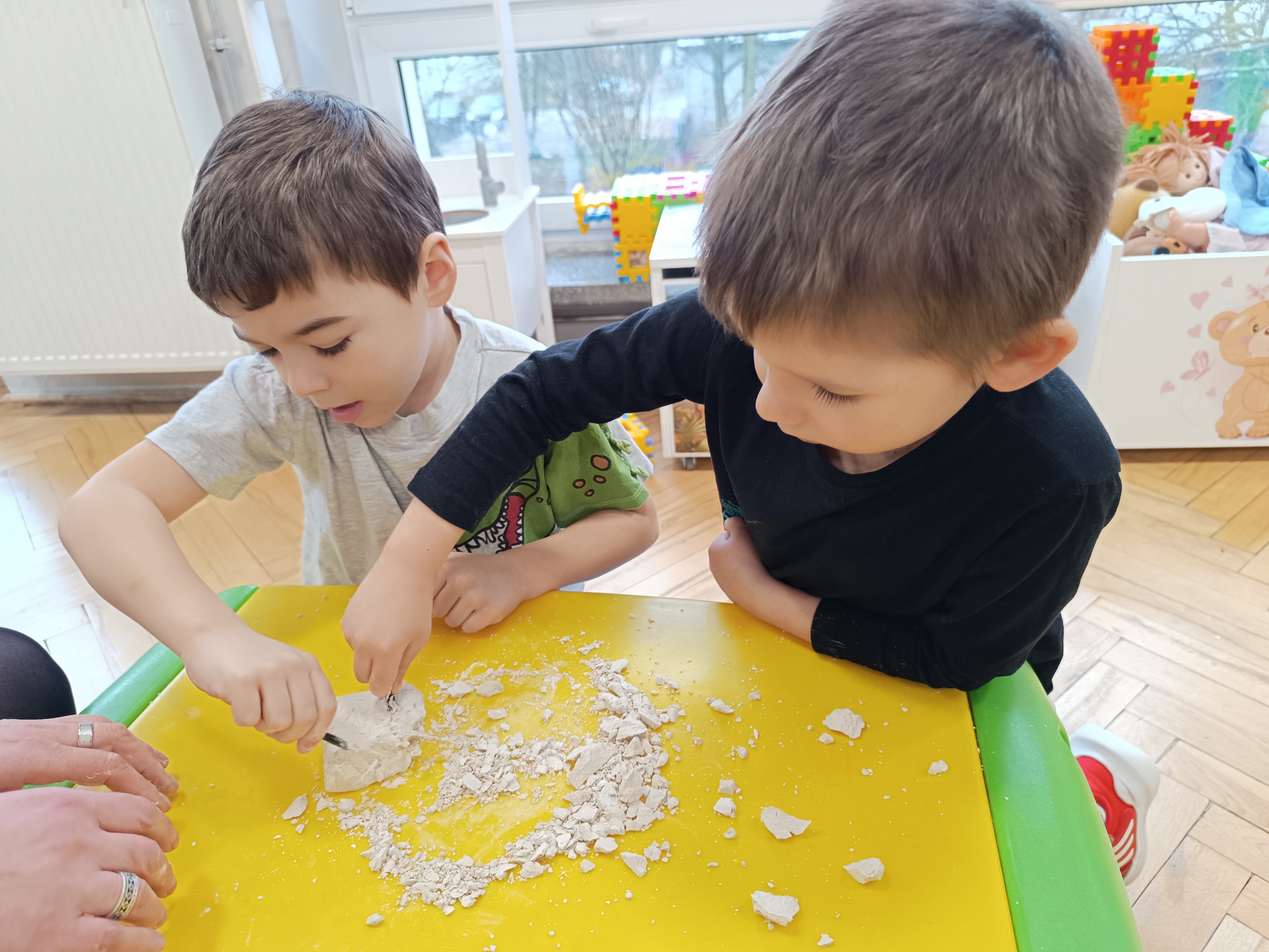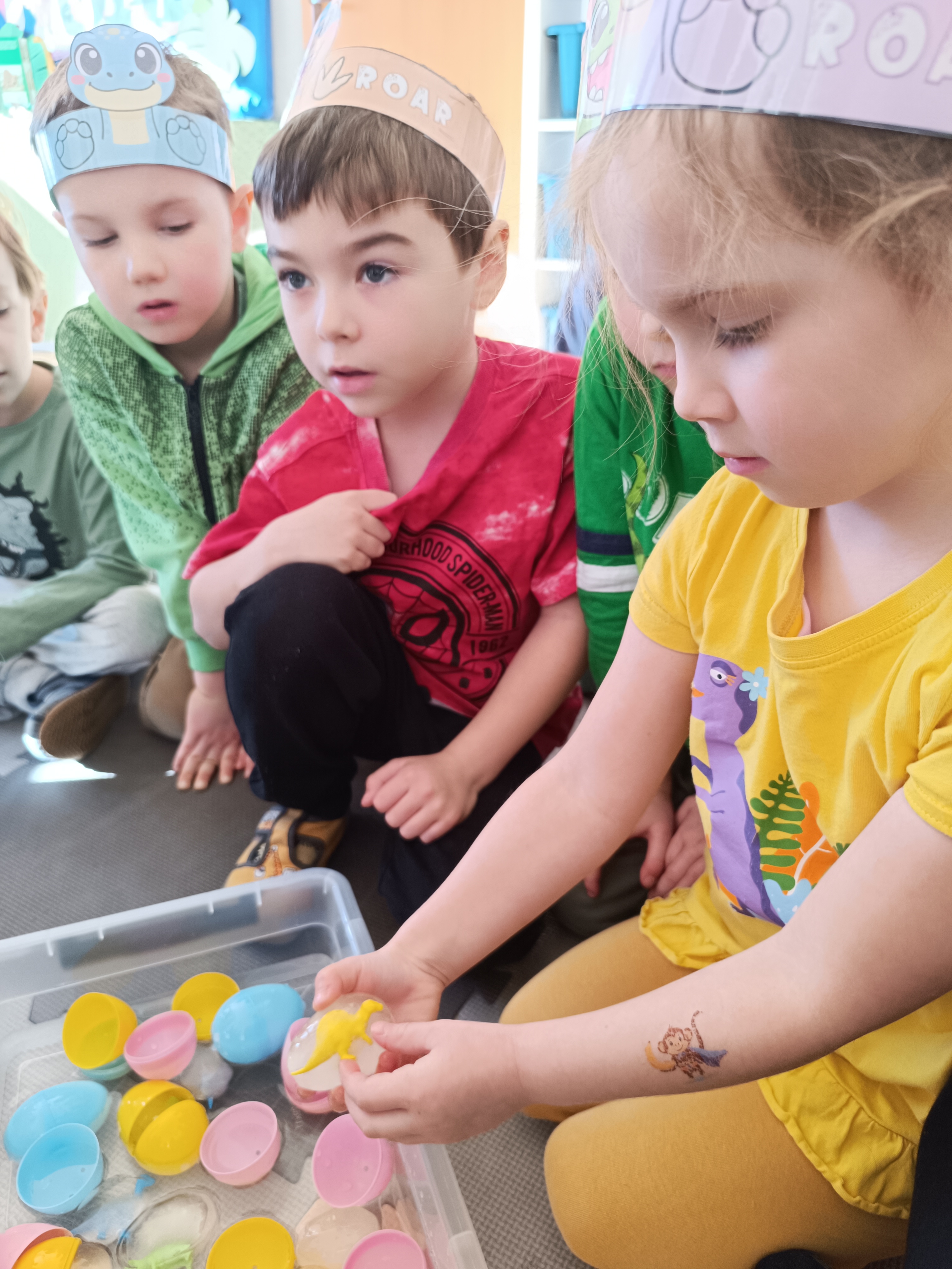 Z okazji Dnia Dinozaura przygotowaliśmy wiele atrakcyjnych aktywności i eksperymentów. Wykonaliśmy spektakularny wybuch wulkanu z sody i octu, obserwując reakcję chemiczną. Dzieci uwalniały zamarznięte dinozaury ukryte w lodowych jajach, ćwicząc cierpliwość i sprawność manualną. Szukaliśmy także ukrytych dinozaurów w sali, a następnie wcieliliśmy się w małych paleontologów, rozbijając gipsowe bryły i odkrywając w nich „skamieliny”.