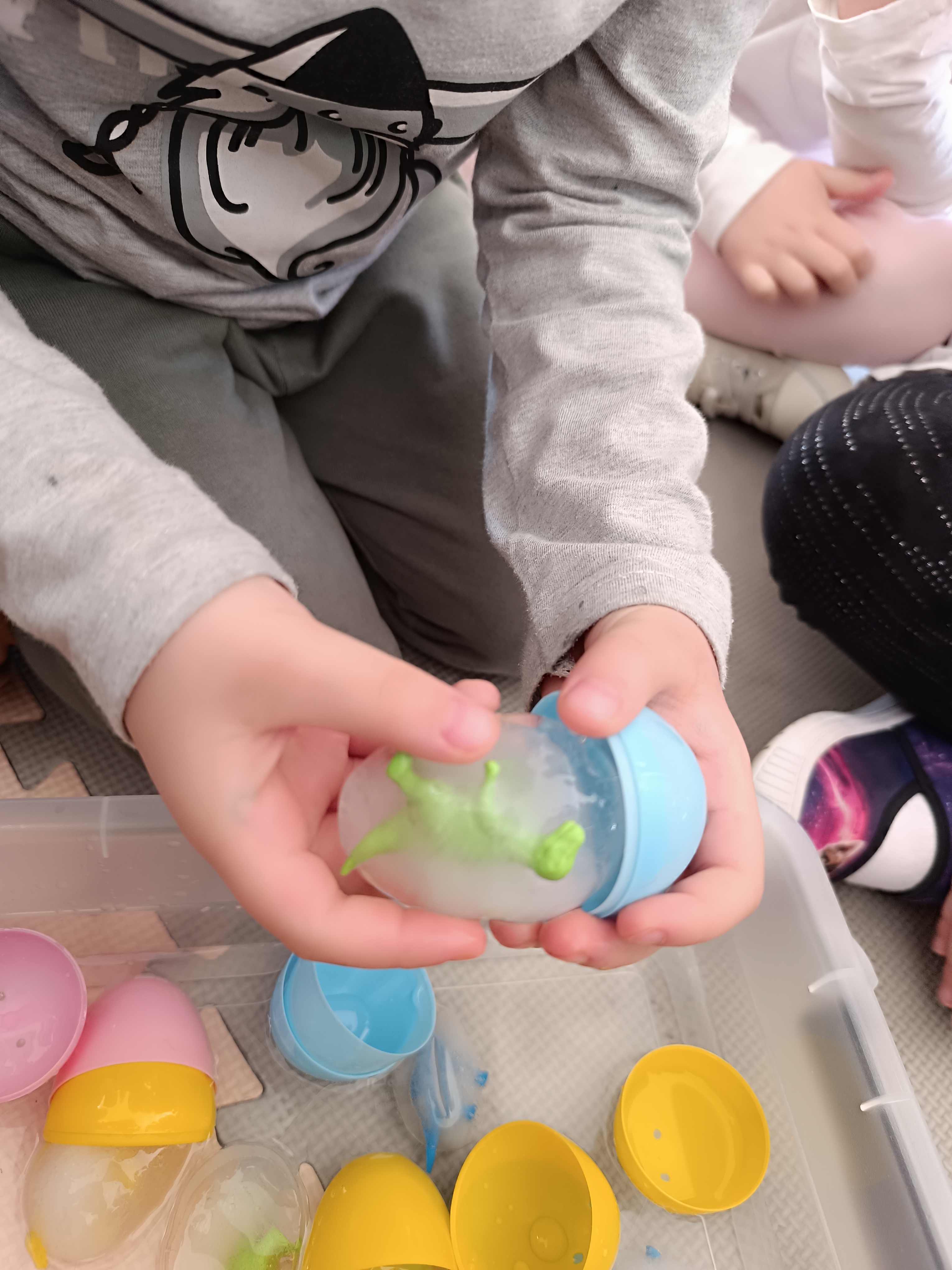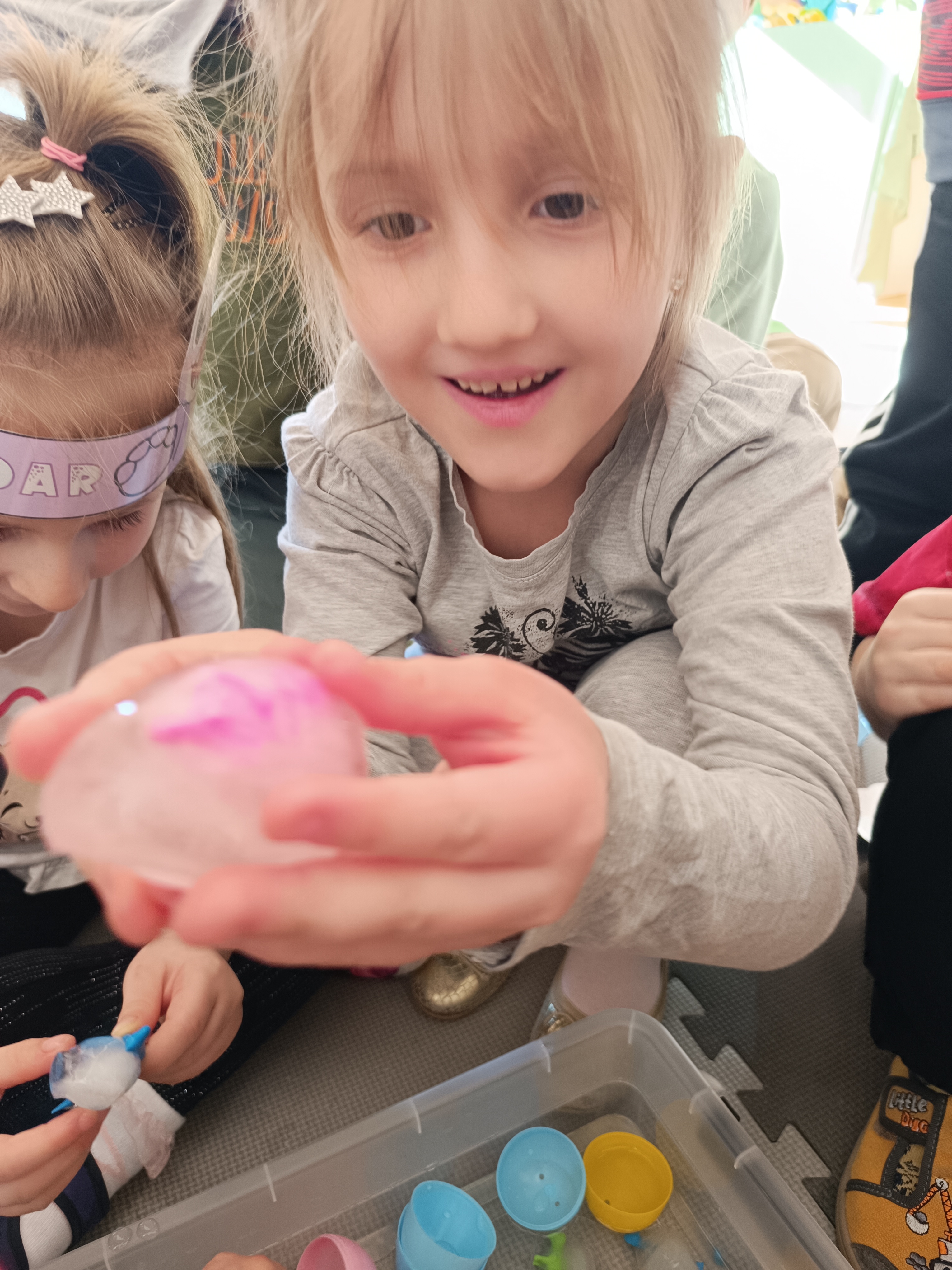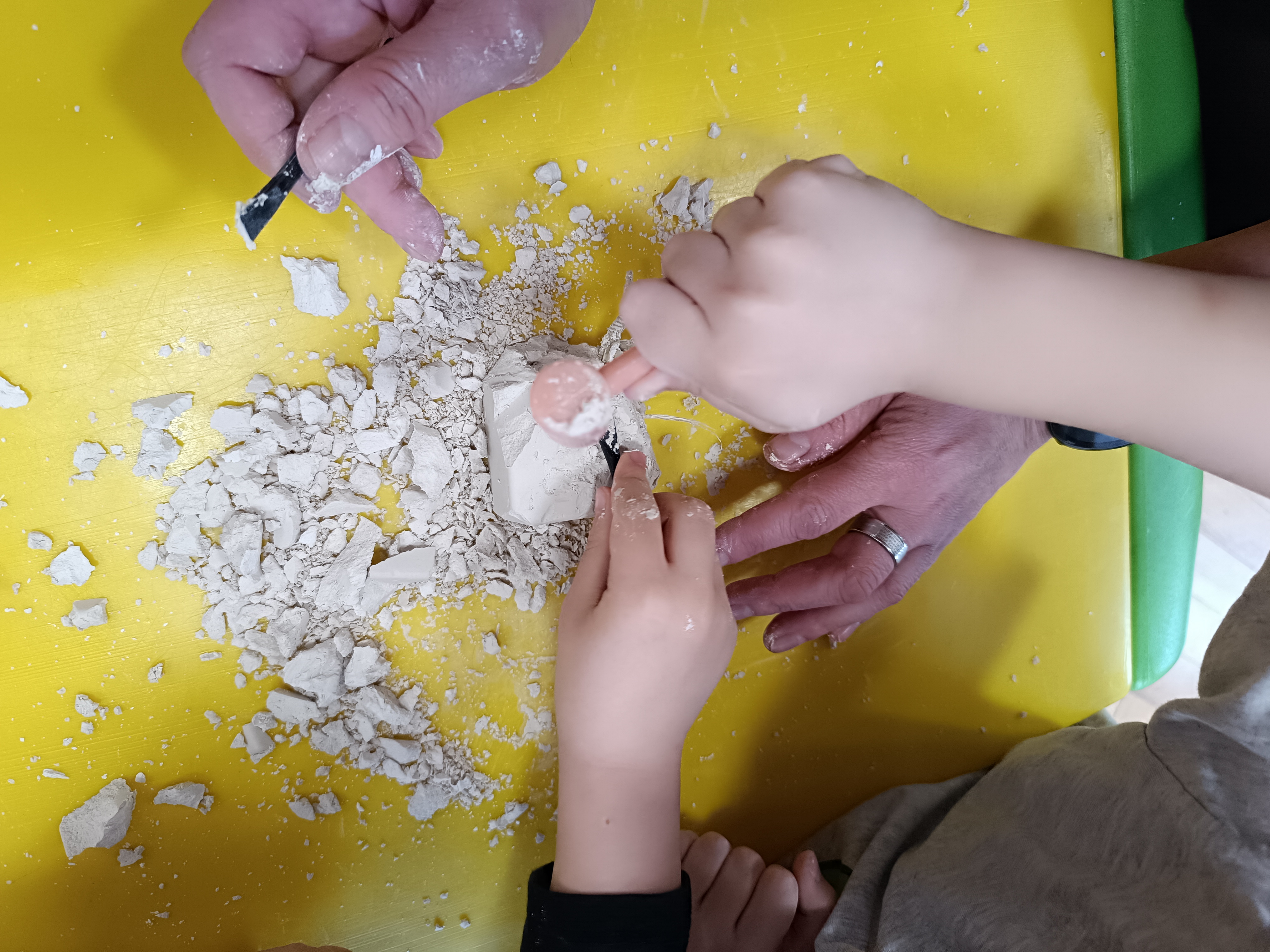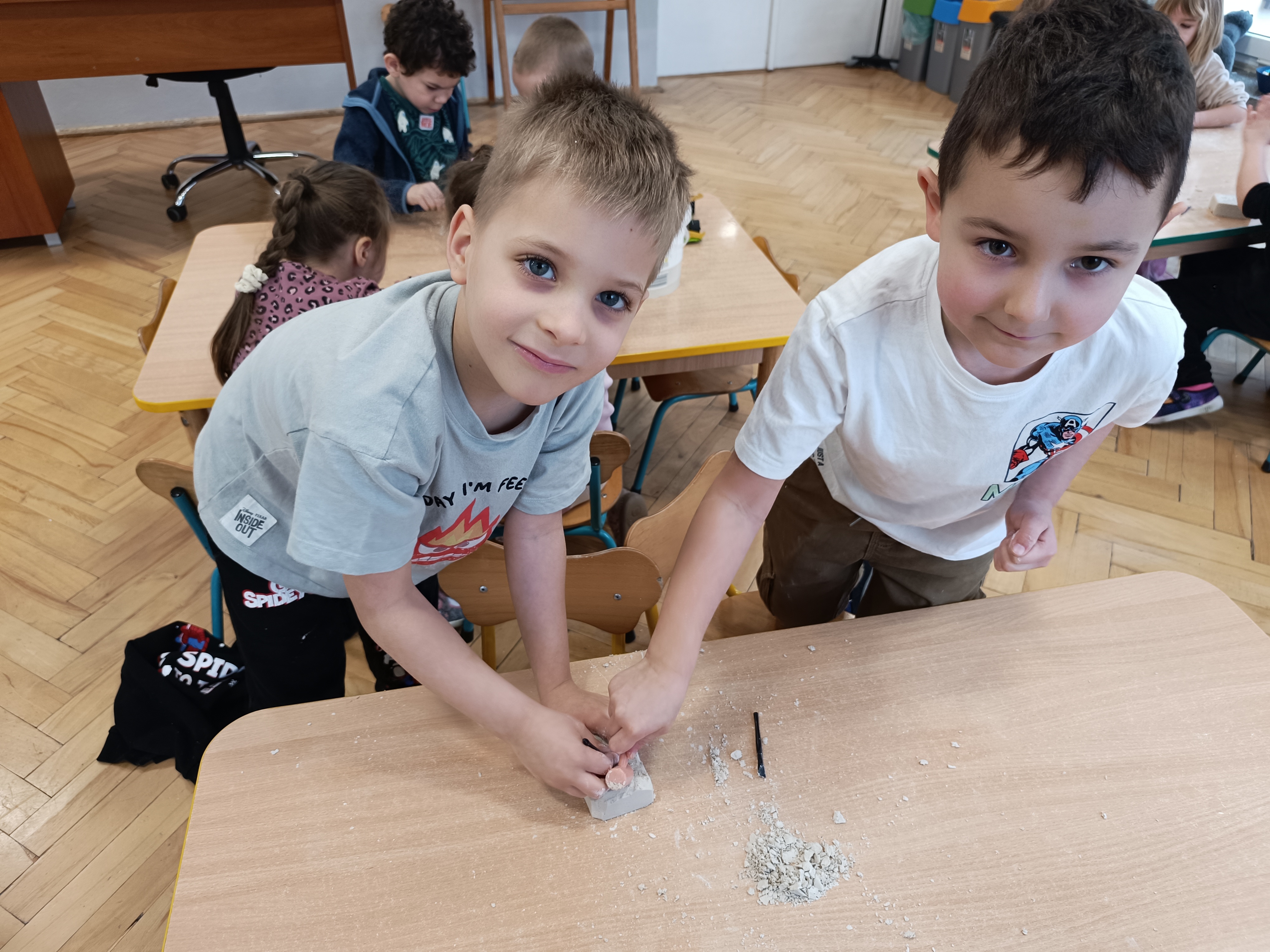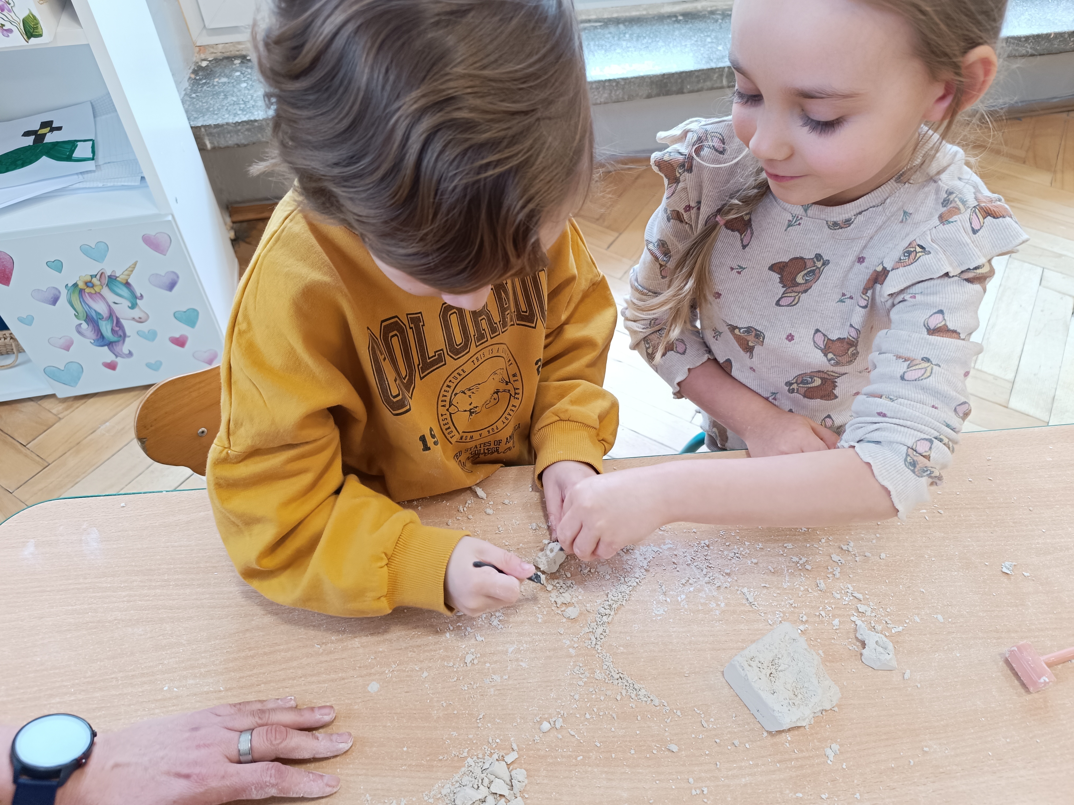 Z okazji Dnia Dinozaura przygotowaliśmy wiele atrakcyjnych aktywności i eksperymentów. Wykonaliśmy spektakularny wybuch wulkanu z sody i octu, obserwując reakcję chemiczną. Dzieci uwalniały zamarznięte dinozaury ukryte w lodowych jajach, ćwicząc cierpliwość i sprawność manualną. Szukaliśmy także ukrytych dinozaurów w sali, a następnie wcieliliśmy się w małych paleontologów, rozbijając gipsowe bryły i odkrywając w nich „skamieliny”.