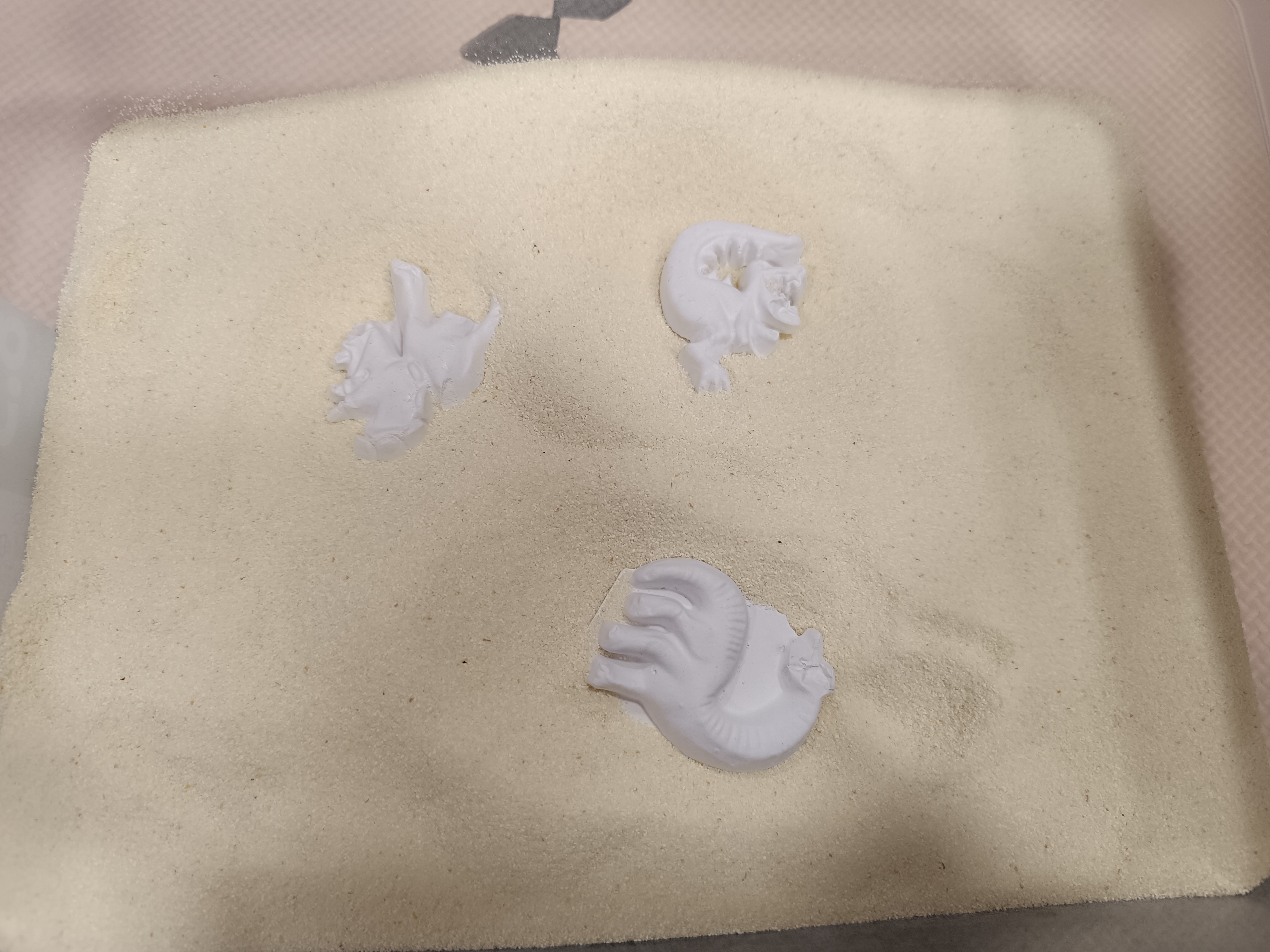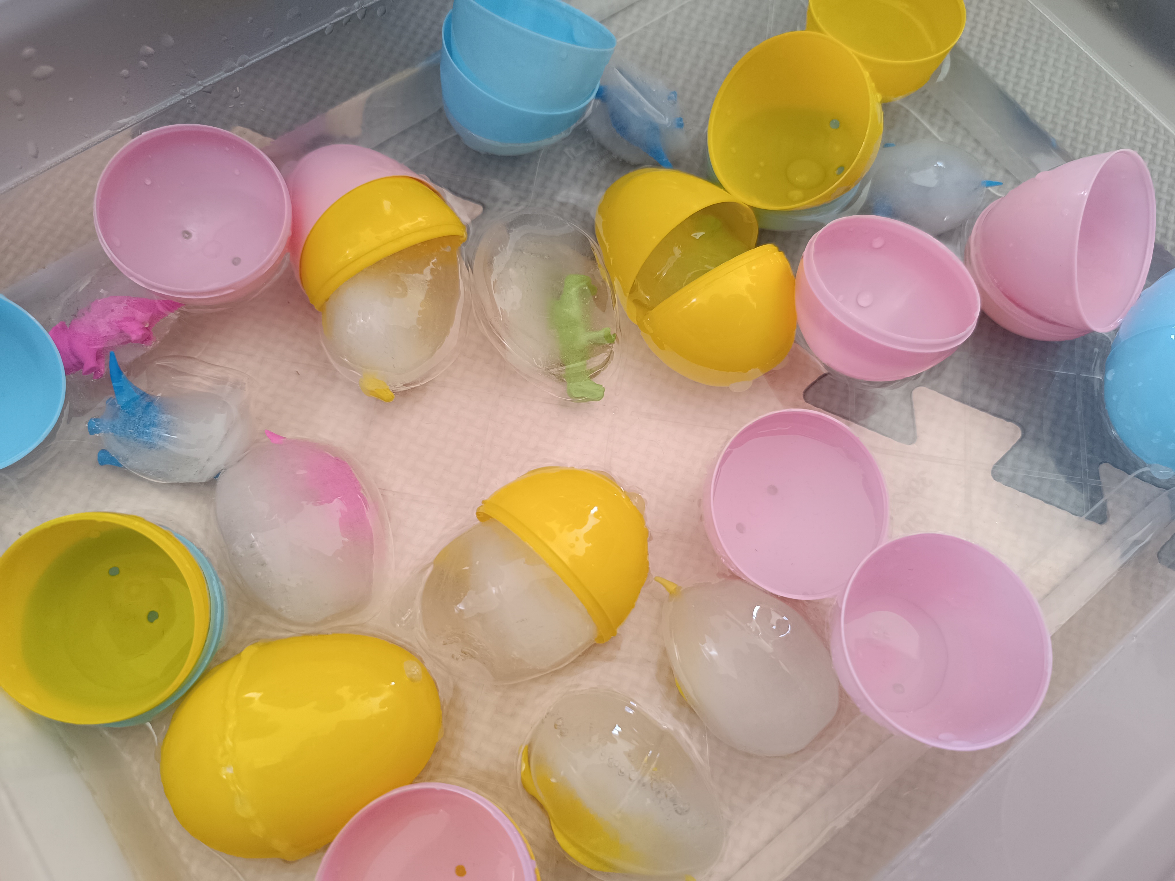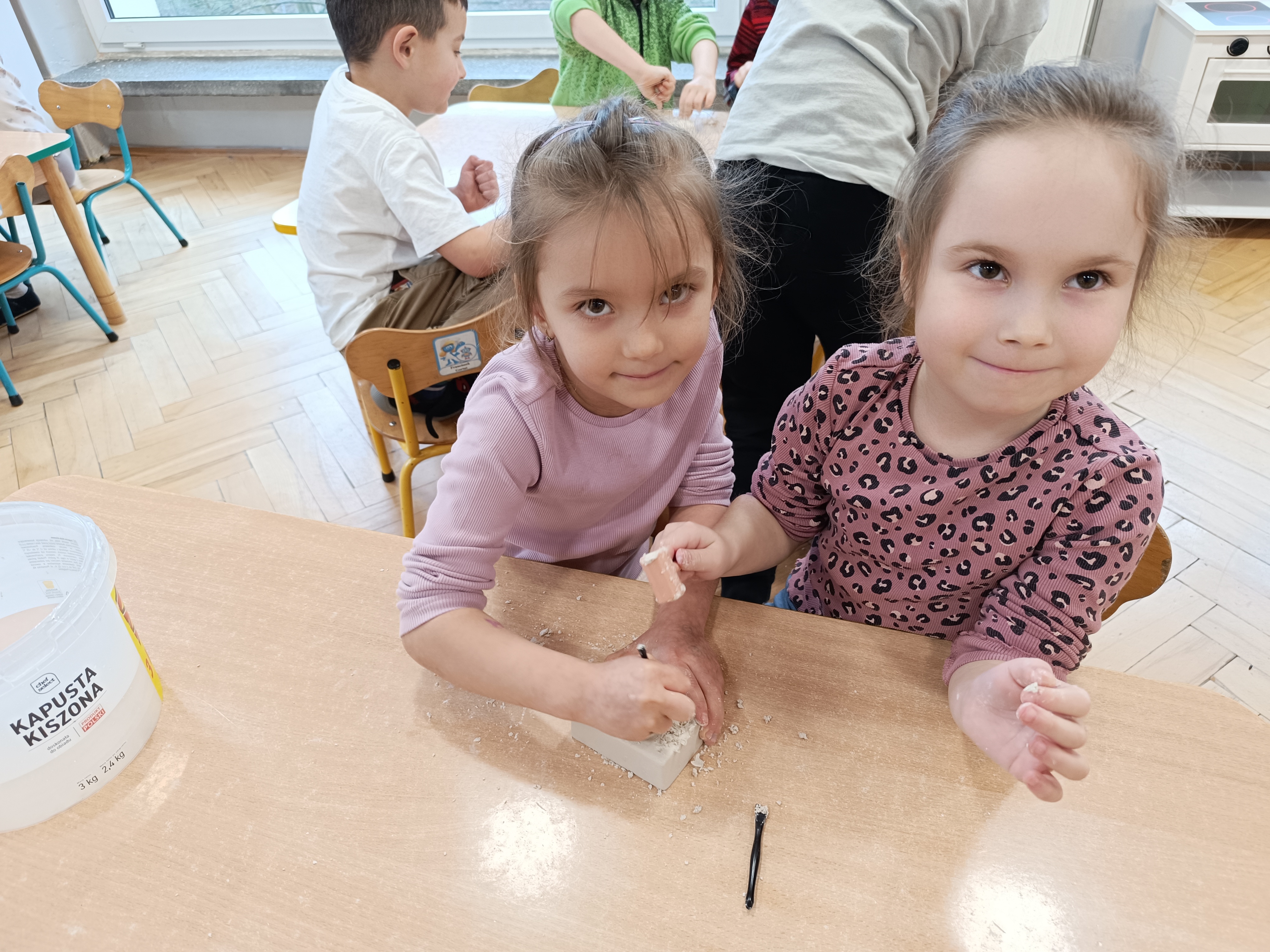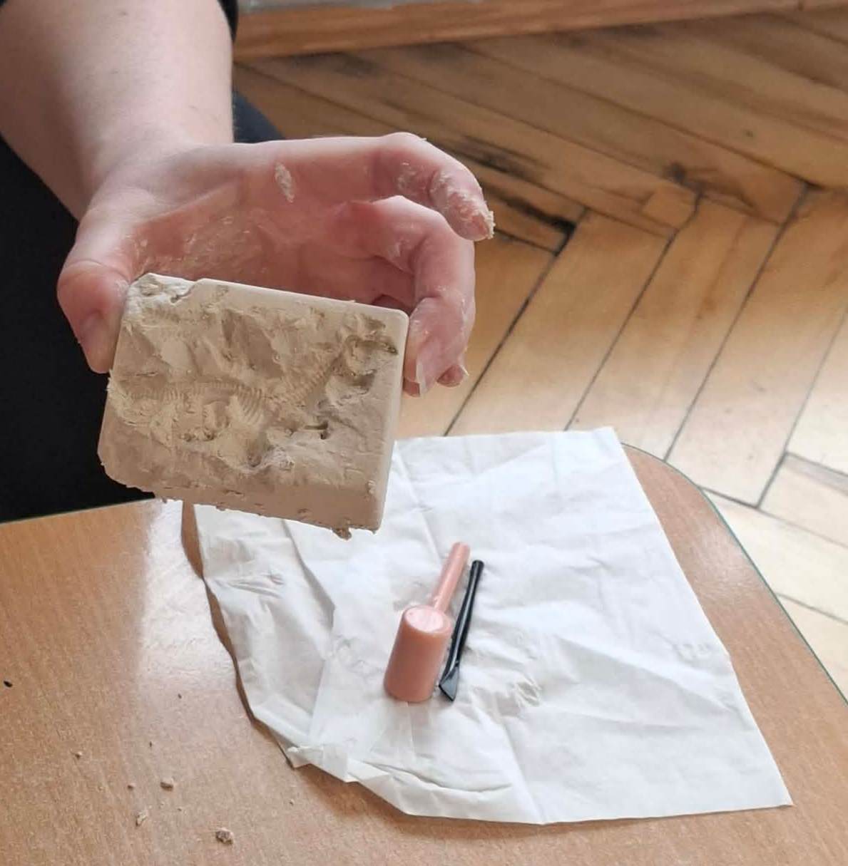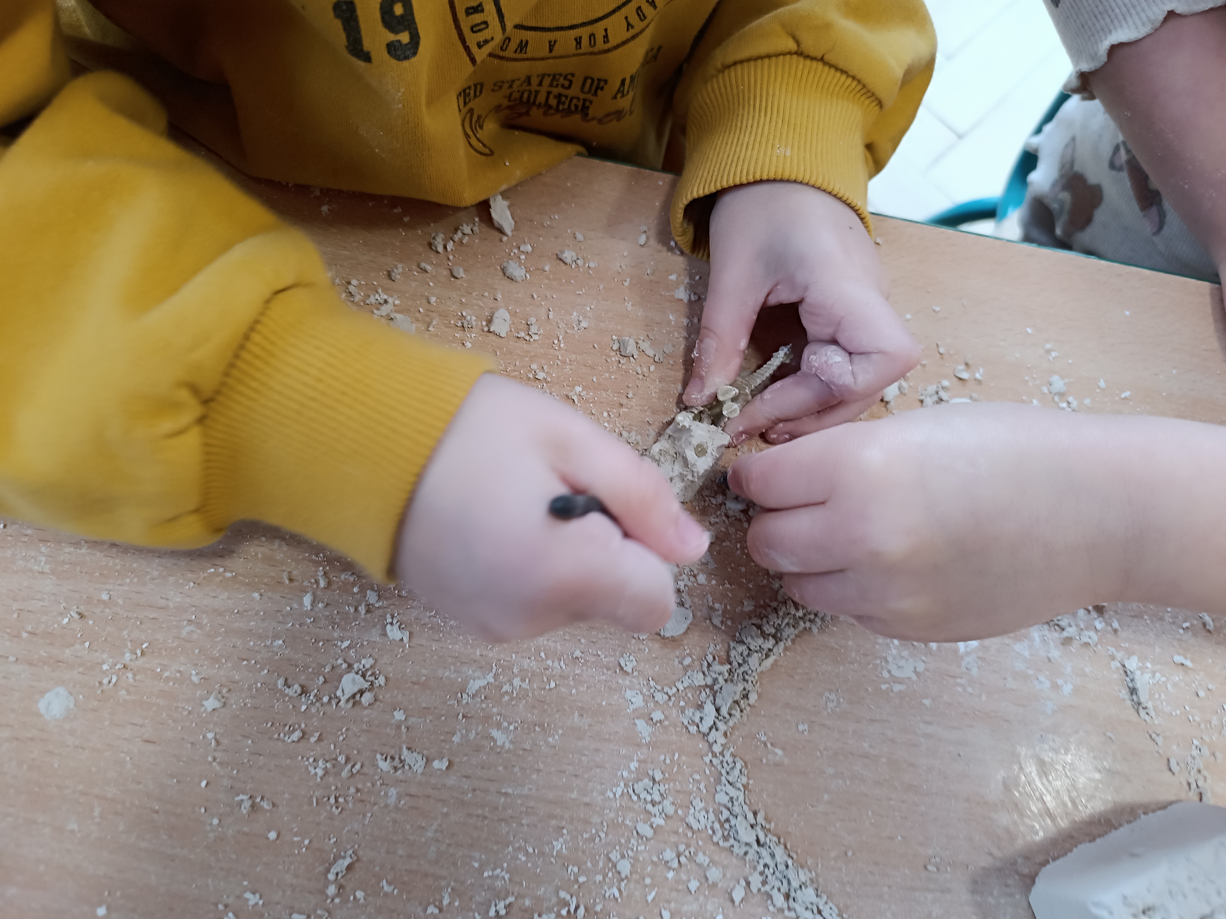 Z okazji Dnia Dinozaura przygotowaliśmy wiele atrakcyjnych aktywności i eksperymentów. Wykonaliśmy spektakularny wybuch wulkanu z sody i octu, obserwując reakcję chemiczną. Dzieci uwalniały zamarznięte dinozaury ukryte w lodowych jajach, ćwicząc cierpliwość i sprawność manualną. Szukaliśmy także ukrytych dinozaurów w sali, a następnie wcieliliśmy się w małych paleontologów, rozbijając gipsowe bryły i odkrywając w nich „skamieliny”.
