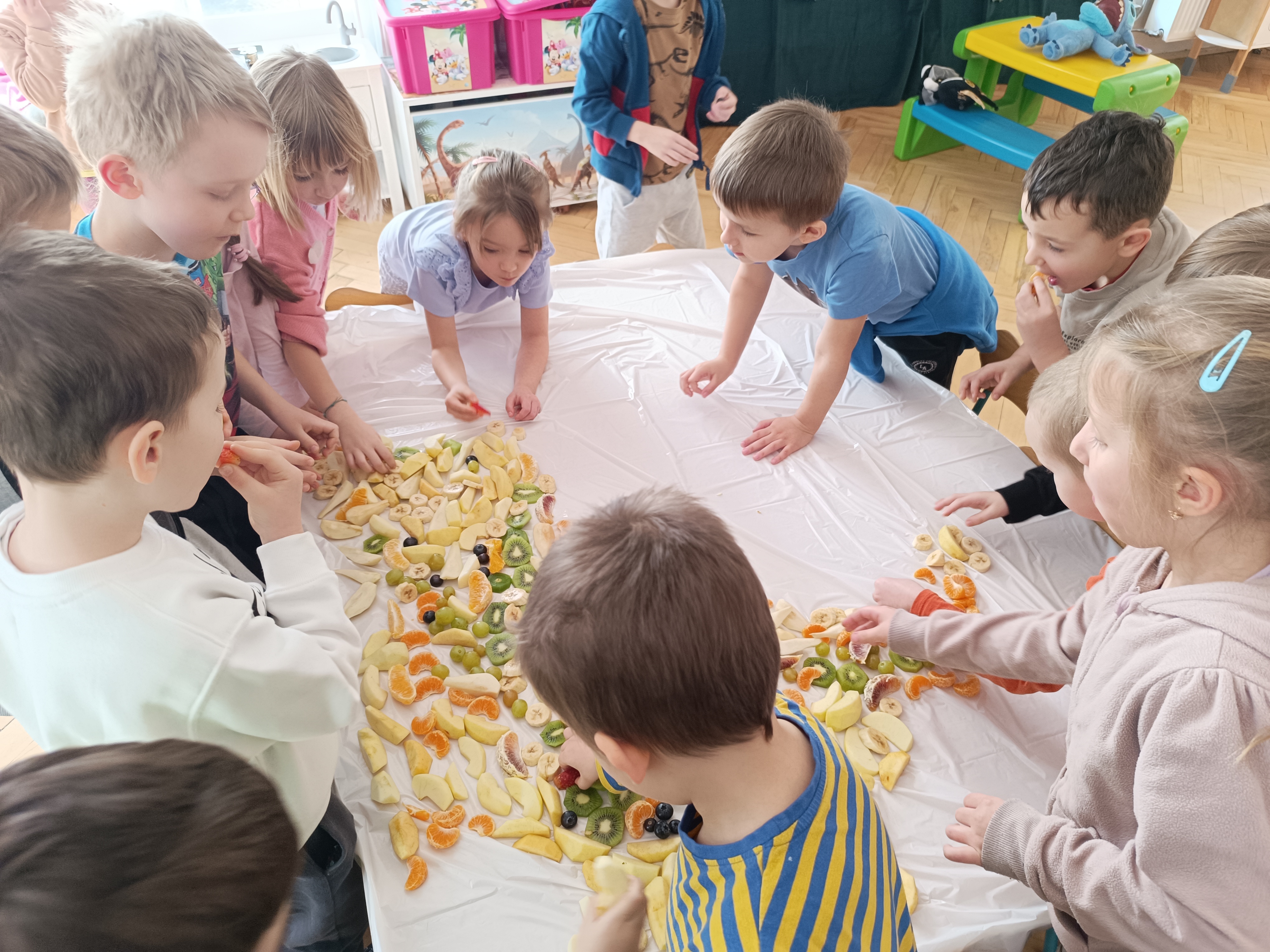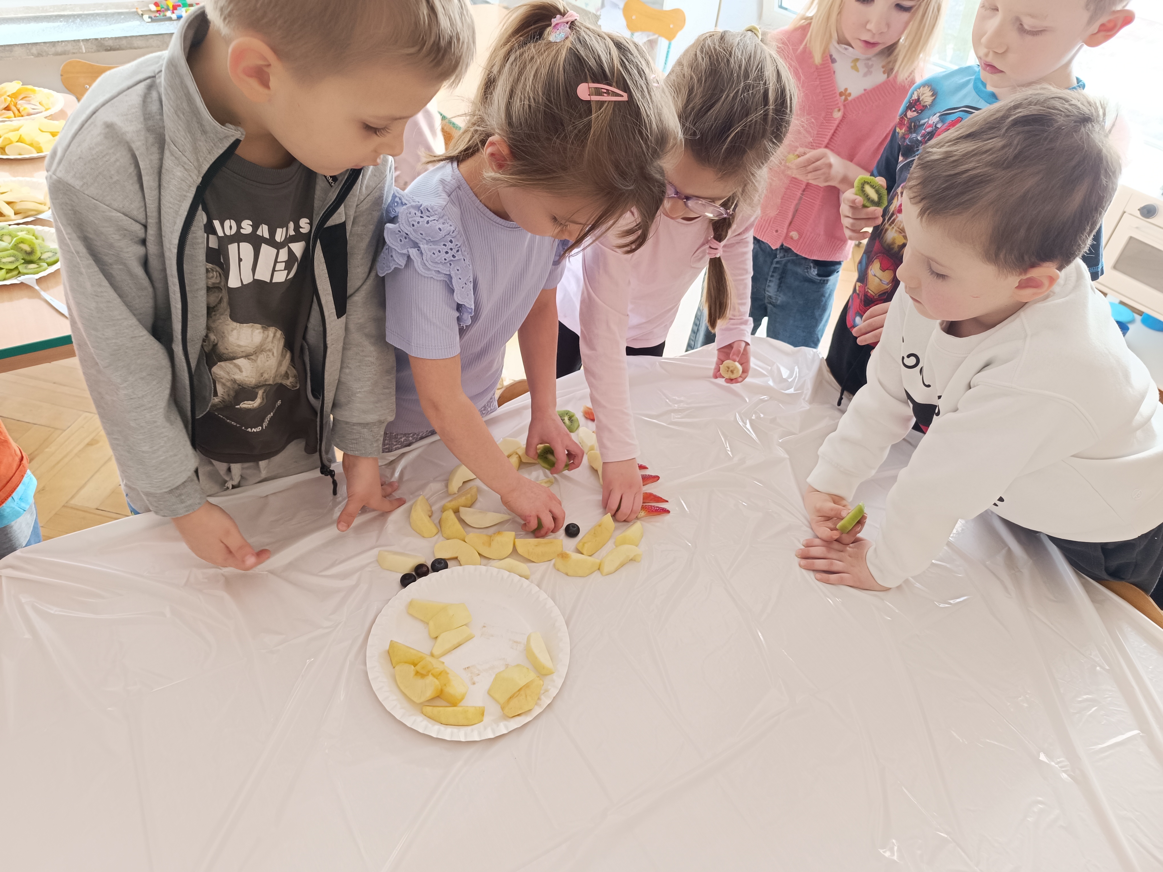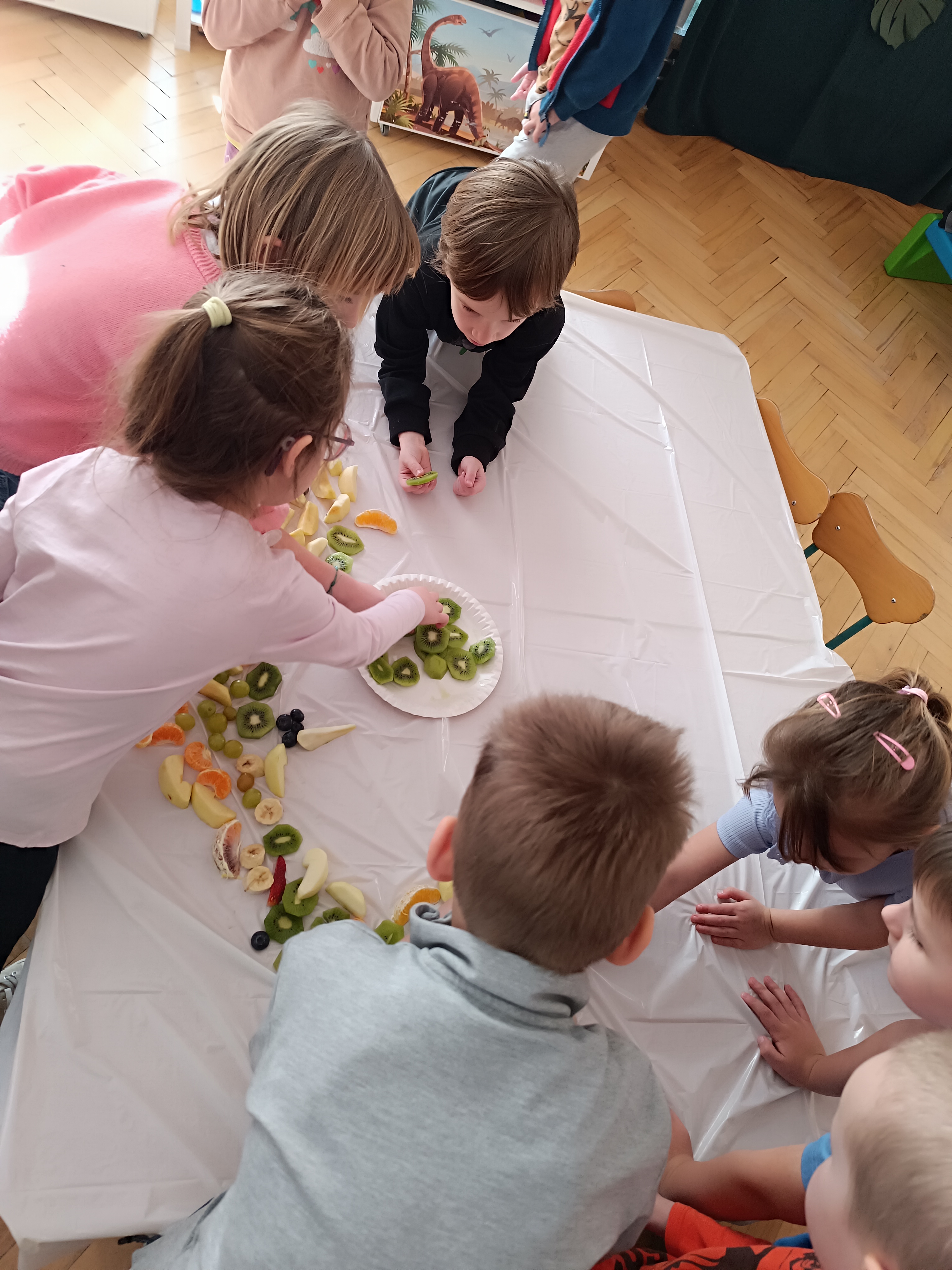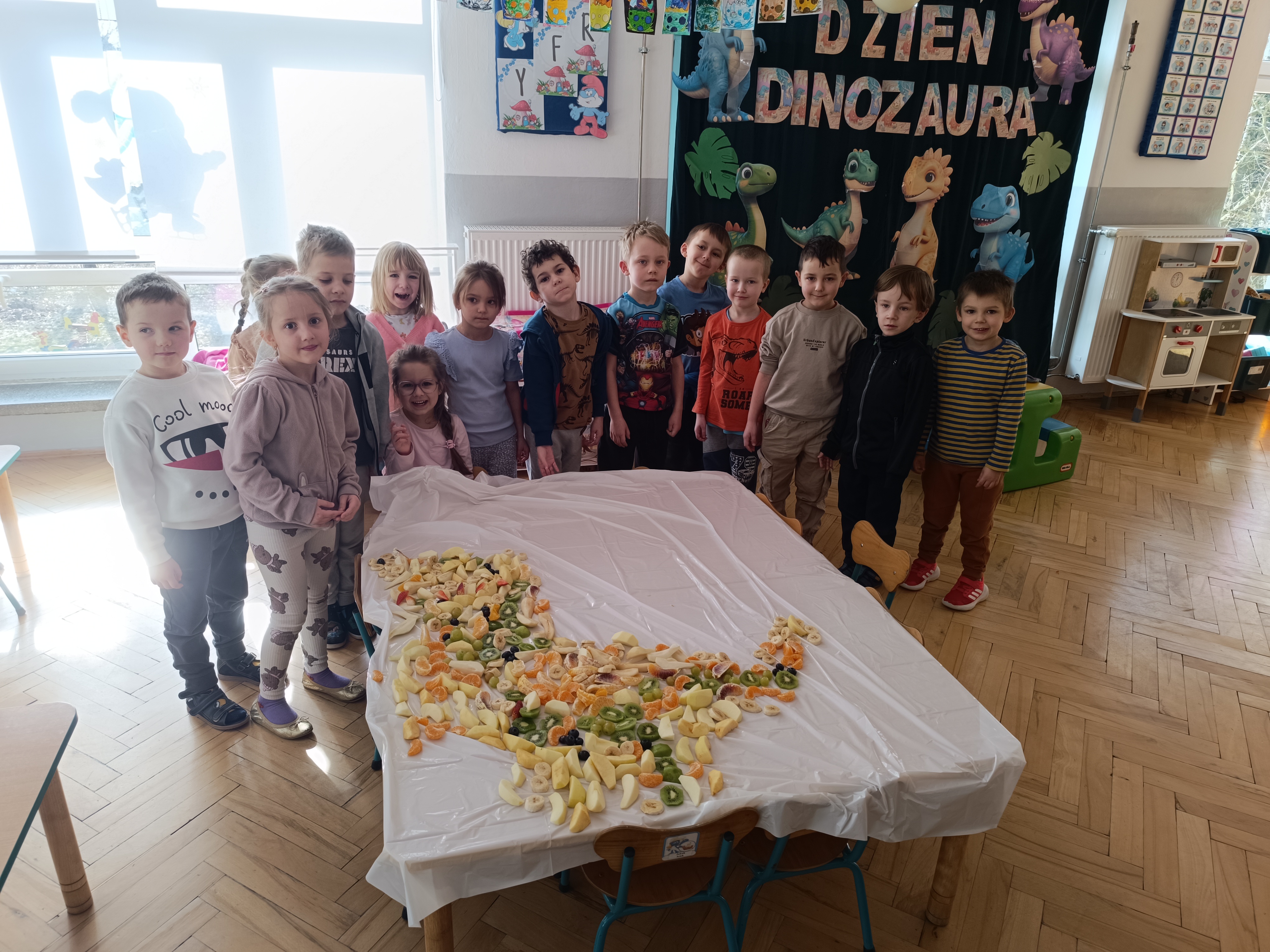 W piątek odbył się także Owocowy Dzień. Dzieci wspólnie ułożyły kolorowego dinozaura z owoców, rozwijając kreatywność i utrwalając zasady zdrowego odżywiania. Na zakończenie z apetytem zjadły przygotowaną kompozycję.
